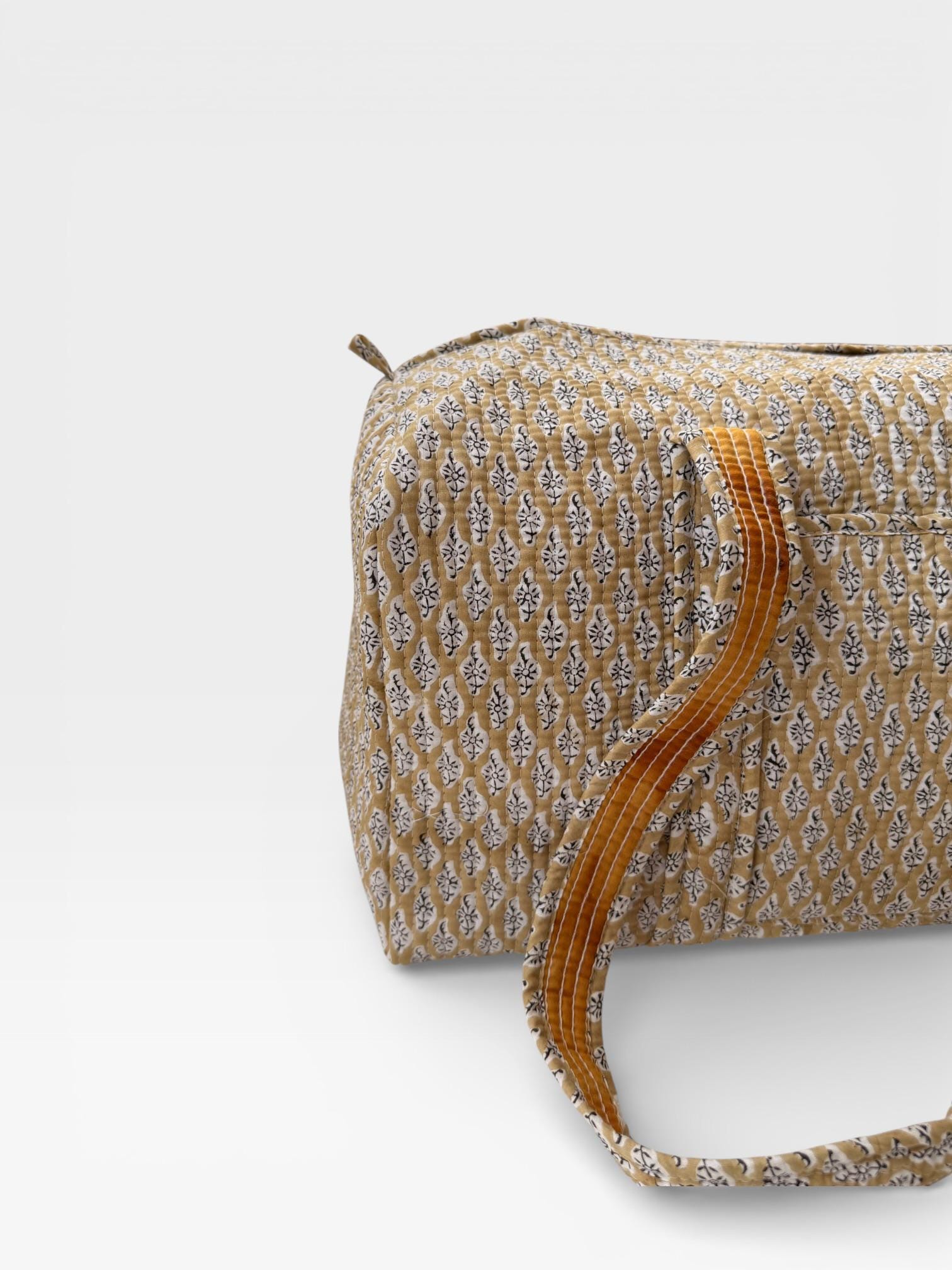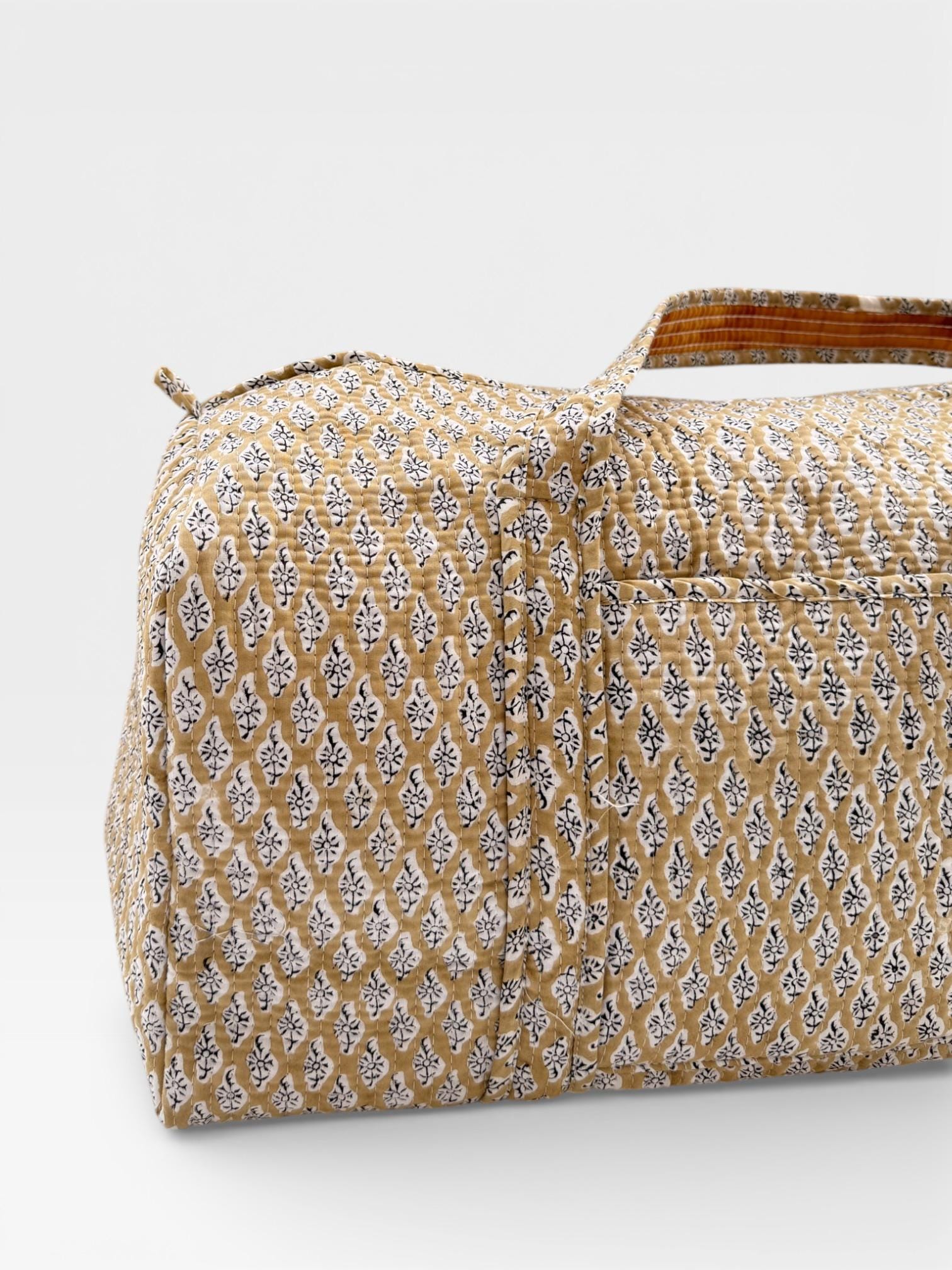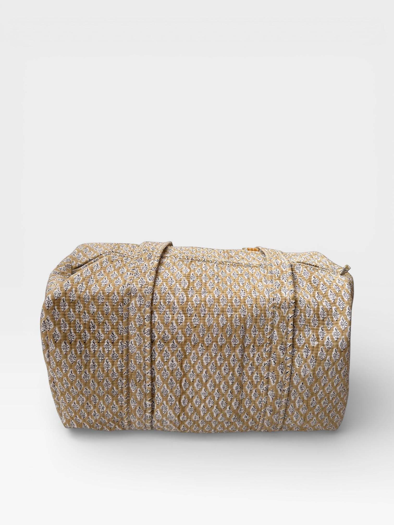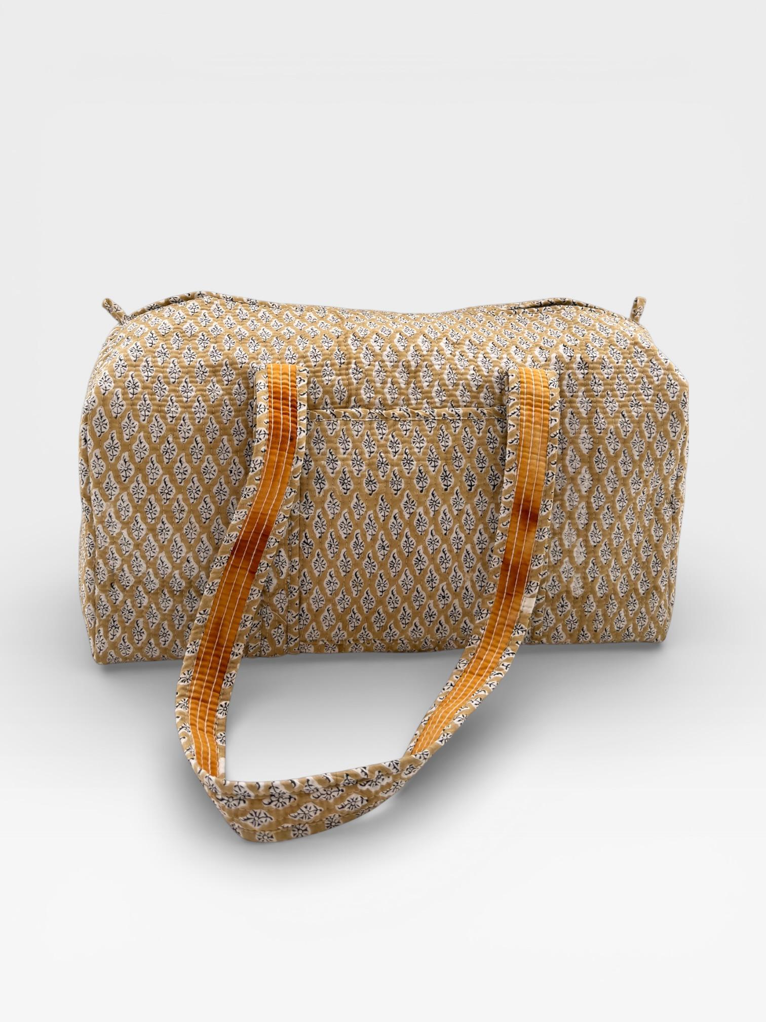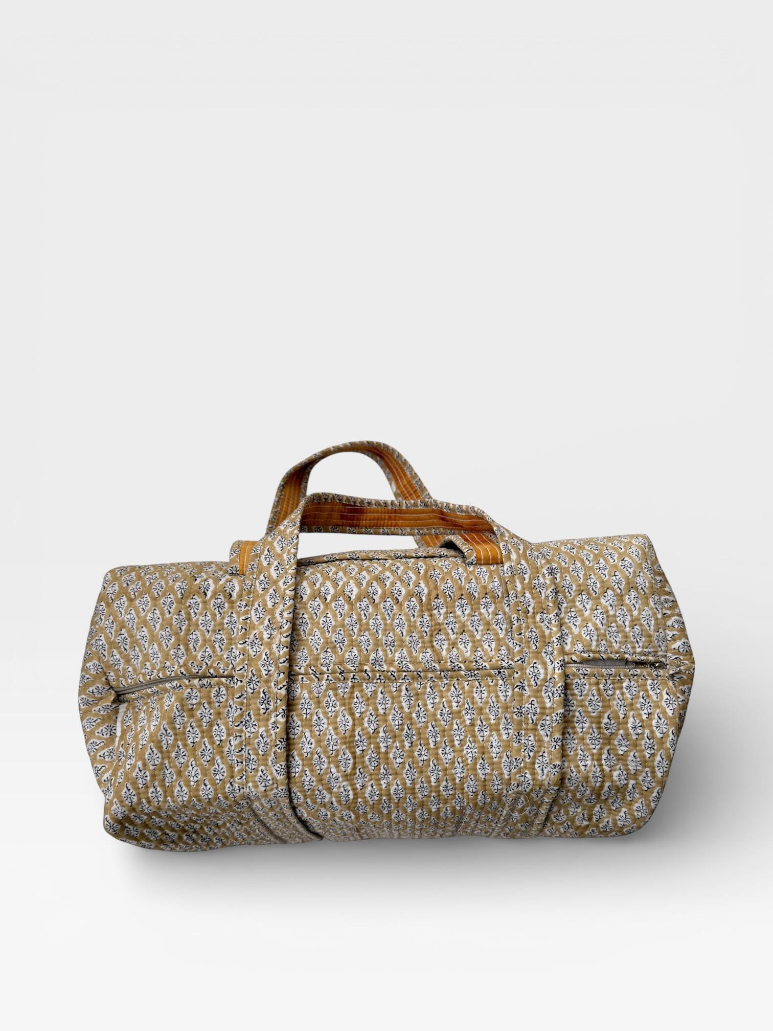 Travel in style with this hand block printed cotton duffle bag, crafted using traditional Indian block printing techniques. Featuring vibrant floral motifs and a timeless artisanal design, this bag blends functionality with handcrafted beauty.