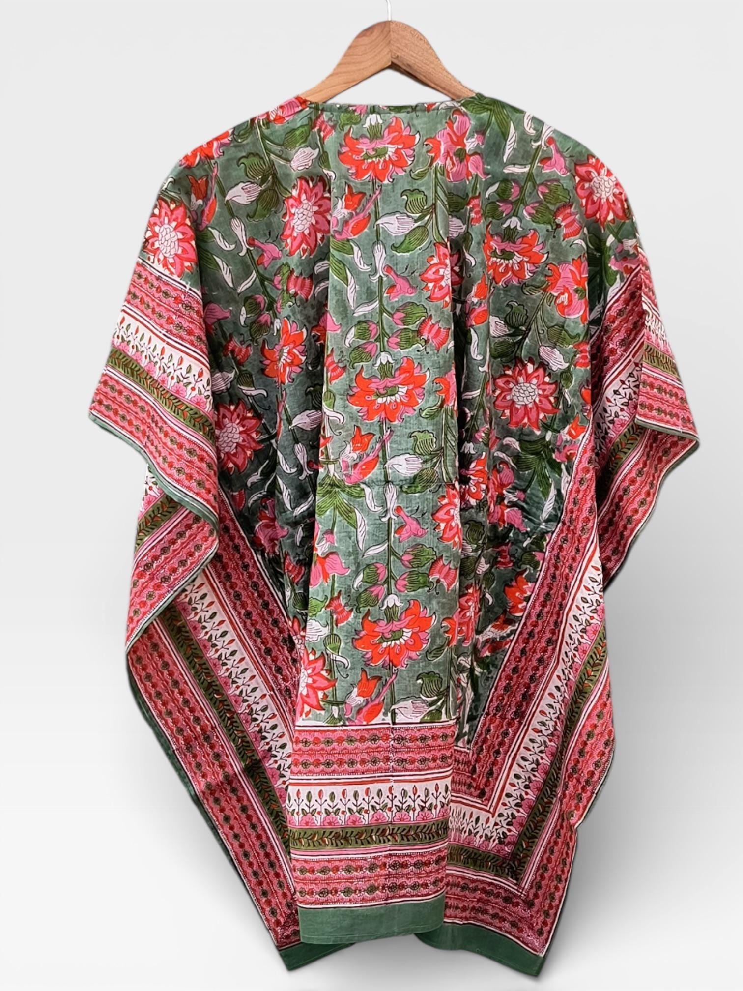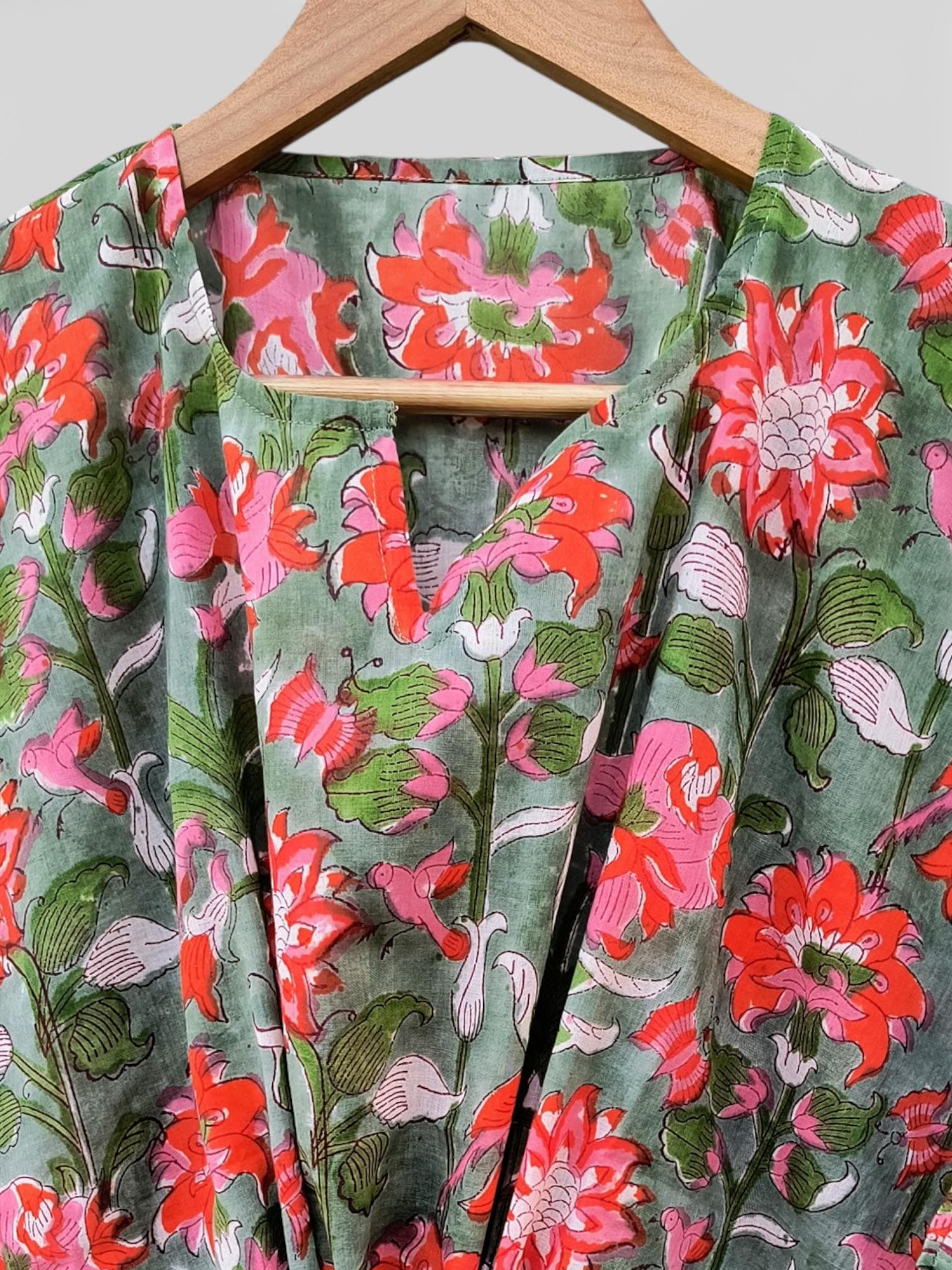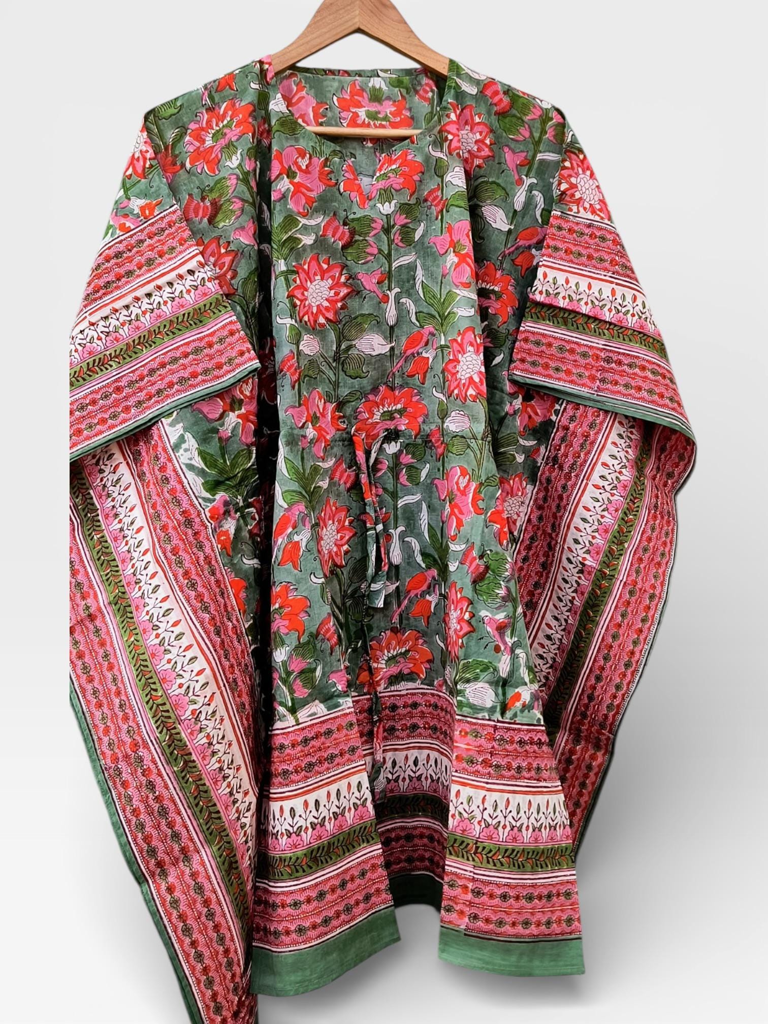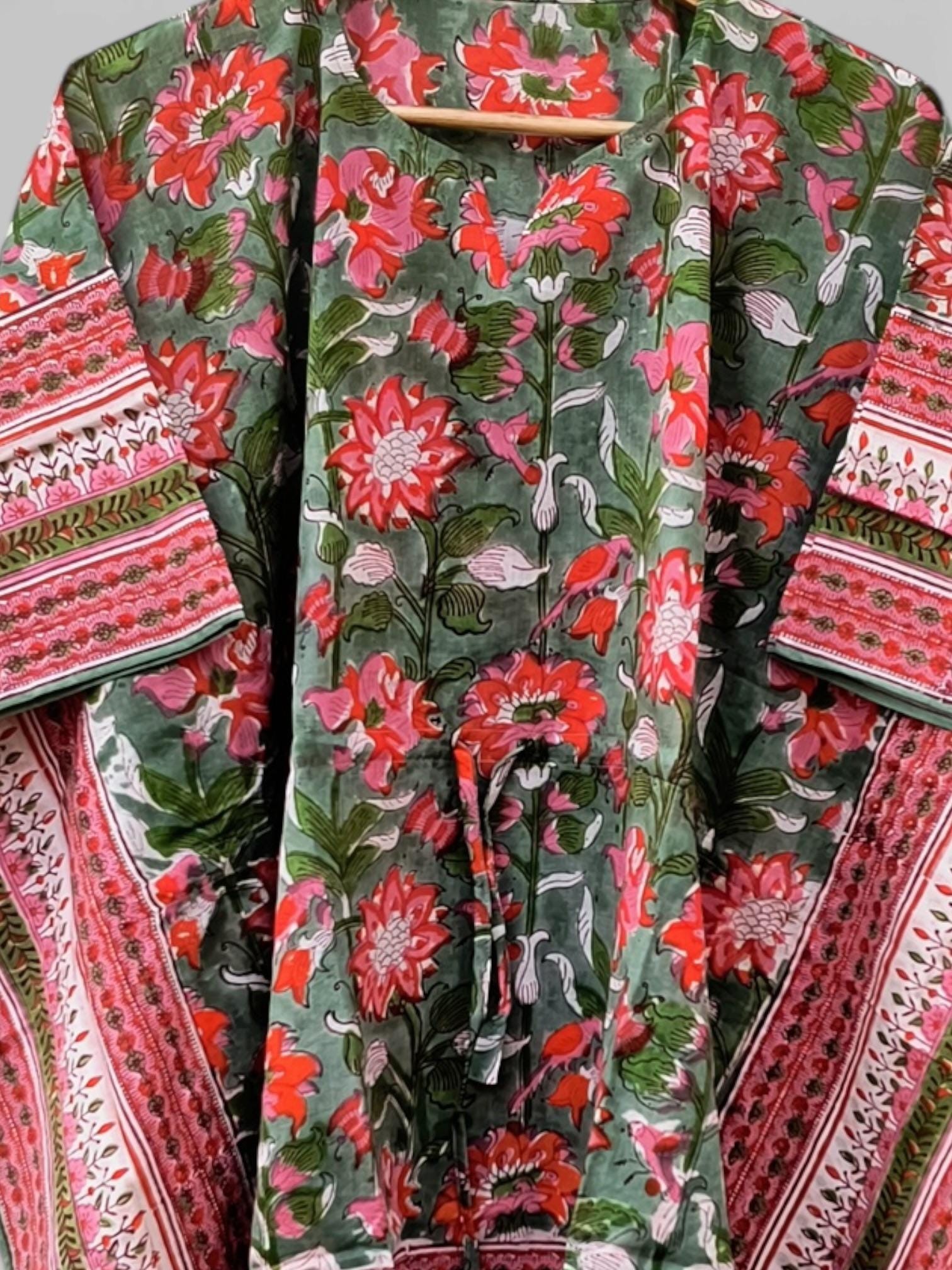 Add effortless charm to your everyday wardrobe with this hand block printed short kaftan, crafted in soft, breathable cotton. Featuring a beautiful green base with red and pink floral motifs, this kaftan showcases traditional Indian block printing paired with a striking contrast border.