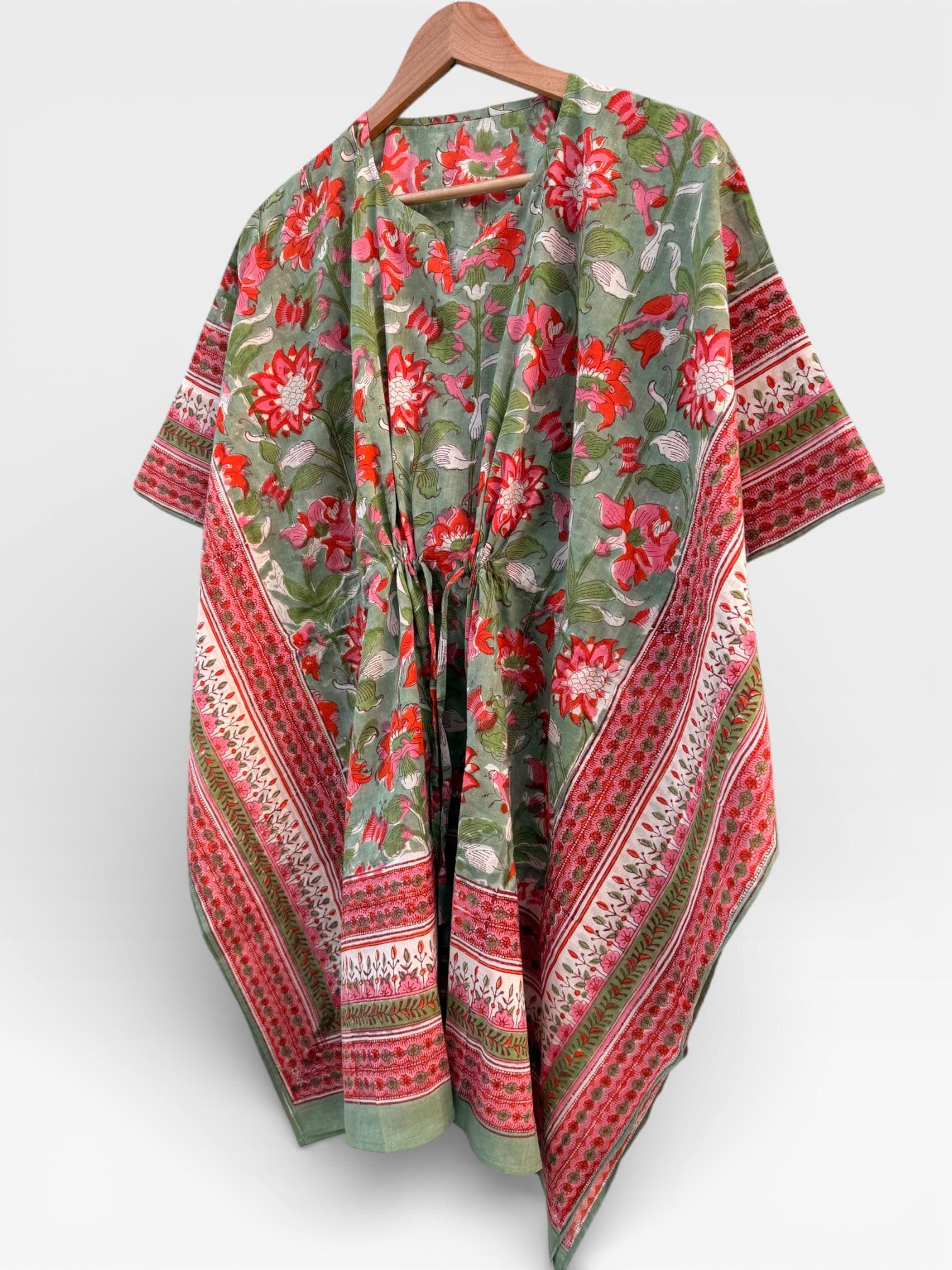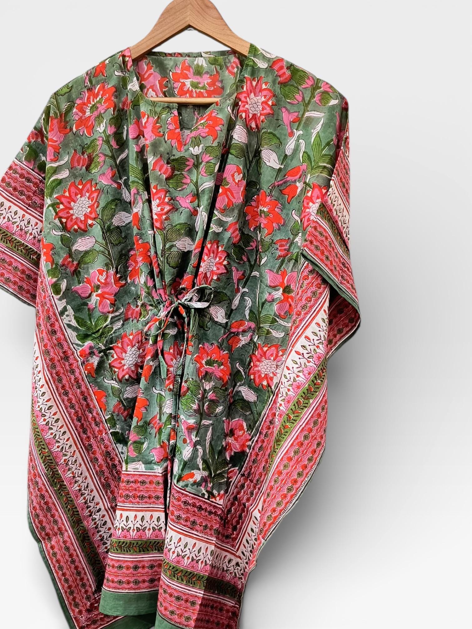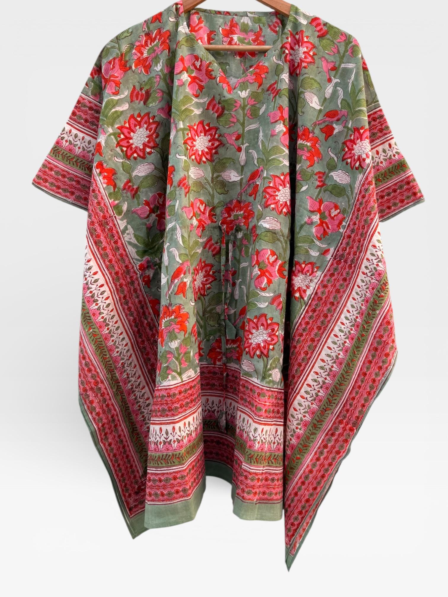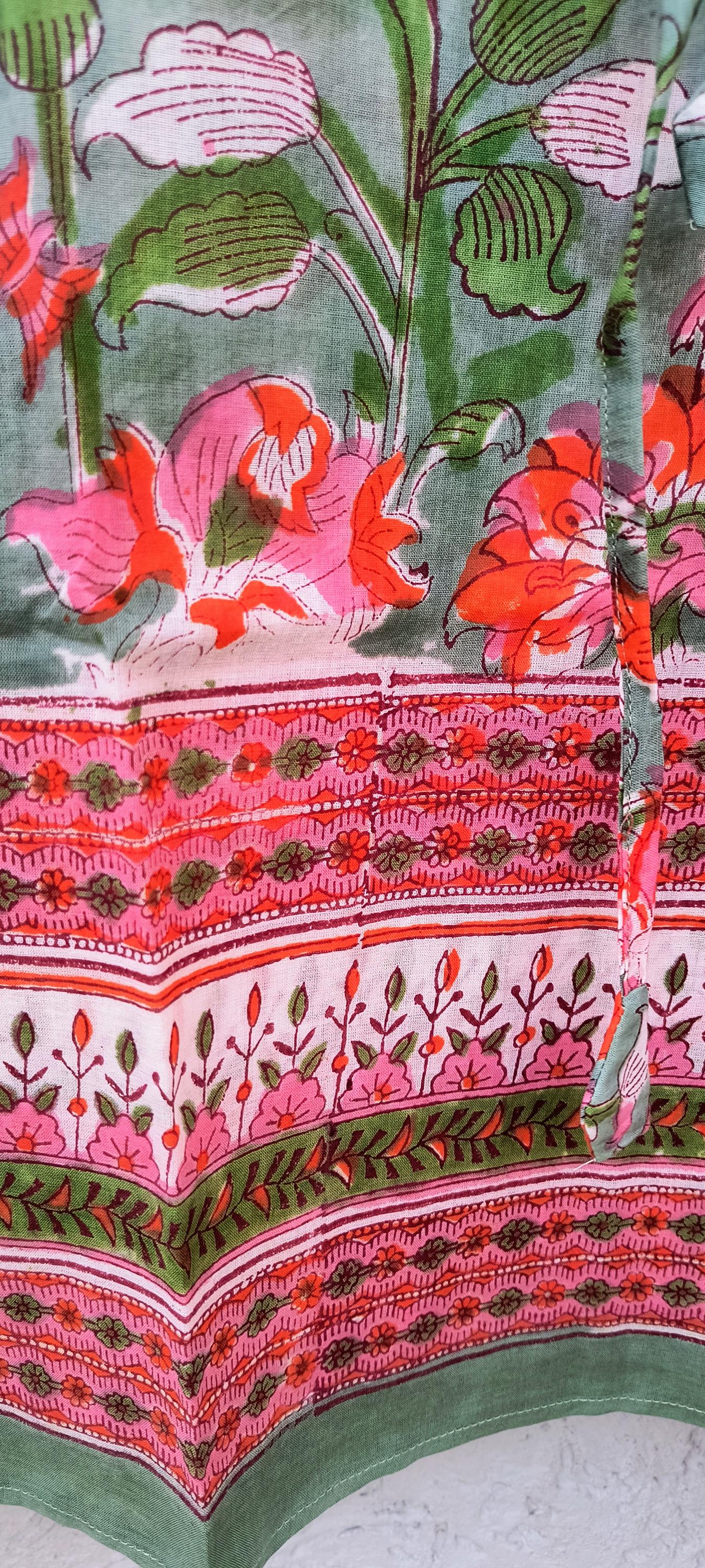 Add effortless charm to your everyday wardrobe with this hand block printed short kaftan, crafted in soft, breathable cotton. Featuring a beautiful green base with red and pink floral motifs, this kaftan showcases traditional Indian block printing paired with a striking contrast border.