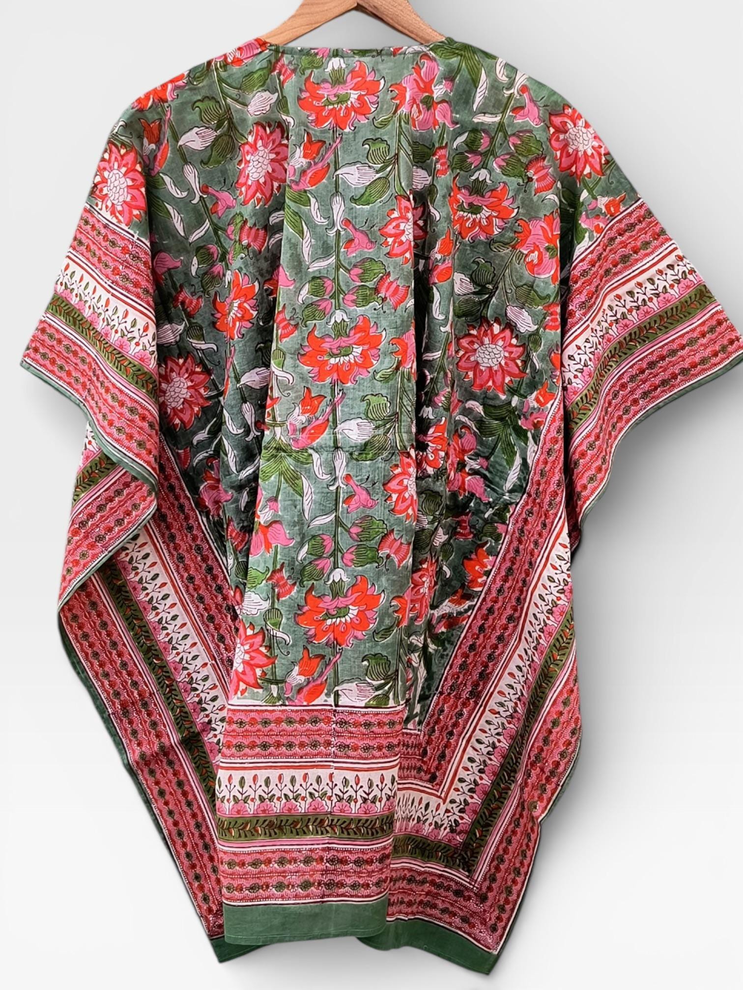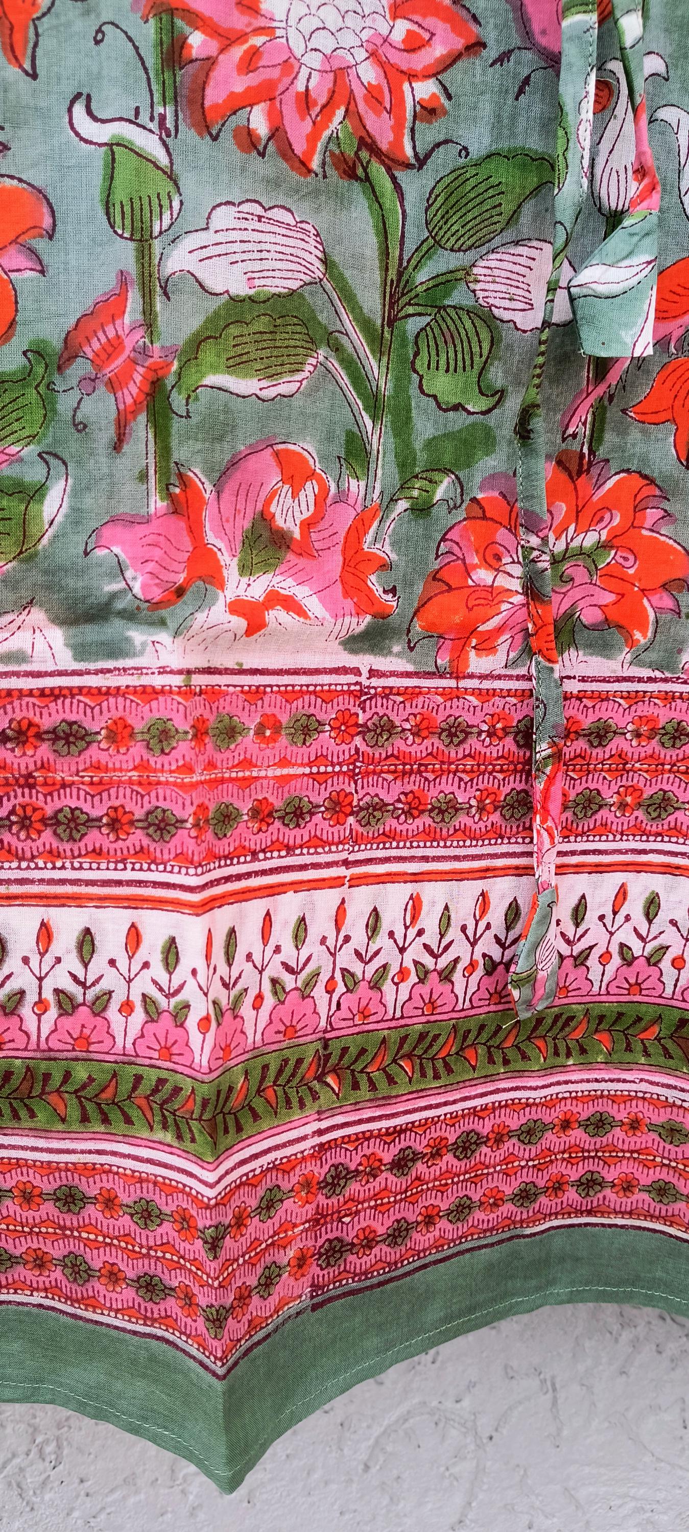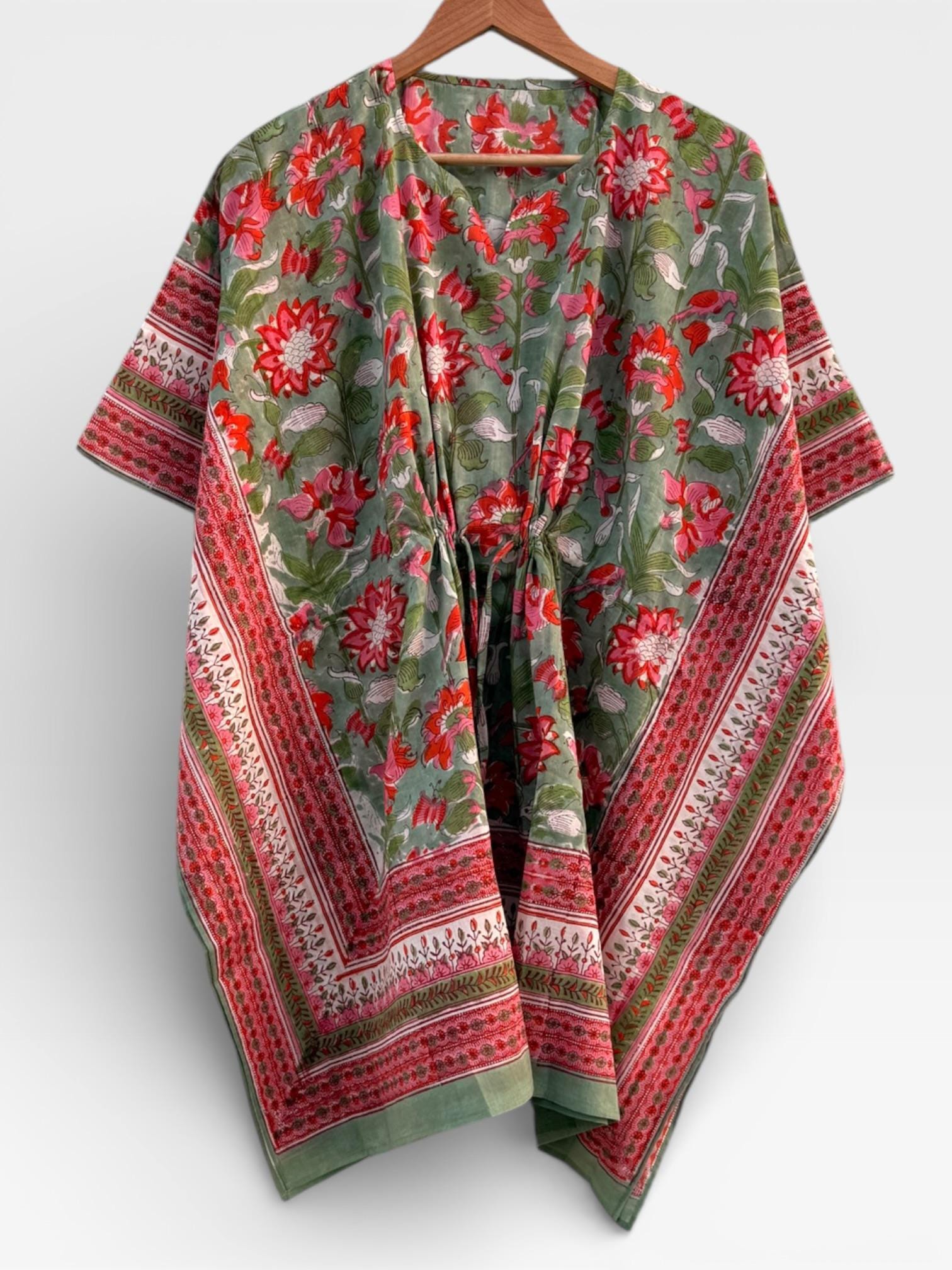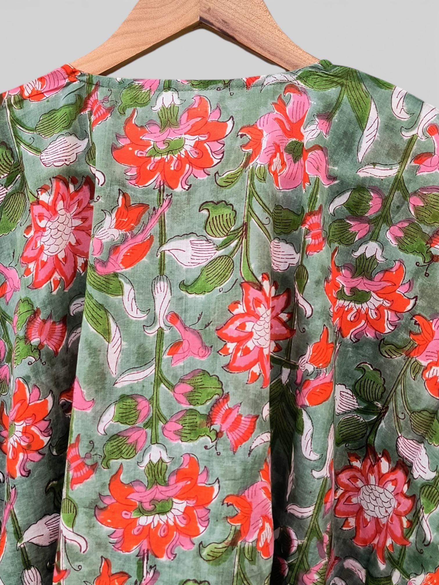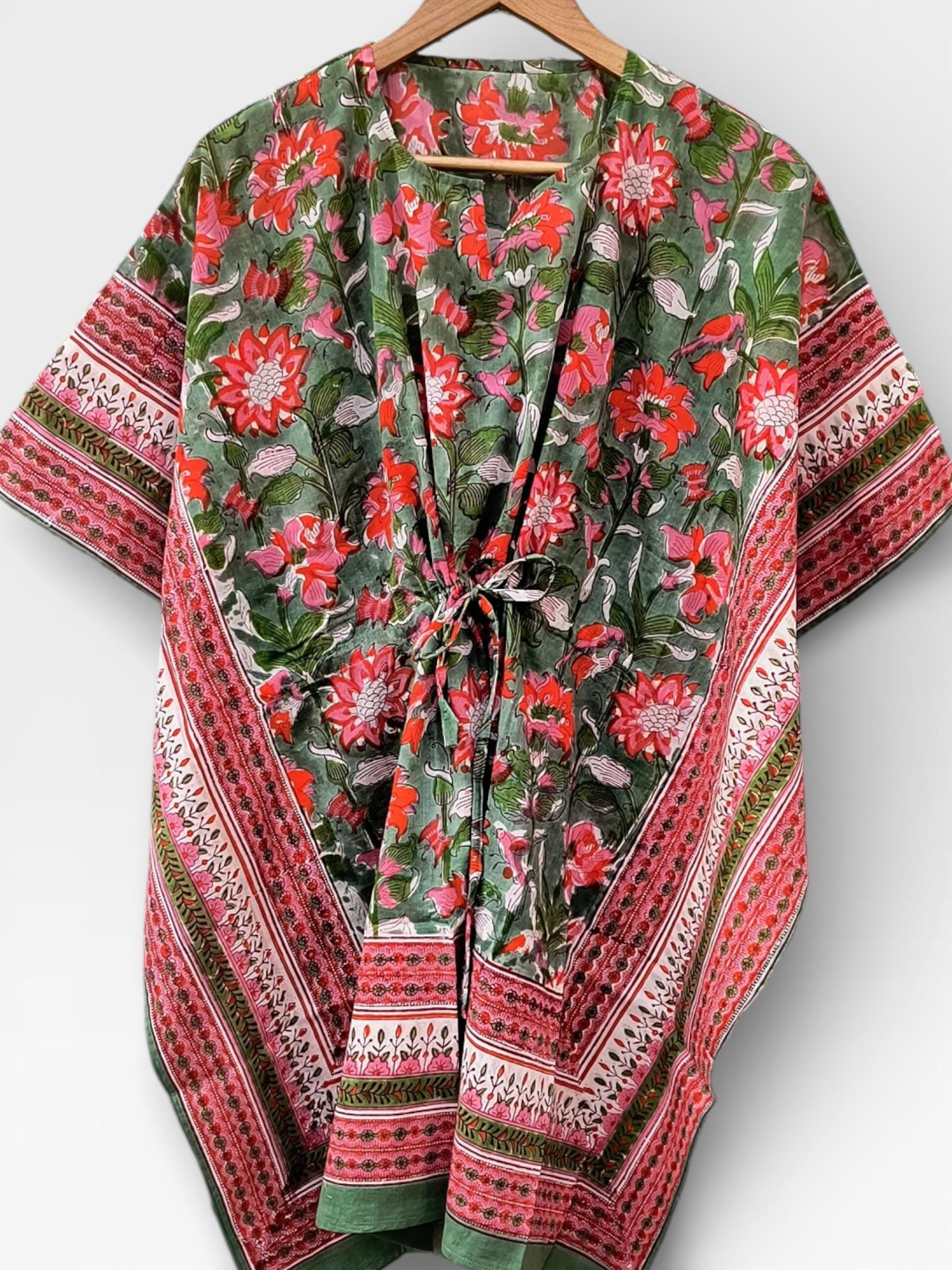 Add effortless charm to your everyday wardrobe with this hand block printed short kaftan, crafted in soft, breathable cotton. Featuring a beautiful green base with red and pink floral motifs, this kaftan showcases traditional Indian block printing paired with a striking contrast border.