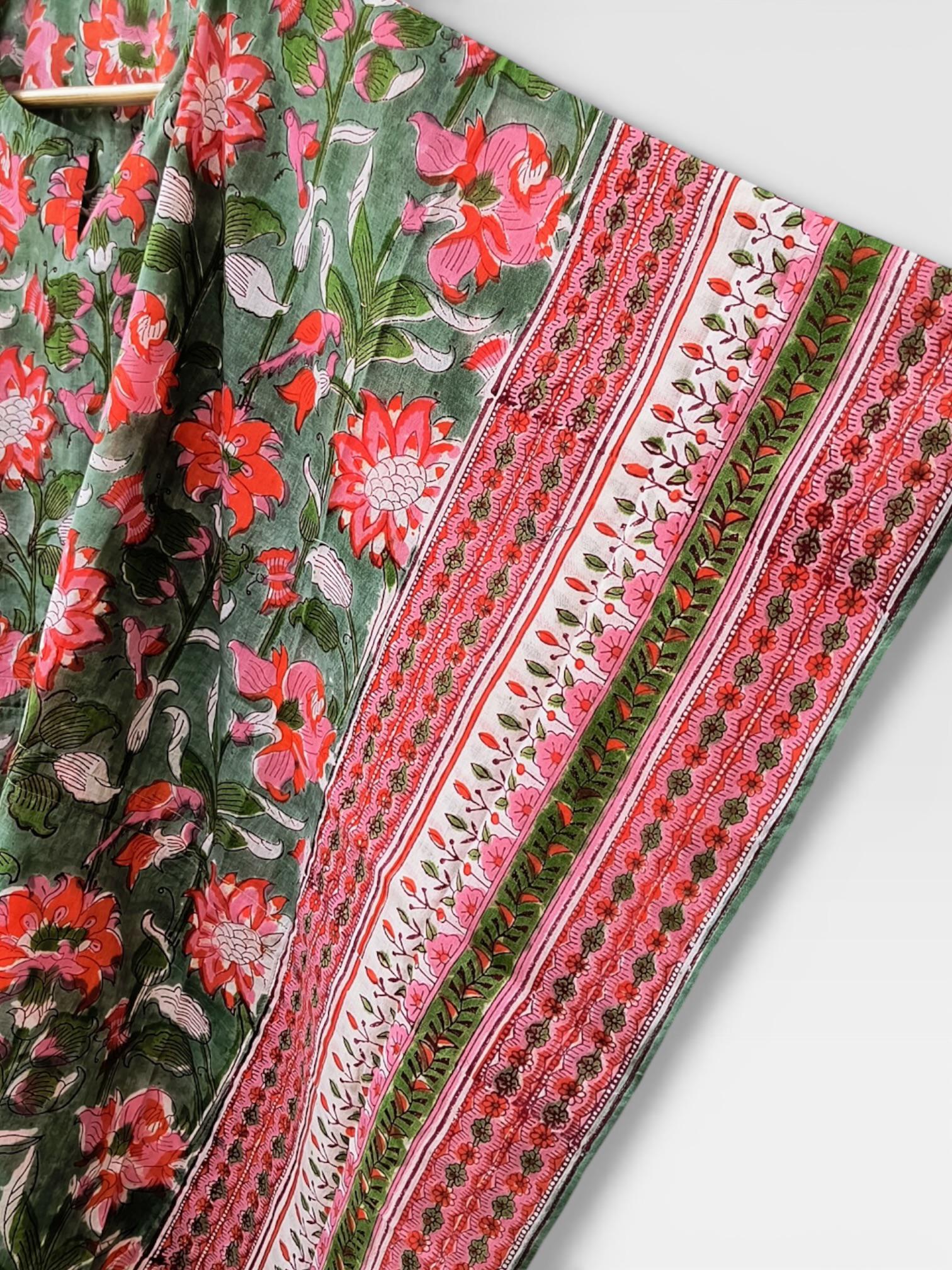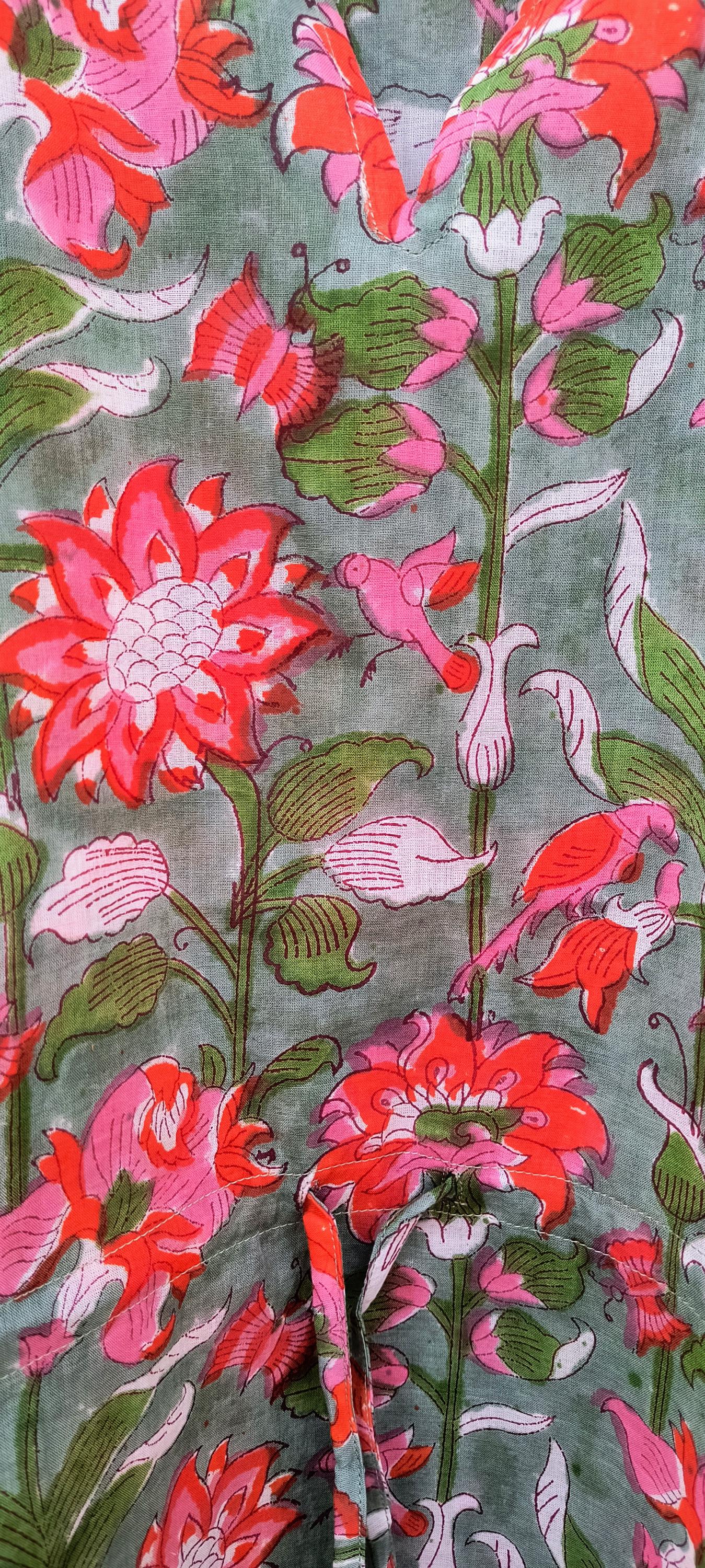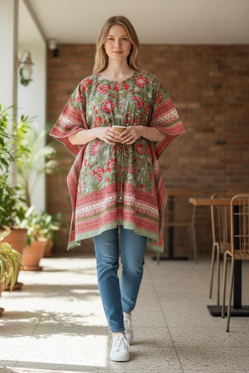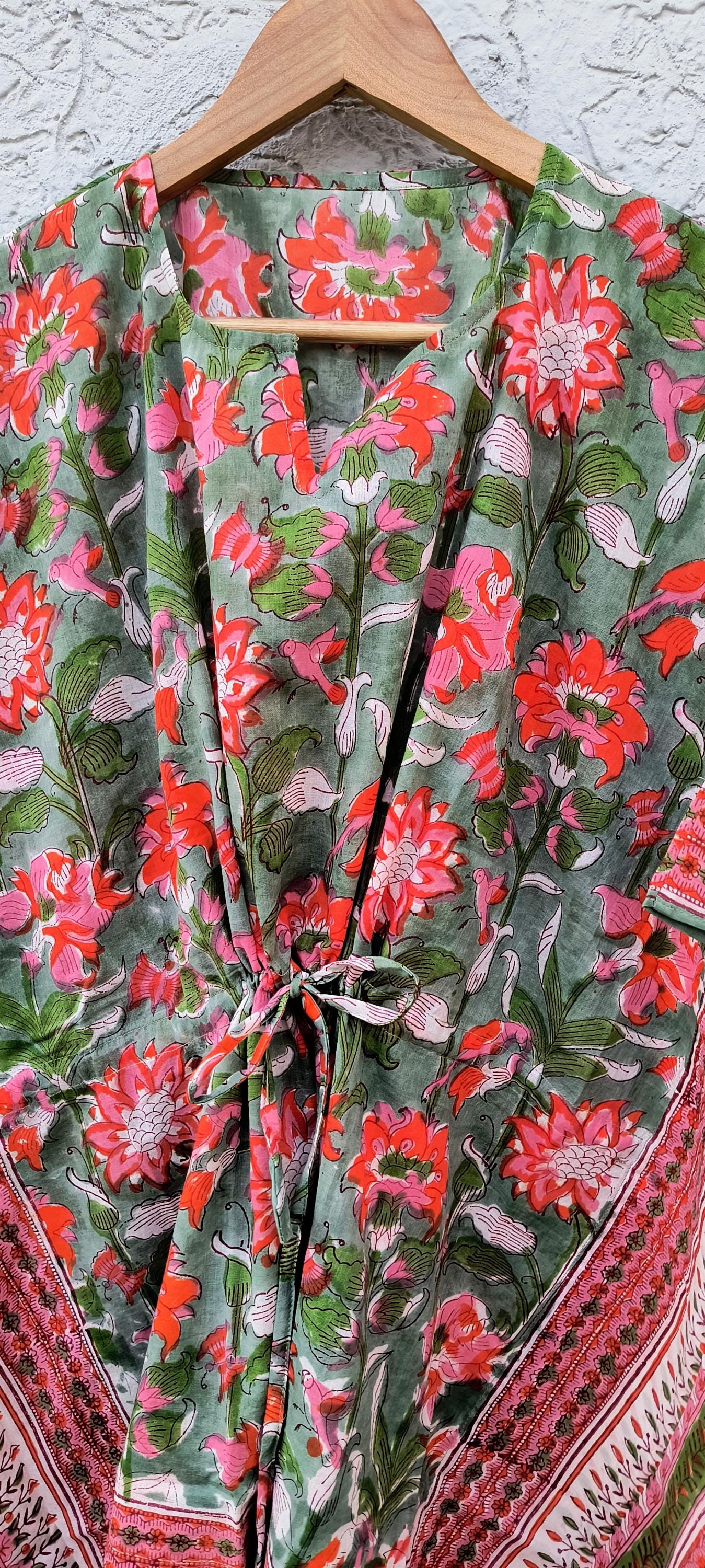 Add effortless charm to your everyday wardrobe with this hand block printed short kaftan, crafted in soft, breathable cotton. Featuring a beautiful green base with red and pink floral motifs, this kaftan showcases traditional Indian block printing paired with a striking contrast border.