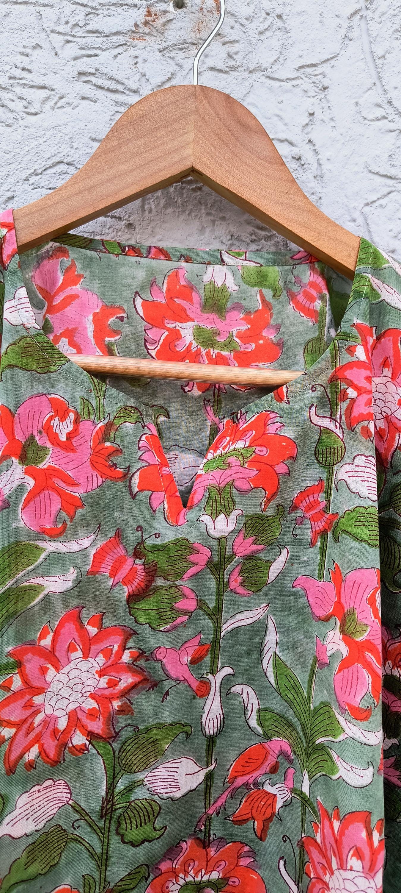 Hand Block Printed Short Cotton Kaftan – Sage Green, Red & Pink Floral | Boho Summer Kaftan Dress, Relaxed Fit Tunic
