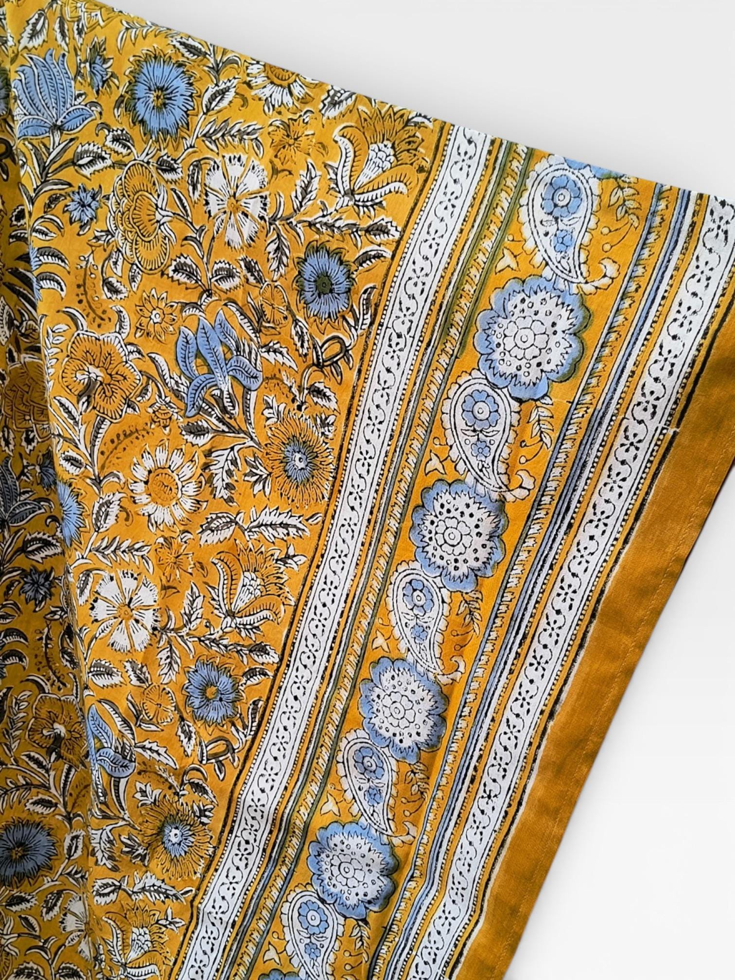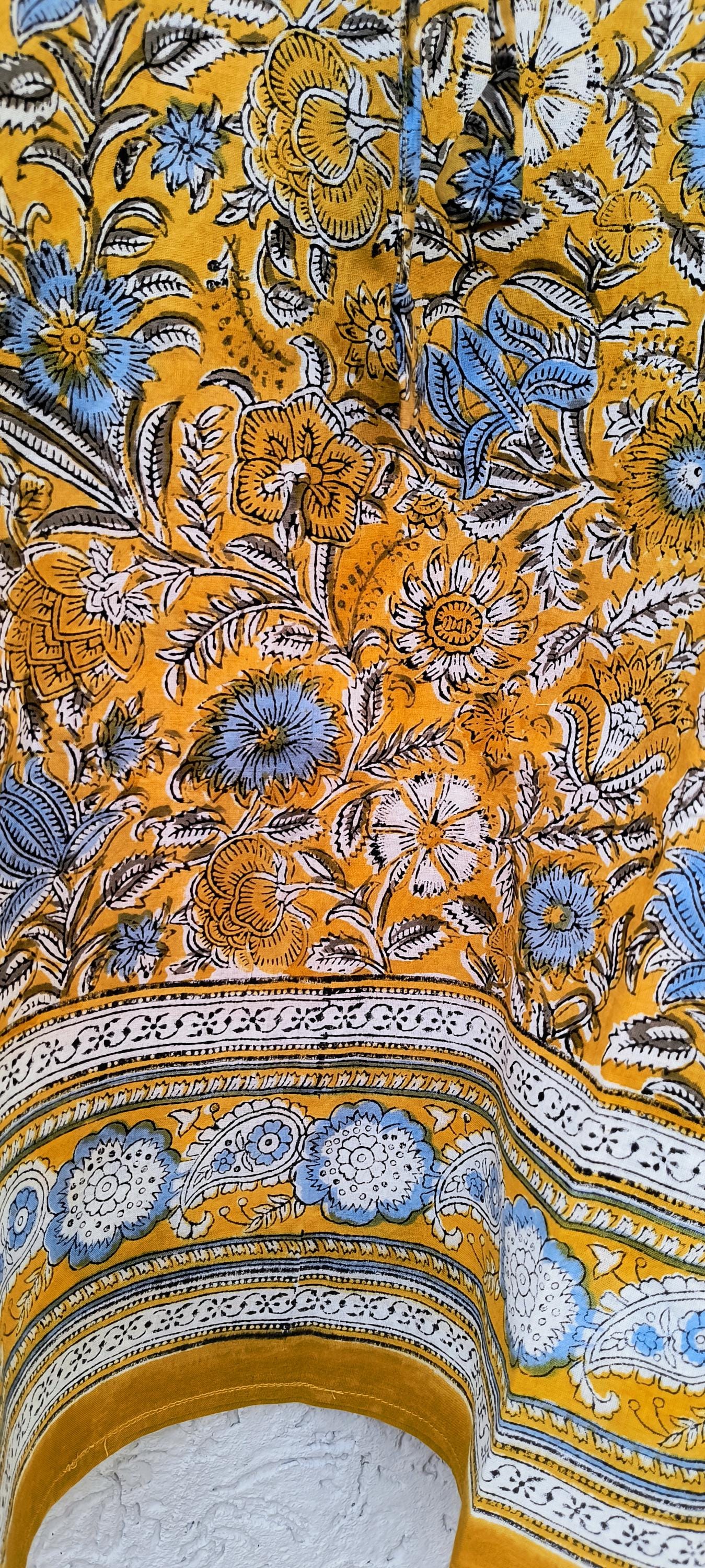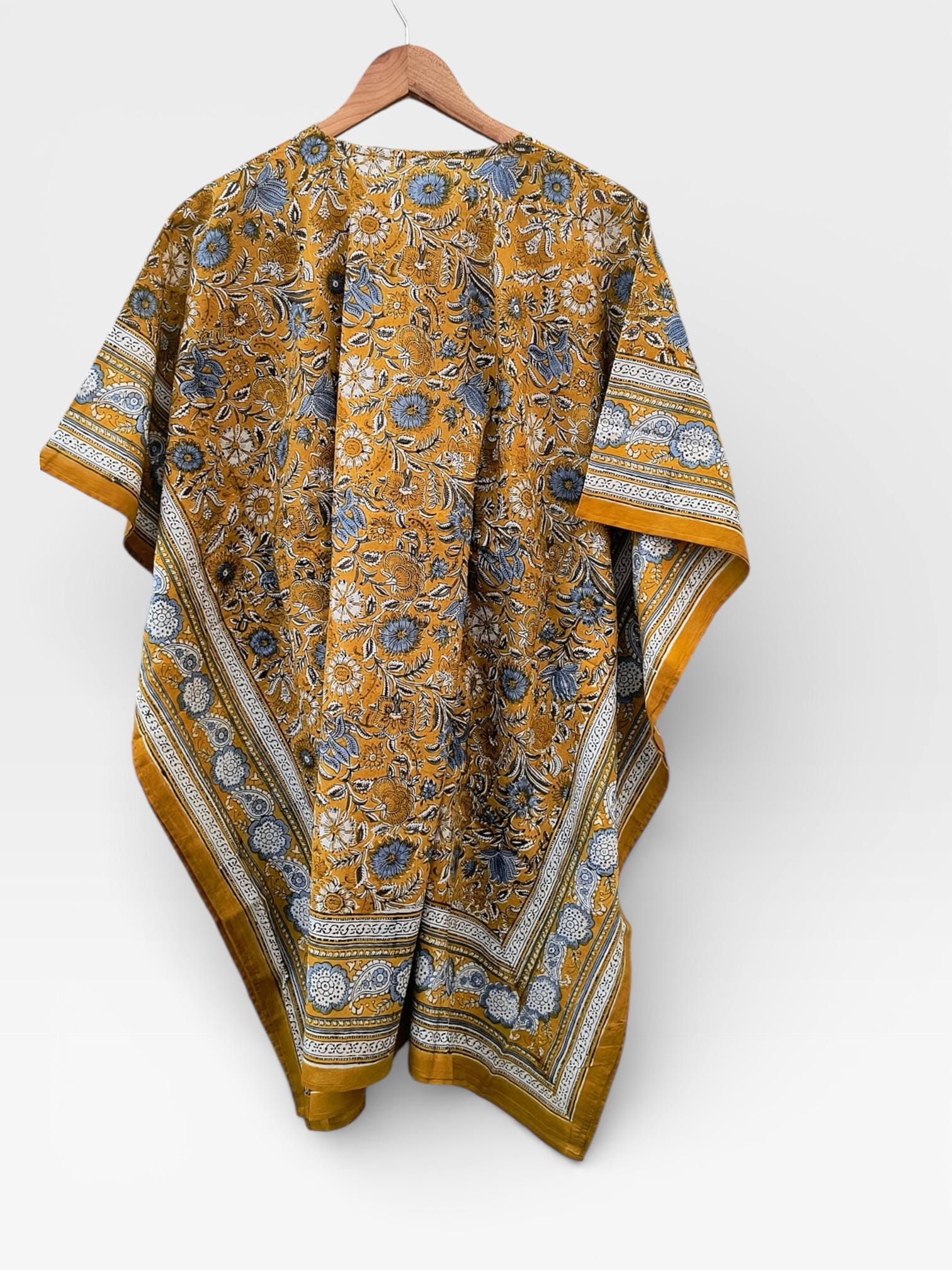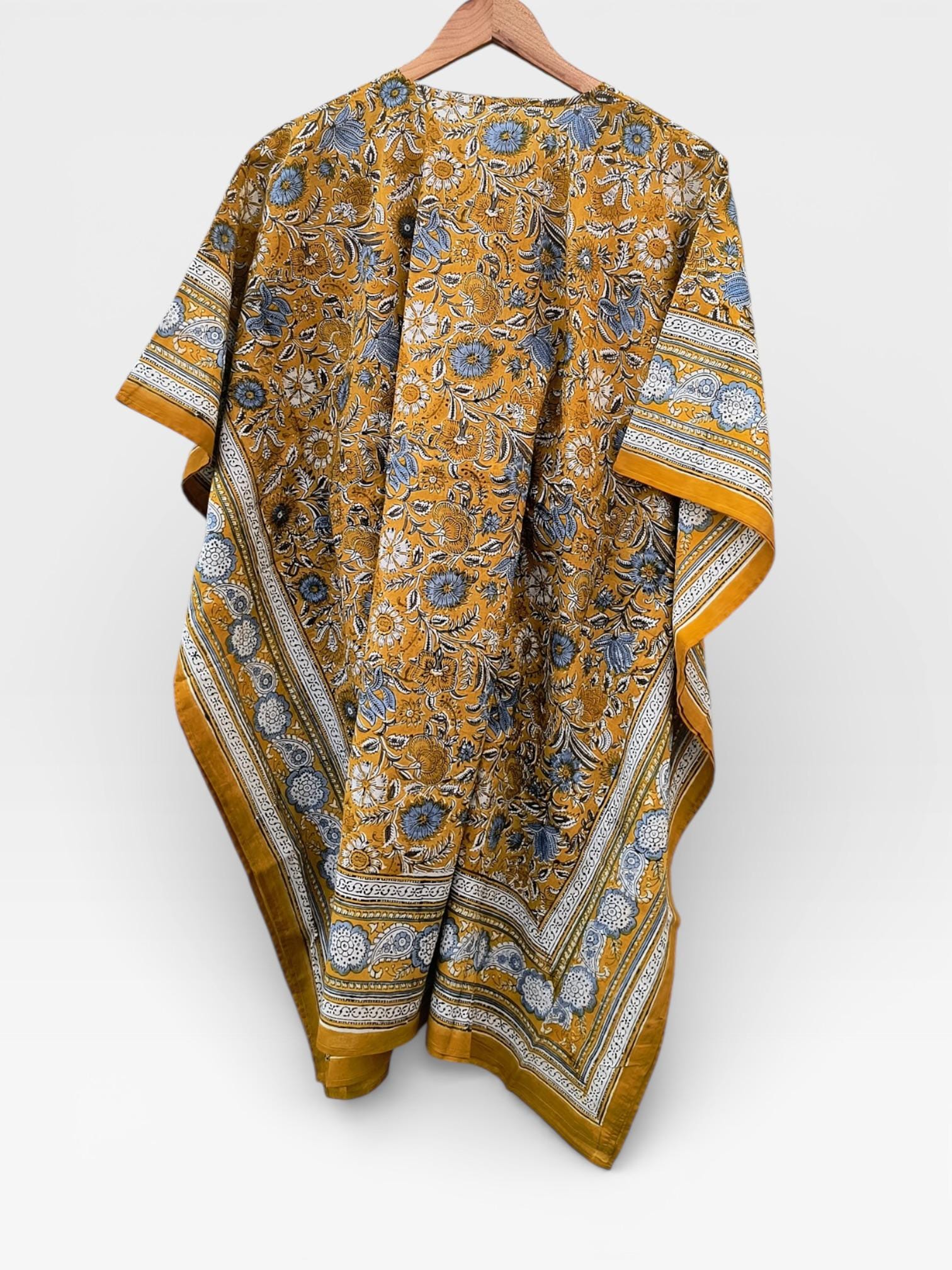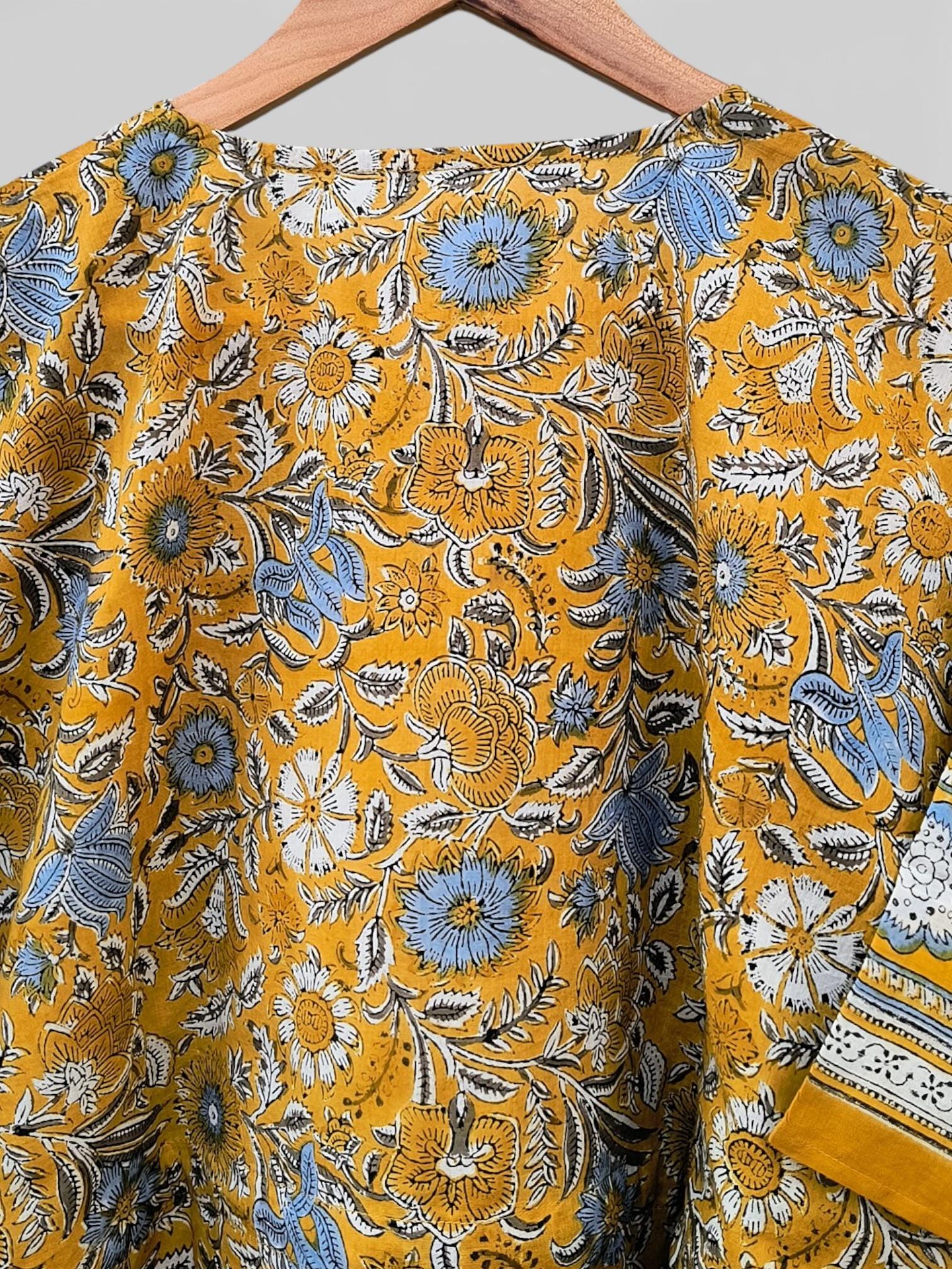 Bright and cheerful, this short hand block printed kaftan is crafted from soft, breathable cotton for all-day comfort. It features a rich mustard yellow base beautifully adorned with powder blue, white, and black floral block print motifs, creating a striking yet balanced colour palette.