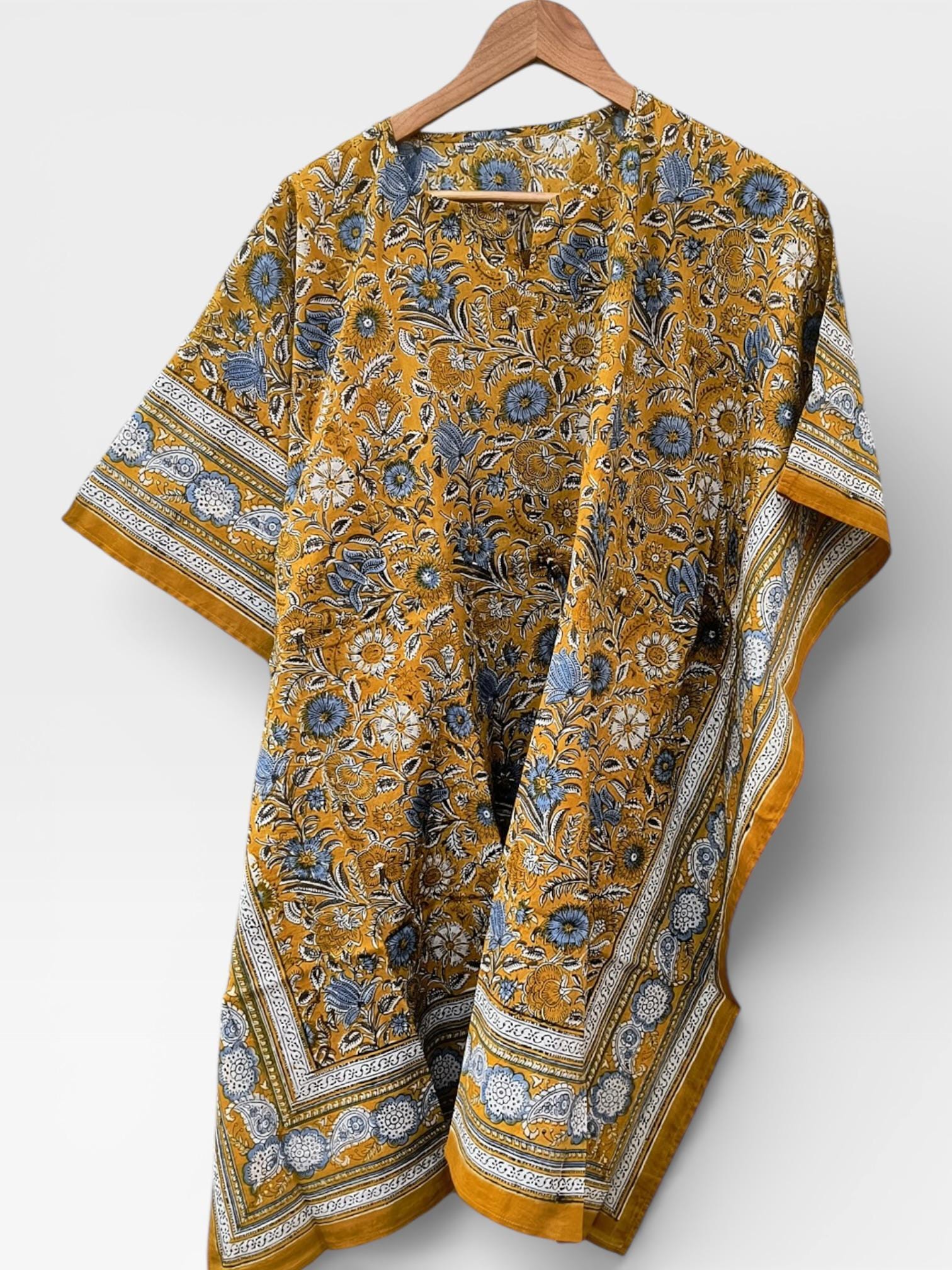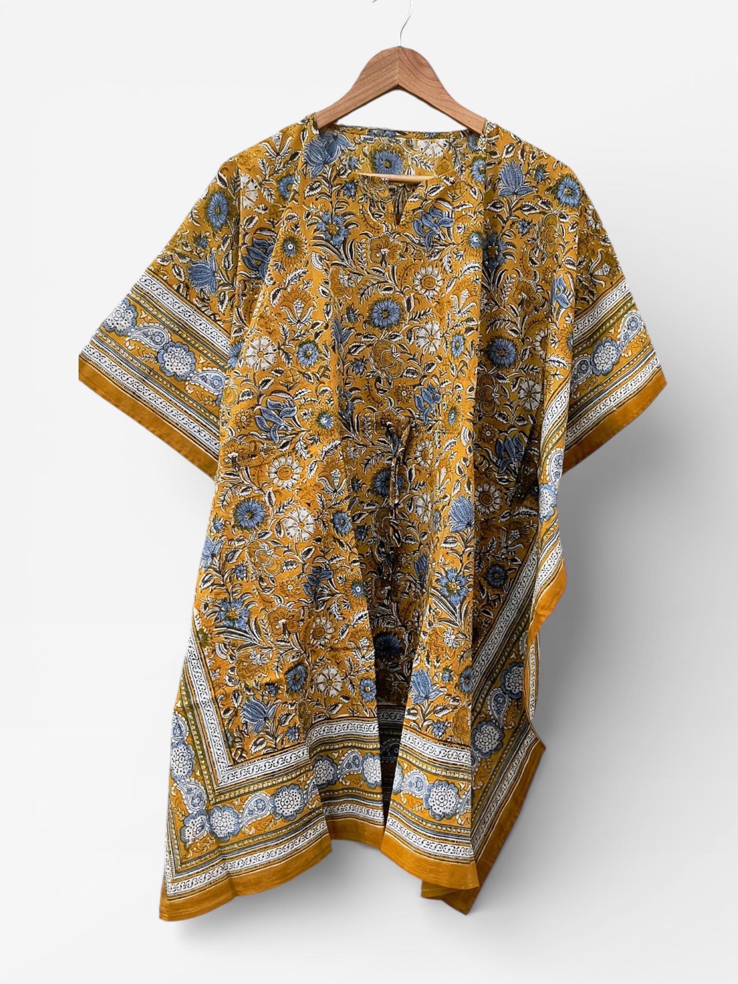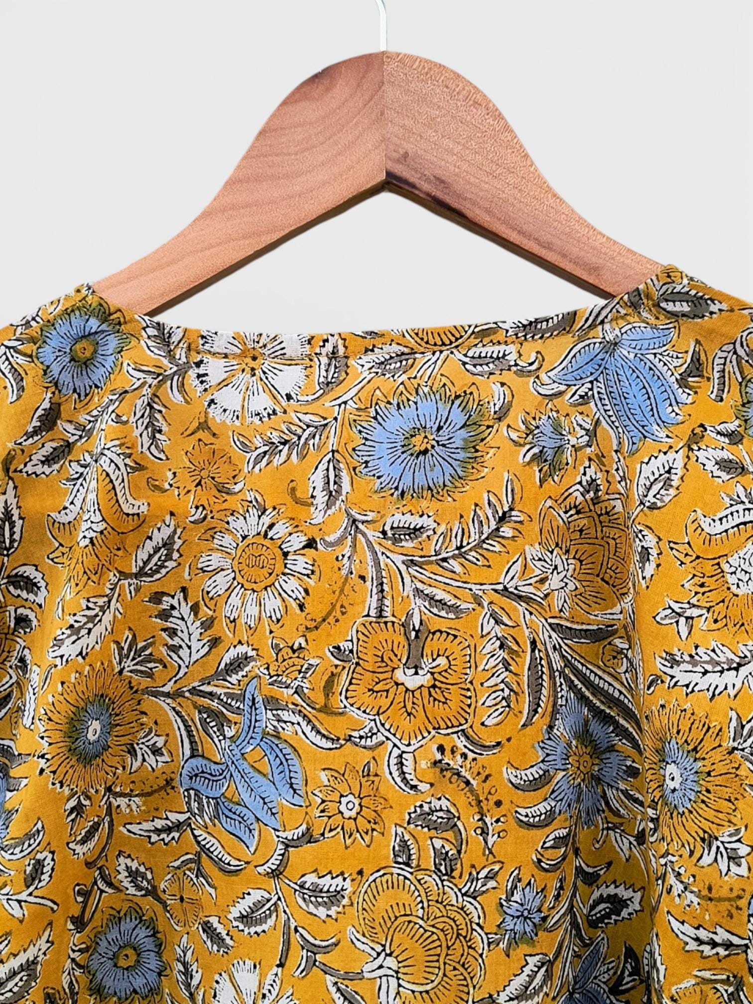 Hand Block Printed Short Cotton Kaftan – Mustard Yellow with Blue & White Floral | Boho Summer Kaftan Dress, Relaxed Fit Tunic