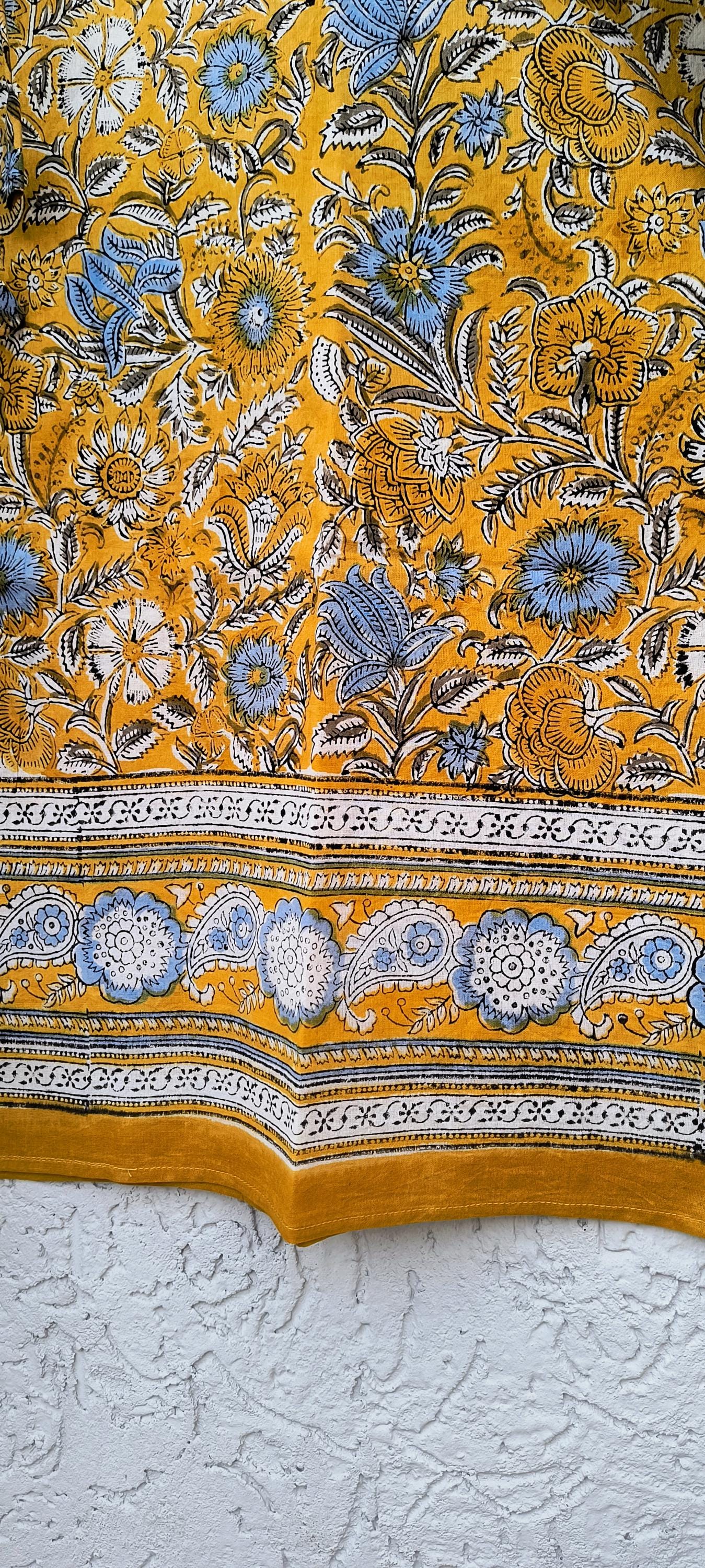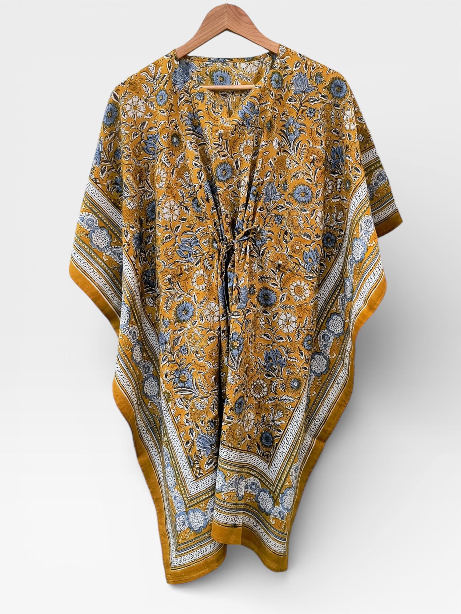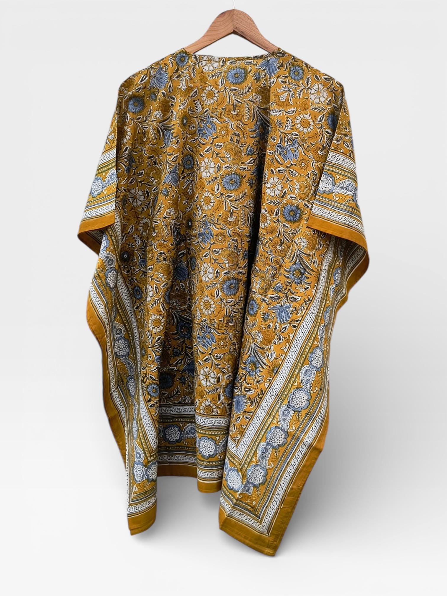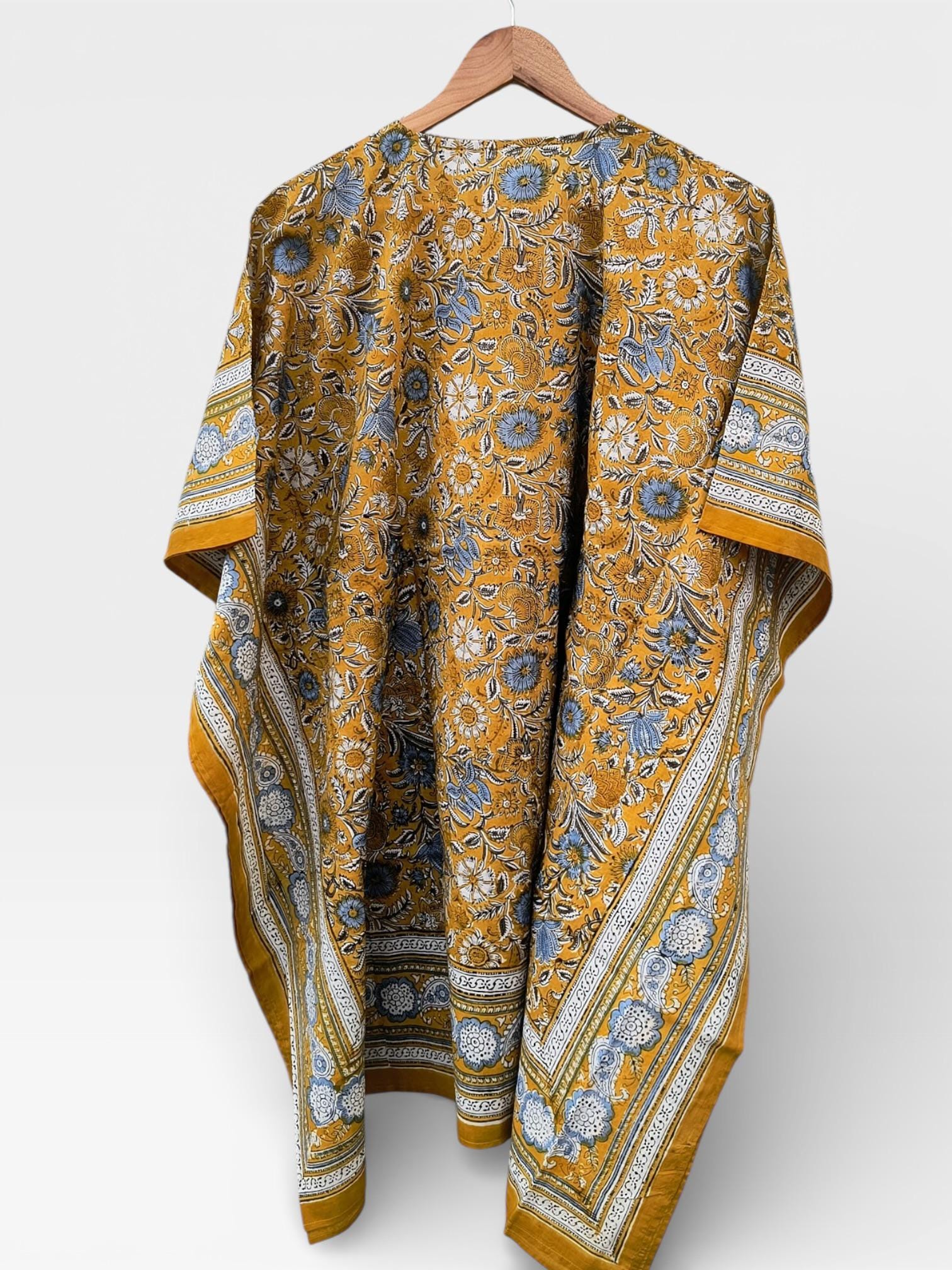 Hand Block Printed Short Cotton Kaftan – Mustard Yellow with Blue & White Floral | Boho Summer Kaftan Dress, Relaxed Fit Tunic
