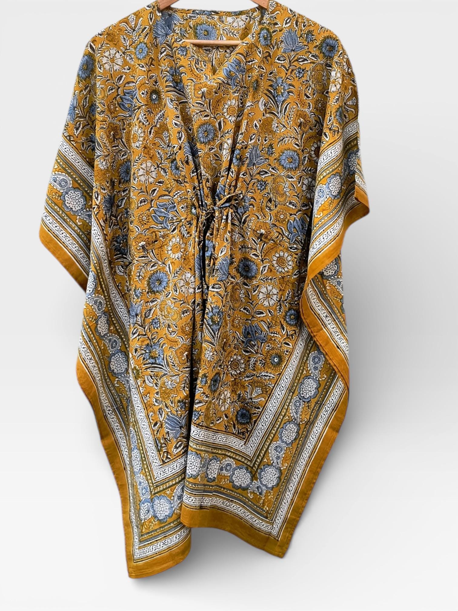 Each kaftan is individually hand block printed, making every piece one of a kind with subtle variations that reflect traditional craftsmanship.