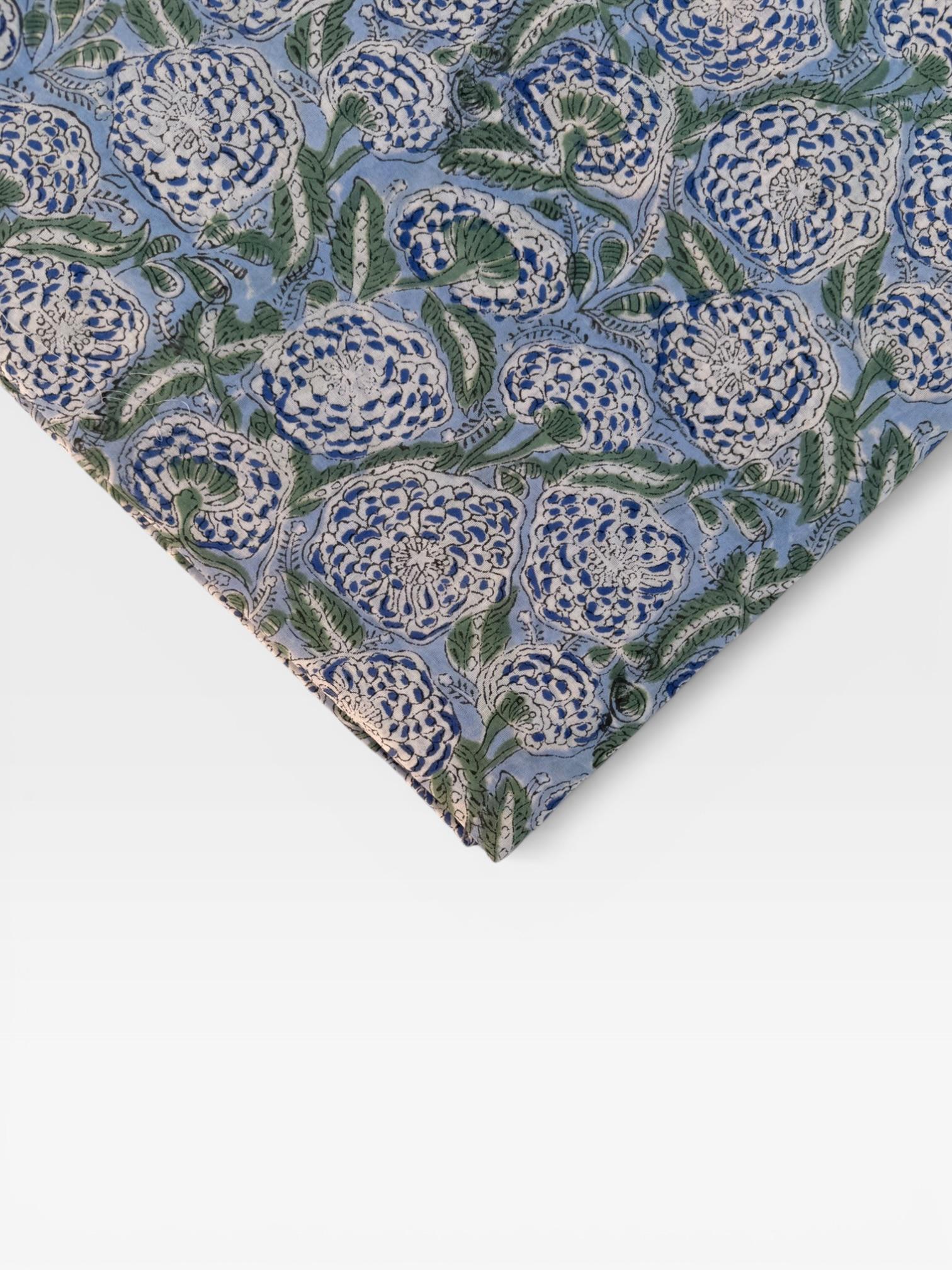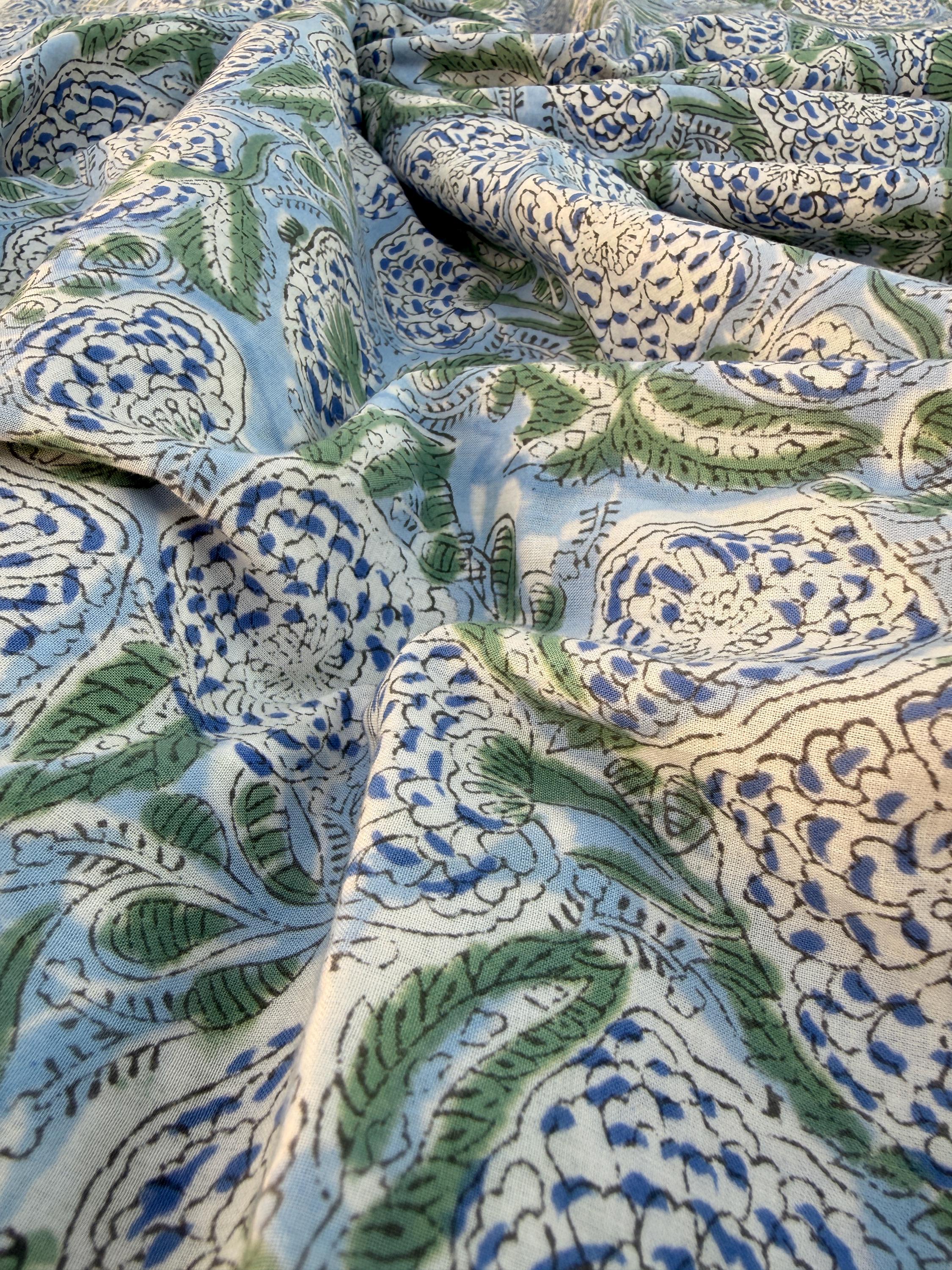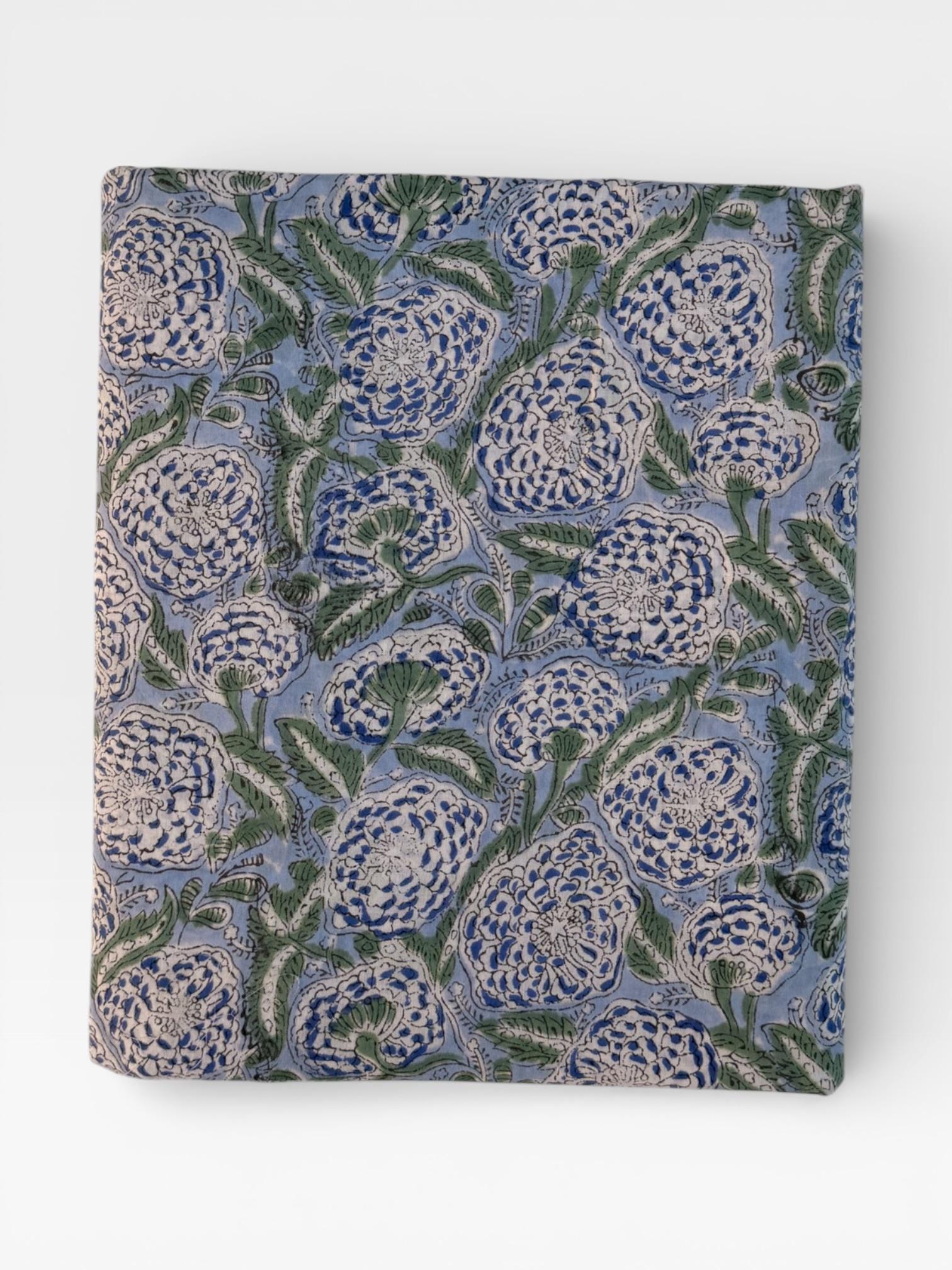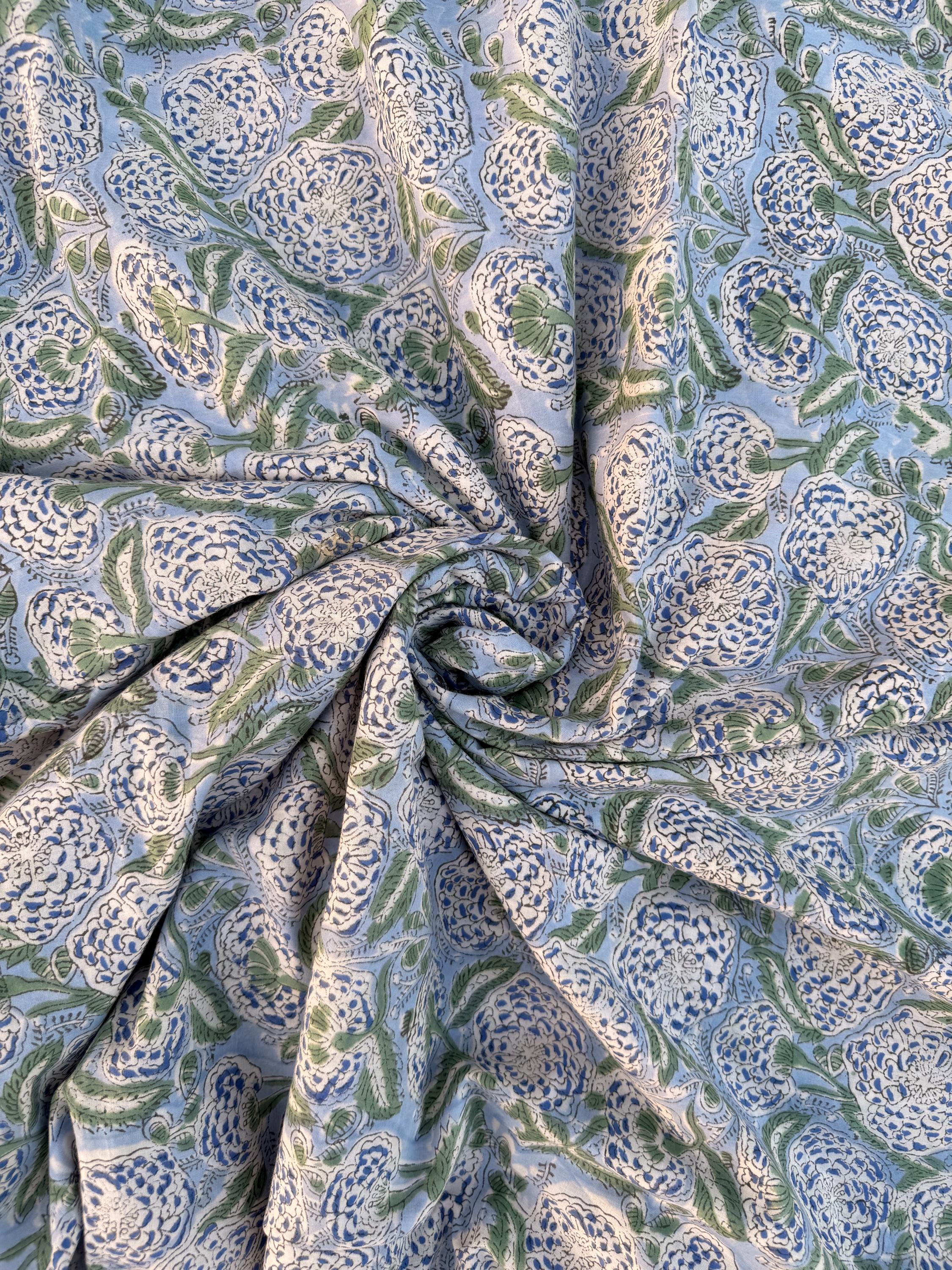 Hand Block Printed Cotton Fabric – Powder Blue Base with White & Indigo Floral Design | Indian Blockprint Fabric for Sewing and Home Décor