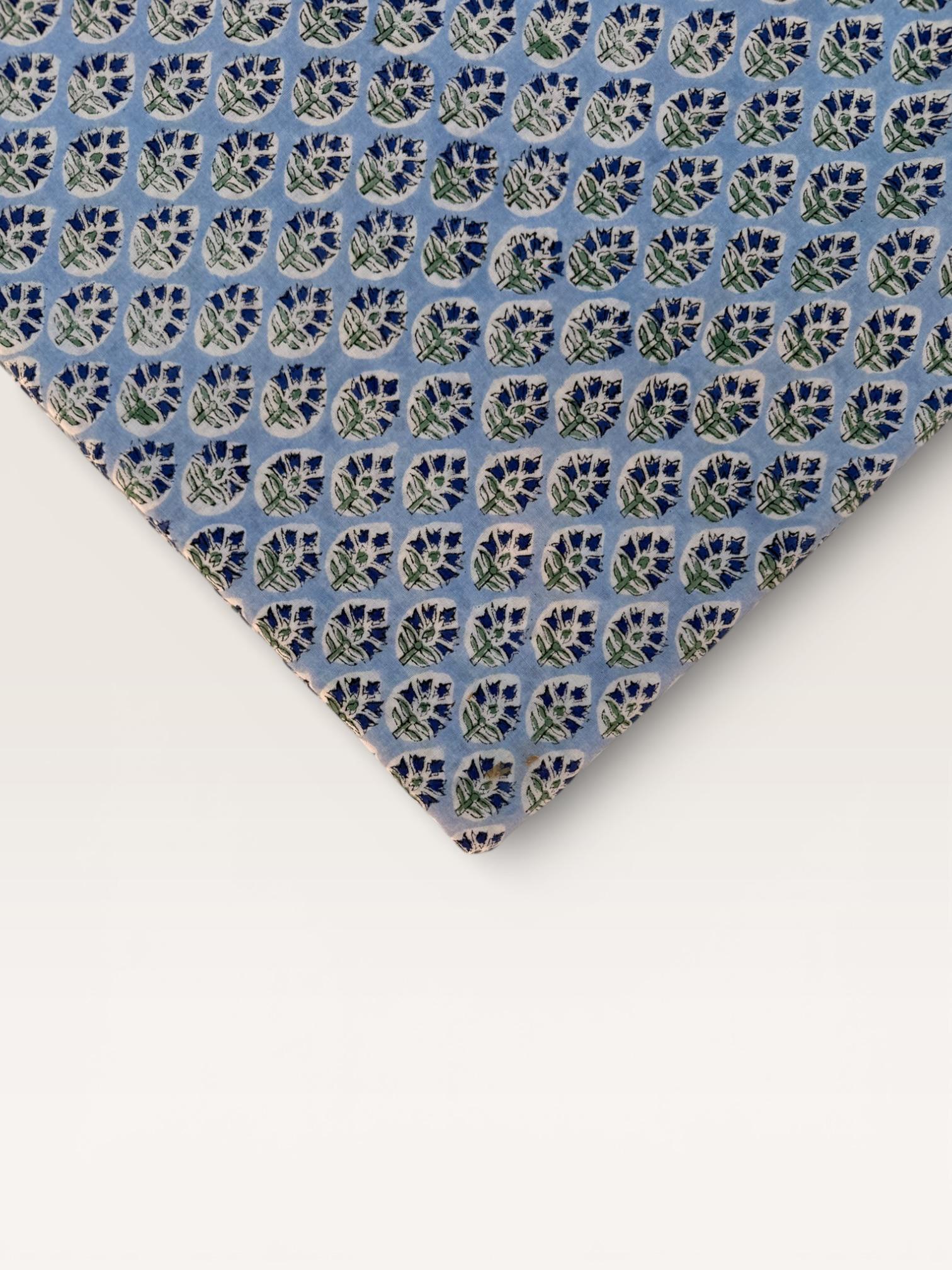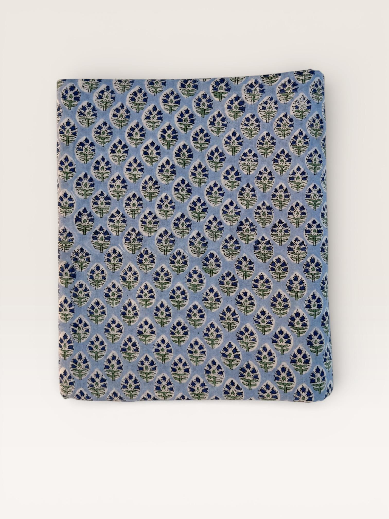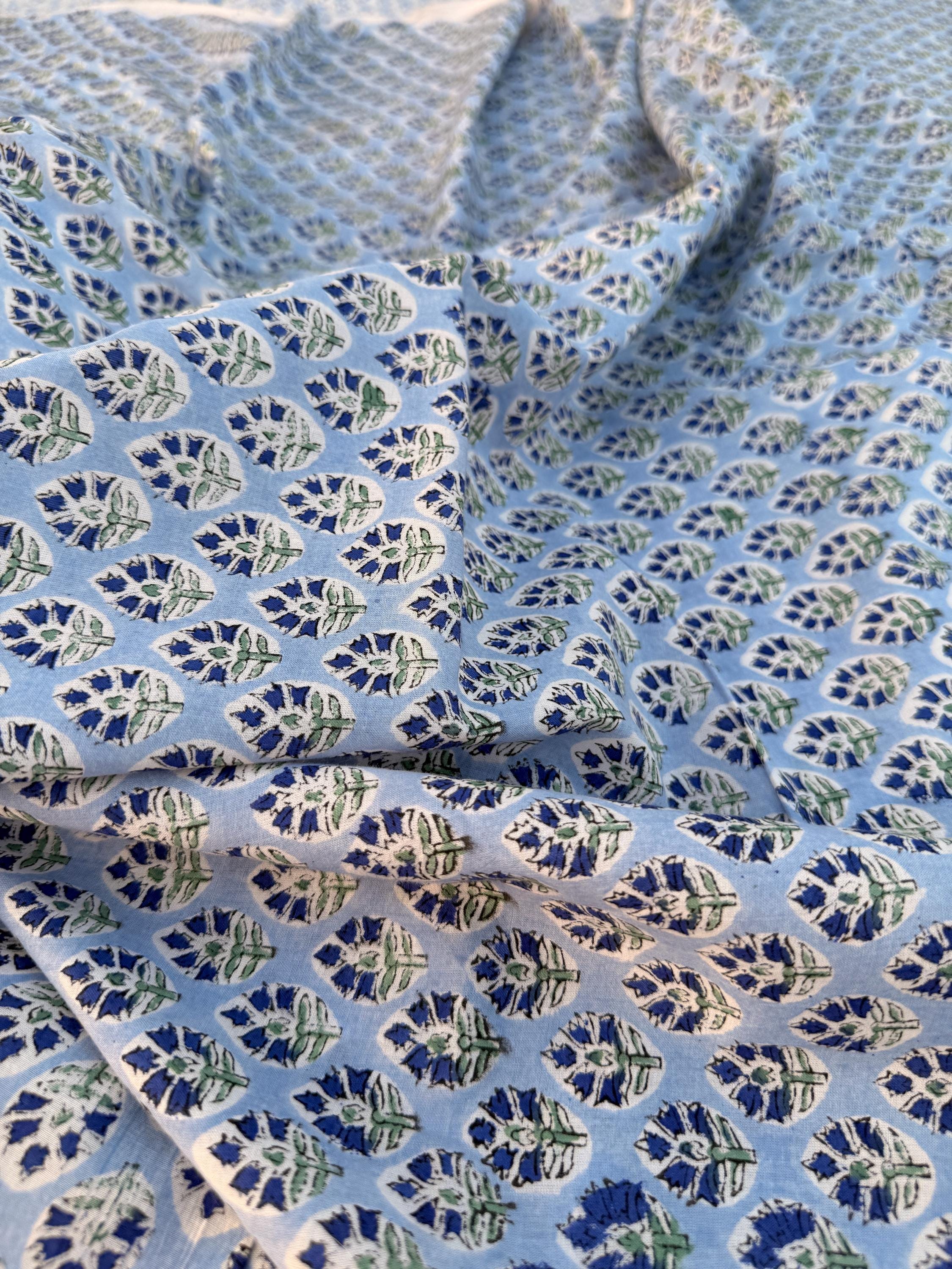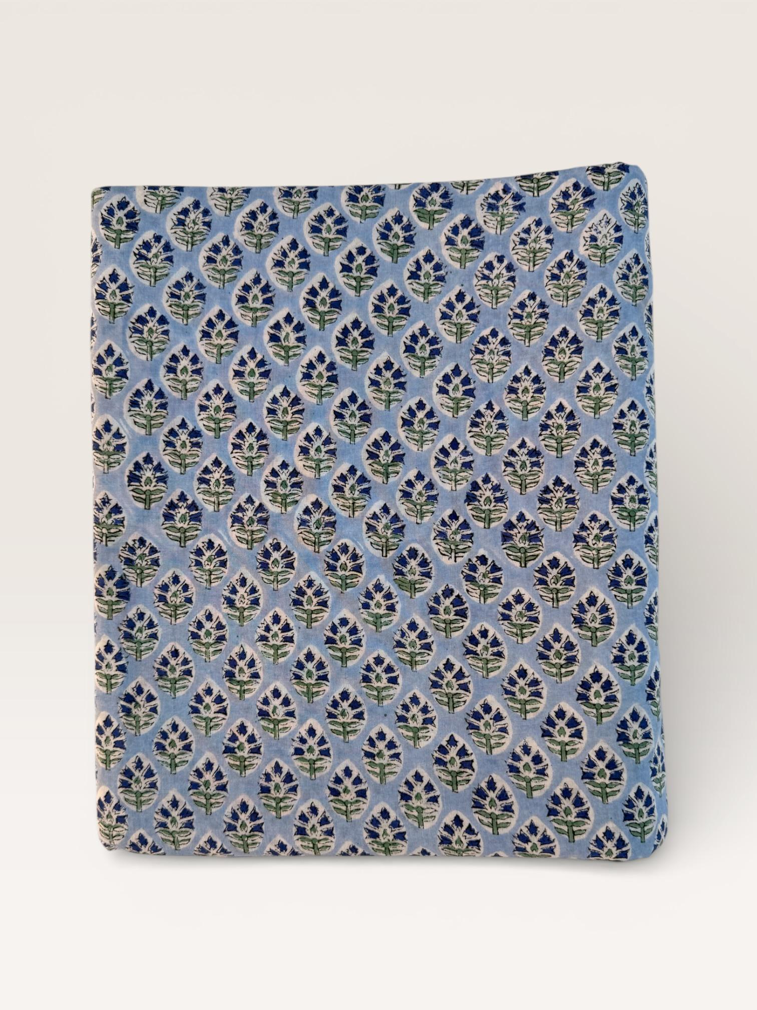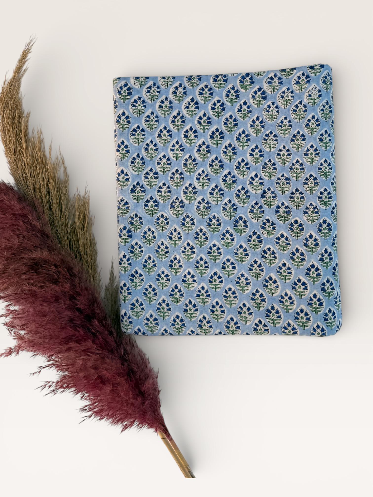 Hand Block Printed Cotton Fabric – Powder Blue Base with White & Indigo Floral motif | Indian Blockprint Fabric for Sewing and Home Décor