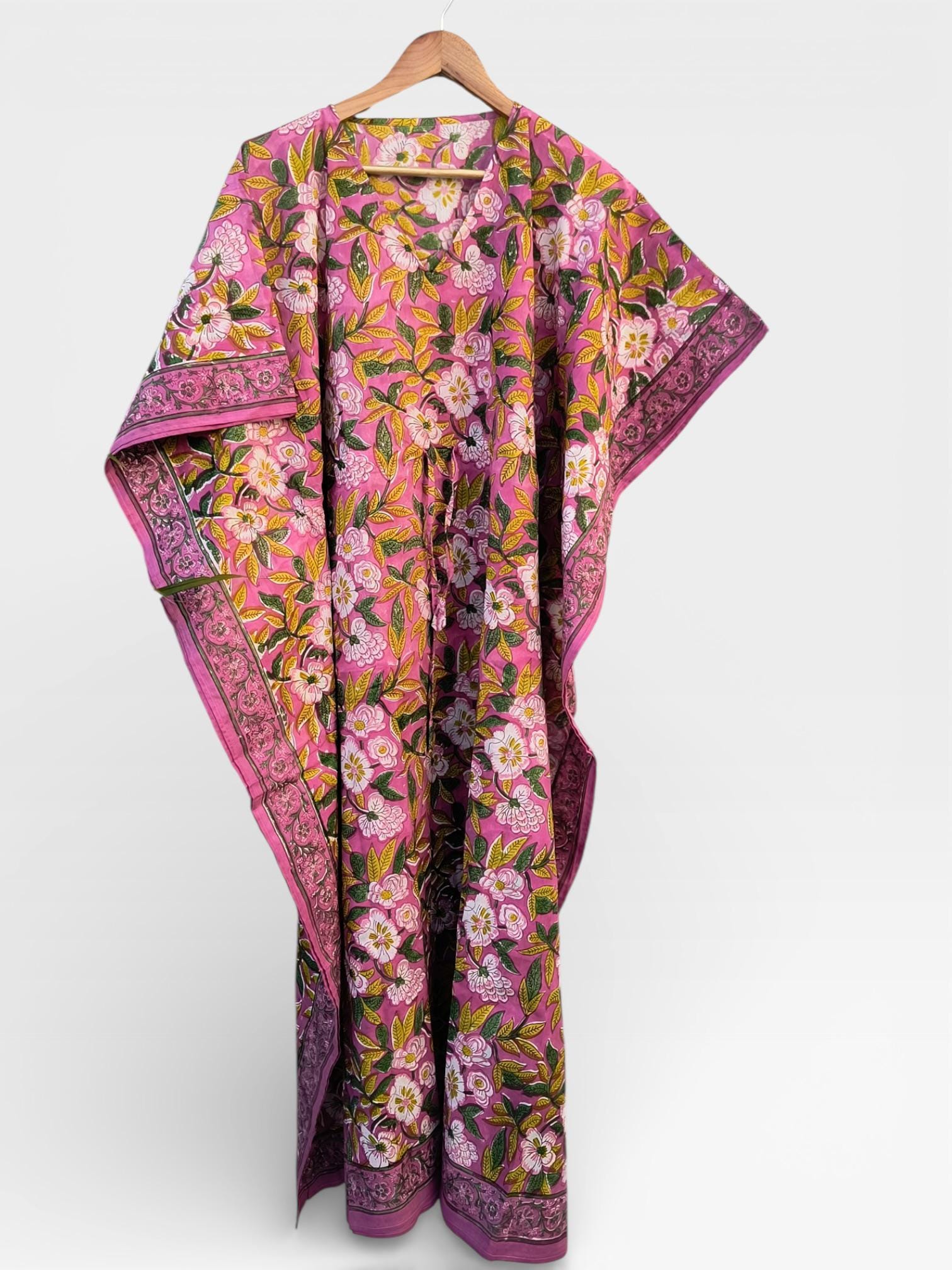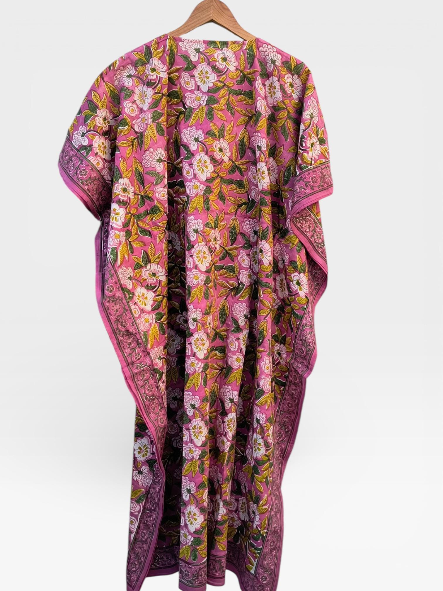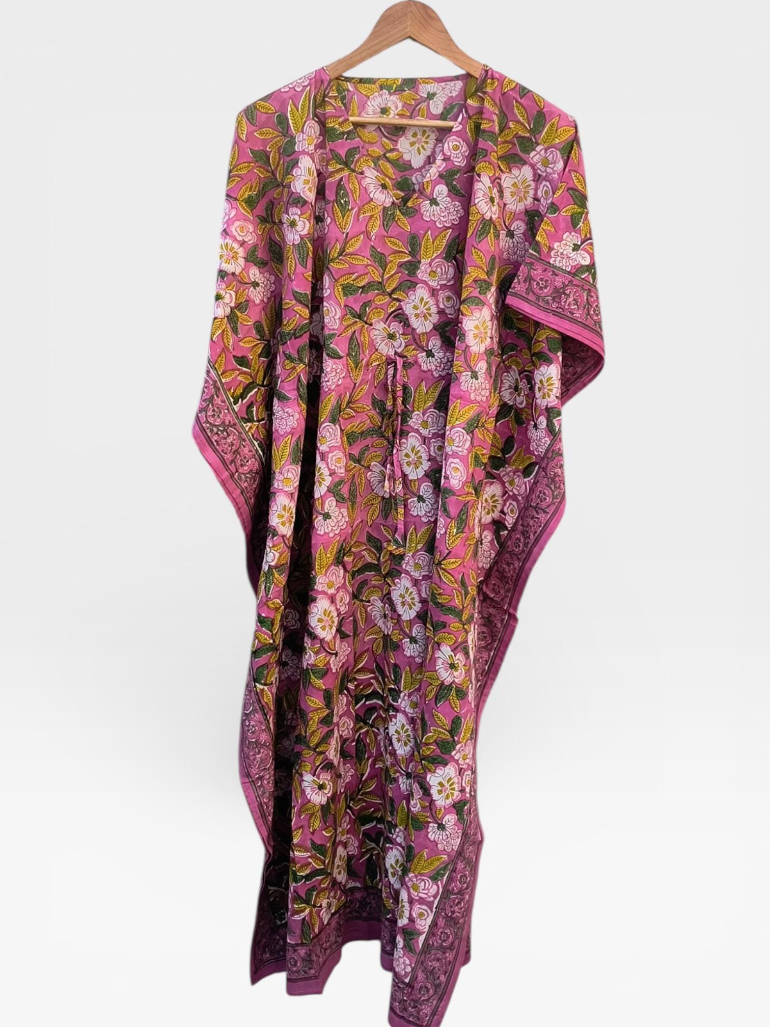 Featuring a soft pink base with delicate floral and leafy motifs in earthy greens and warm tones, this kaftan is finished with a traditional printed border that adds a refined handcrafted touch.