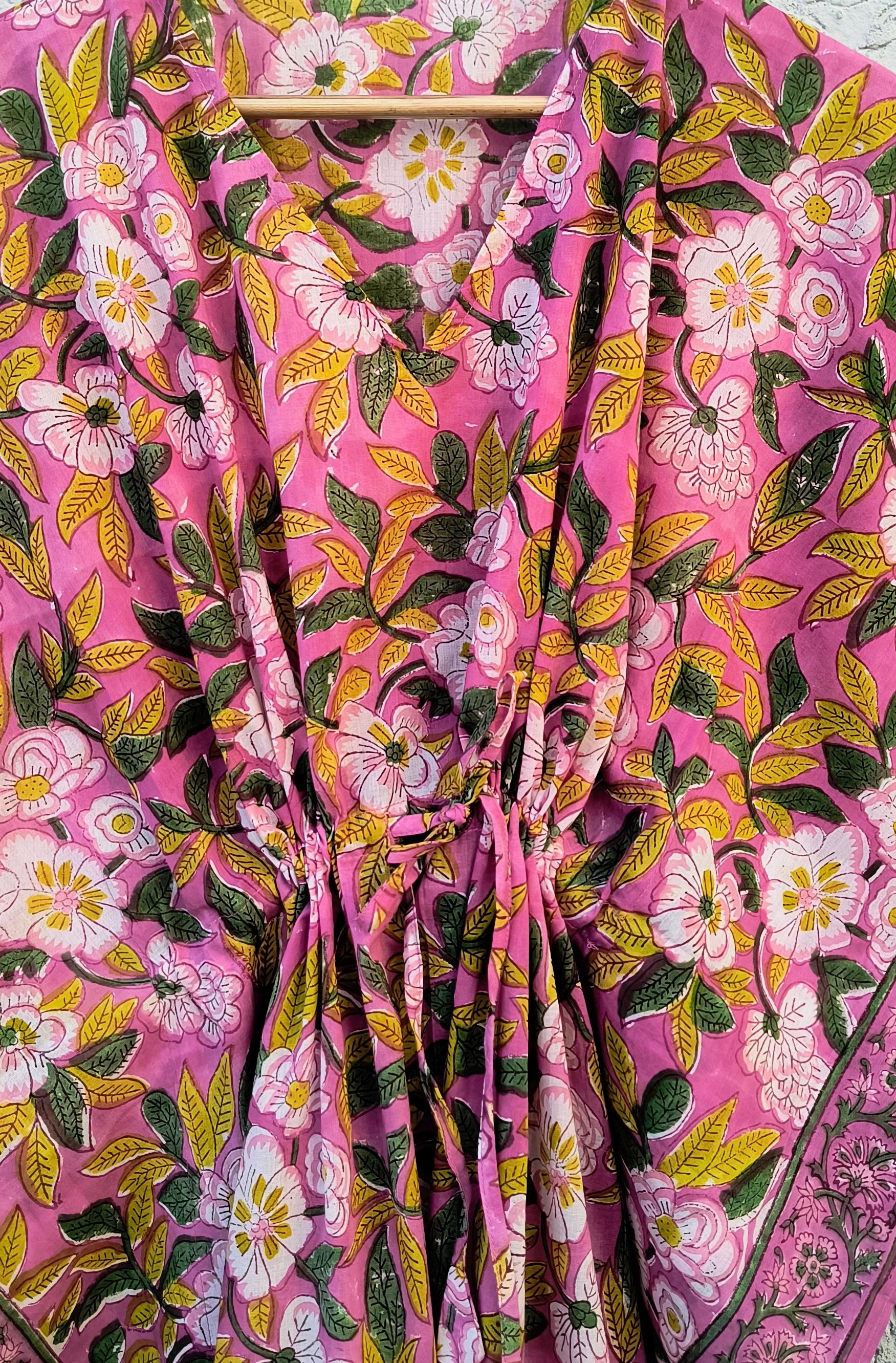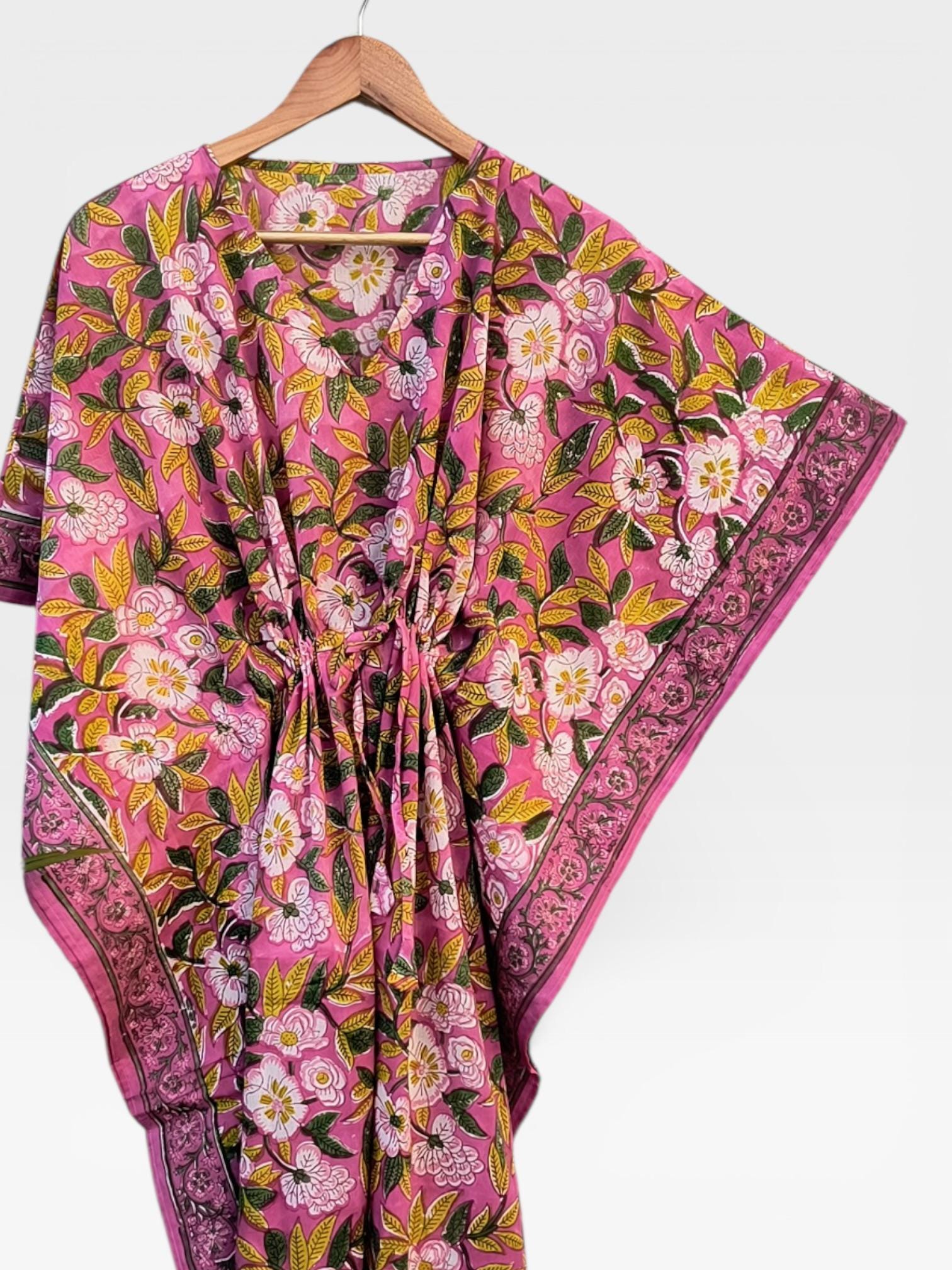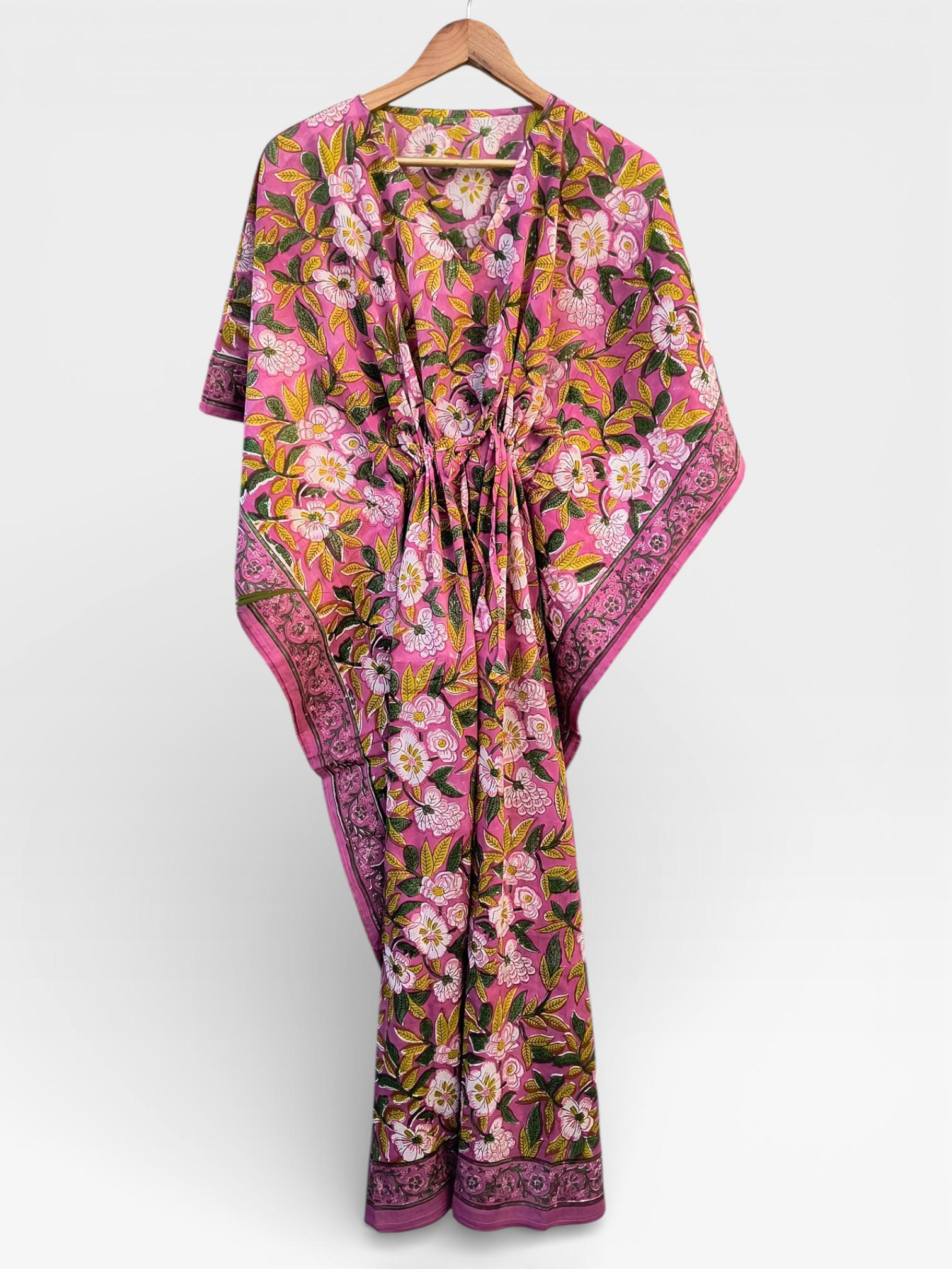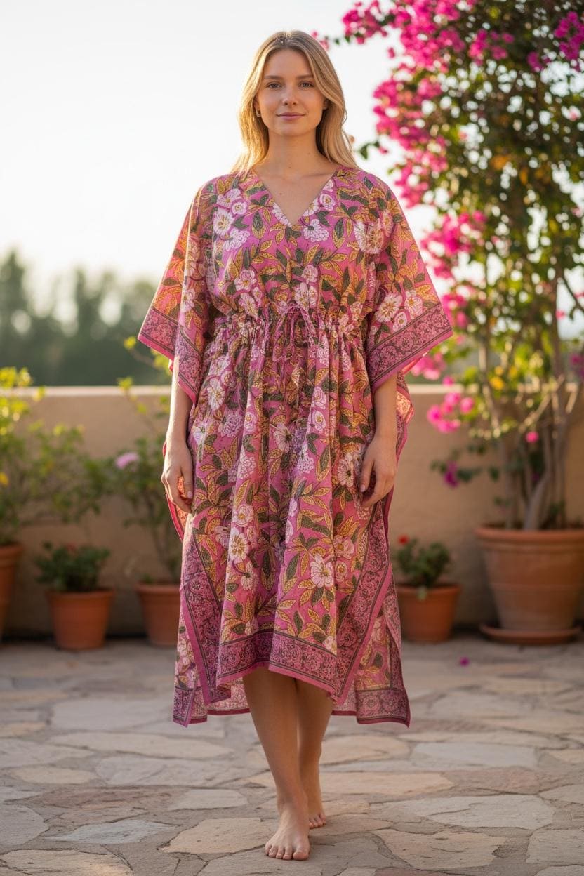 Hand Block Printed Cotton Kaftan Dress – Pink Floral Boho Kaftan with Drawstring Waist | Indian Summer Dress, Beach & Resort Wear