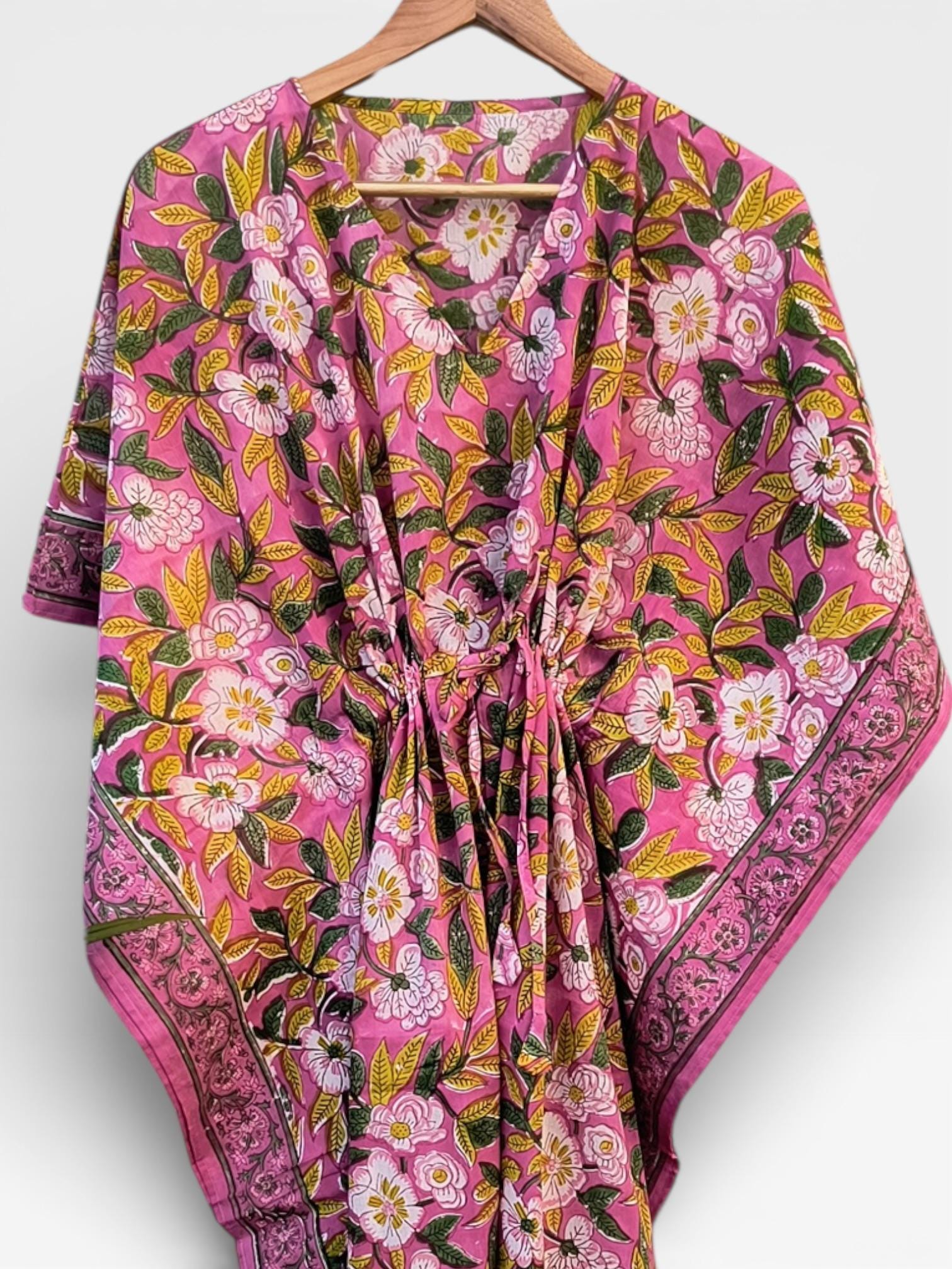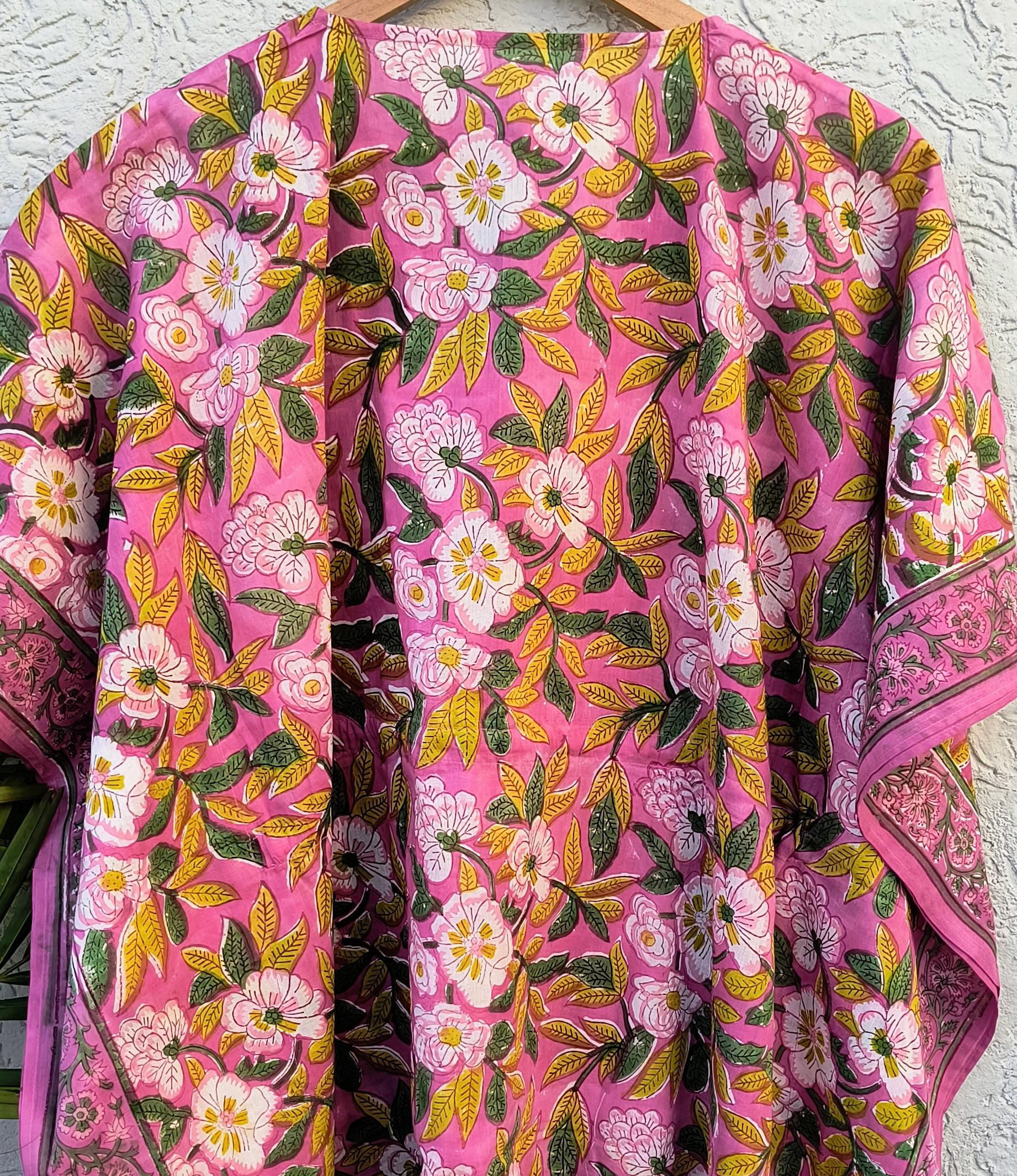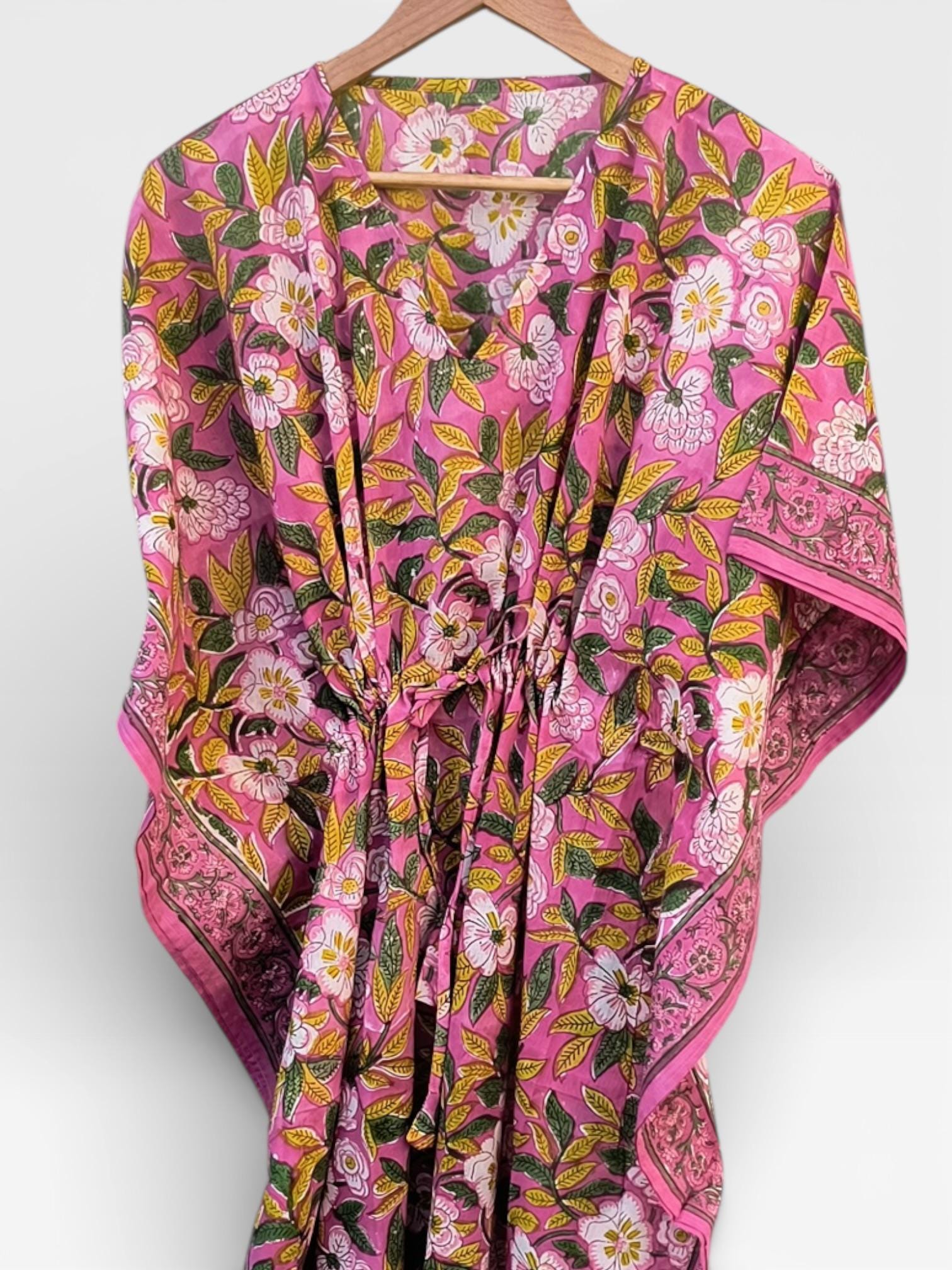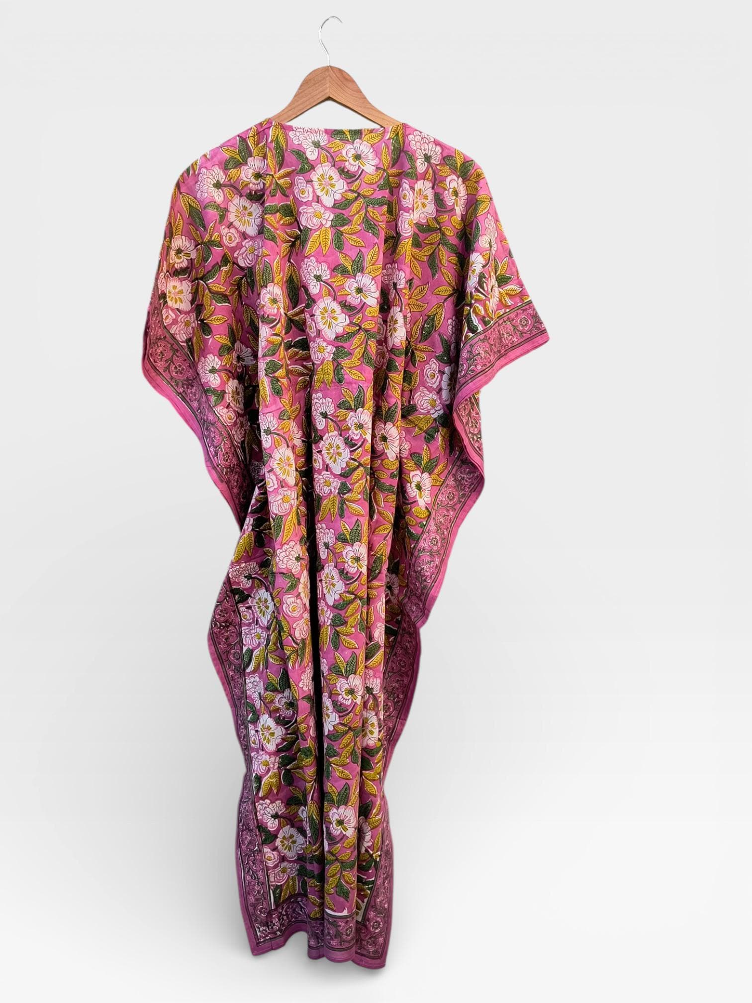 Hand Block Printed Cotton Kaftan Dress – Pink Floral Boho Kaftan with Drawstring Waist | Indian Summer Dress, Beach & Resort Wear