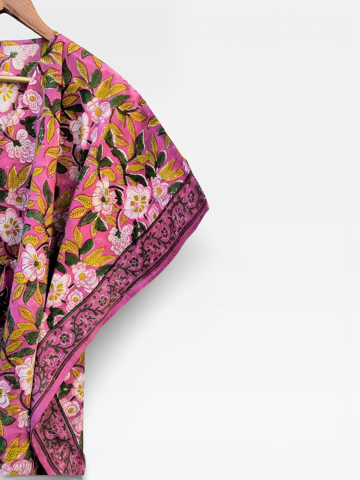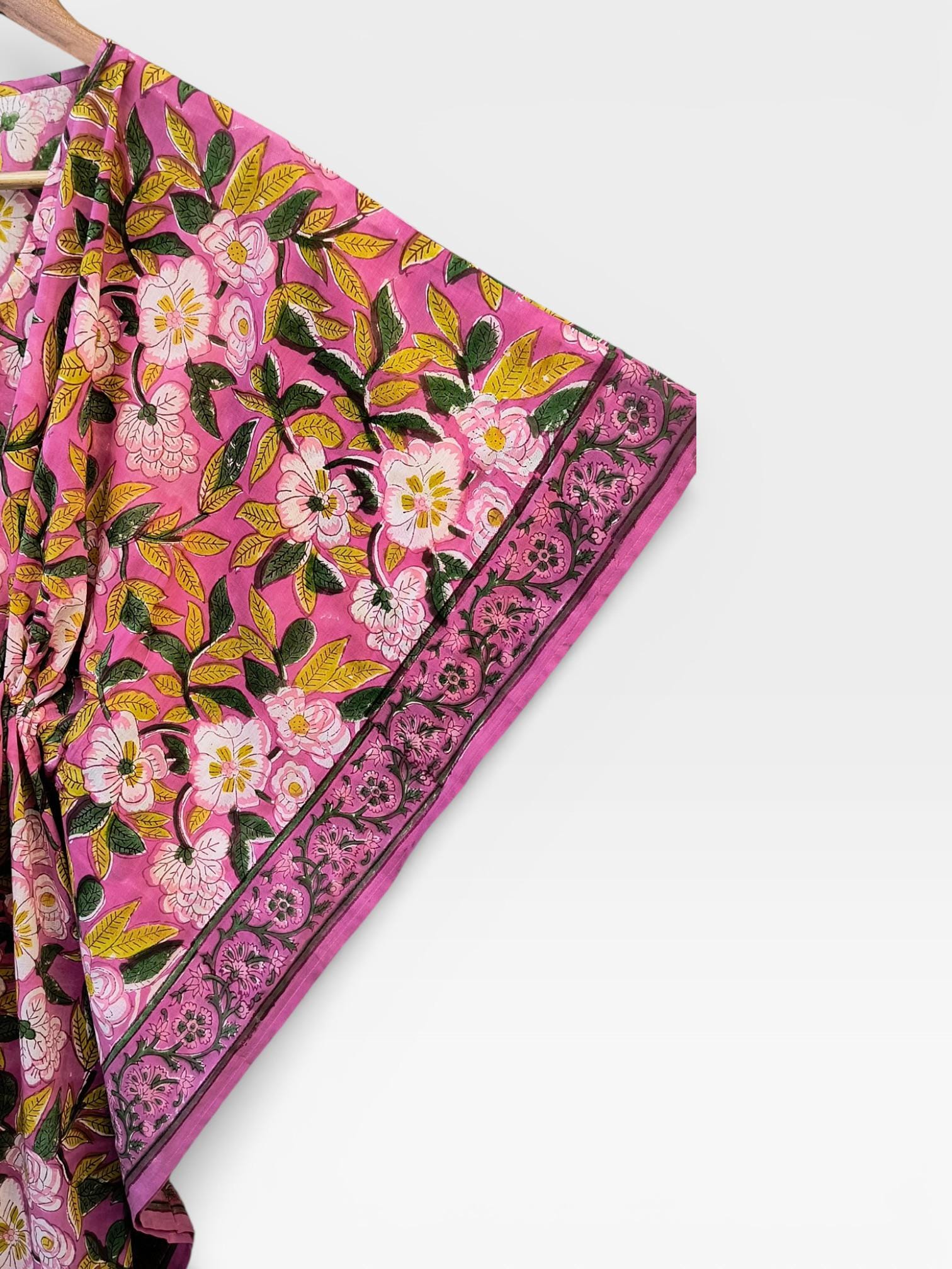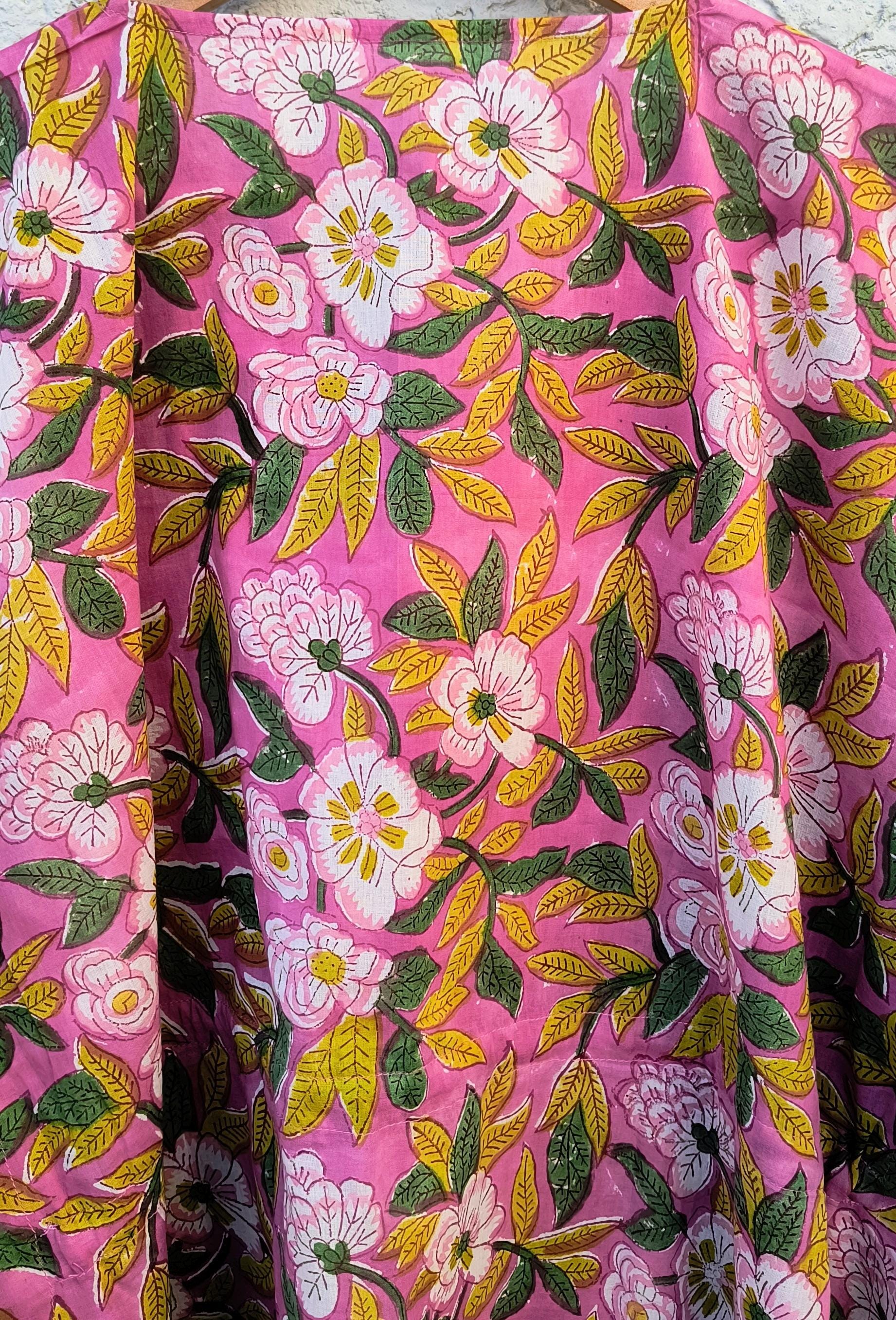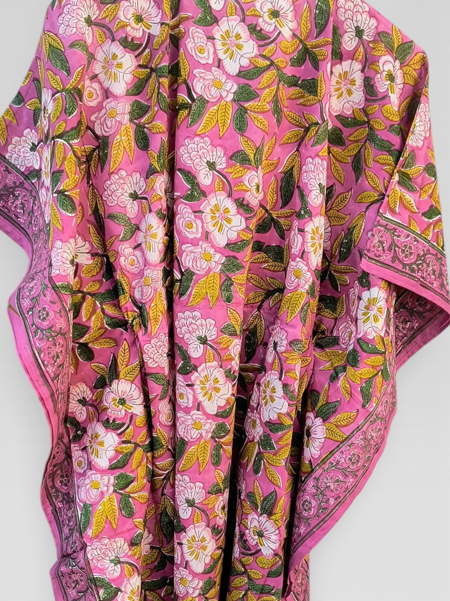 Hand Block Printed Cotton Kaftan Dress – Pink Floral Boho Kaftan with Drawstring Waist | Indian Summer Dress, Beach & Resort Wear