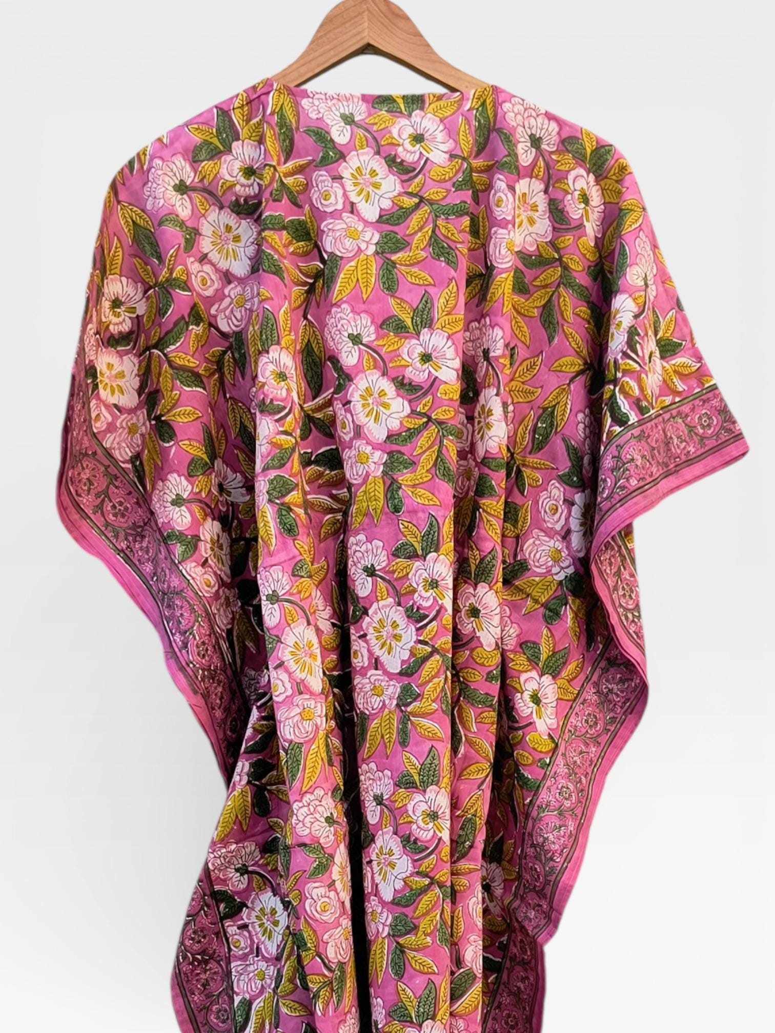 Each piece is hand printed using carved wooden blocks by skilled artisans, making every kaftan truly one of a kind.