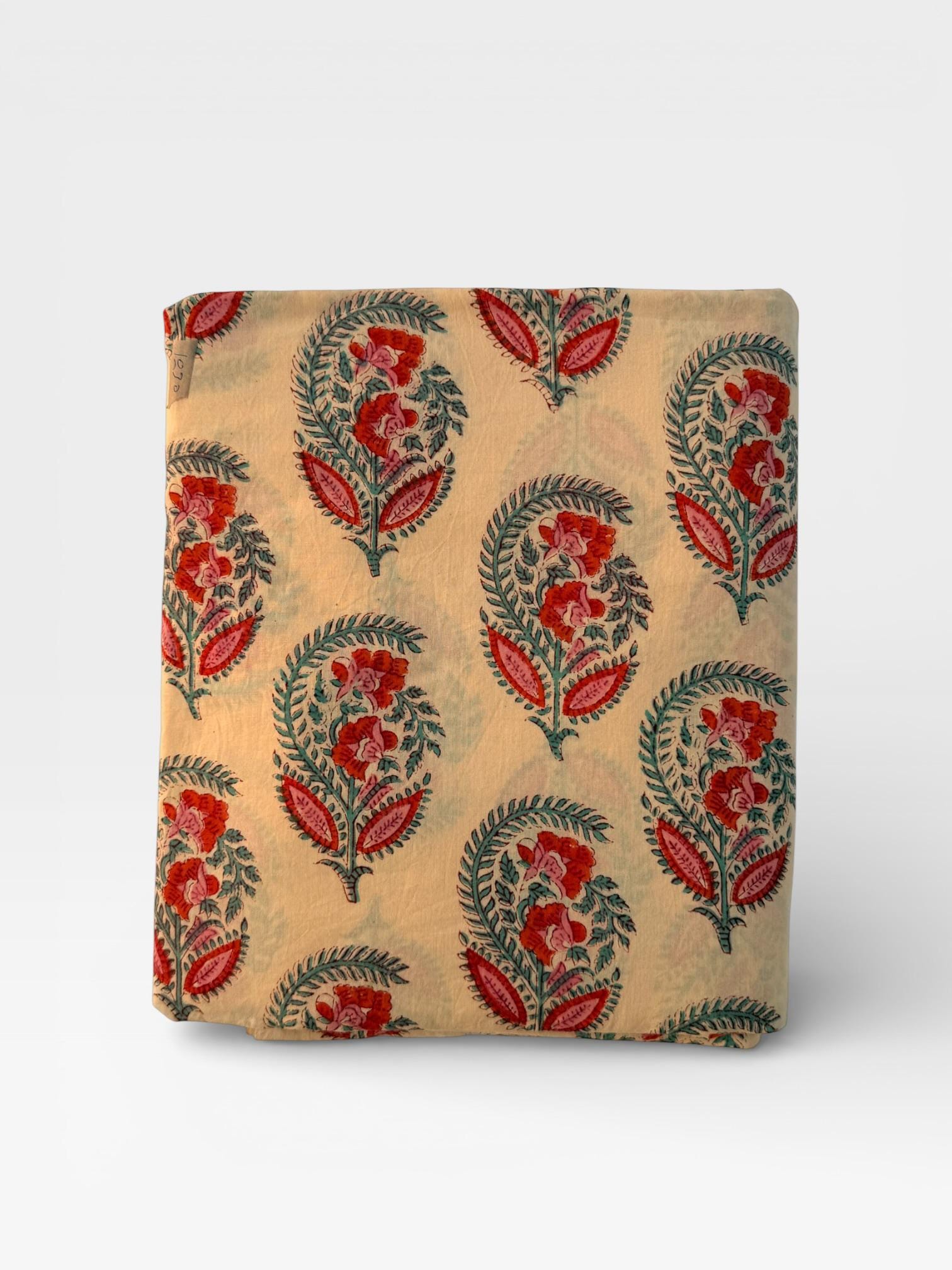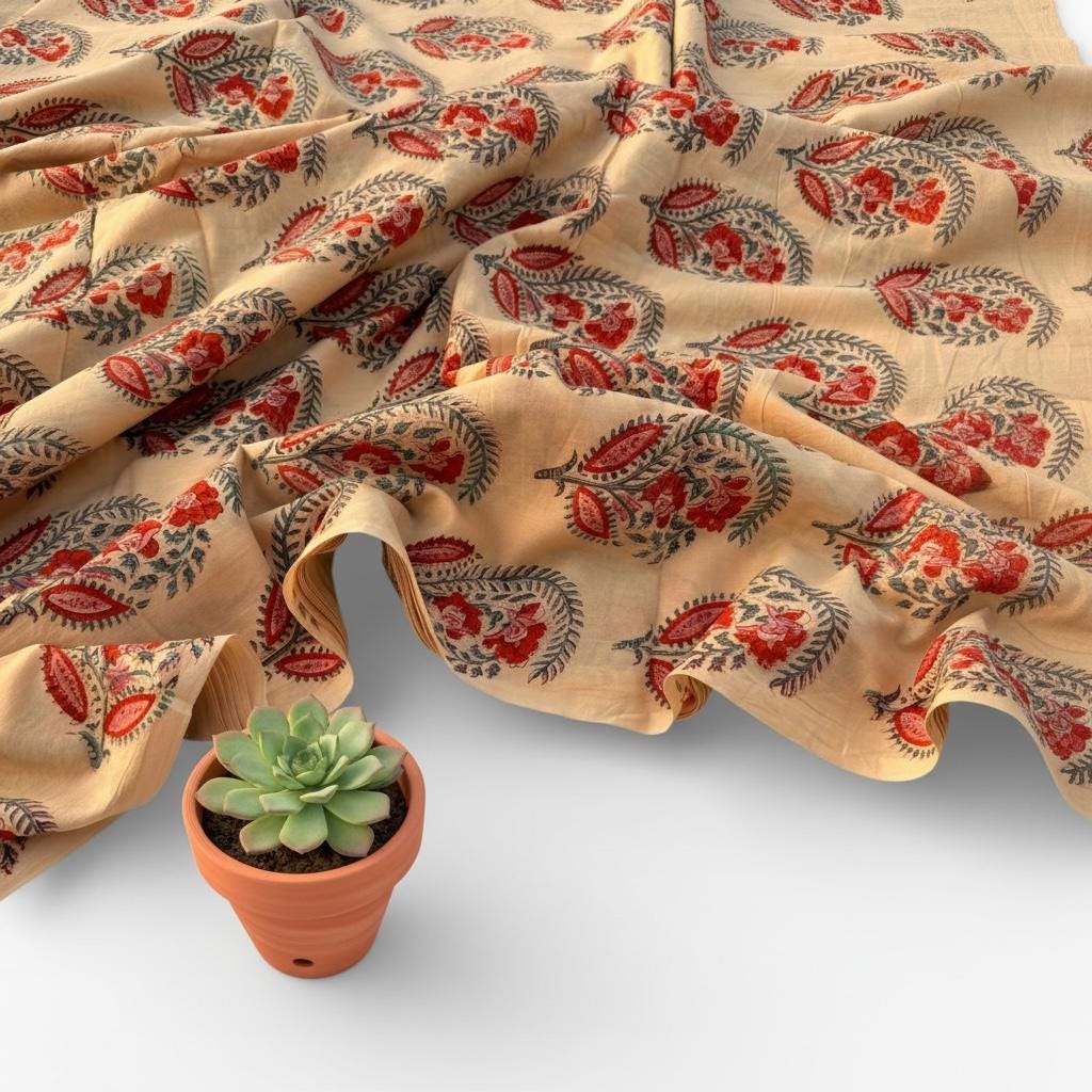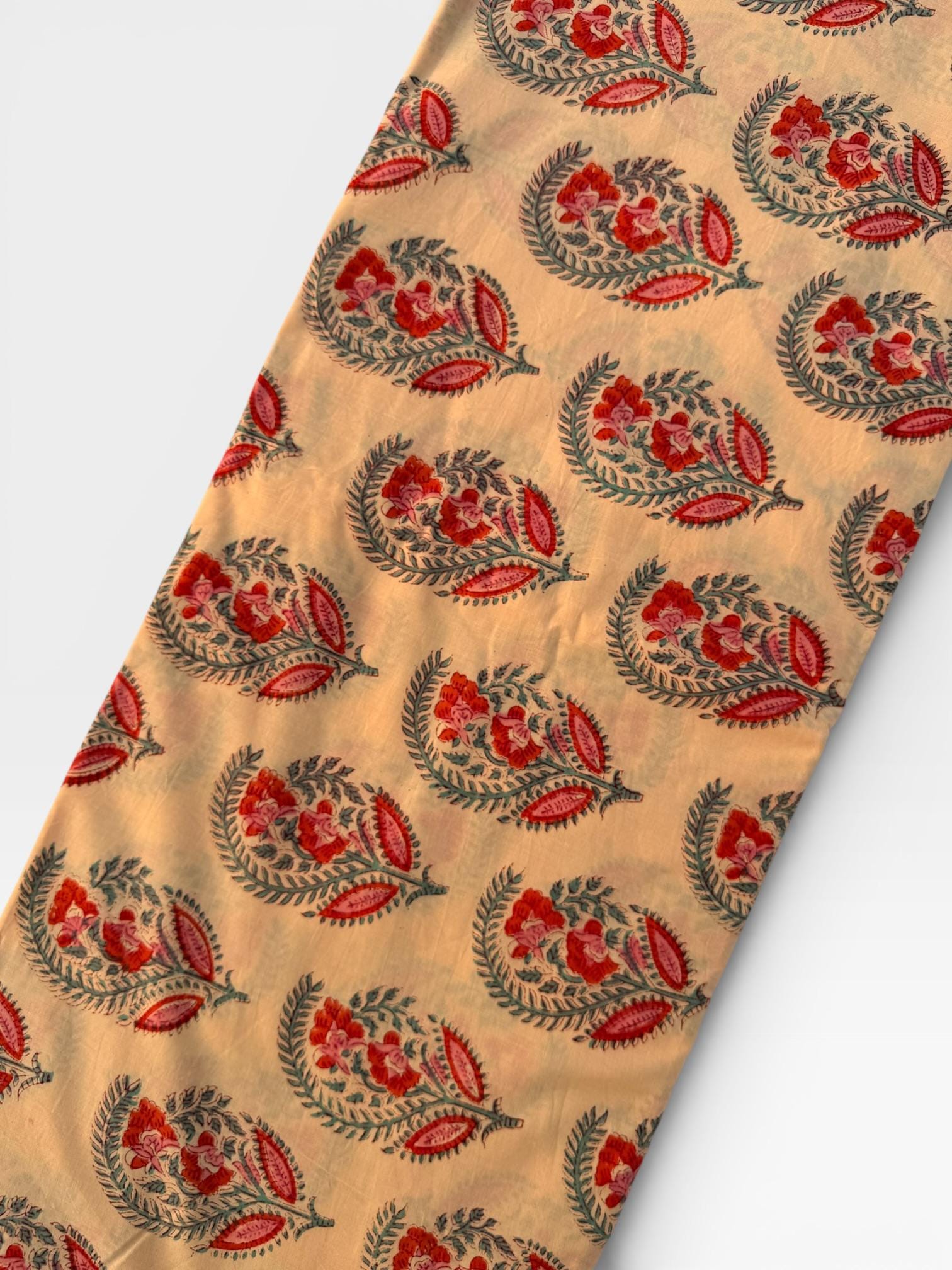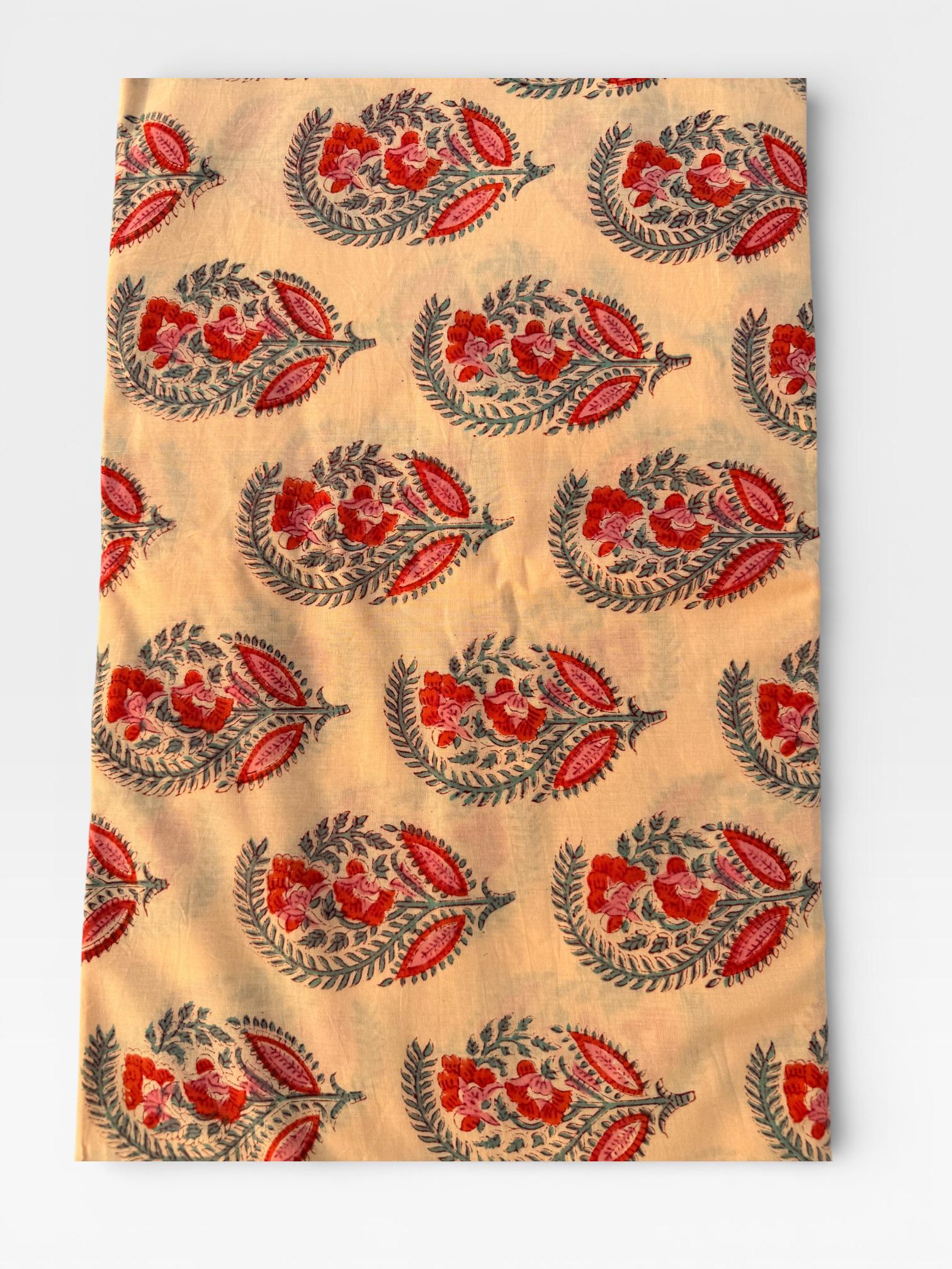 Add a touch of traditional elegance to your creations with this beautifully hand block printed and dyed cotton fabric. Featuring intricate paisley floral buta motifs in rich red, soft pink, and teal green tones on a warm cream base, this fabric showcases the timeless artistry of Indian craftsmanship.