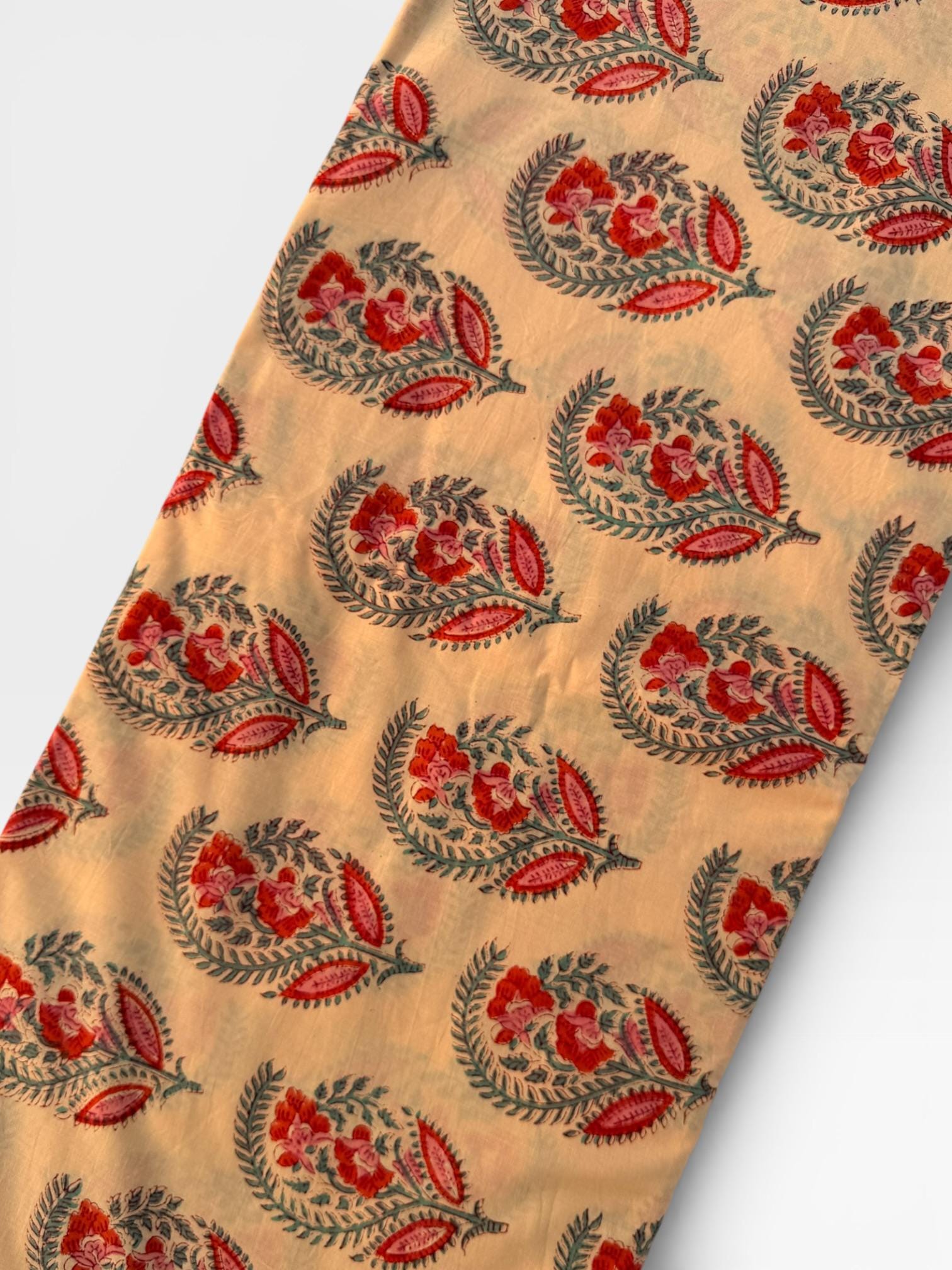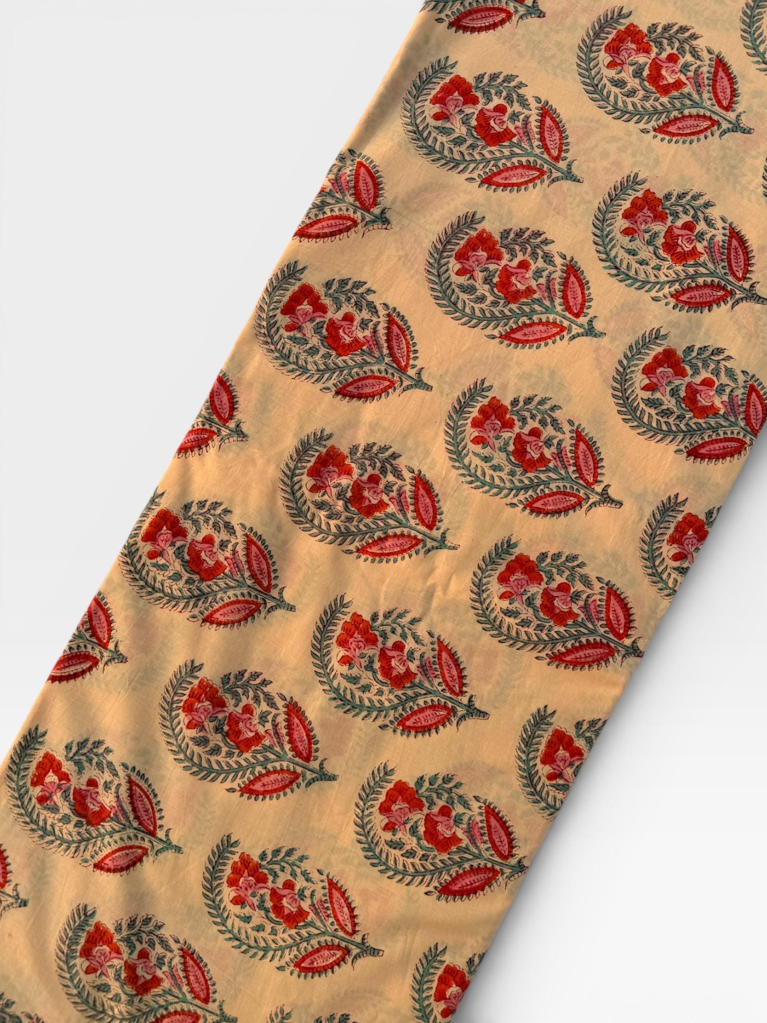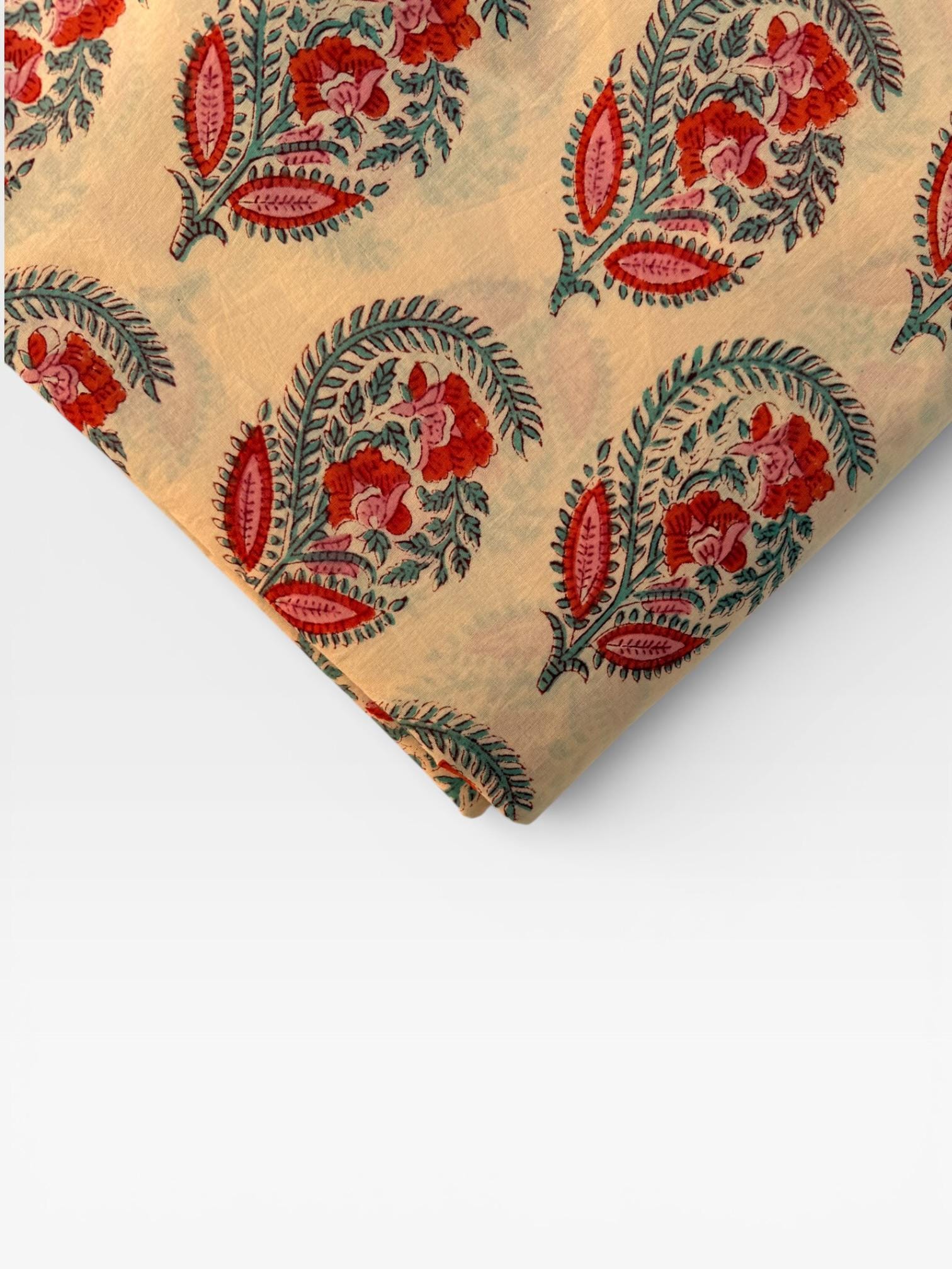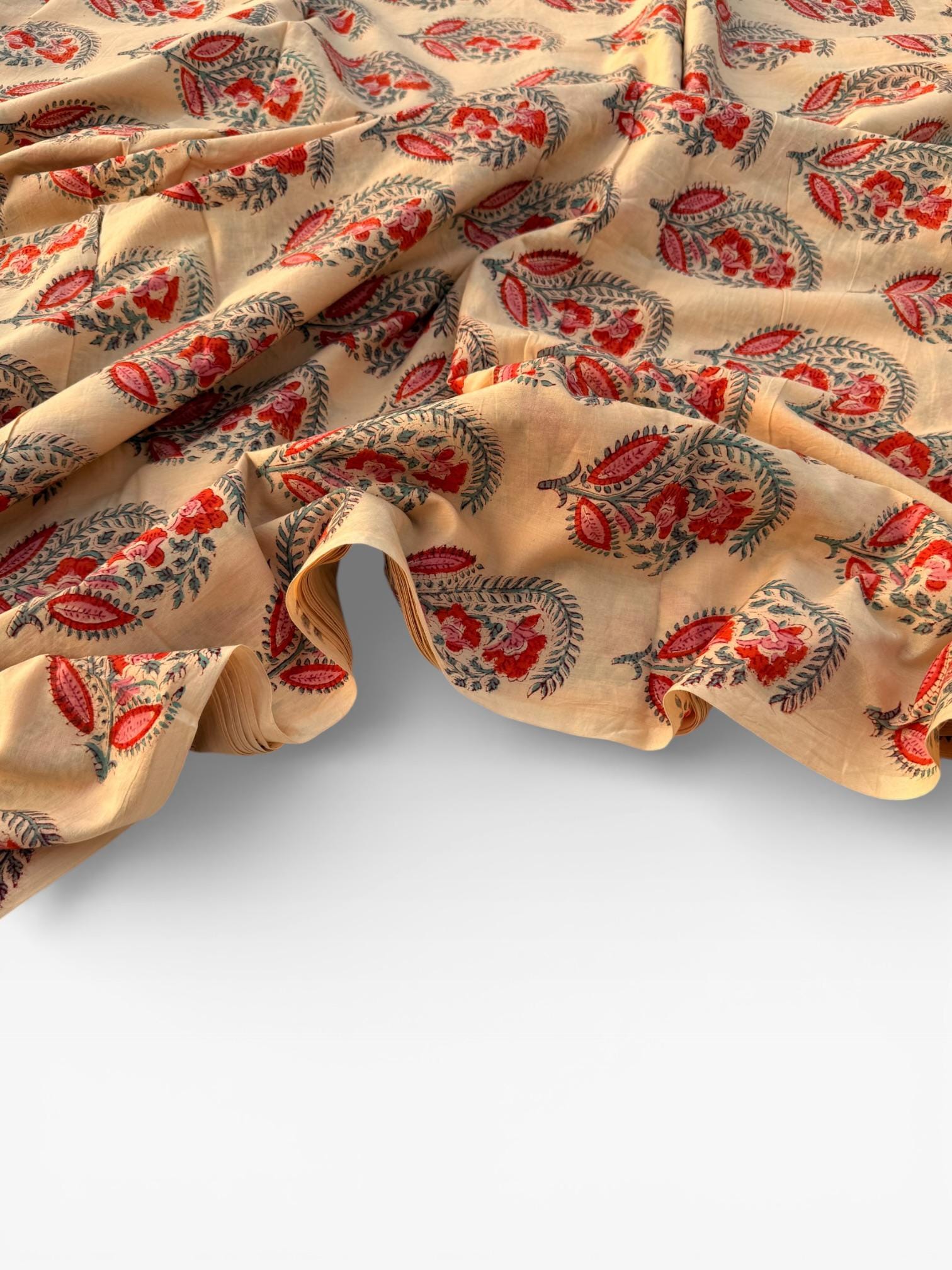 Add a touch of traditional elegance to your creations with this beautifully hand block printed and dyed cotton fabric. Featuring intricate paisley floral buta motifs in rich red, soft pink, and teal green tones on a warm cream base, this fabric showcases the timeless artistry of Indian craftsmanship.