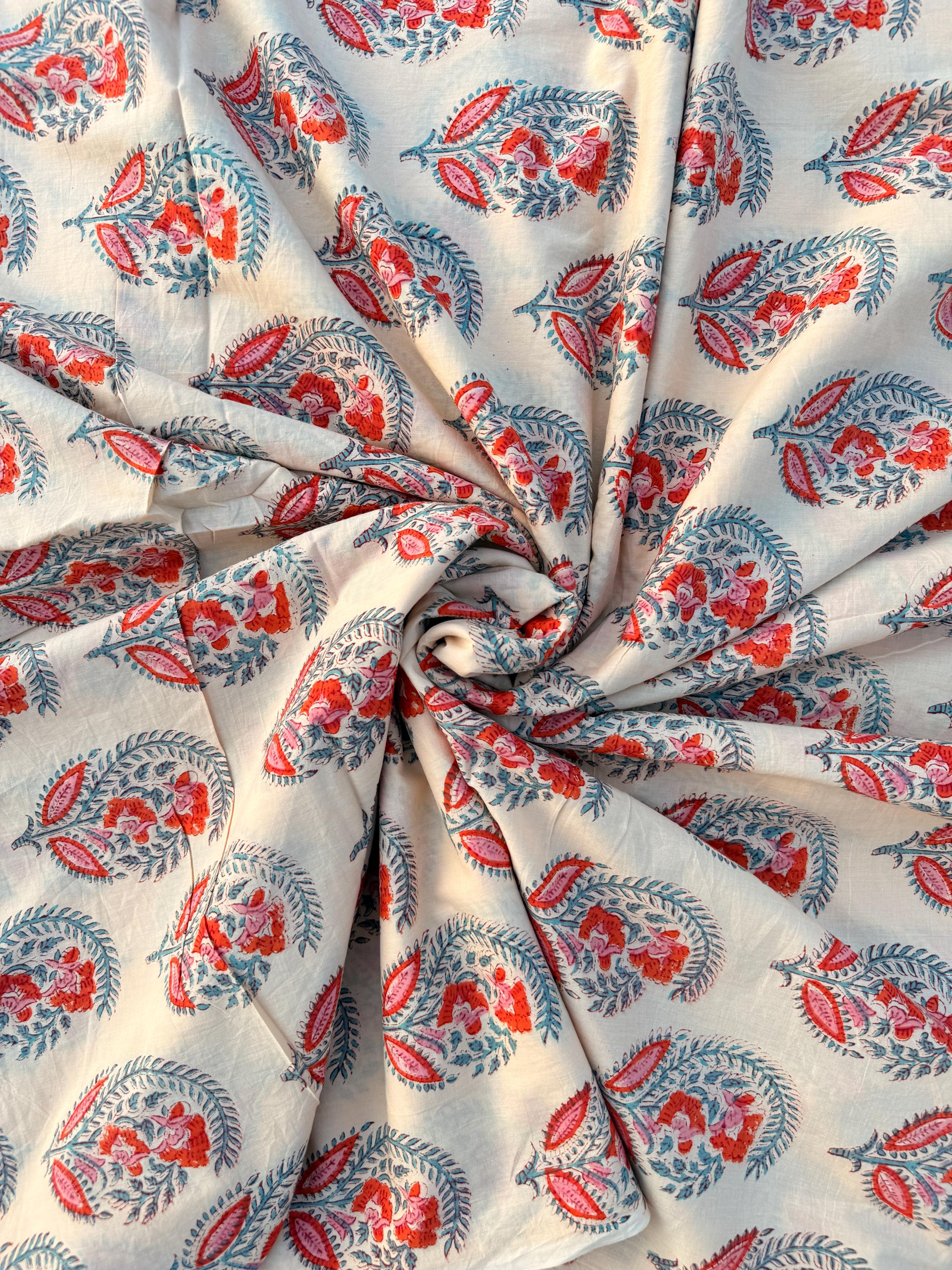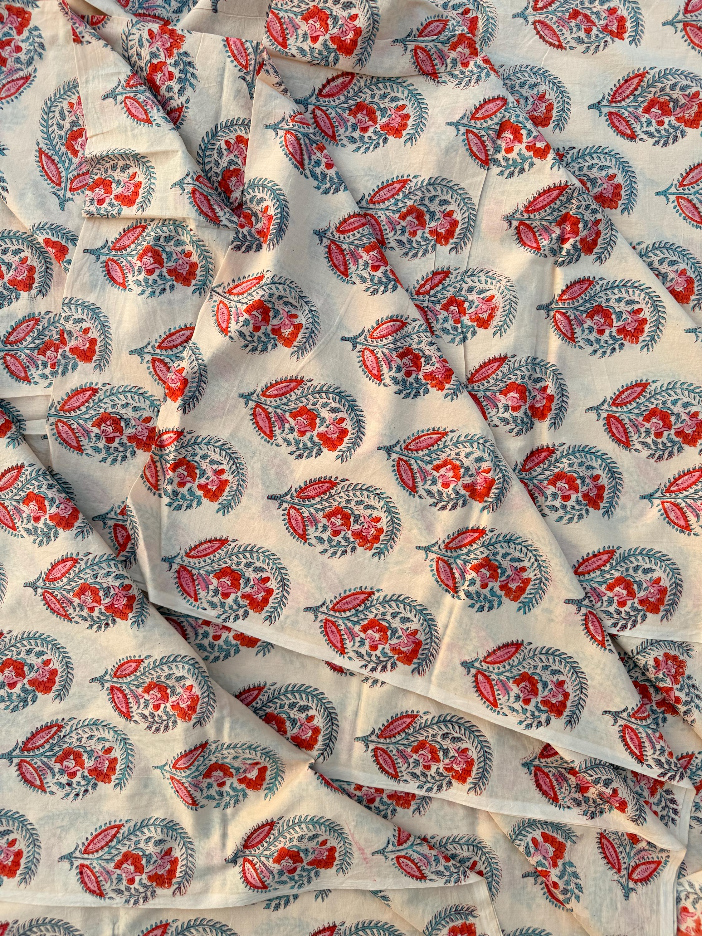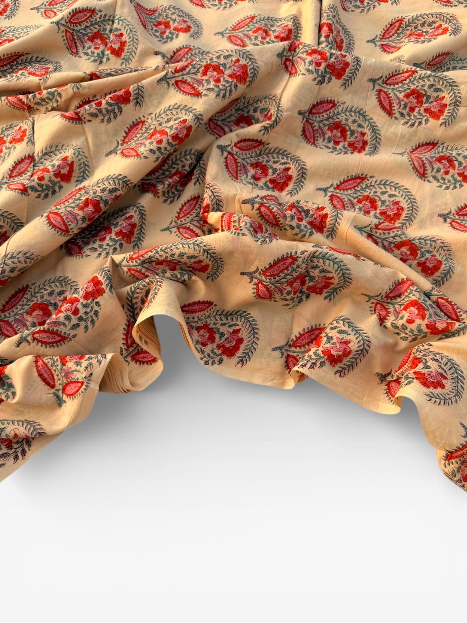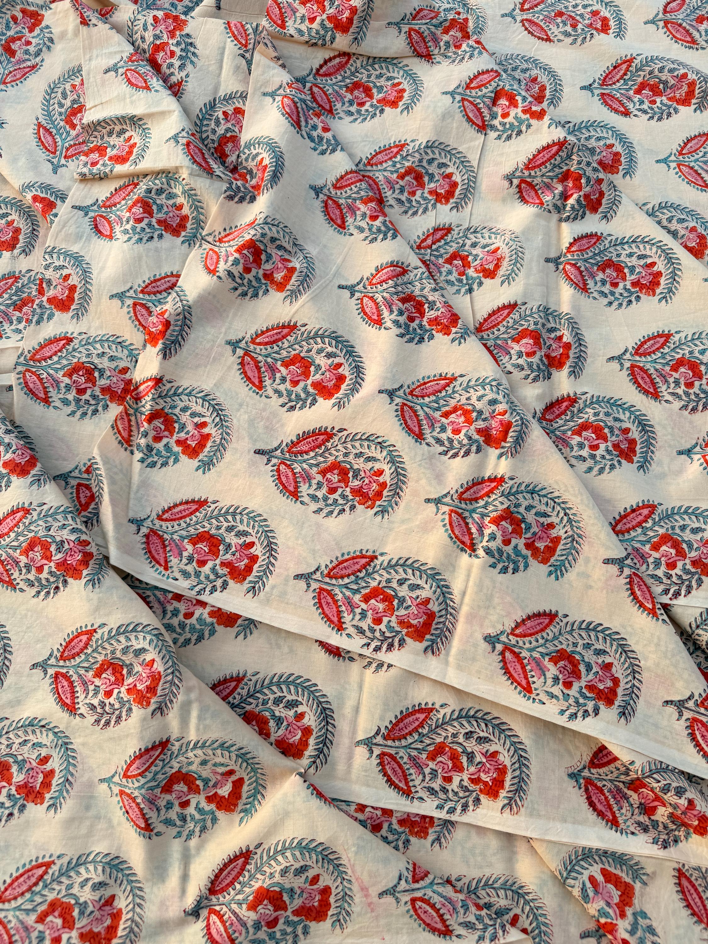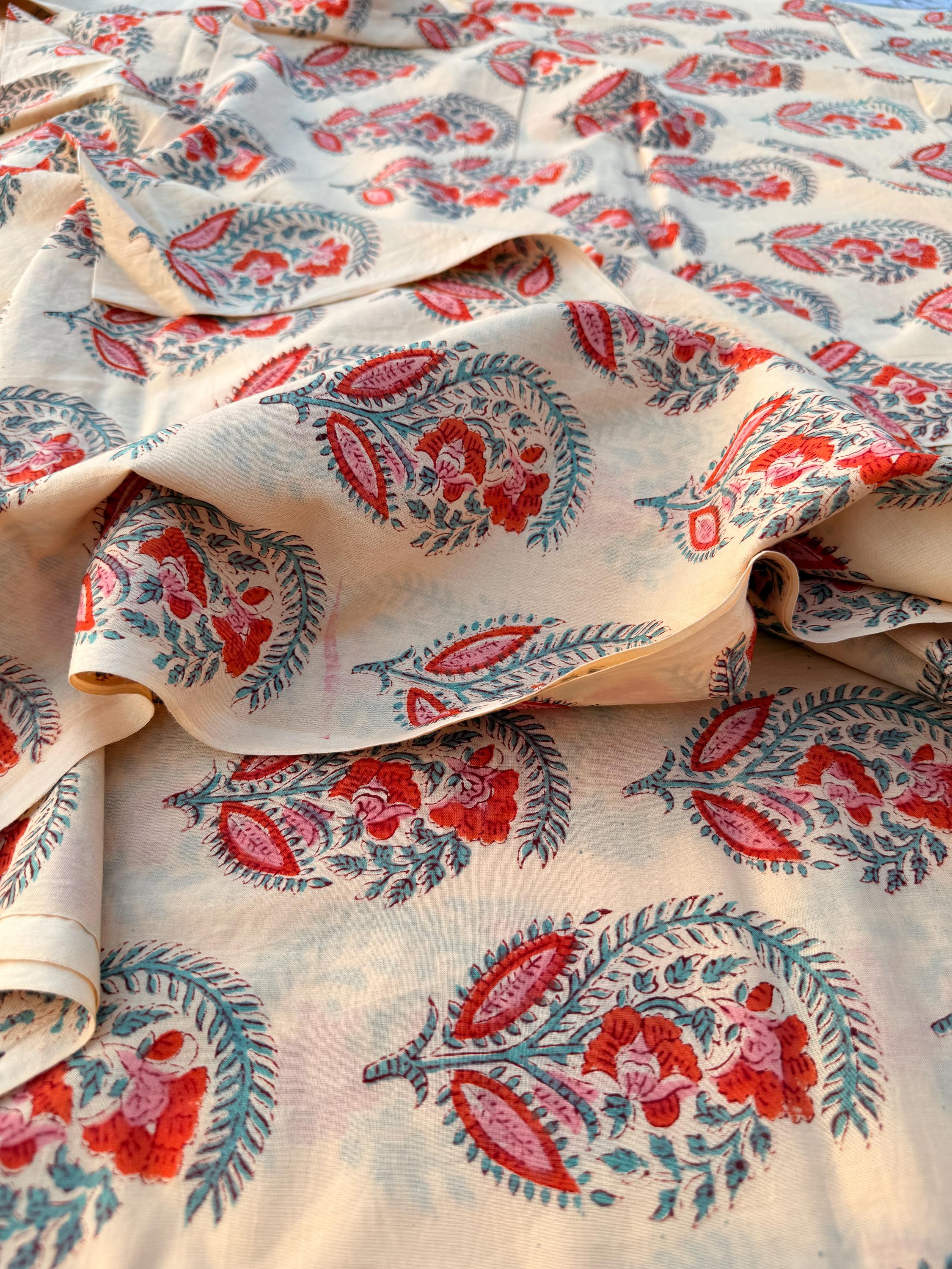 Hand Block Print Dyed Cotton Fabric – Red & Teal Paisley Floral on Cream Base | Indian Buta Print Dressmaking Fabric | Boho Sewing Yardage