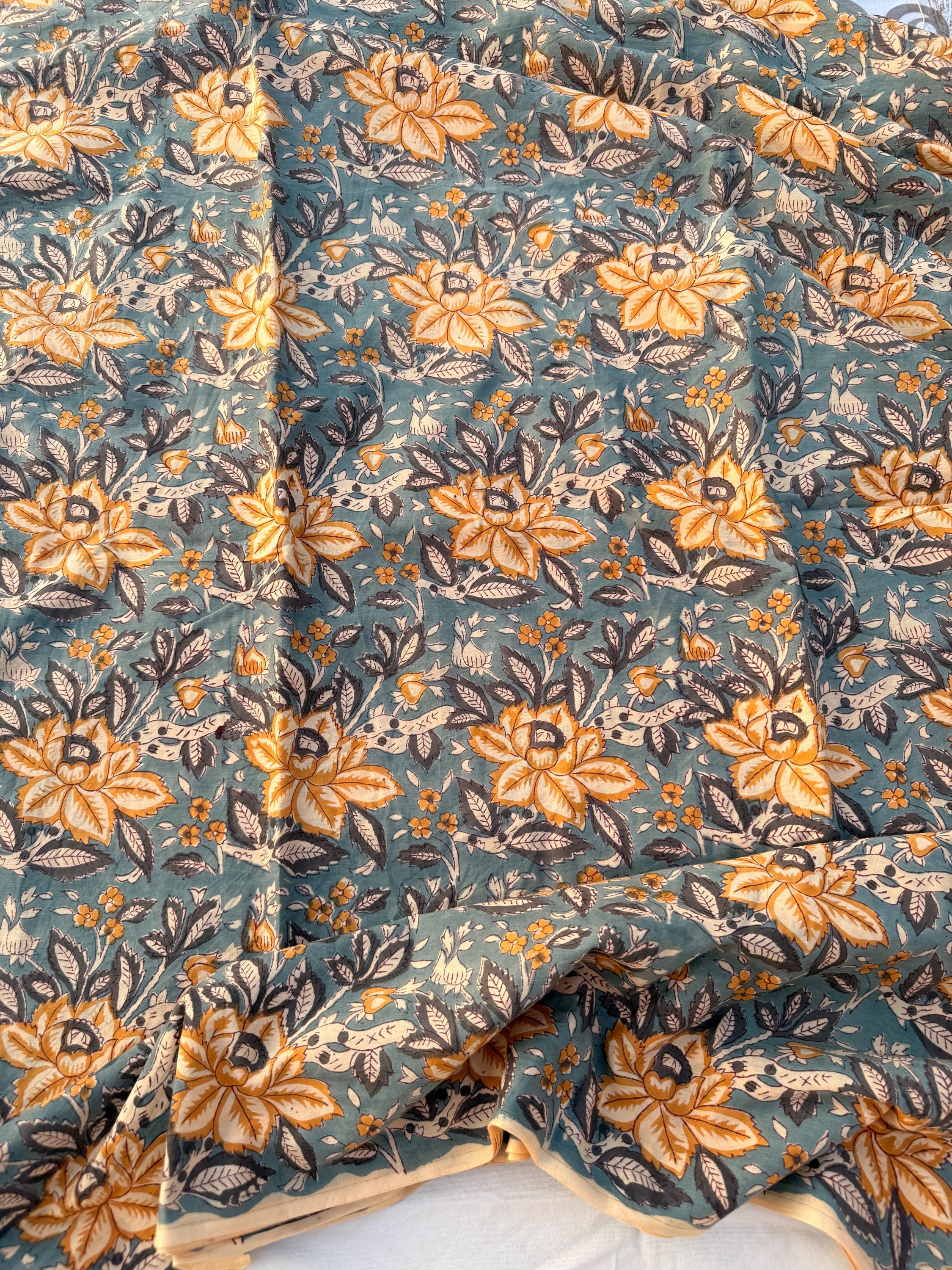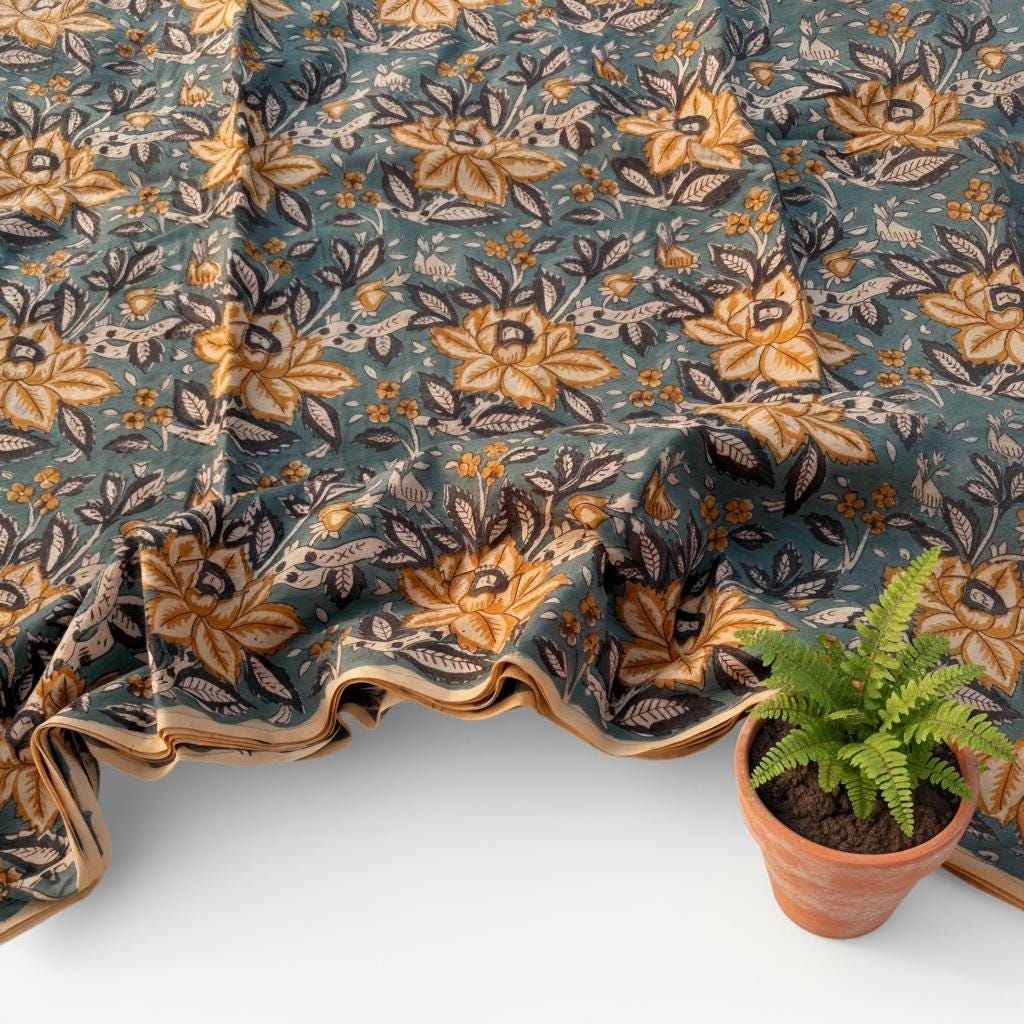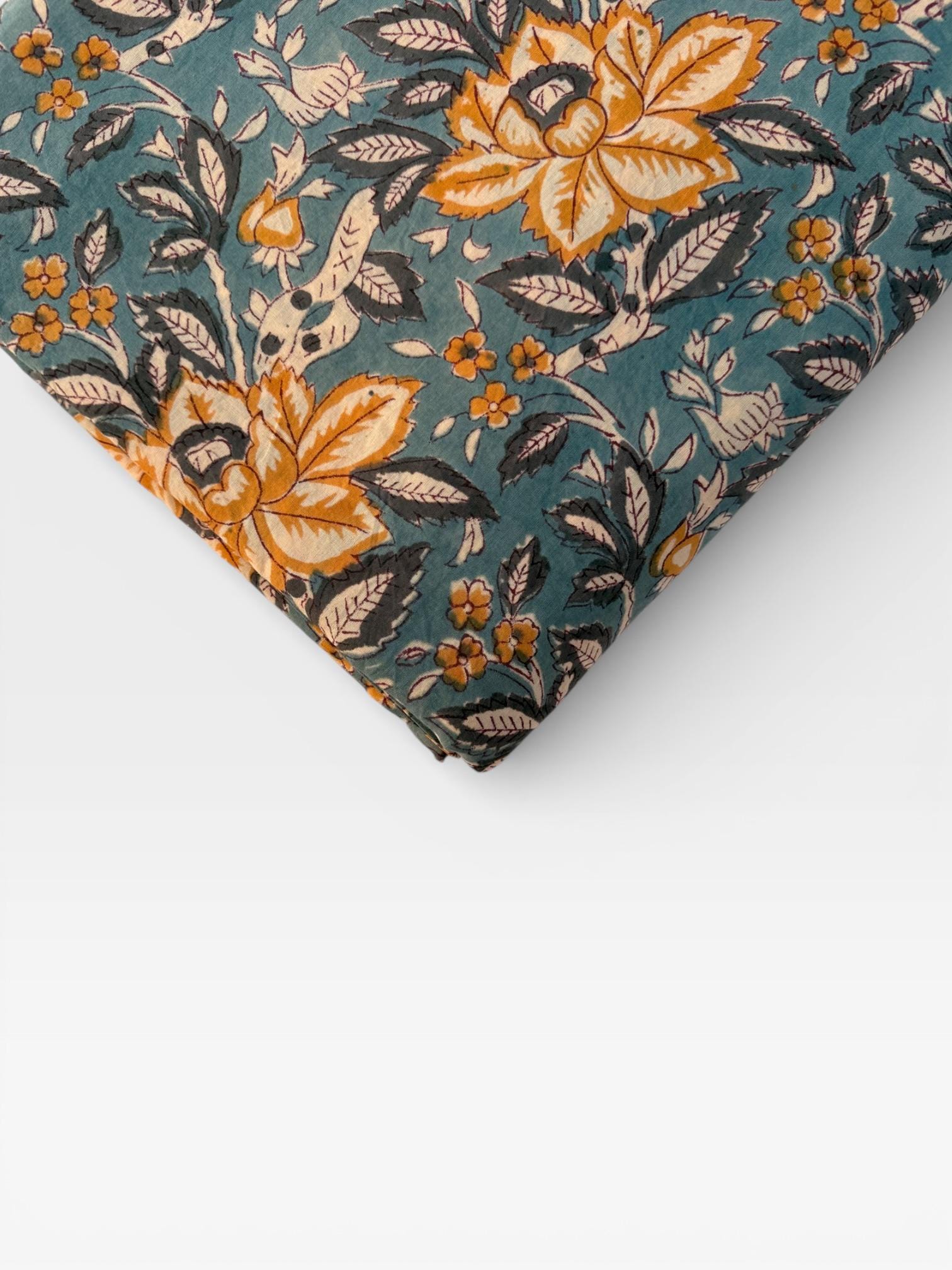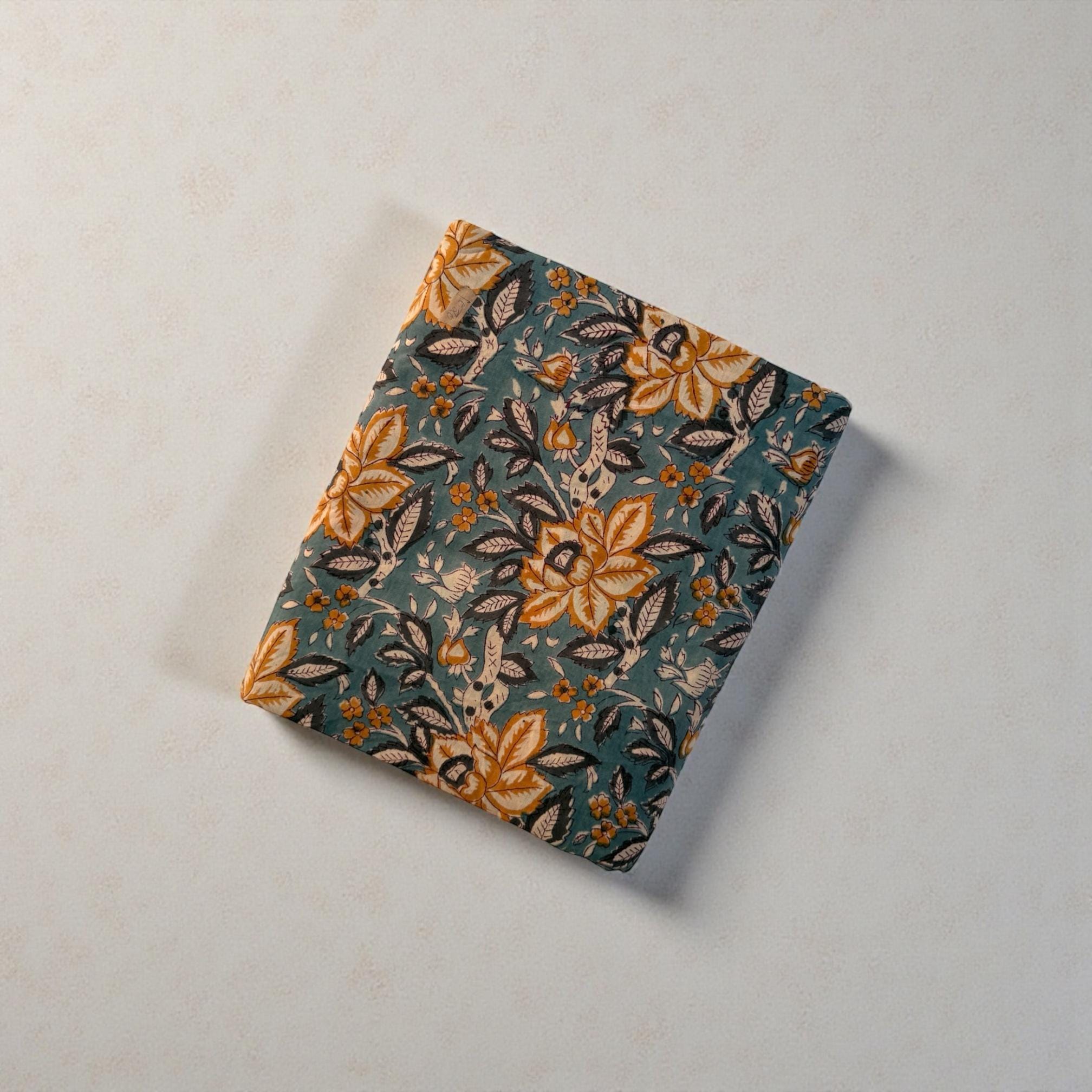 Hand Block Print Cotton Fabric – Mustard Yellow Floral on Teal Blue Base | Indian Botanical Print Yardage | Boho Dressmaking Fabric