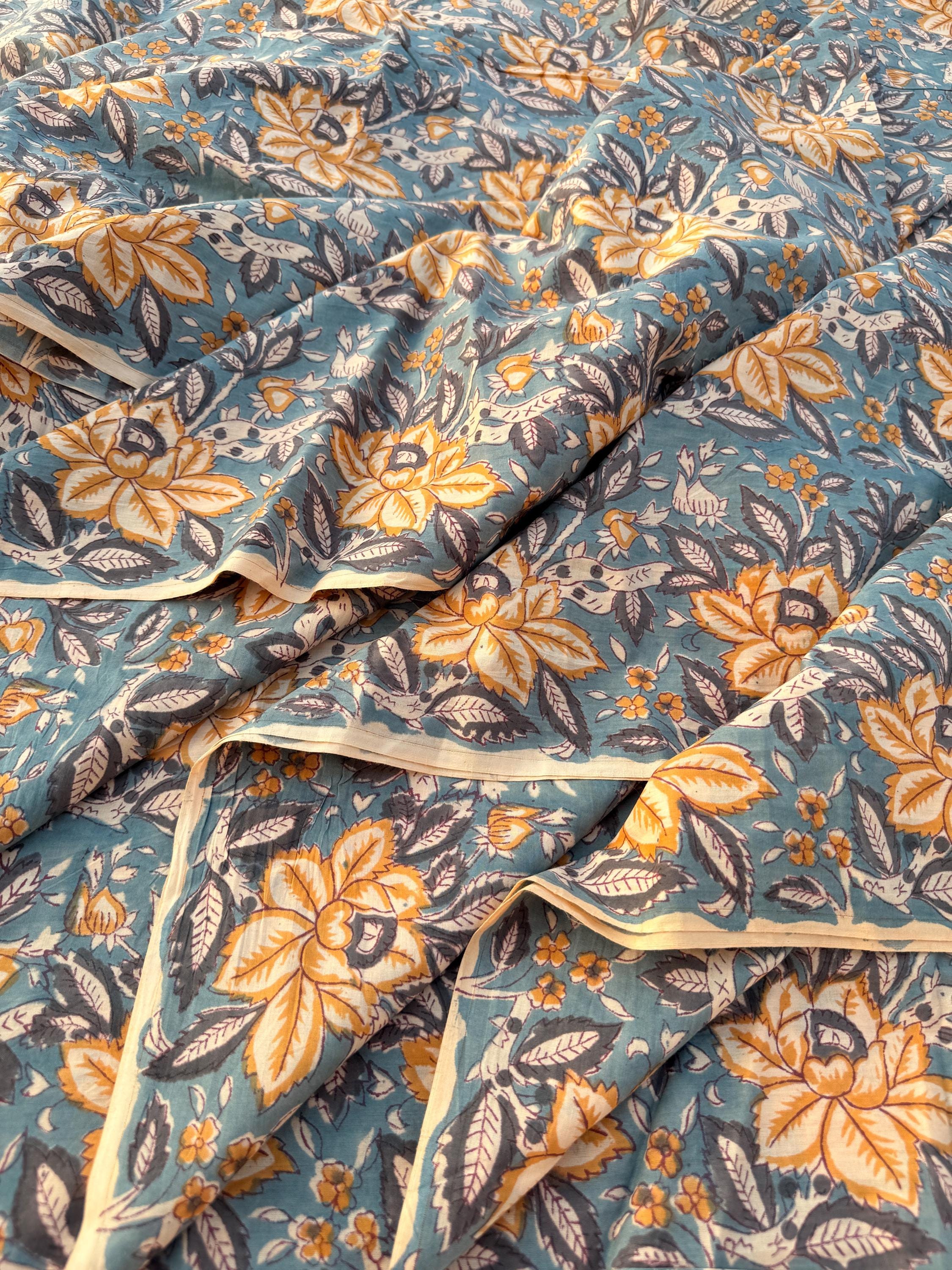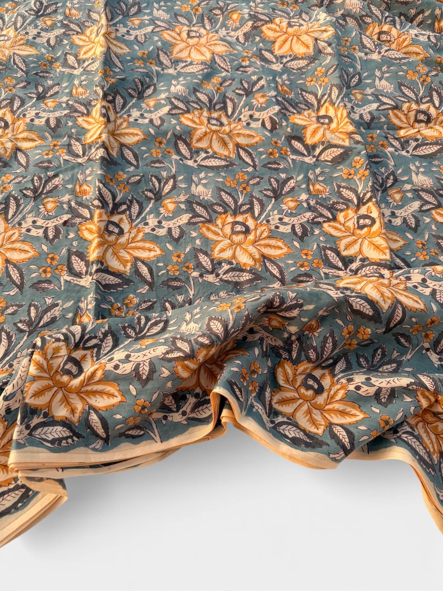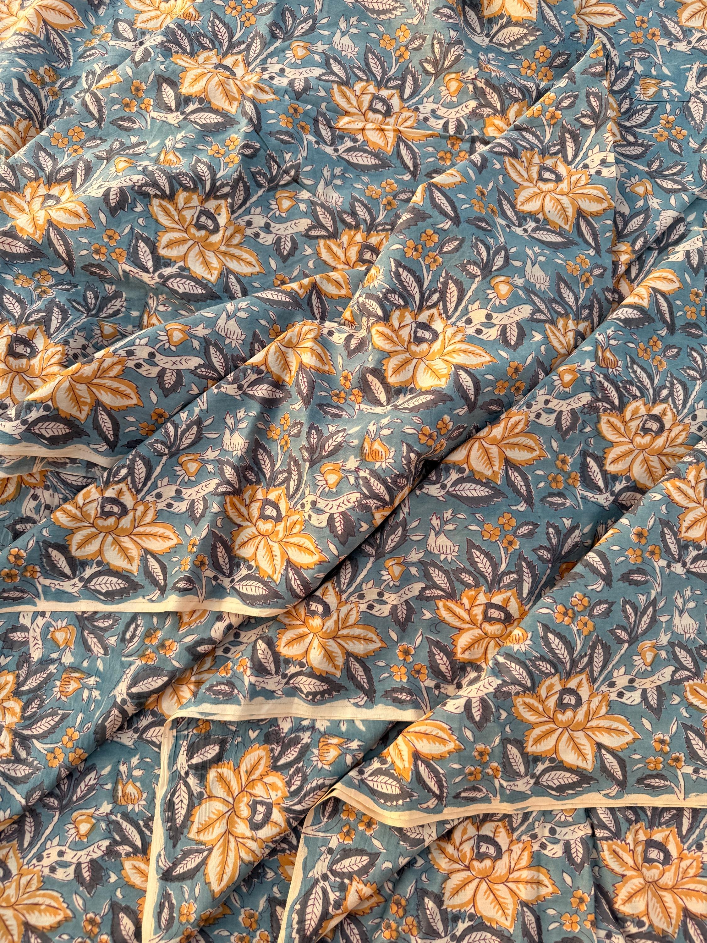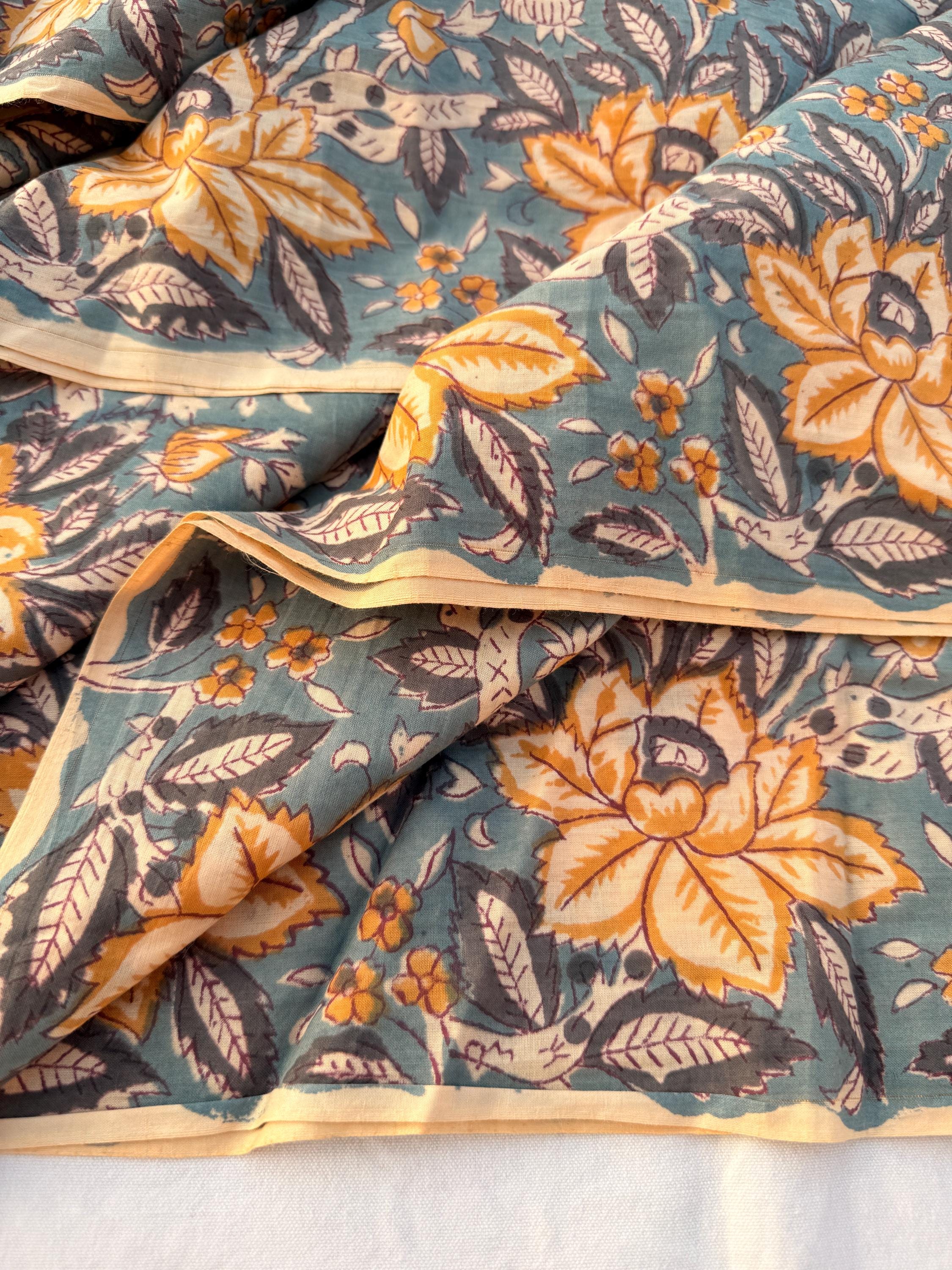 Hand Block Print Cotton Fabric – Mustard Yellow Floral on Teal Blue Base | Indian Botanical Print Yardage | Boho Dressmaking Fabric