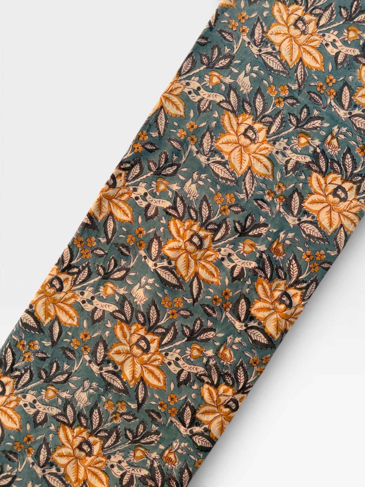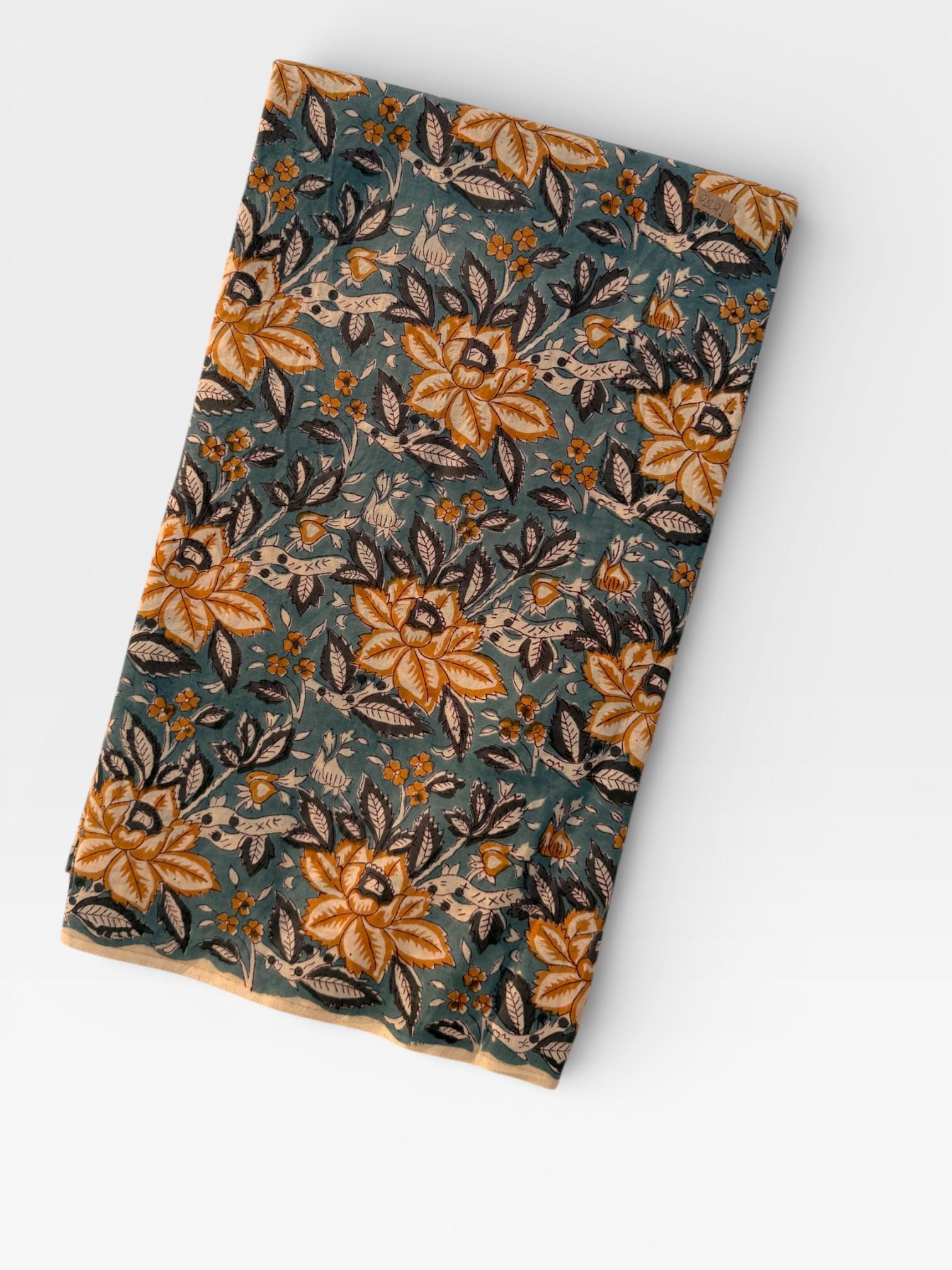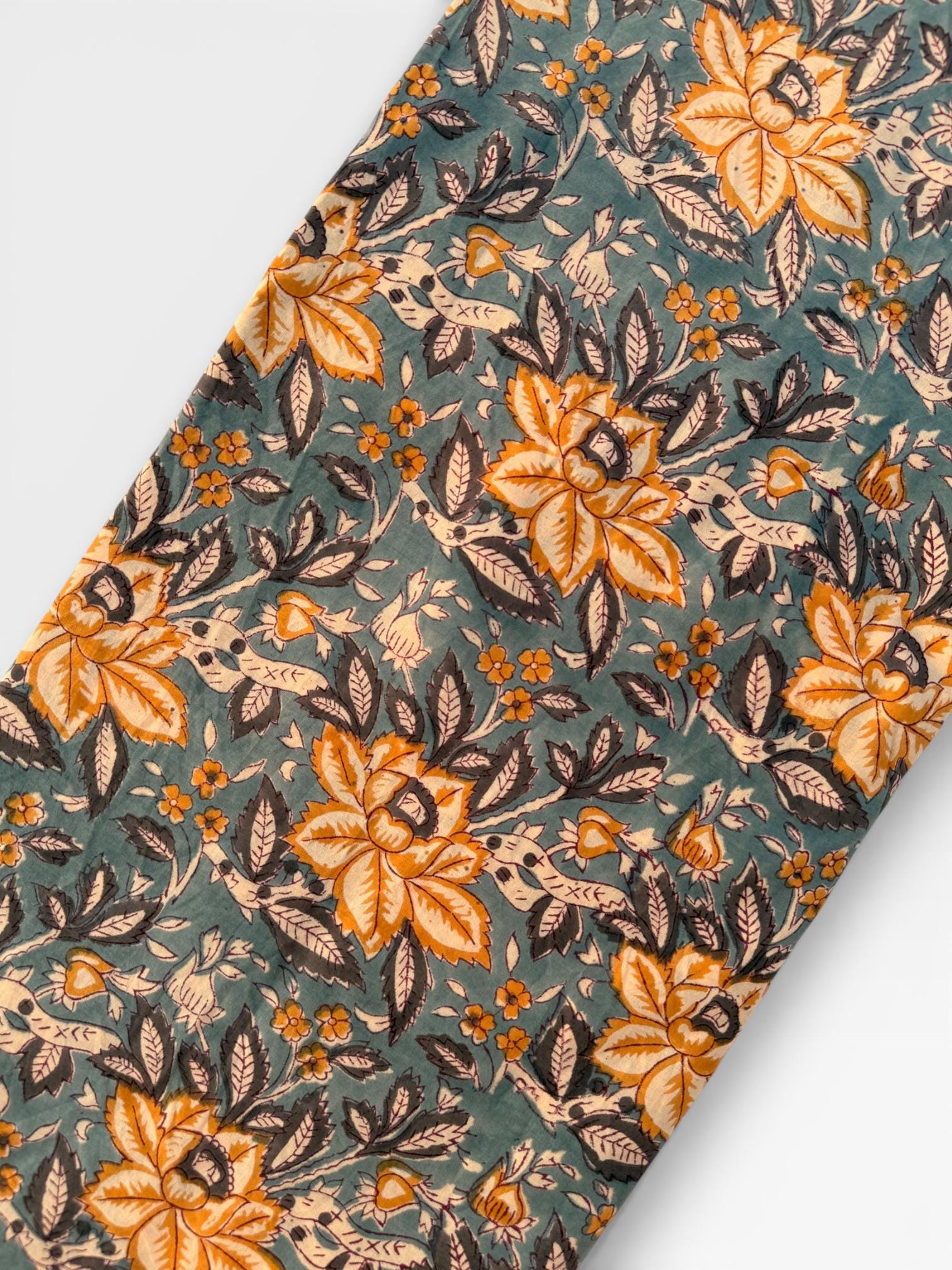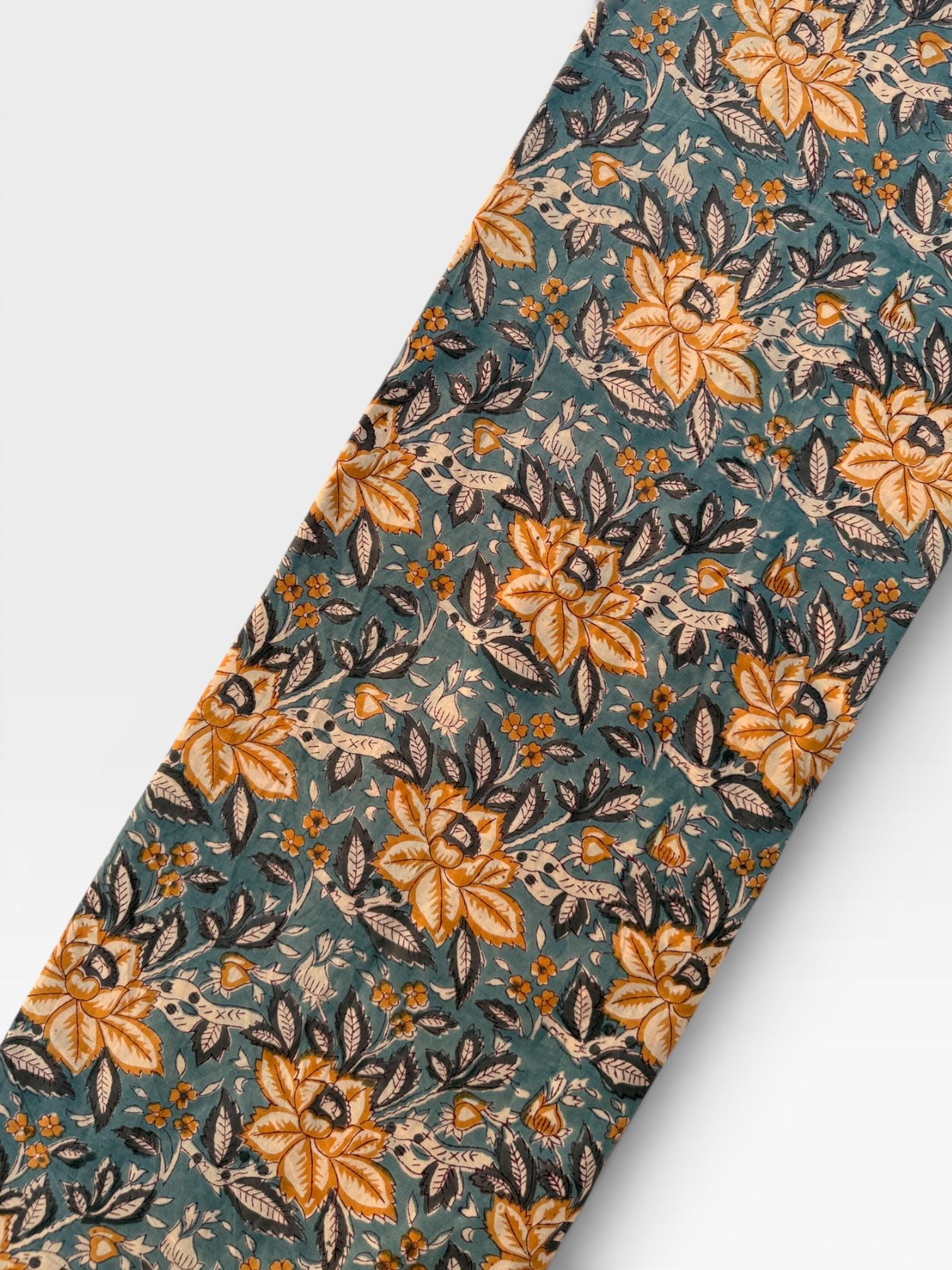Each pattern is carefully hand stamped using carved wooden blocks, creating subtle variations that make every piece unique. The warm mustard florals contrast elegantly against the cool teal background, giving this fabric a vibrant yet earthy, vintage-inspired look.