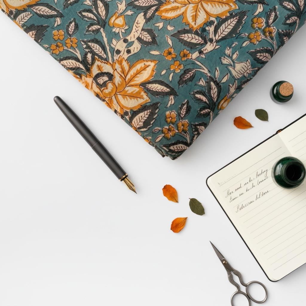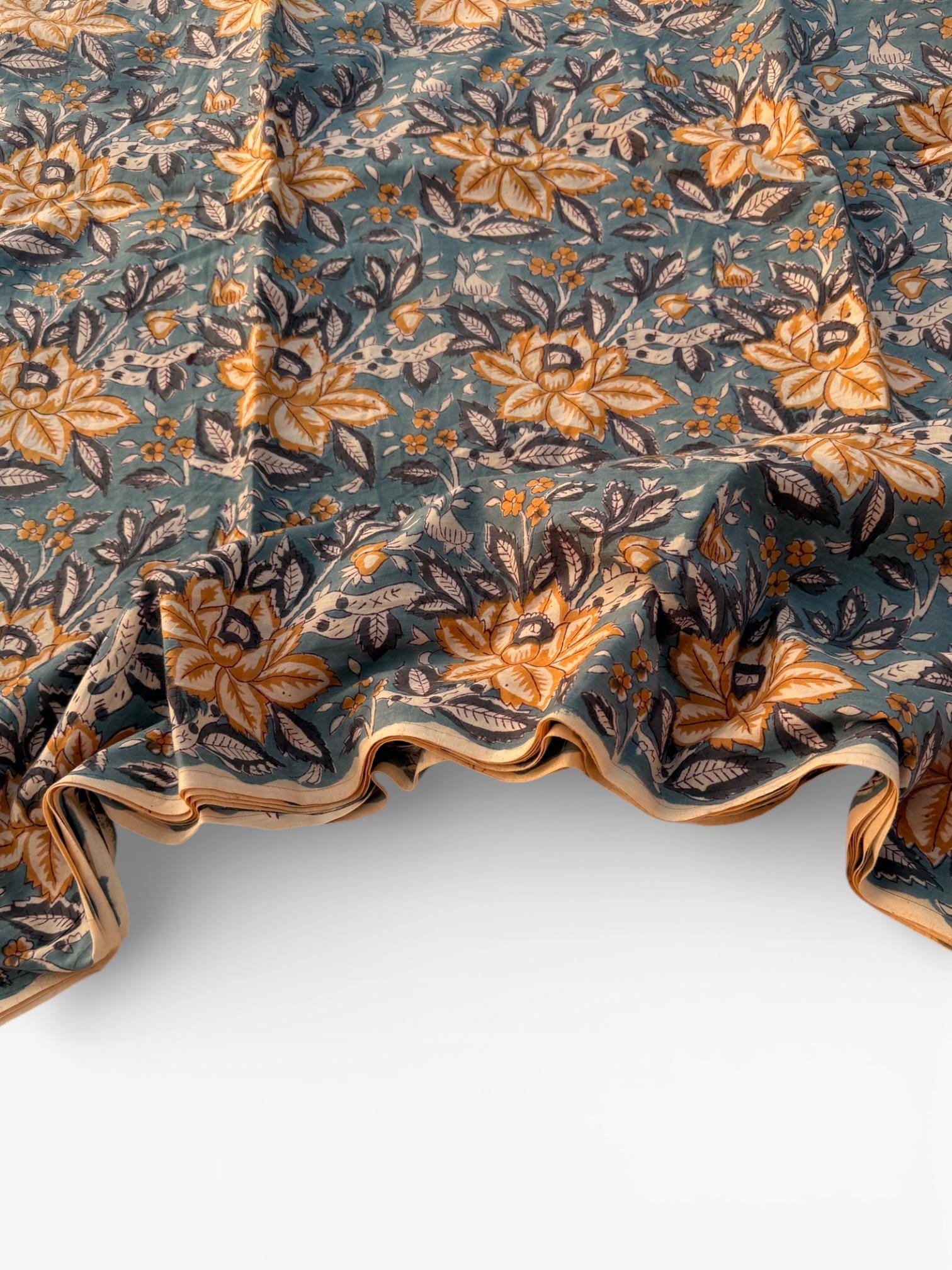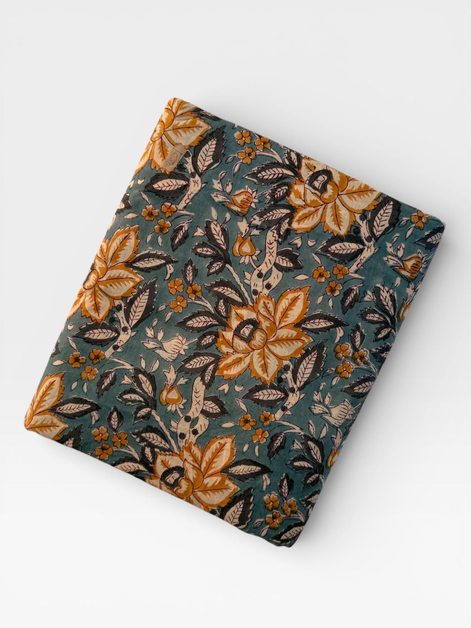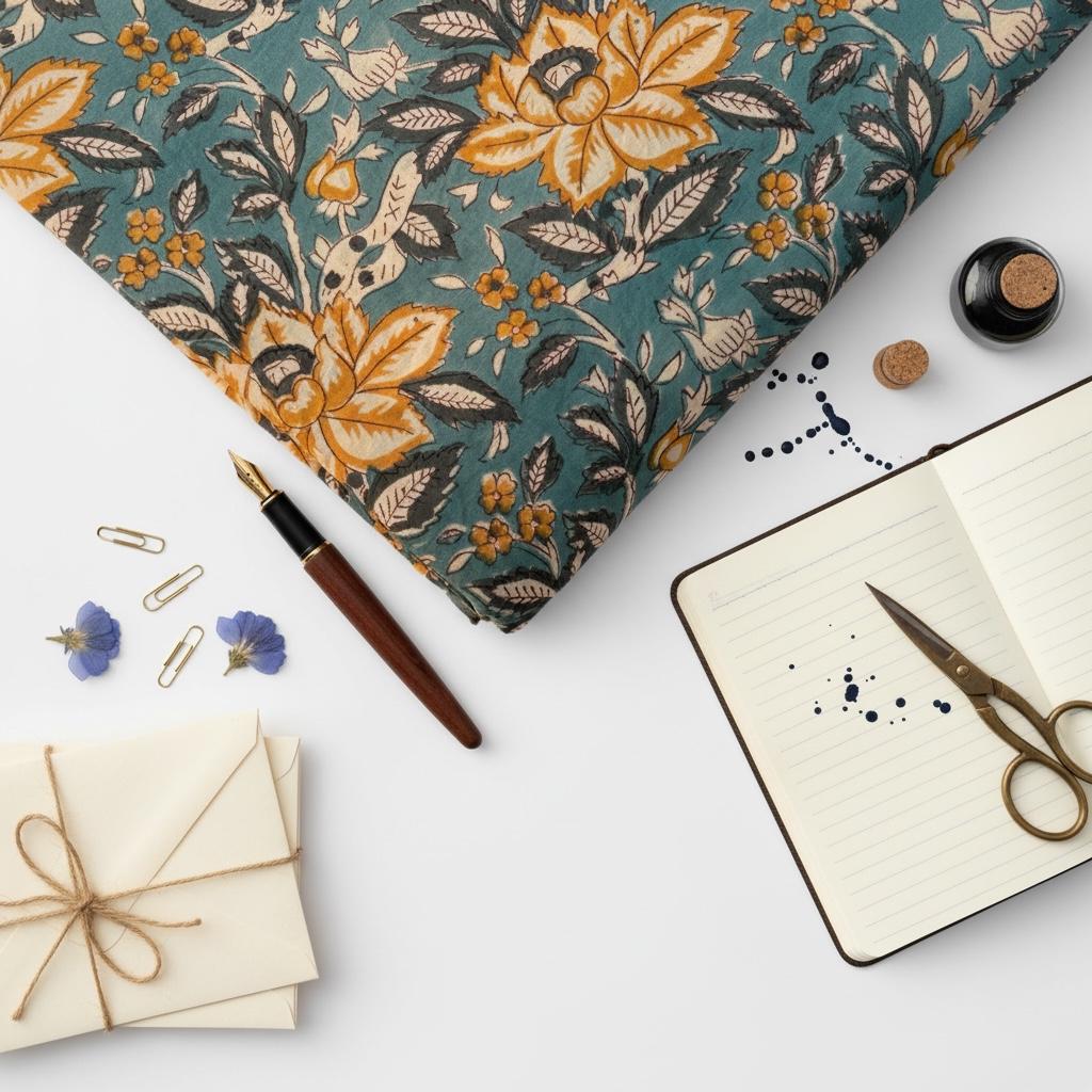 Each pattern is carefully hand stamped using carved wooden blocks, creating subtle variations that make every piece unique. The warm mustard florals contrast elegantly against the cool teal background, giving this fabric a vibrant yet earthy, vintage-inspired look.