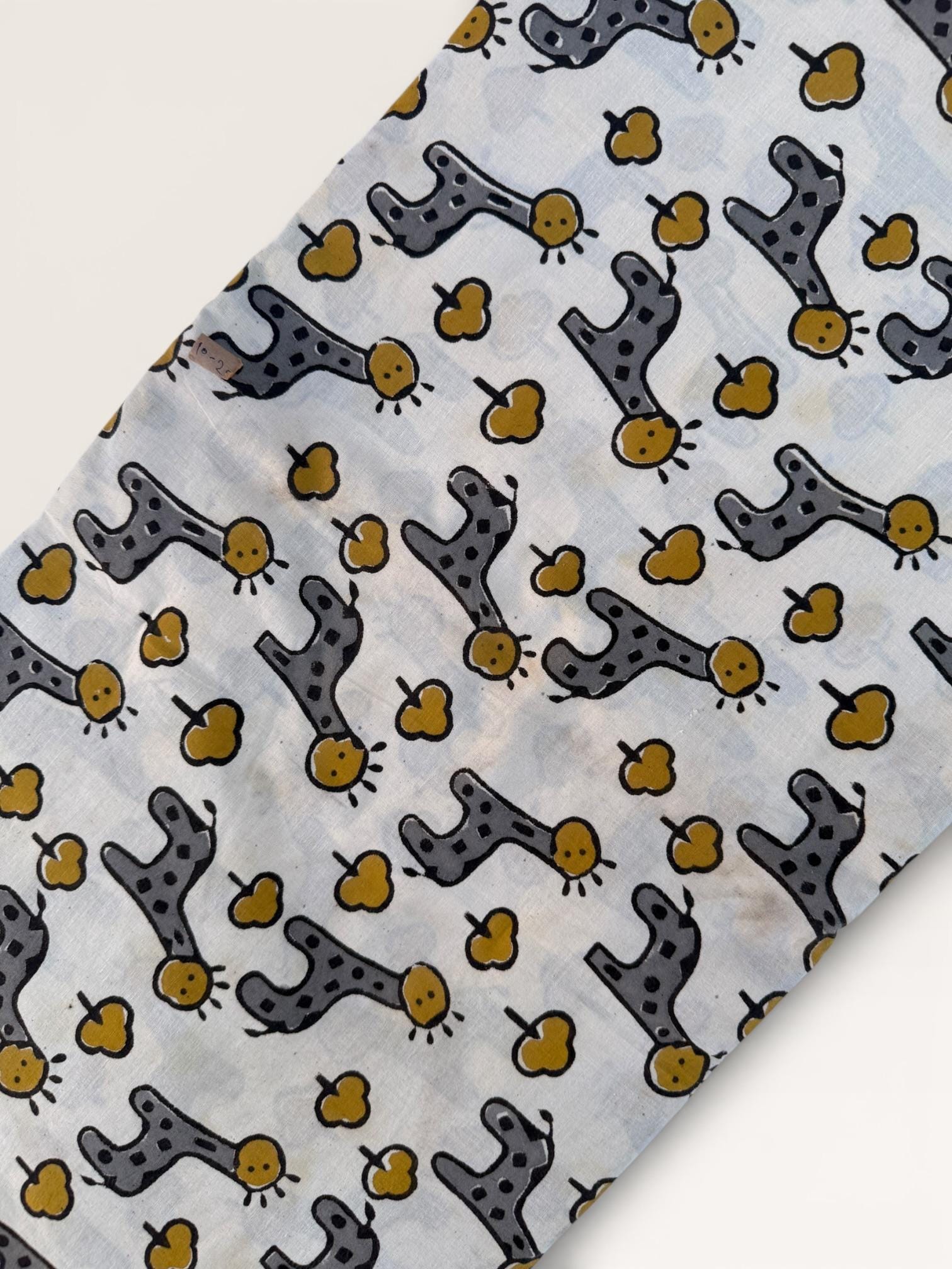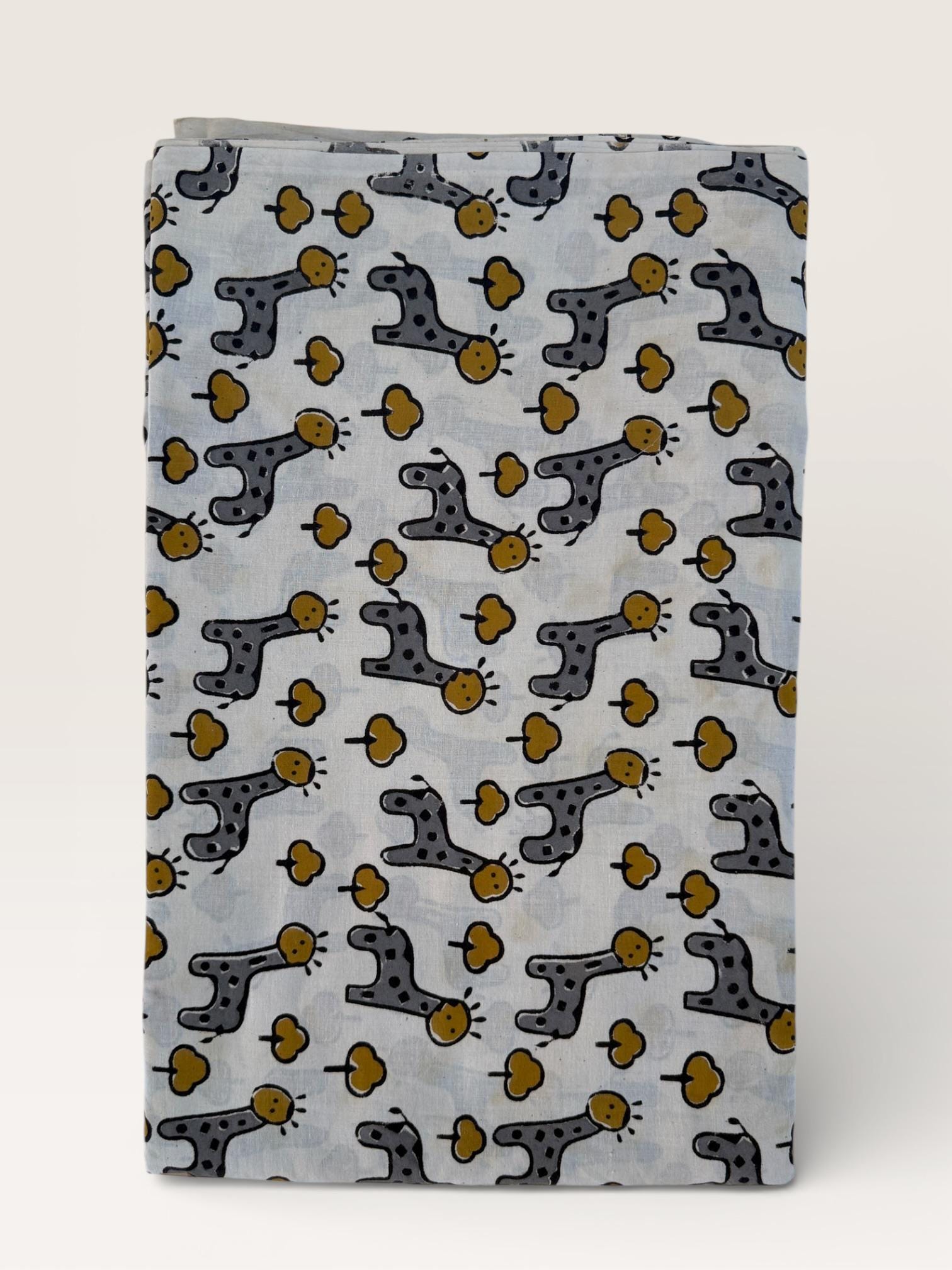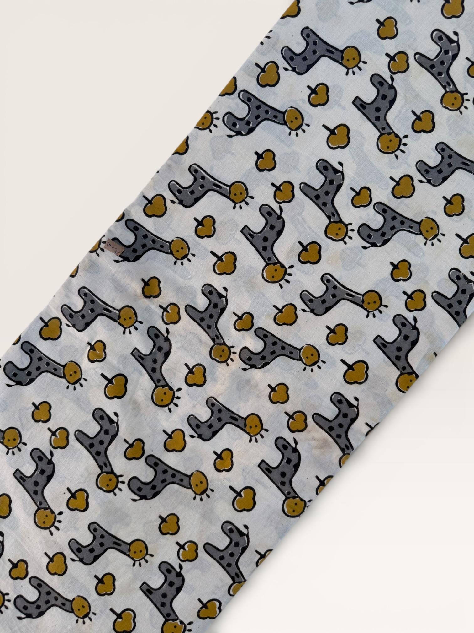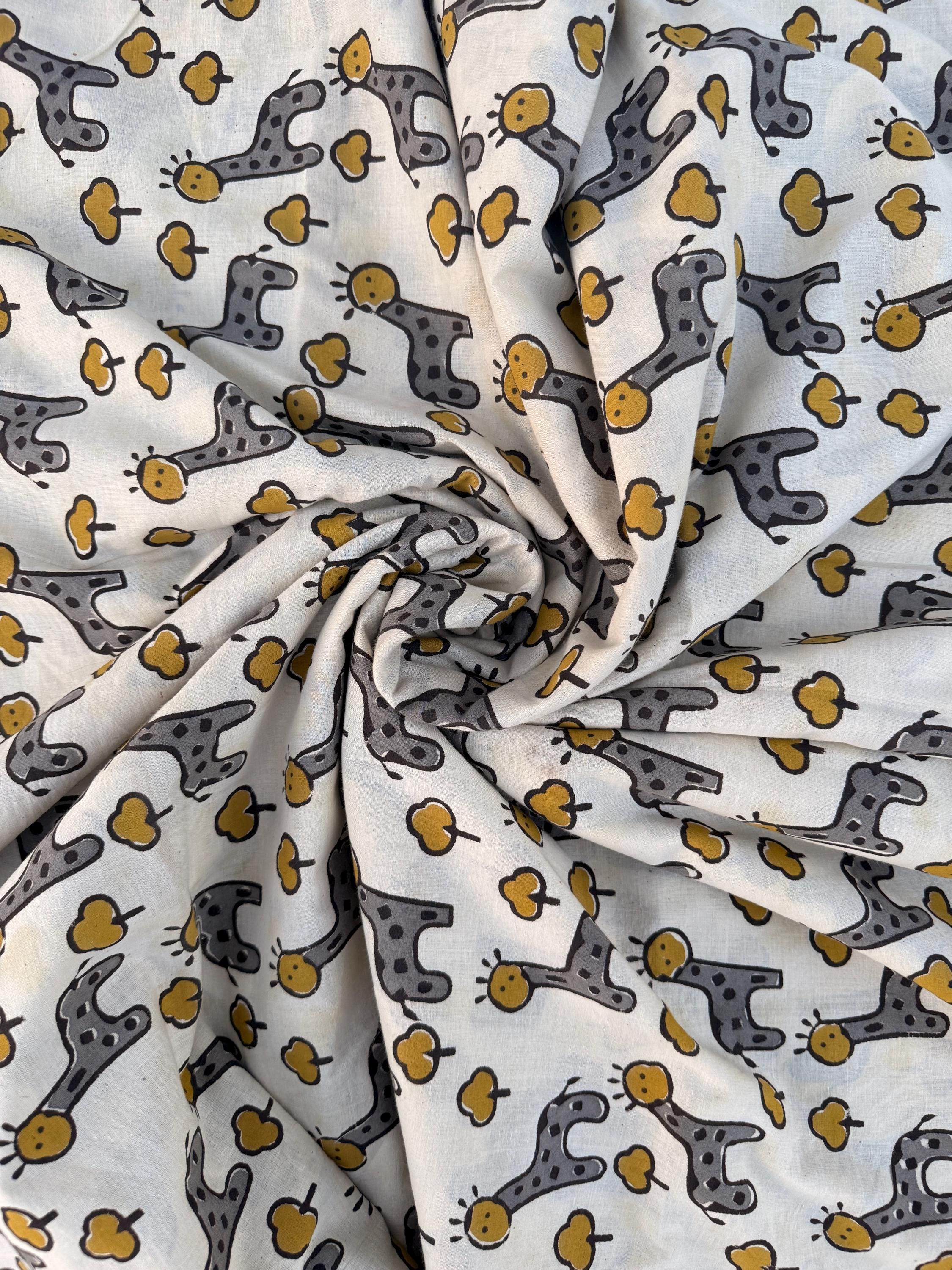Add a playful touch to your creations with this adorable Bagru hand block print cotton fabric featuring charming giraffe motifs and tiny tree designs. Handcrafted in Rajasthan using traditional wooden blocks, this fabric is printed with natural vegetable dyes on a soft off-white cotton base.