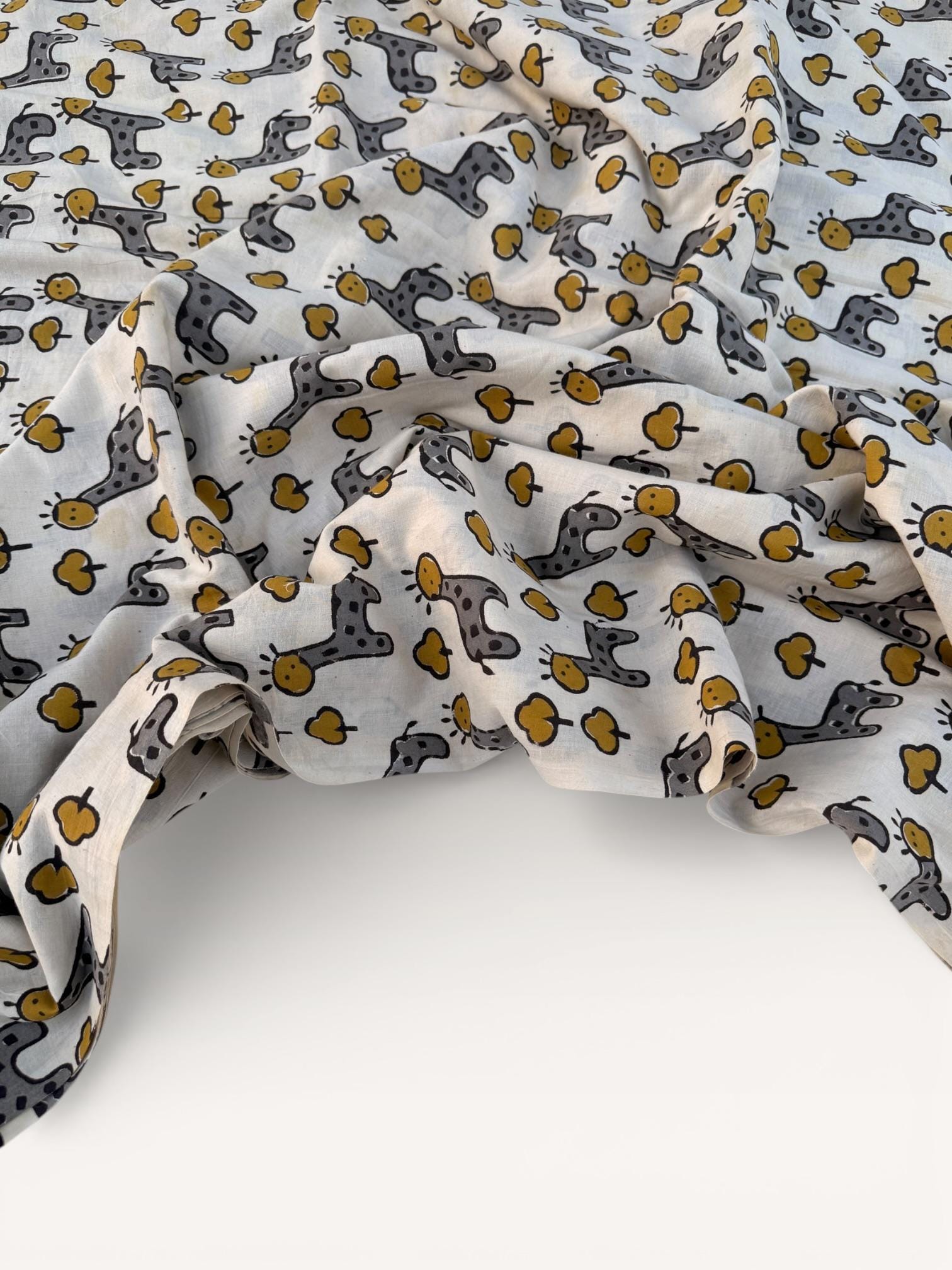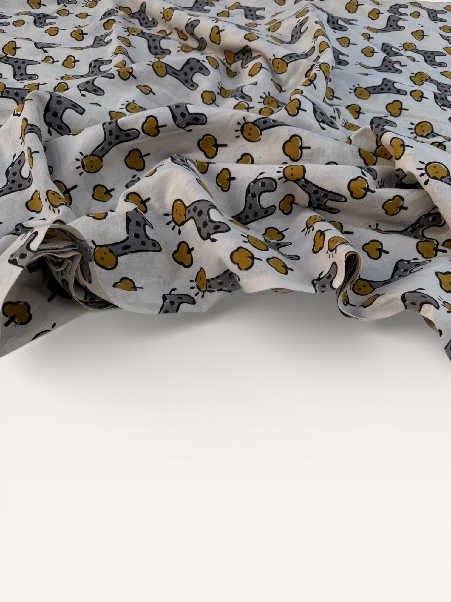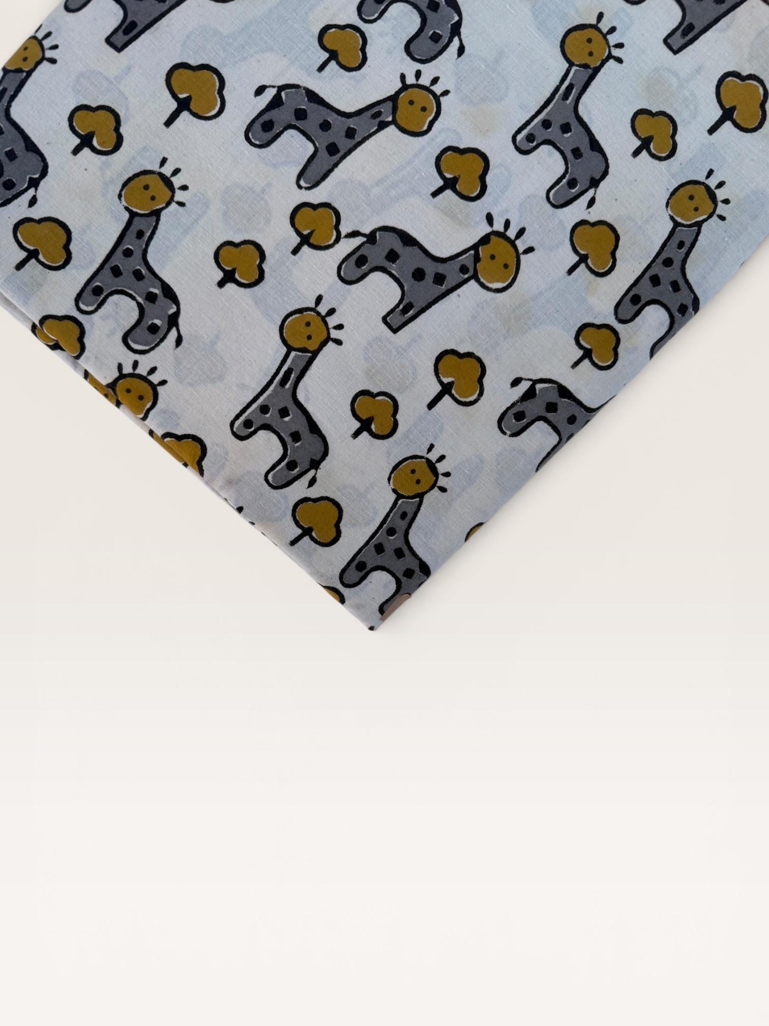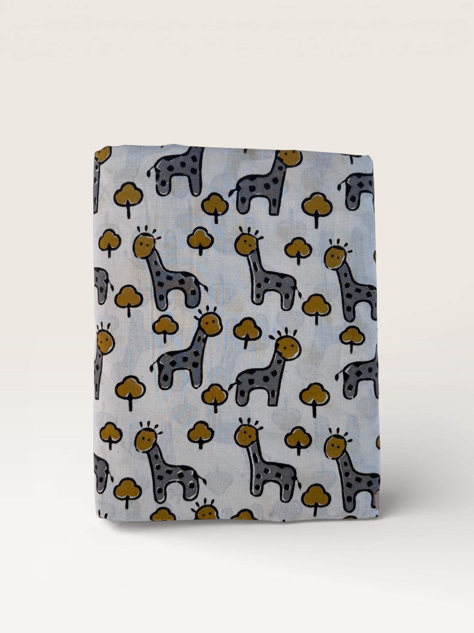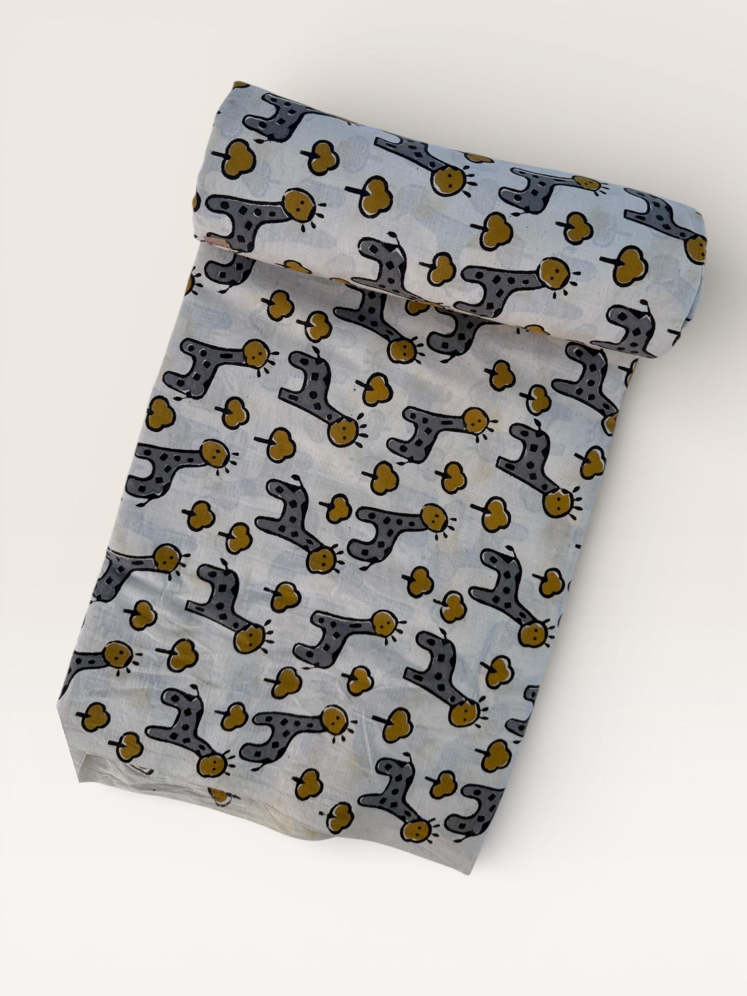 Add a playful touch to your creations with this adorable Bagru hand block print cotton fabric featuring charming giraffe motifs and tiny tree designs. Handcrafted in Rajasthan using traditional wooden blocks, this fabric is printed with natural vegetable dyes on a soft off-white cotton base.