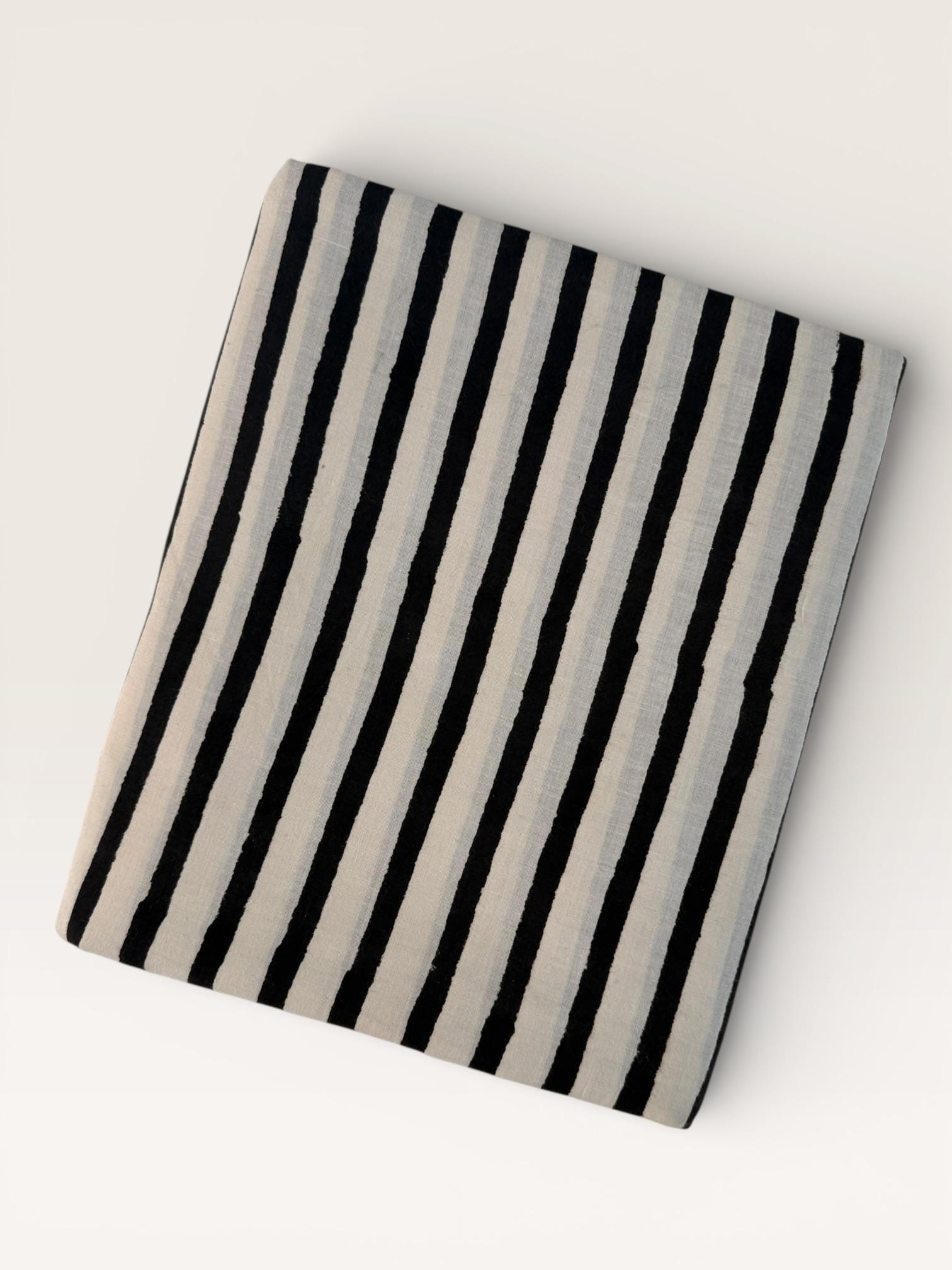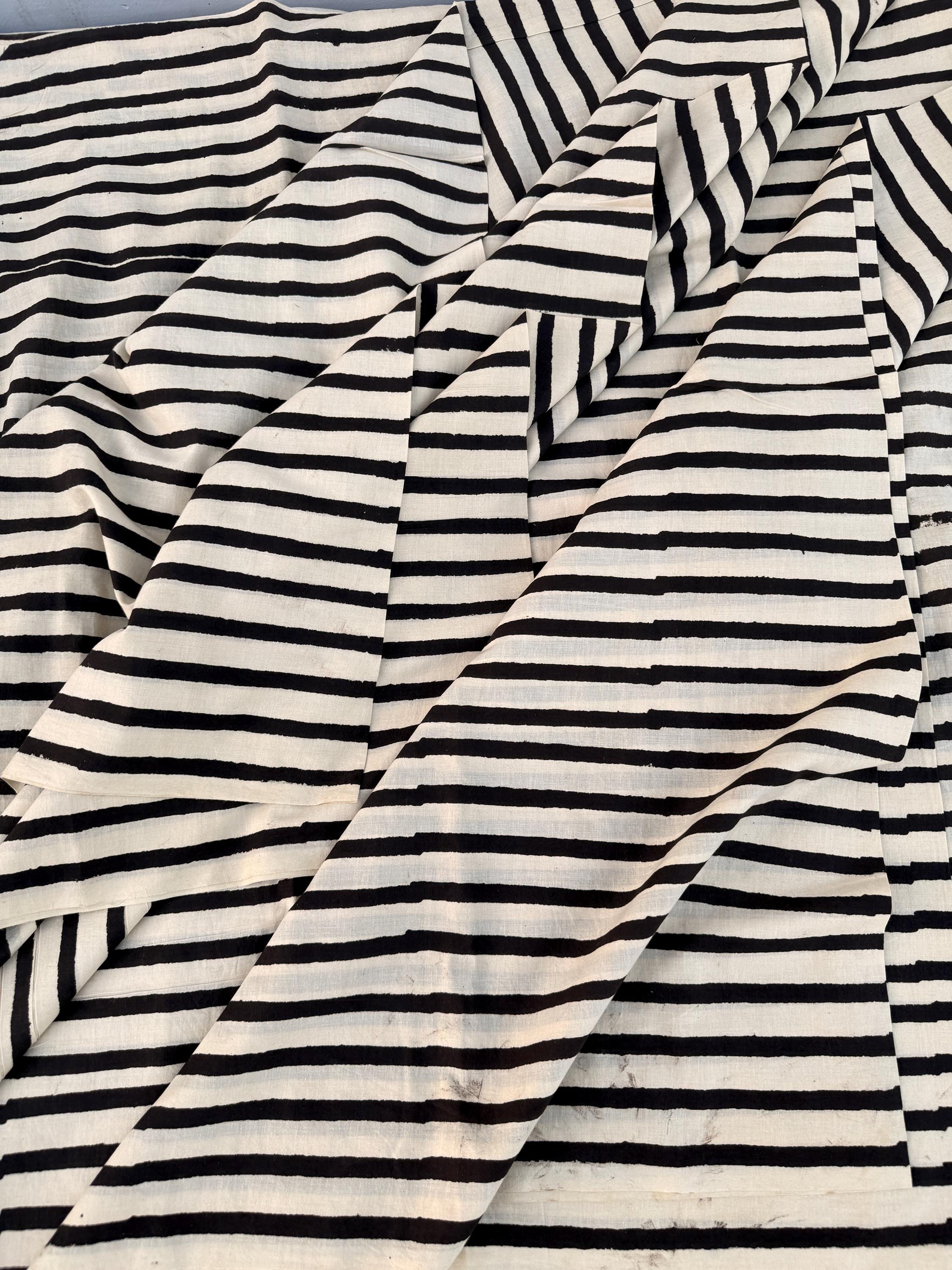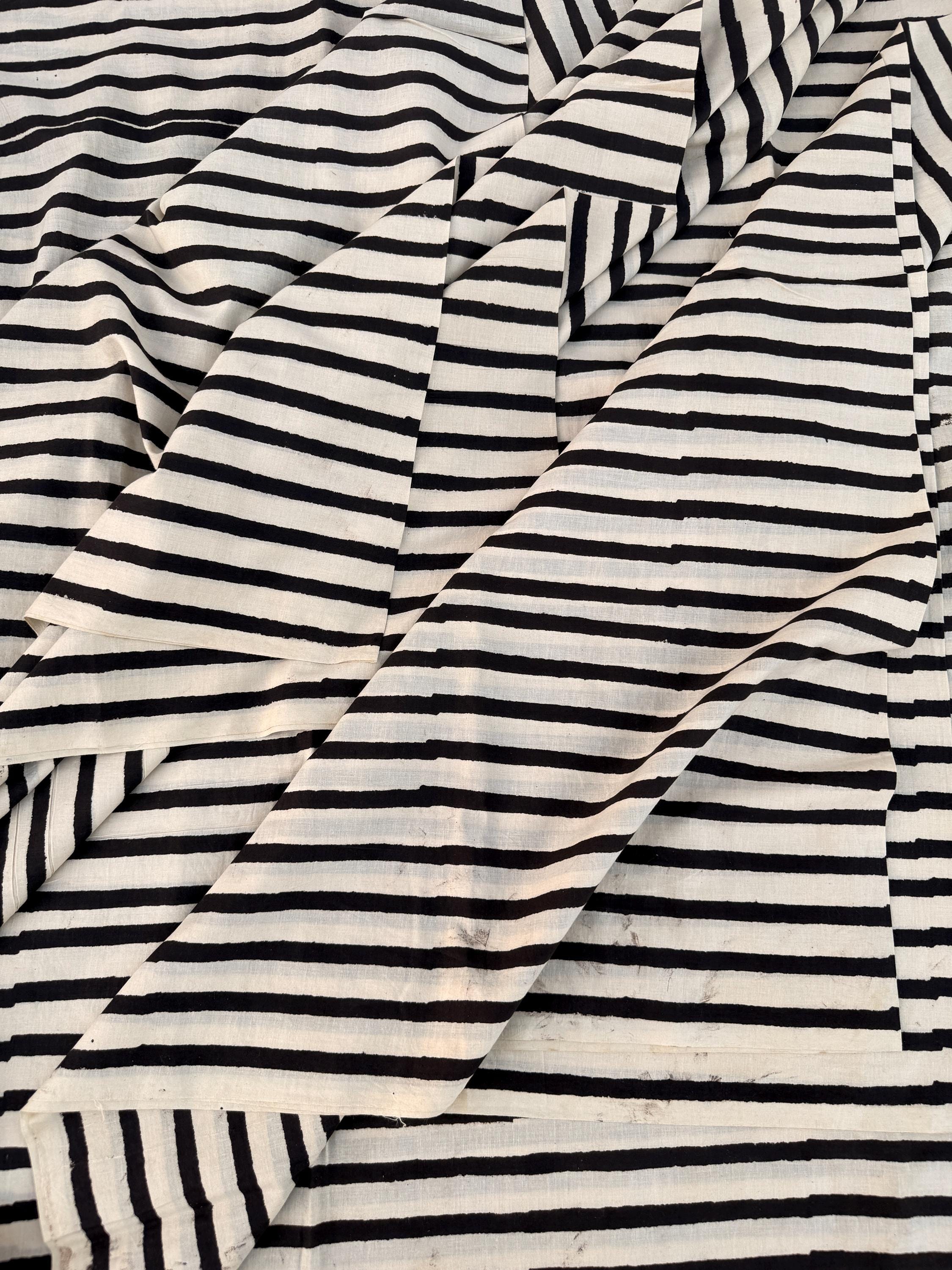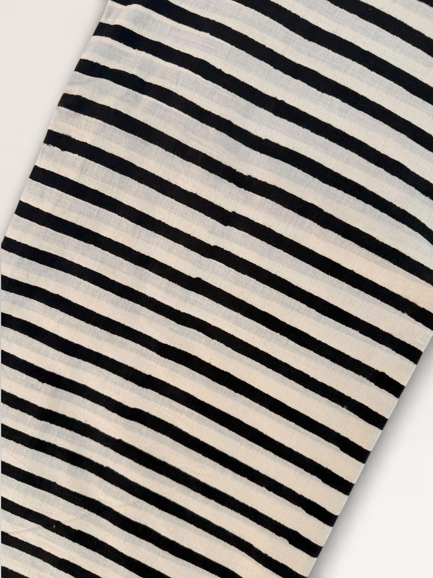 This elegant Bagru hand block print cotton fabric features a timeless striped pattern in natural deep Black Stripe on a soft off-white base. Handcrafted in Rajasthan using traditional wooden blocks, each stripe is carefully stamped by skilled artisans, giving the lines a slightly organic, hand-drawn character.