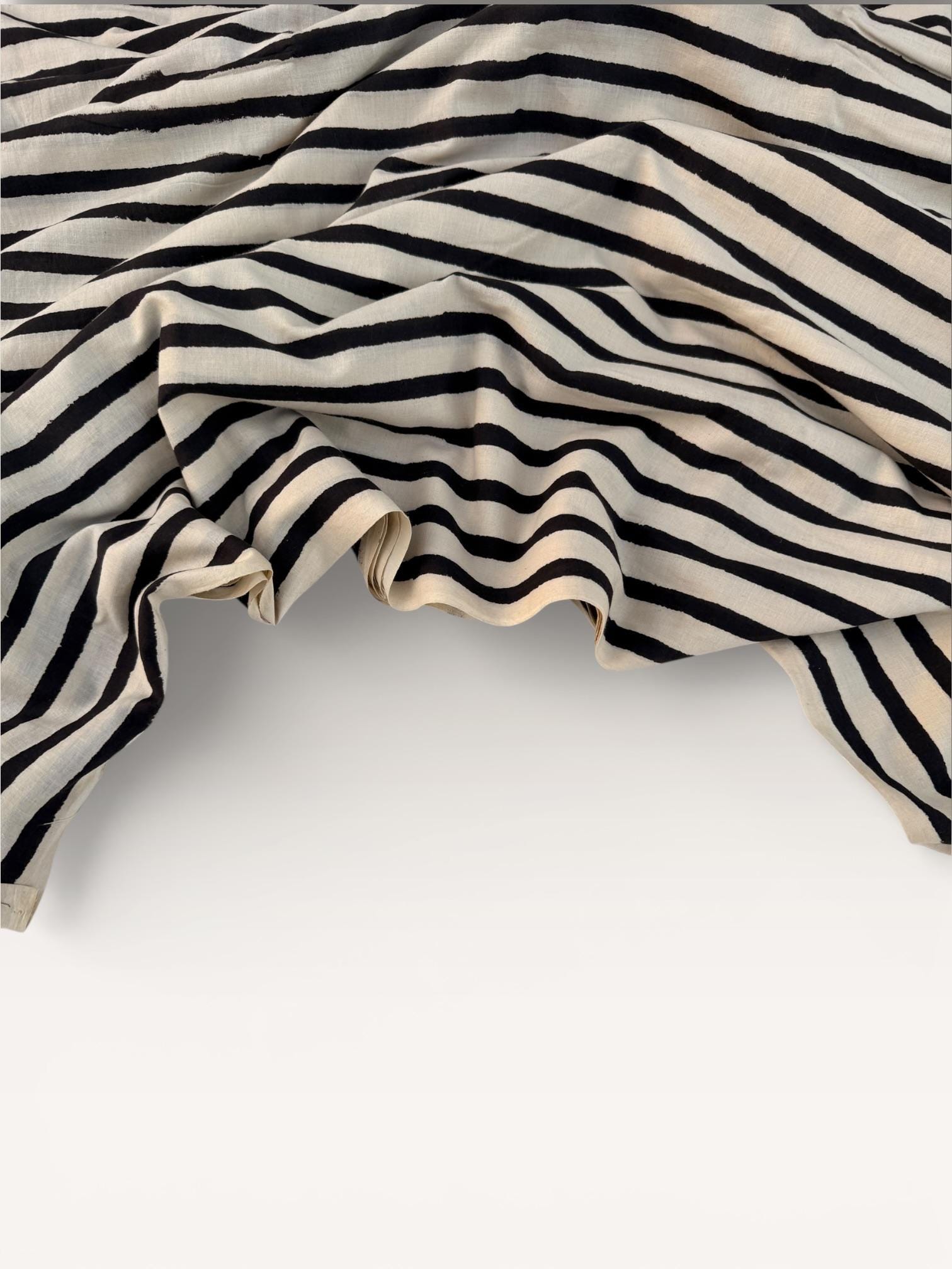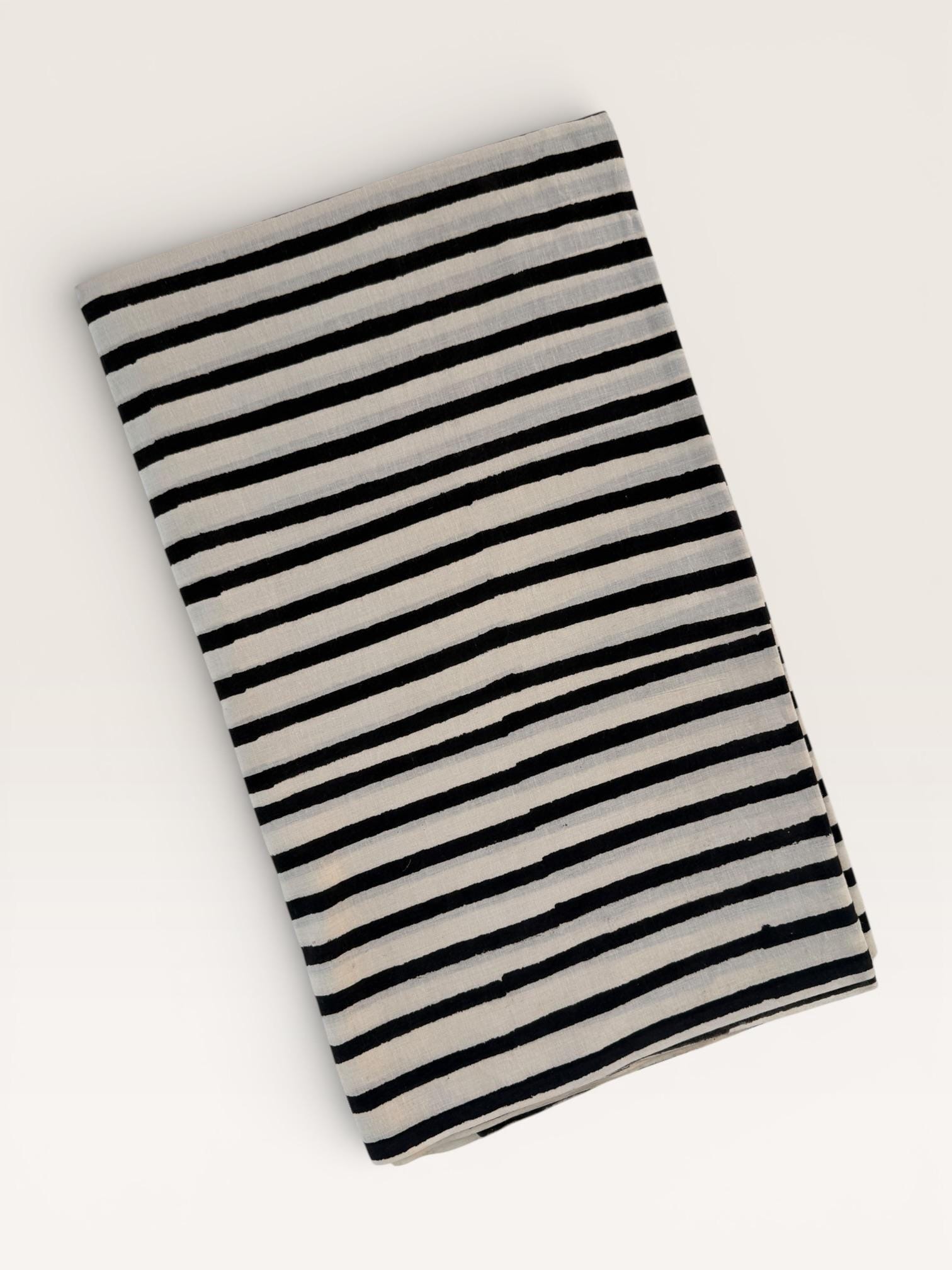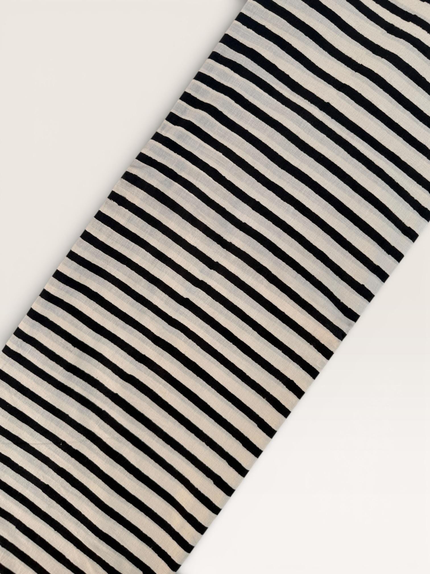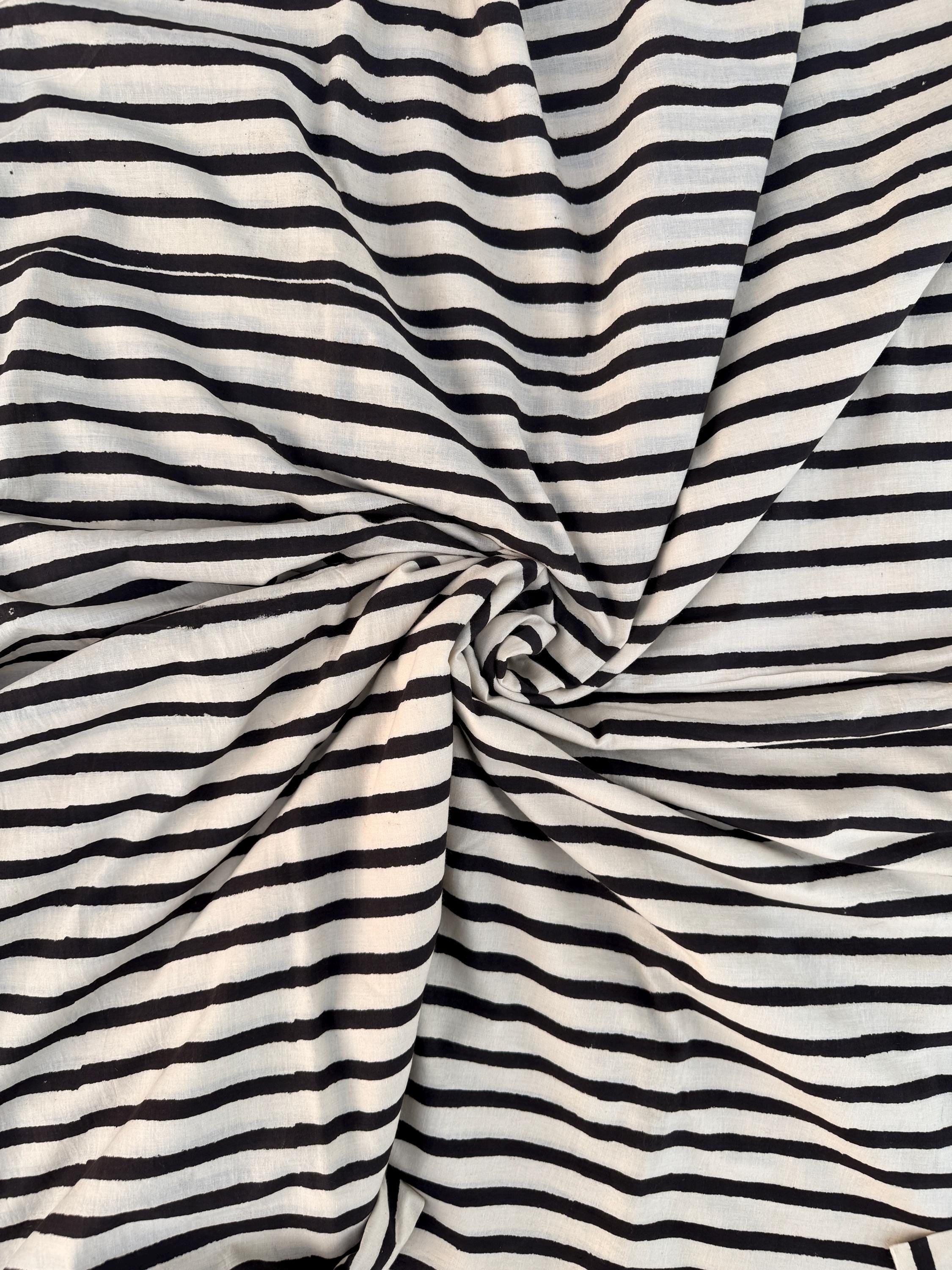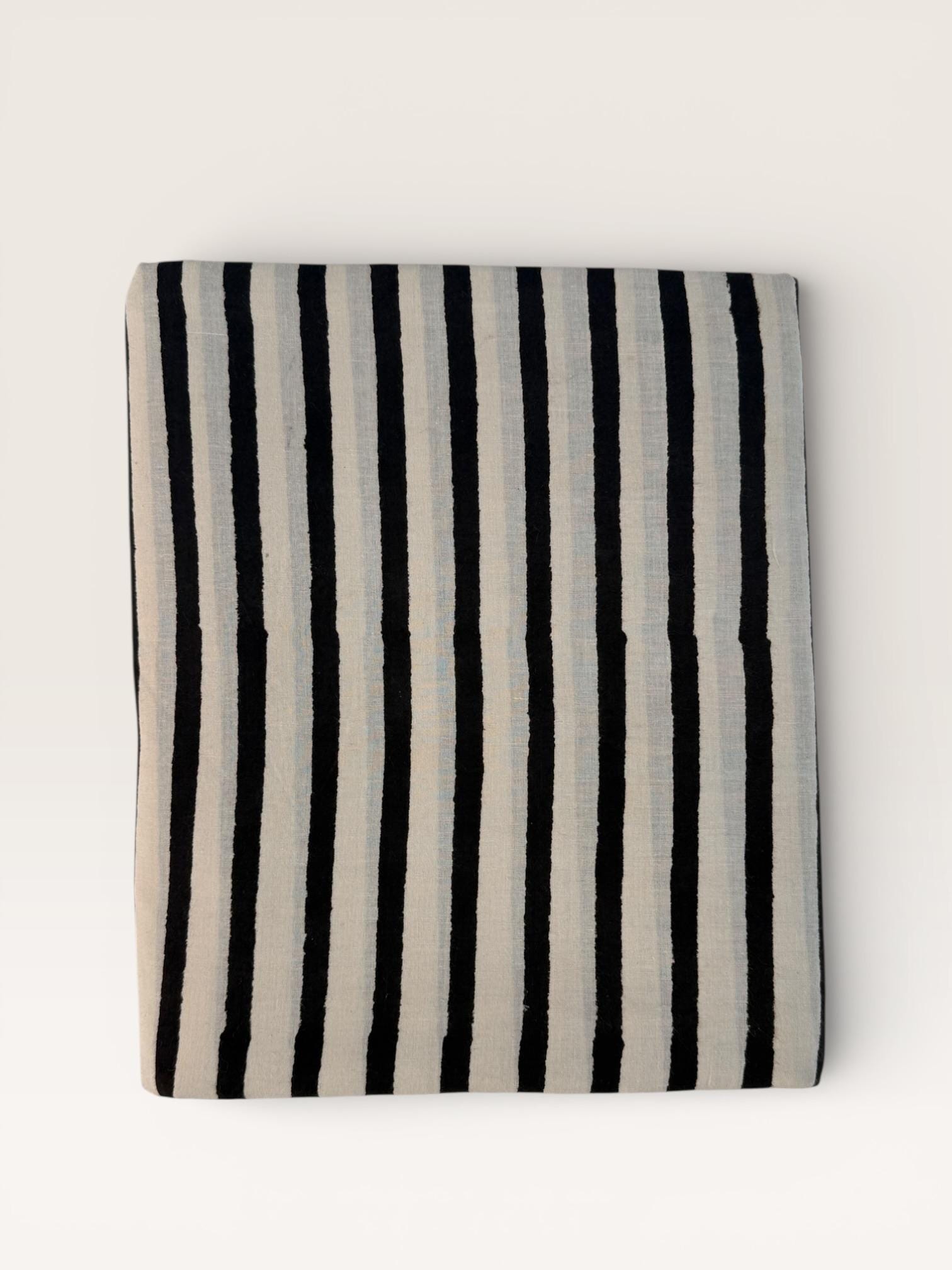 This elegant Bagru hand block print cotton fabric features a timeless striped pattern in natural deep Black Stripe on a soft off-white base. Handcrafted in Rajasthan using traditional wooden blocks, each stripe is carefully stamped by skilled artisans, giving the lines a slightly organic, hand-drawn character.