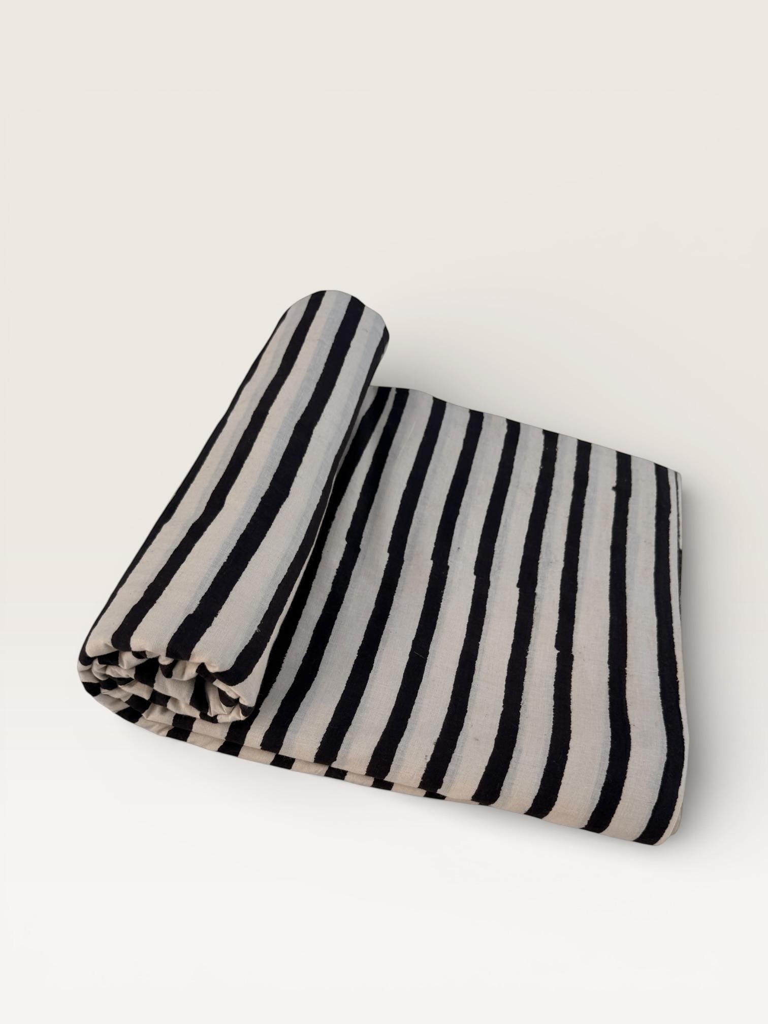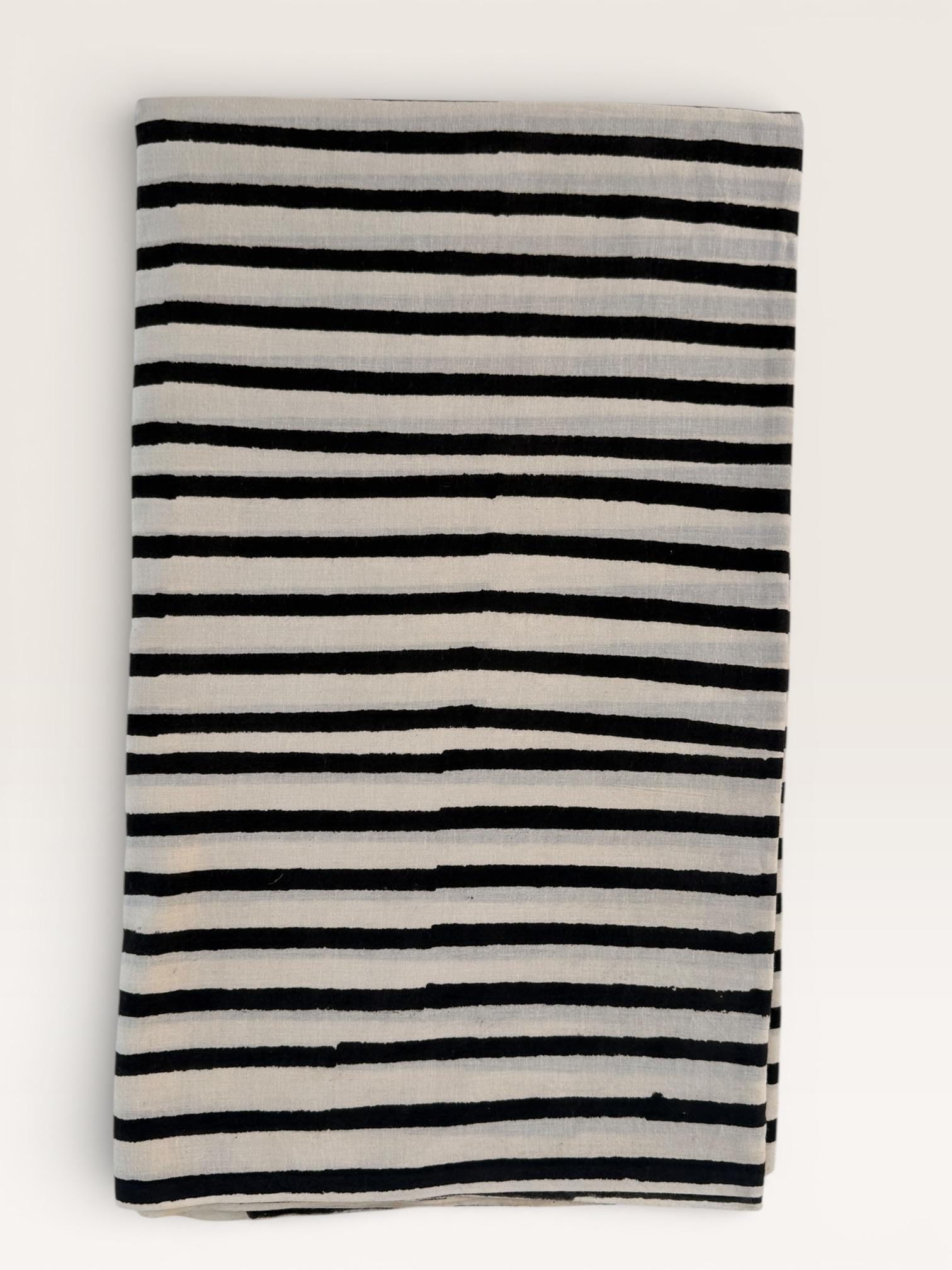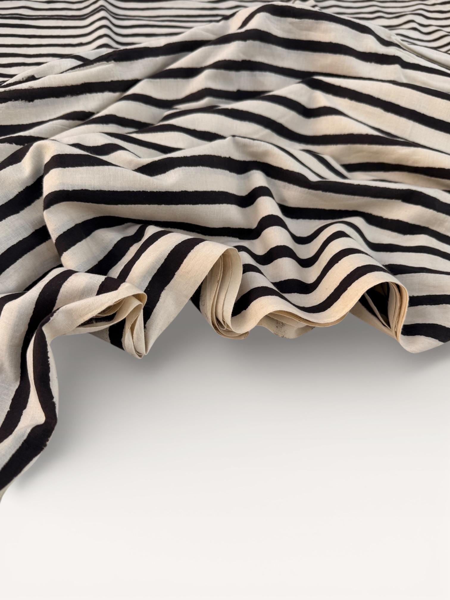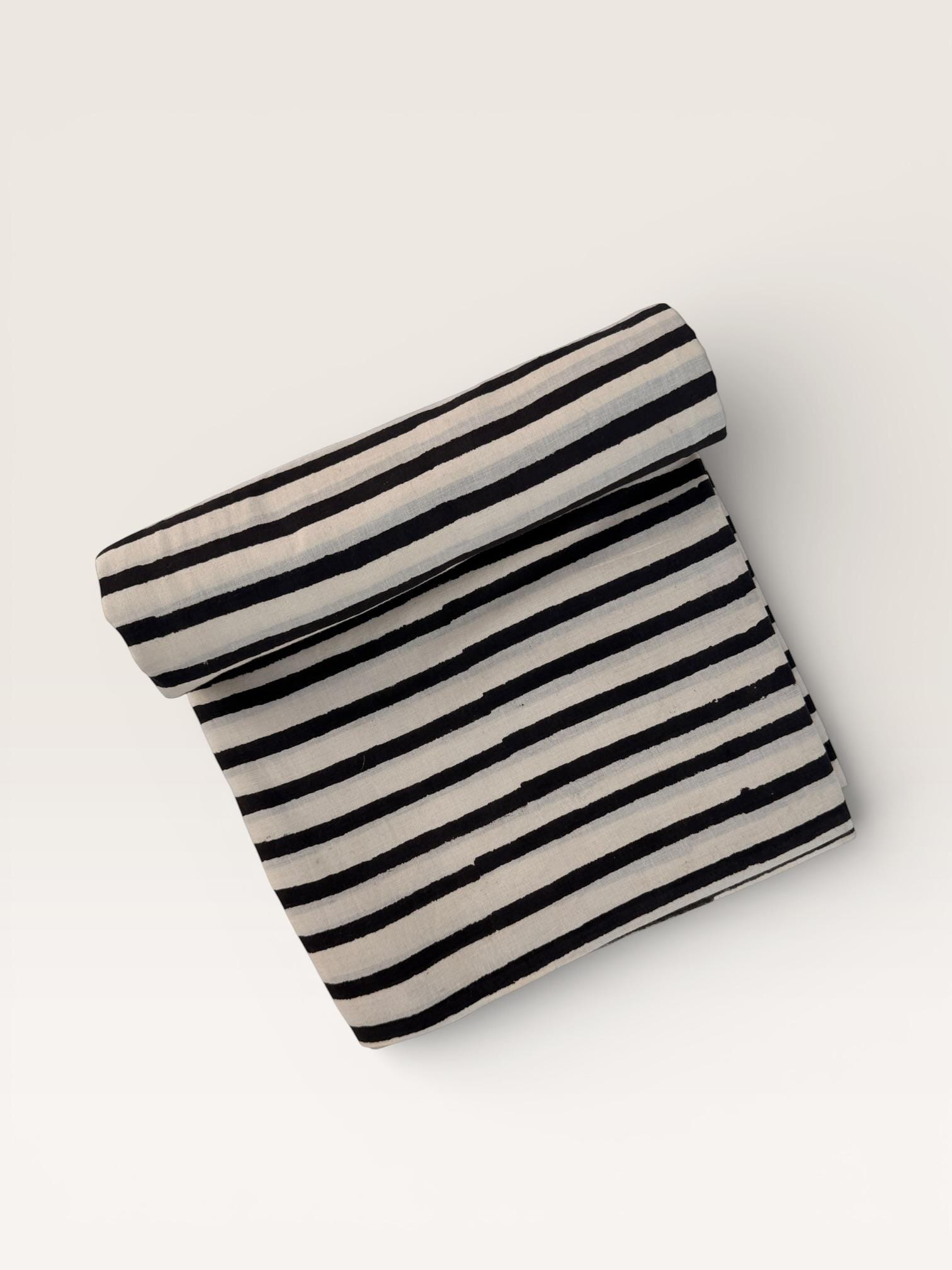 This elegant Bagru hand block print cotton fabric features a timeless striped pattern in natural deep Black Stripe on a soft off-white base. Handcrafted in Rajasthan using traditional wooden blocks, each stripe is carefully stamped by skilled artisans, giving the lines a slightly organic, hand-drawn character.