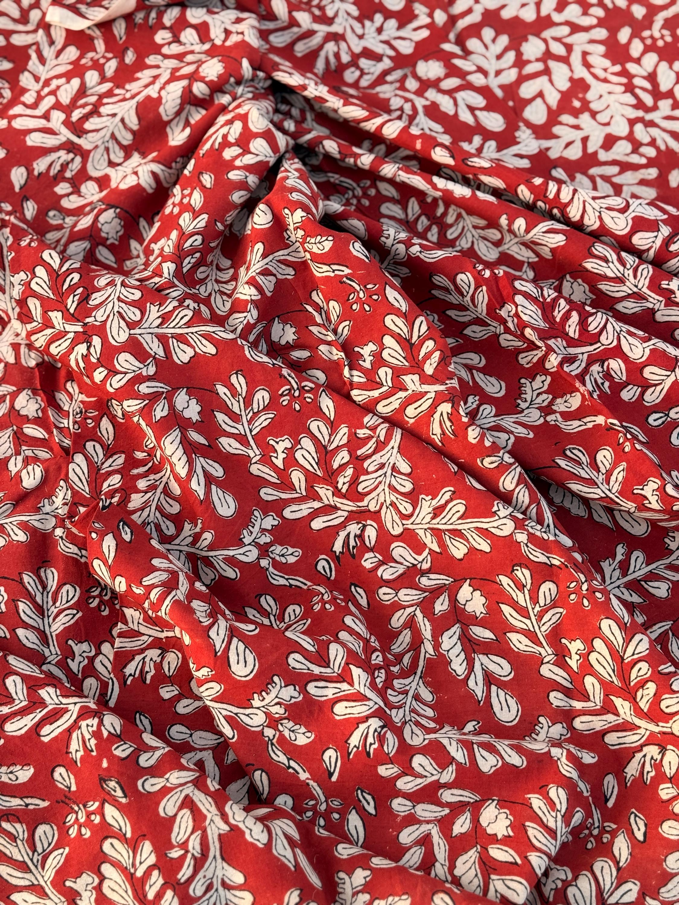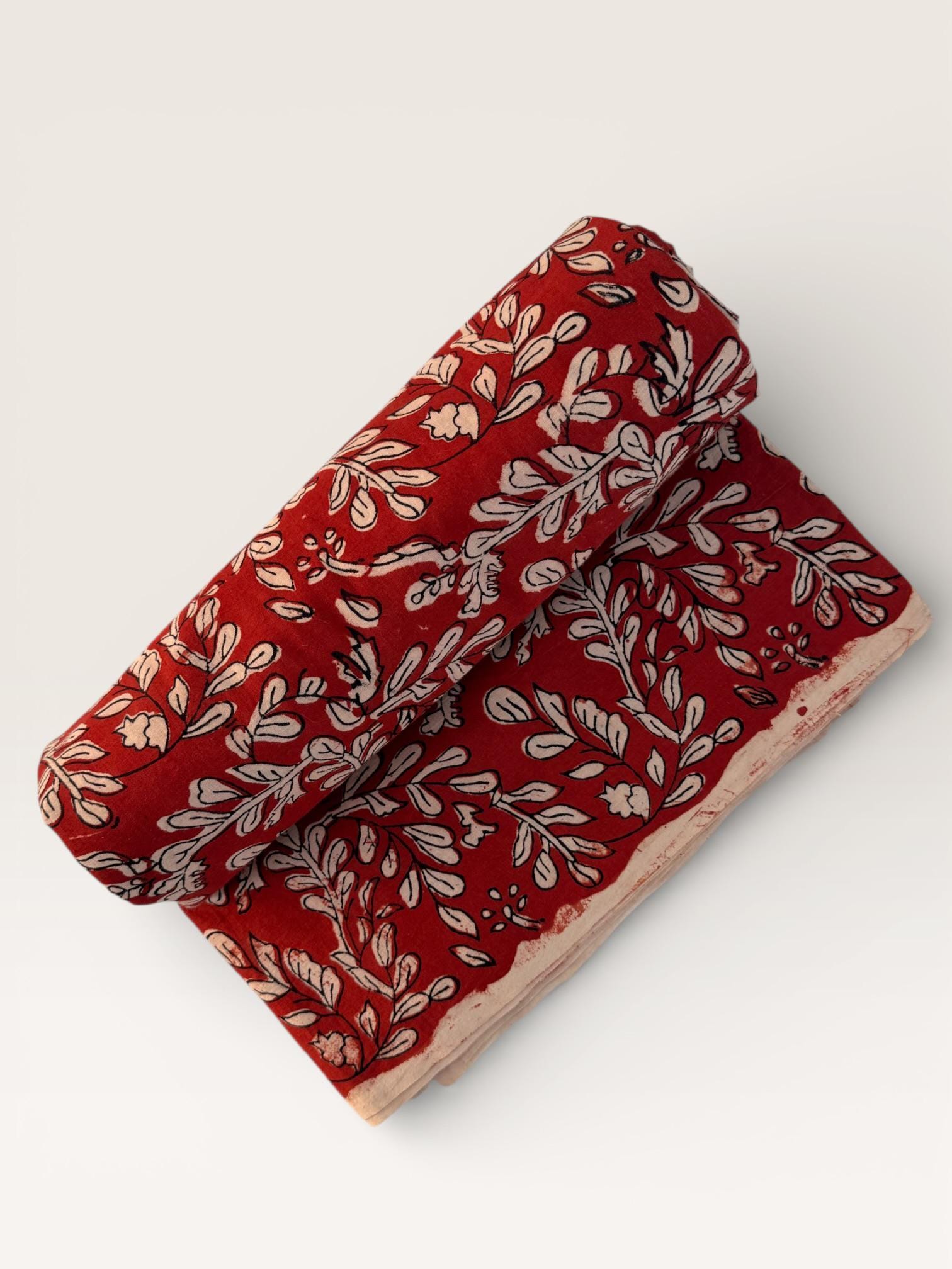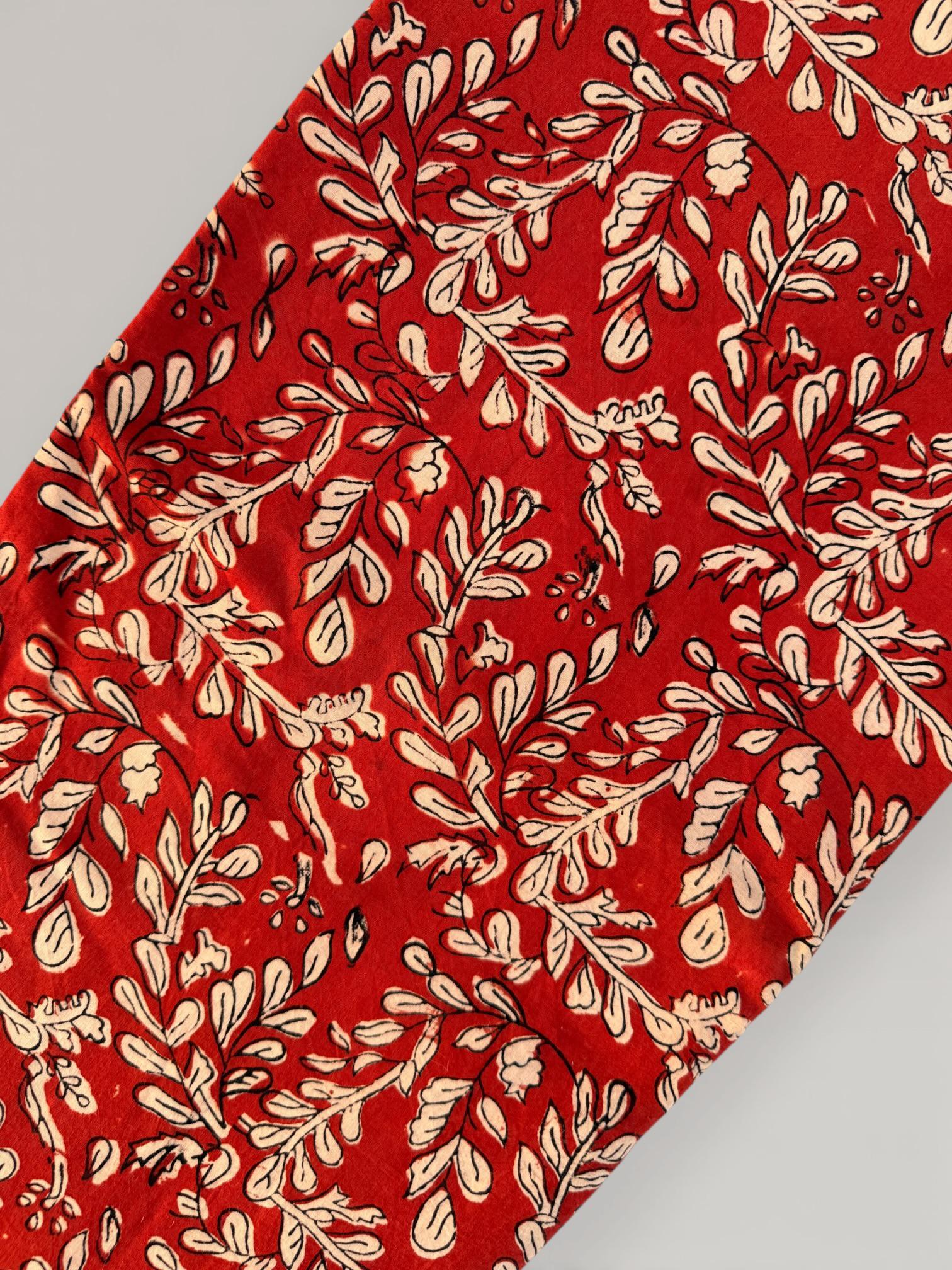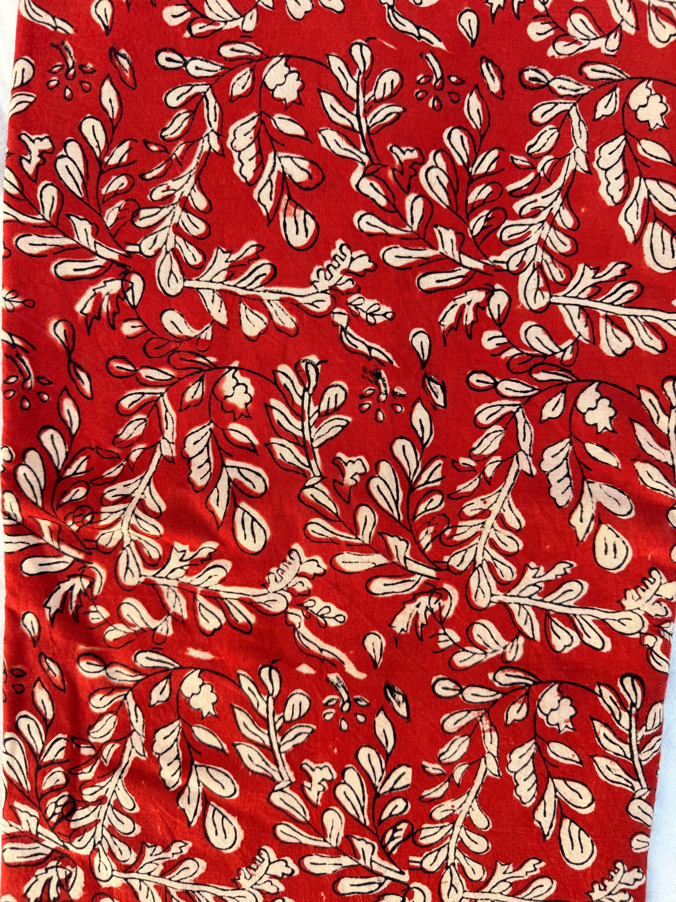 Add warmth and timeless charm to your projects with this beautiful Bagru hand block printed cotton fabric. Featuring an elegant floral vine motif in soft ivory tones on a rich red base, this fabric reflects the beauty of traditional Indian craftsmanship with a classic yet versatile look.