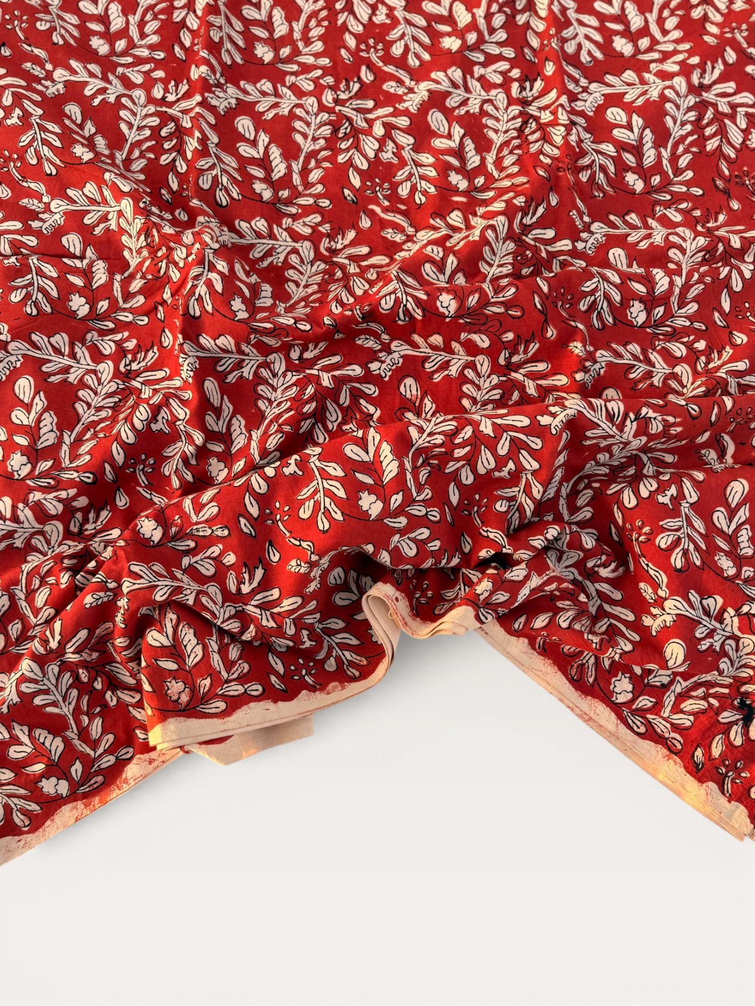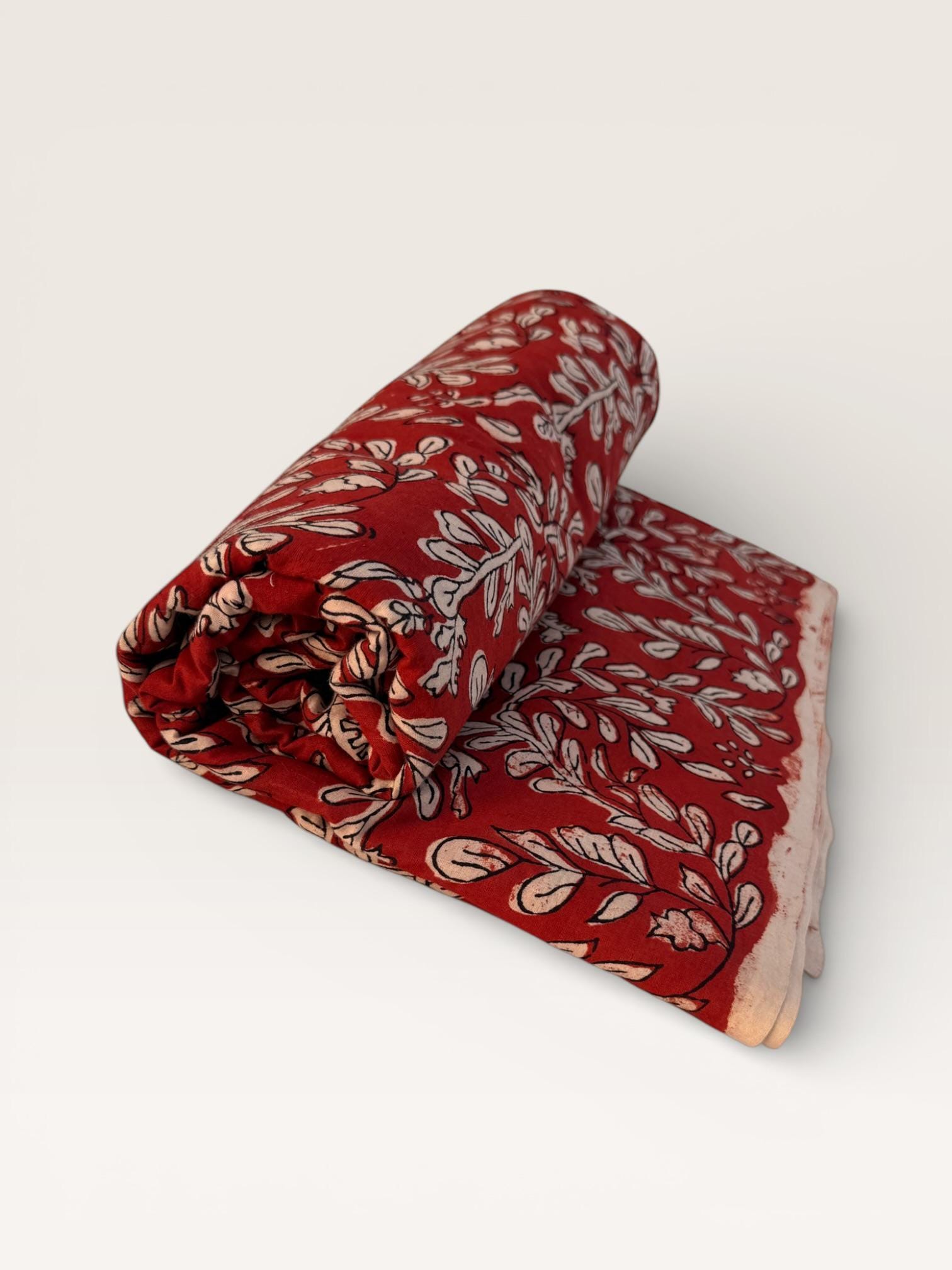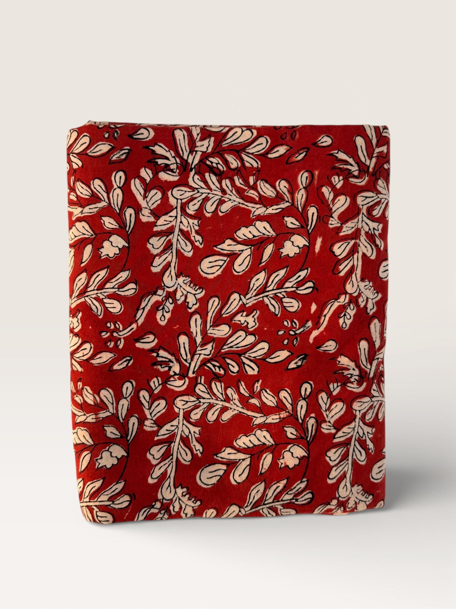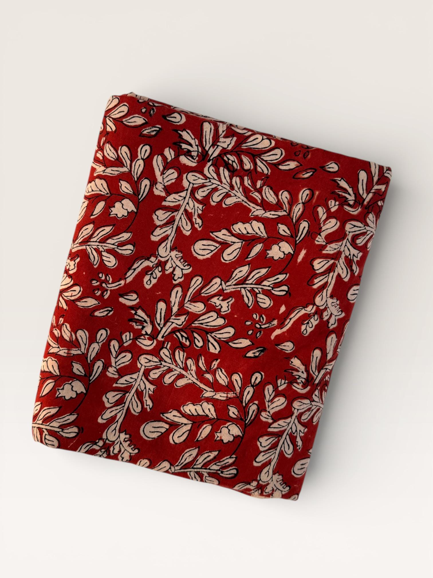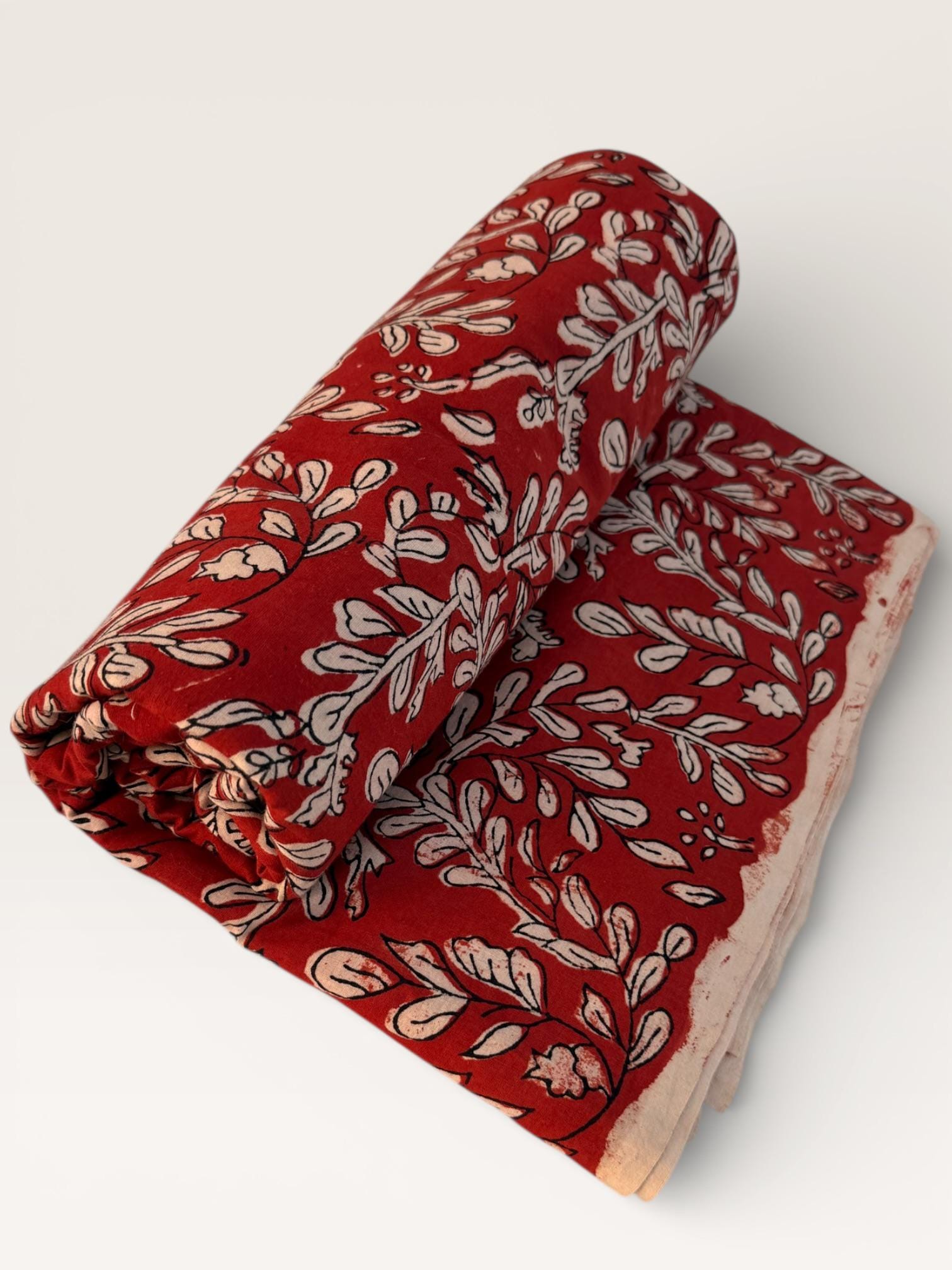 Add warmth and timeless charm to your projects with this beautiful Bagru hand block printed cotton fabric. Featuring an elegant floral vine motif in soft ivory tones on a rich red base, this fabric reflects the beauty of traditional Indian craftsmanship with a classic yet versatile look.