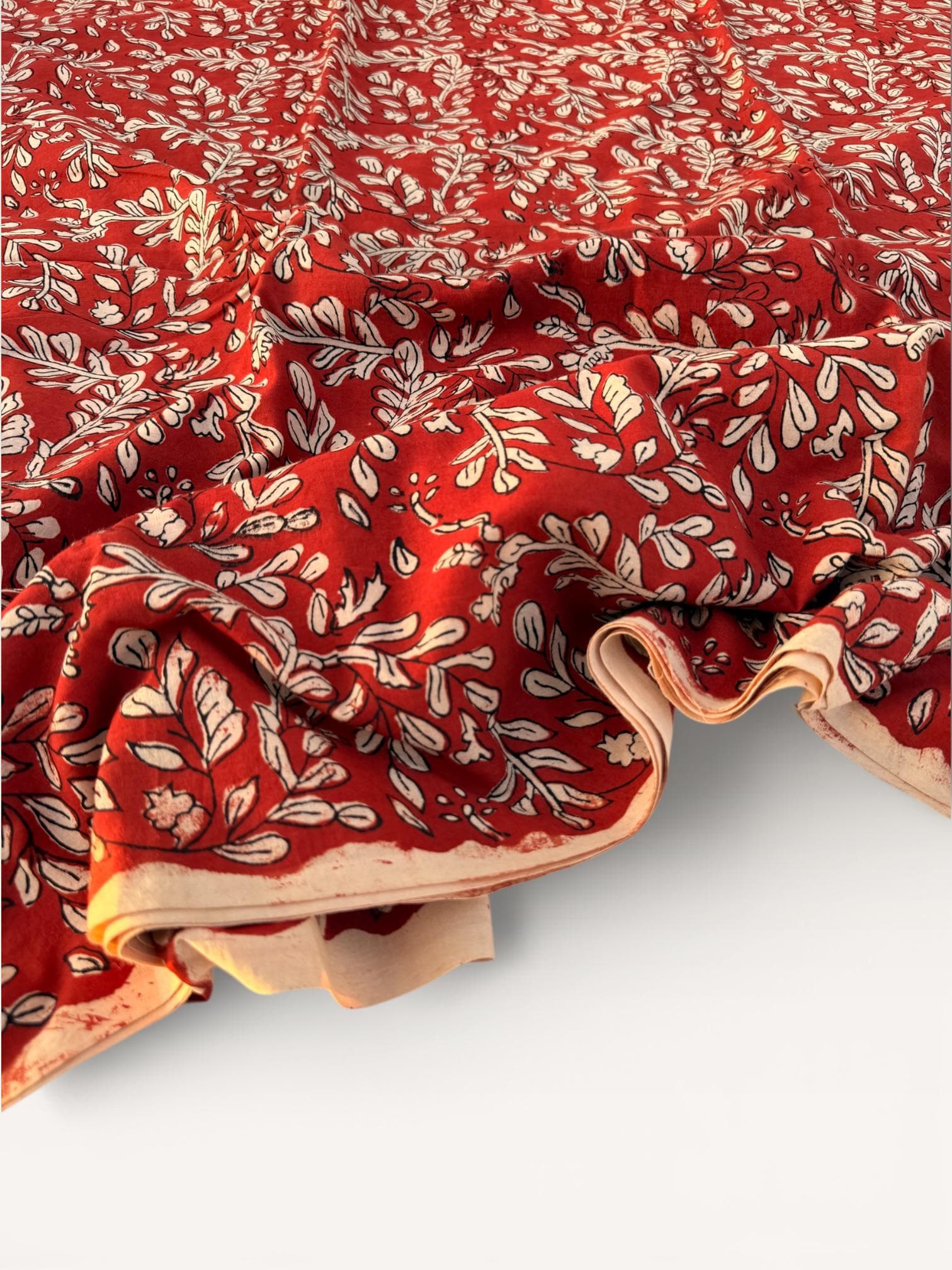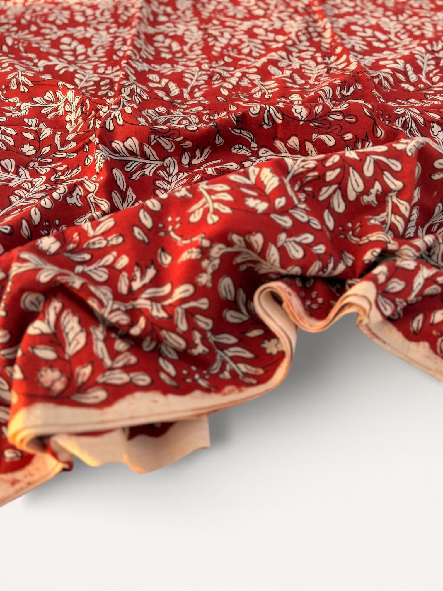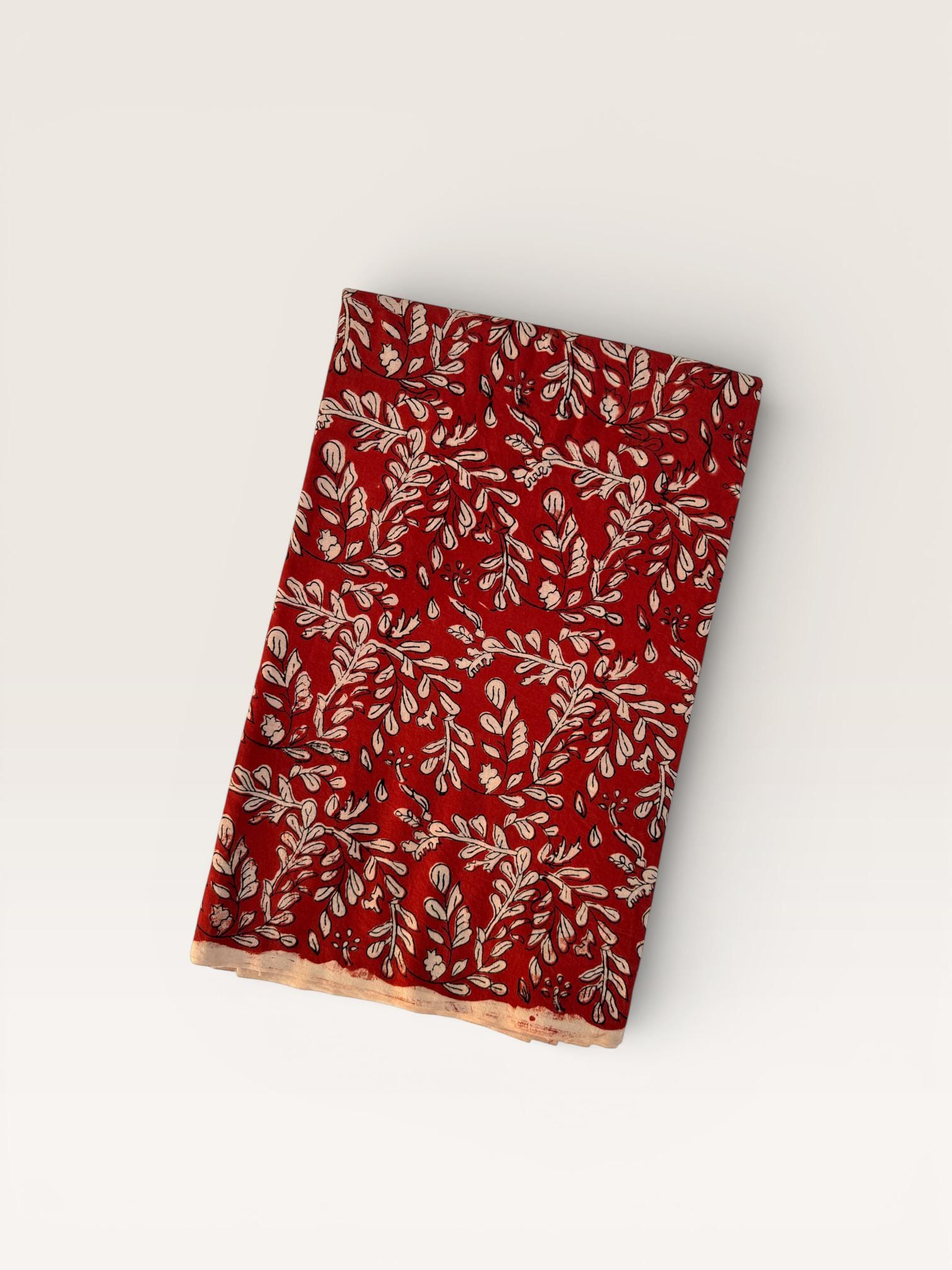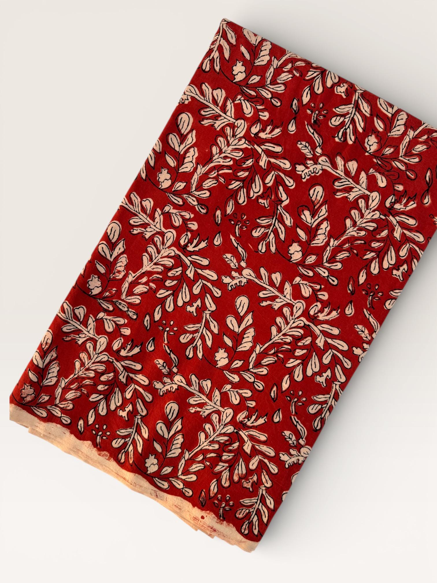 Add warmth and timeless charm to your projects with this beautiful Bagru hand block printed cotton fabric. Featuring an elegant floral vine motif in soft ivory tones on a rich red base, this fabric reflects the beauty of traditional Indian craftsmanship with a classic yet versatile look.