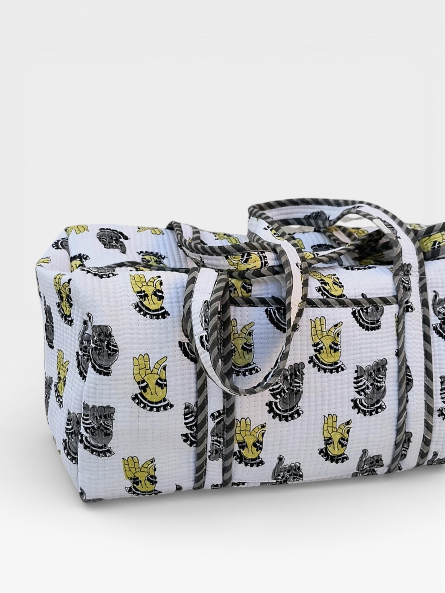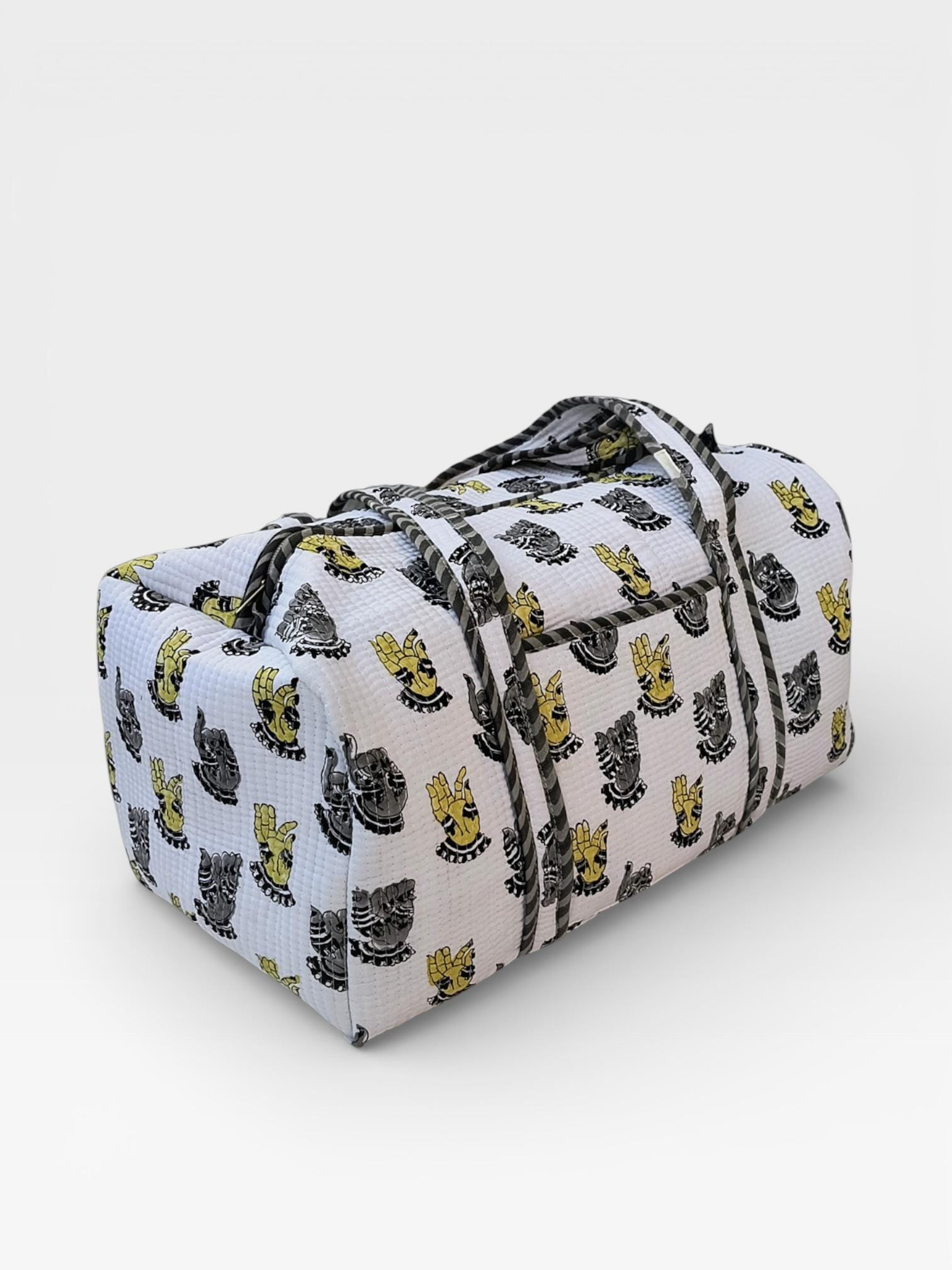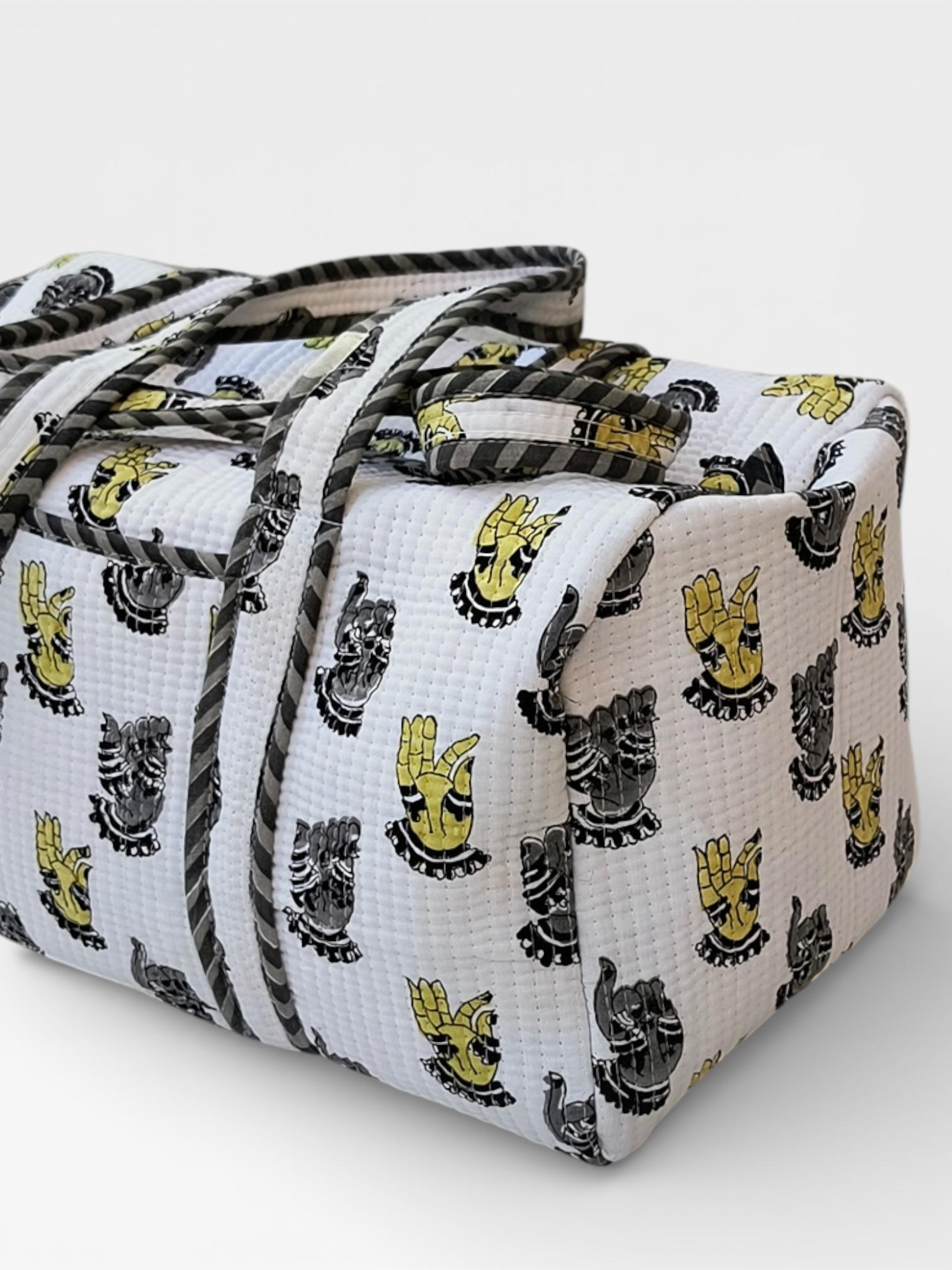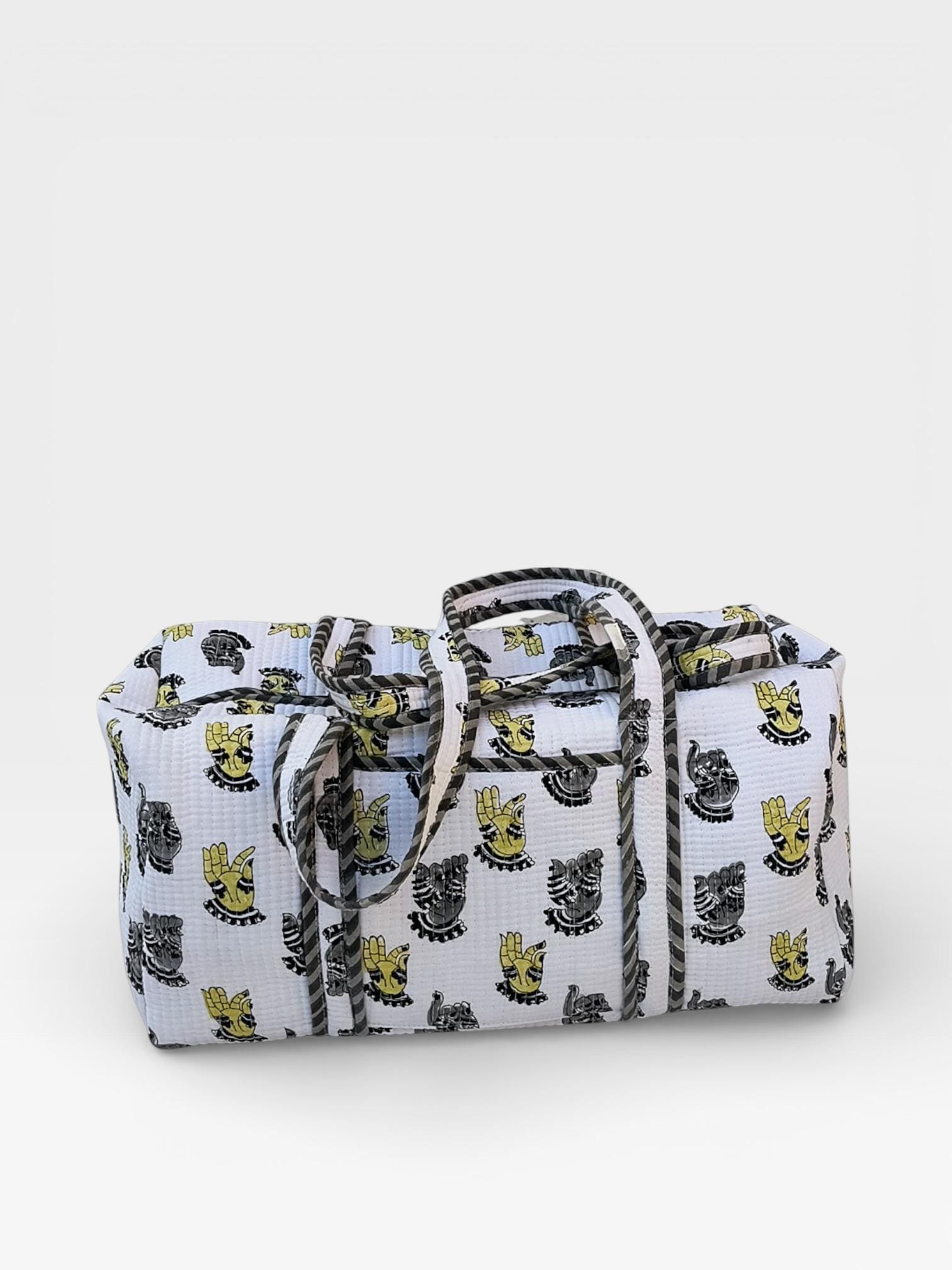 Add a touch of artisanal charm to your travels with this beautifully handcrafted block print duffle bag. Made from soft waffle cotton fabric, this bag features traditional hand block printed motifs in a timeless monochrome and yellow palette, finished with elegant striped piping for a refined look.