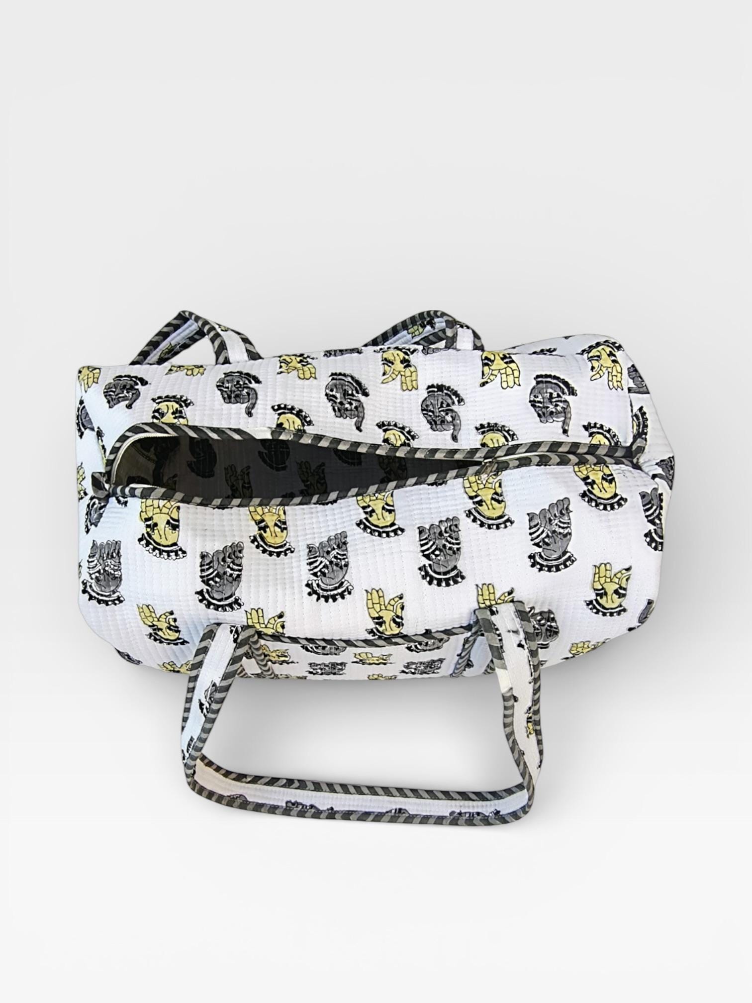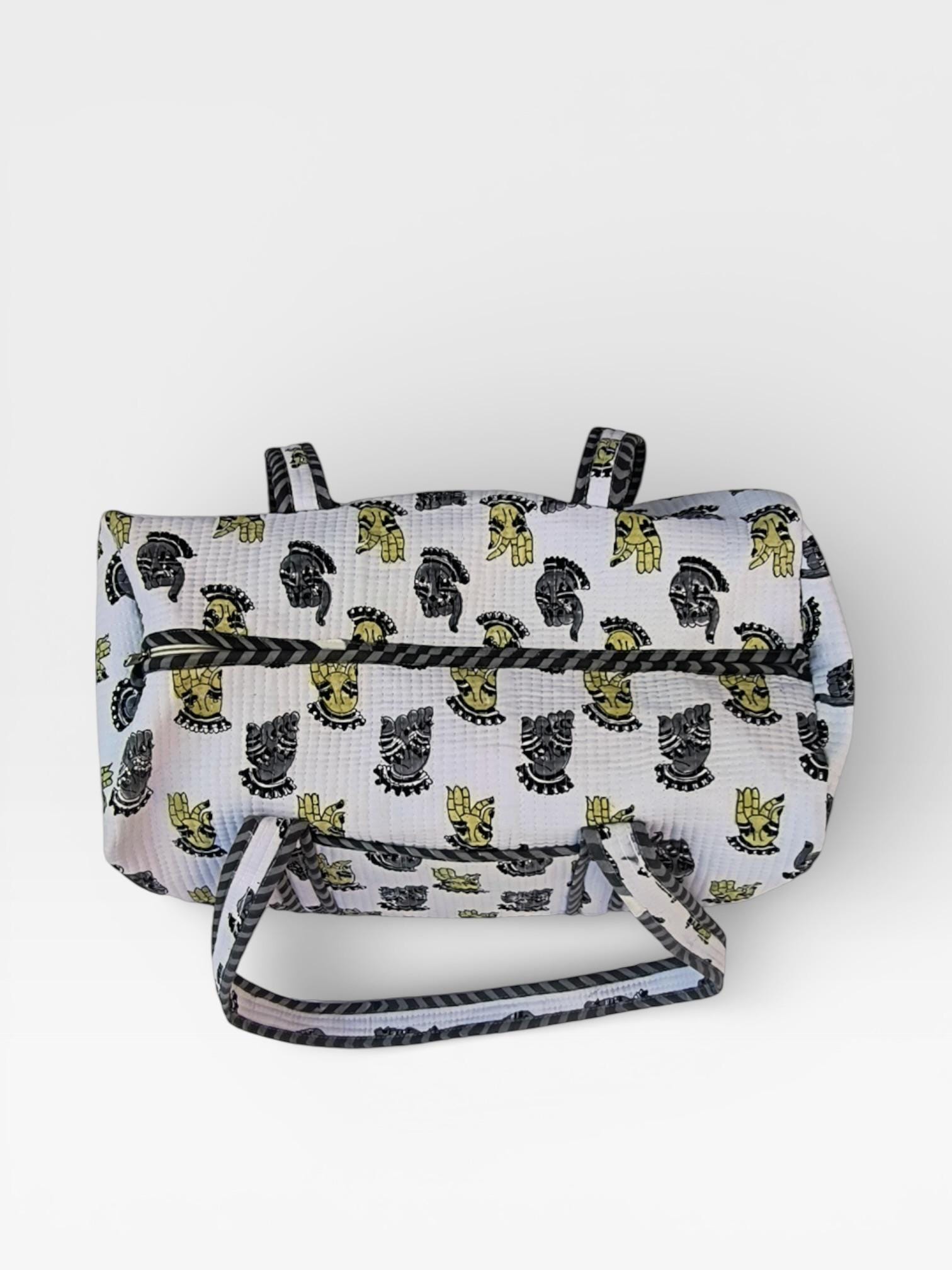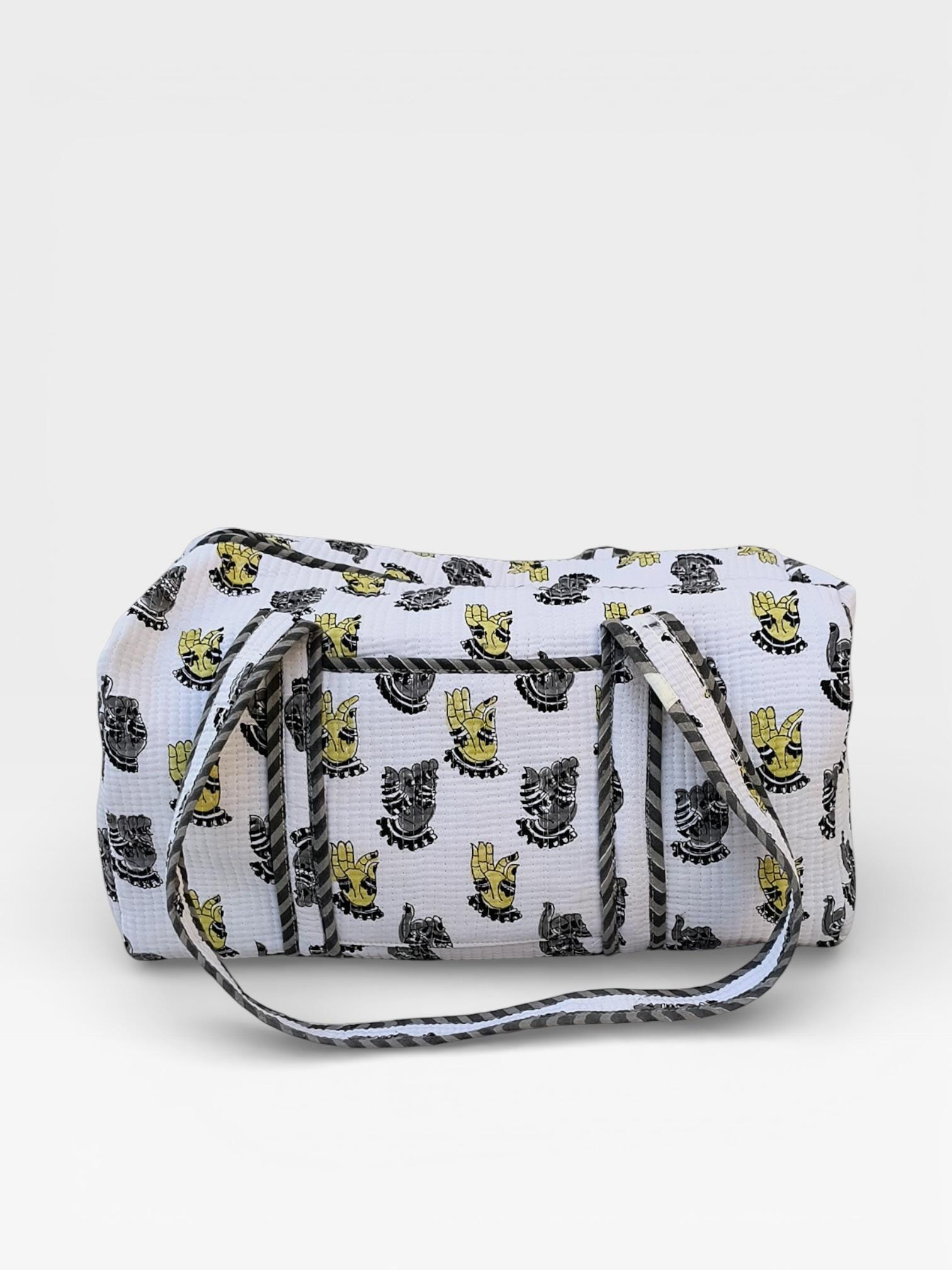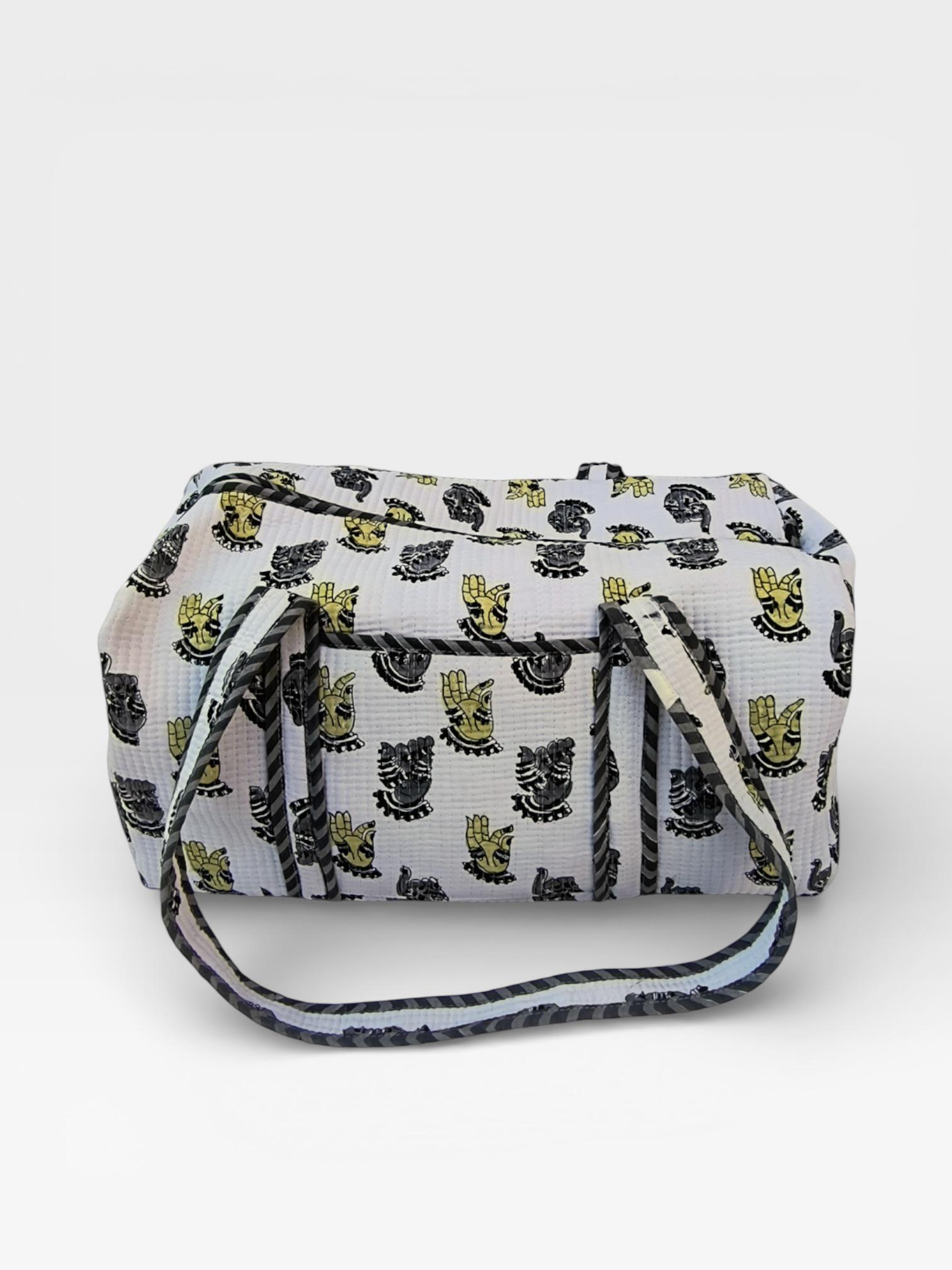 Add a touch of artisanal charm to your travels with this beautifully handcrafted block print duffle bag. Made from soft waffle cotton fabric, this bag features traditional hand block printed motifs in a timeless monochrome and yellow palette, finished with elegant striped piping for a refined look.