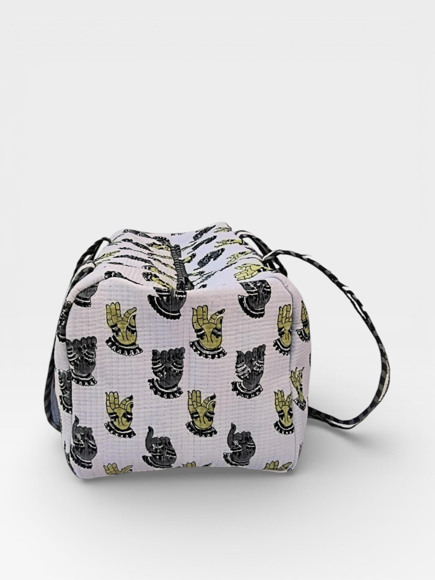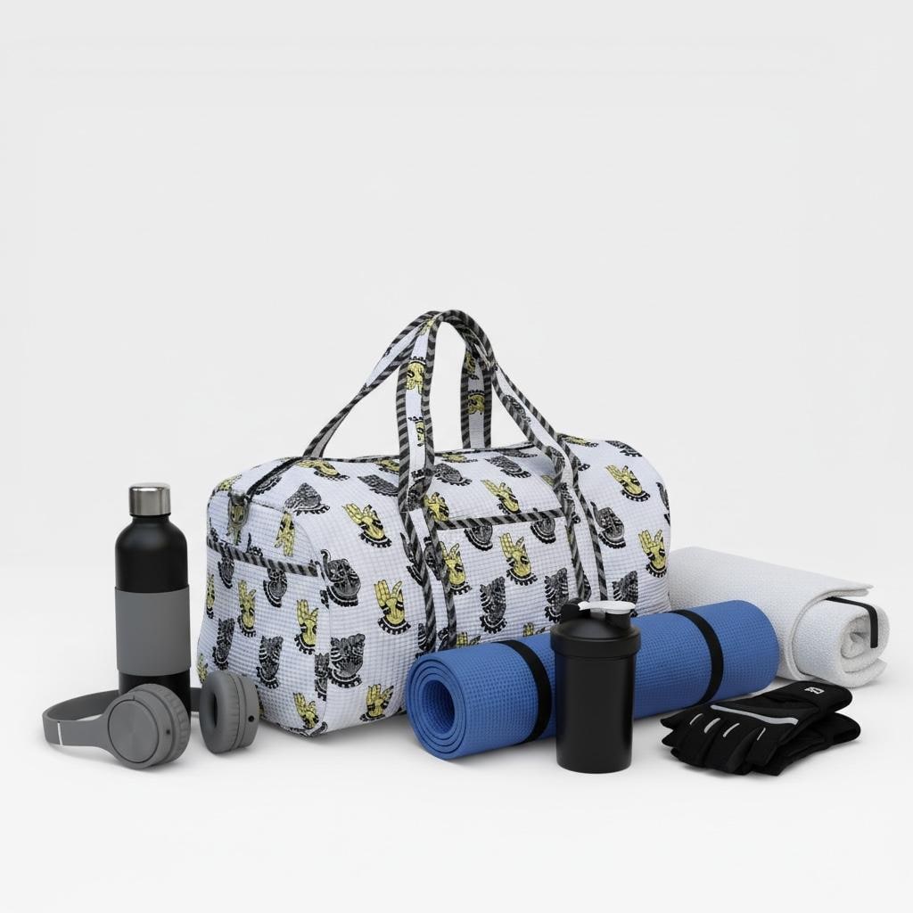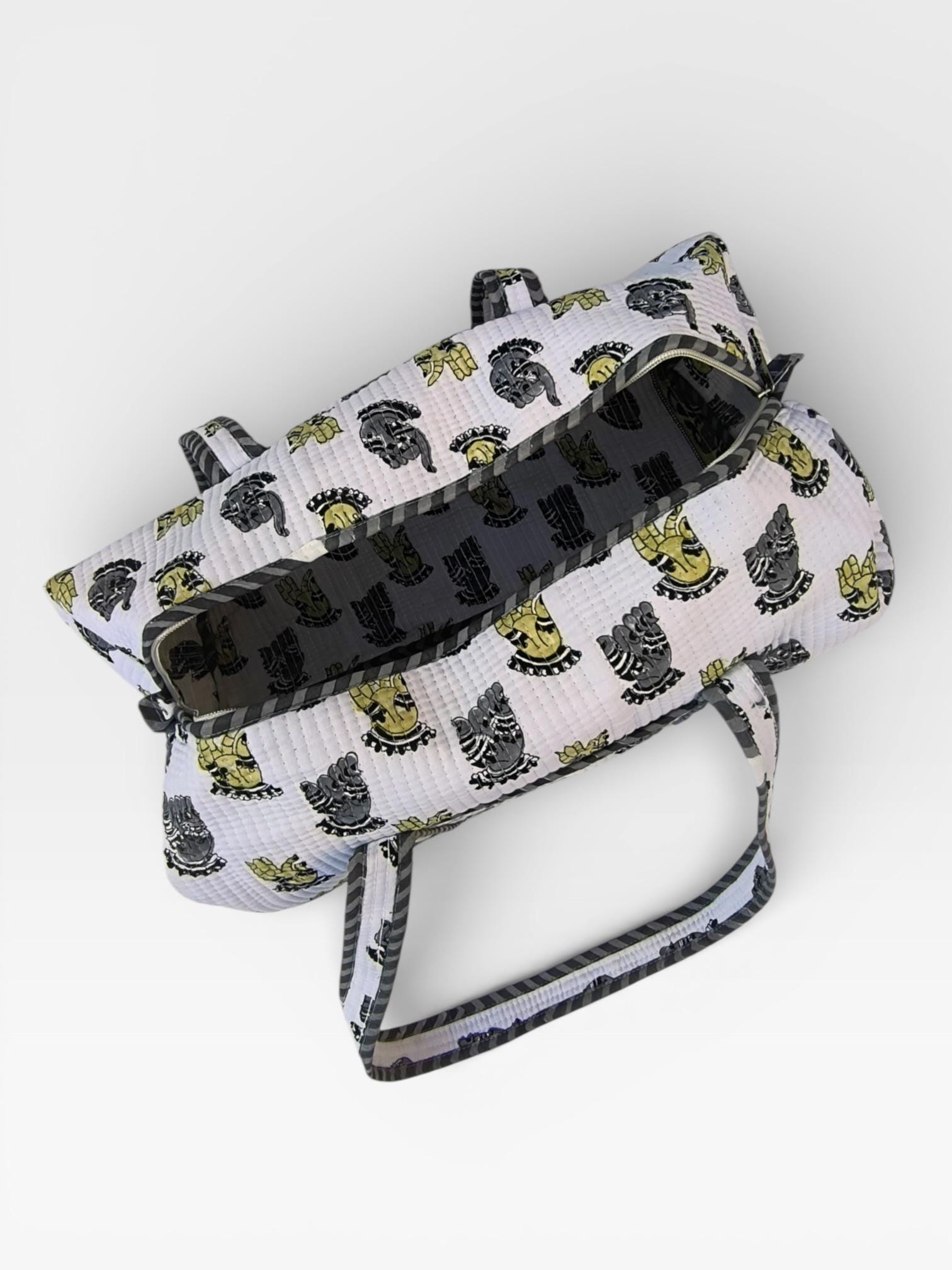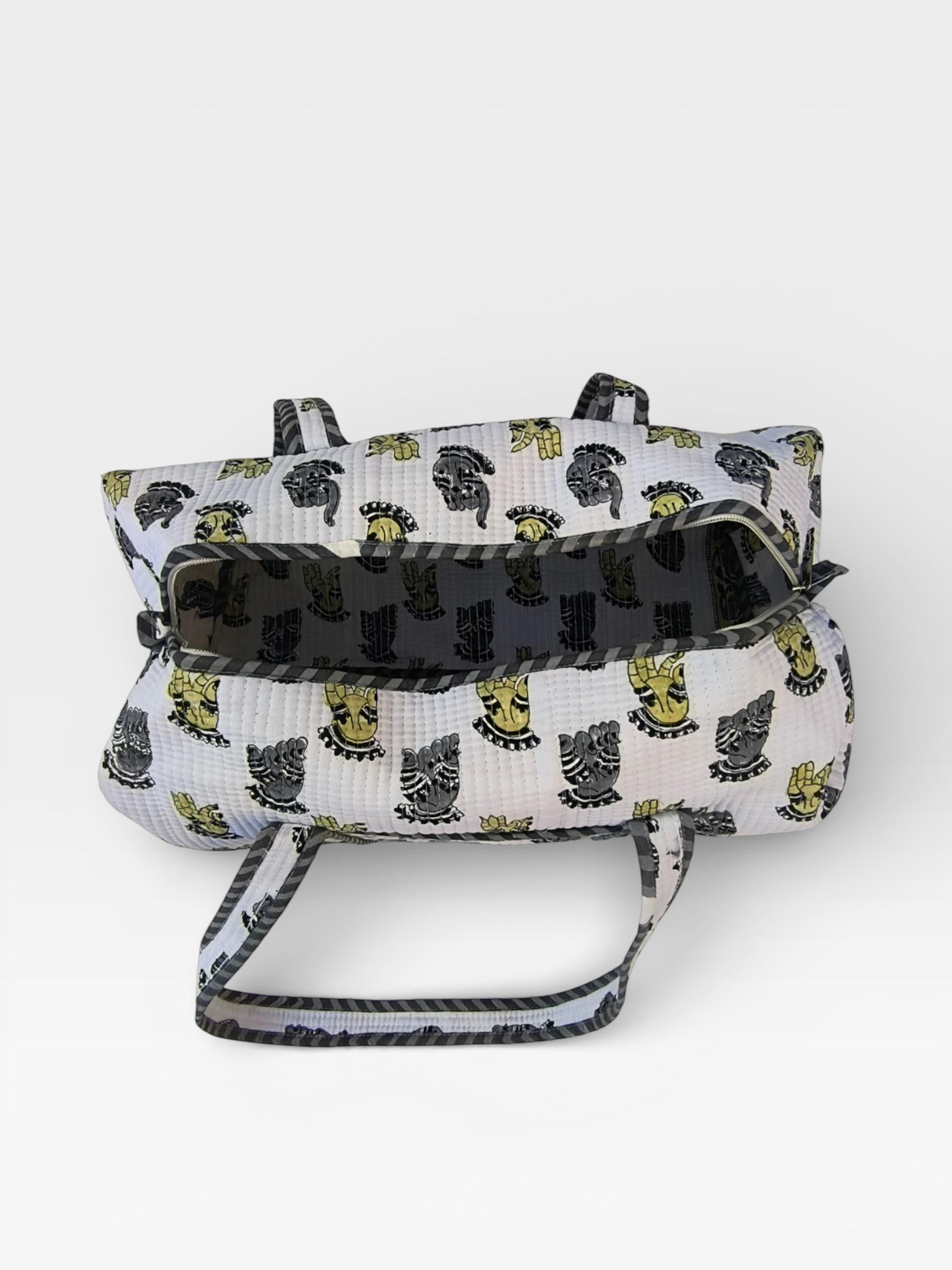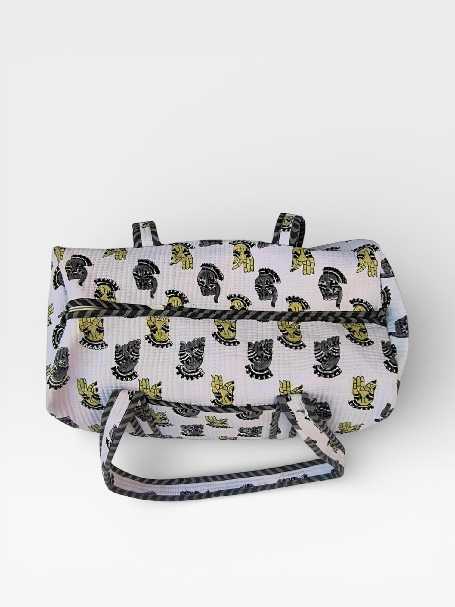 Add a touch of artisanal charm to your travels with this beautifully handcrafted block print duffle bag. Made from soft waffle cotton fabric, this bag features traditional hand block printed motifs in a timeless monochrome and yellow palette, finished with elegant striped piping for a refined look.