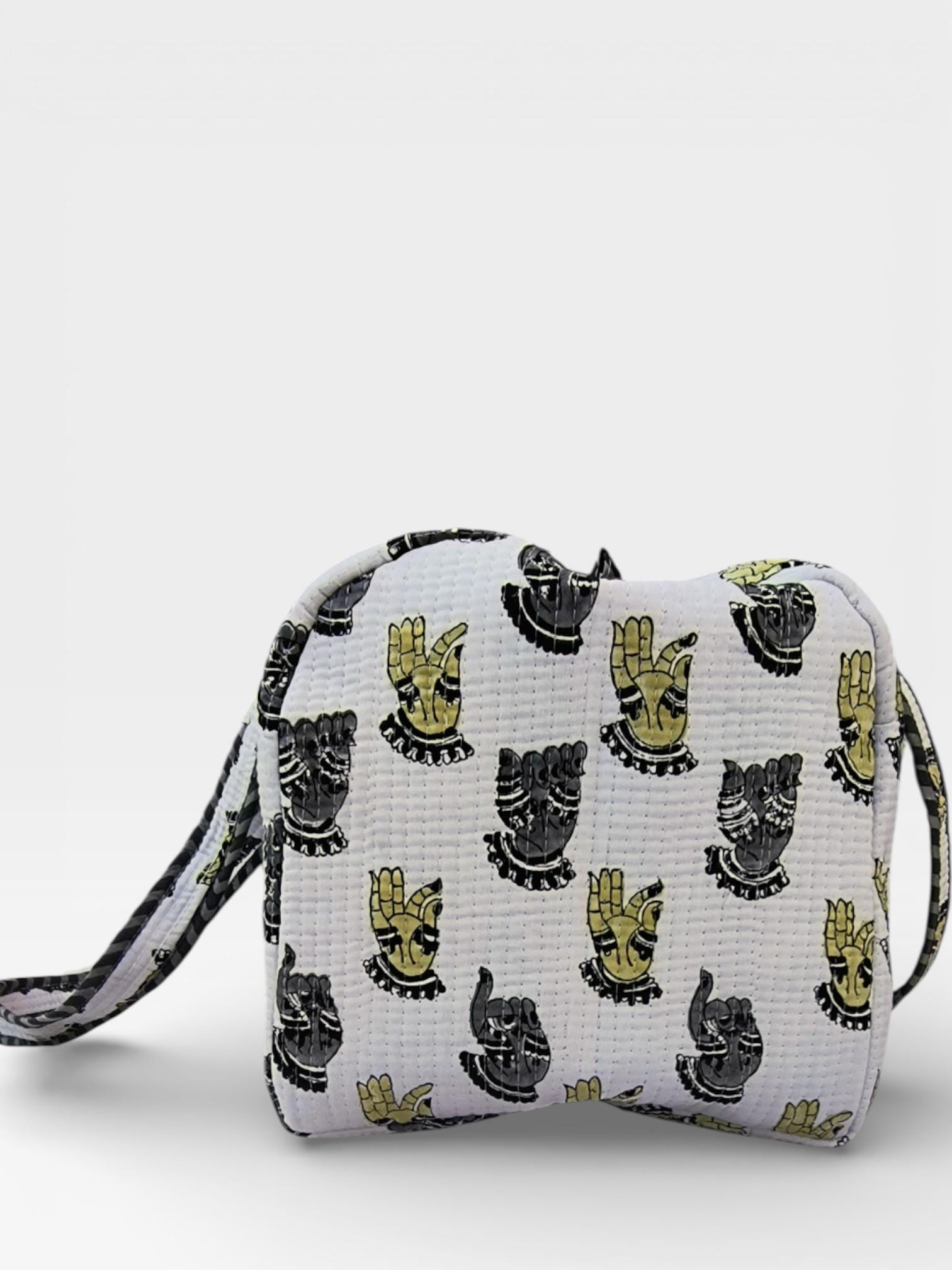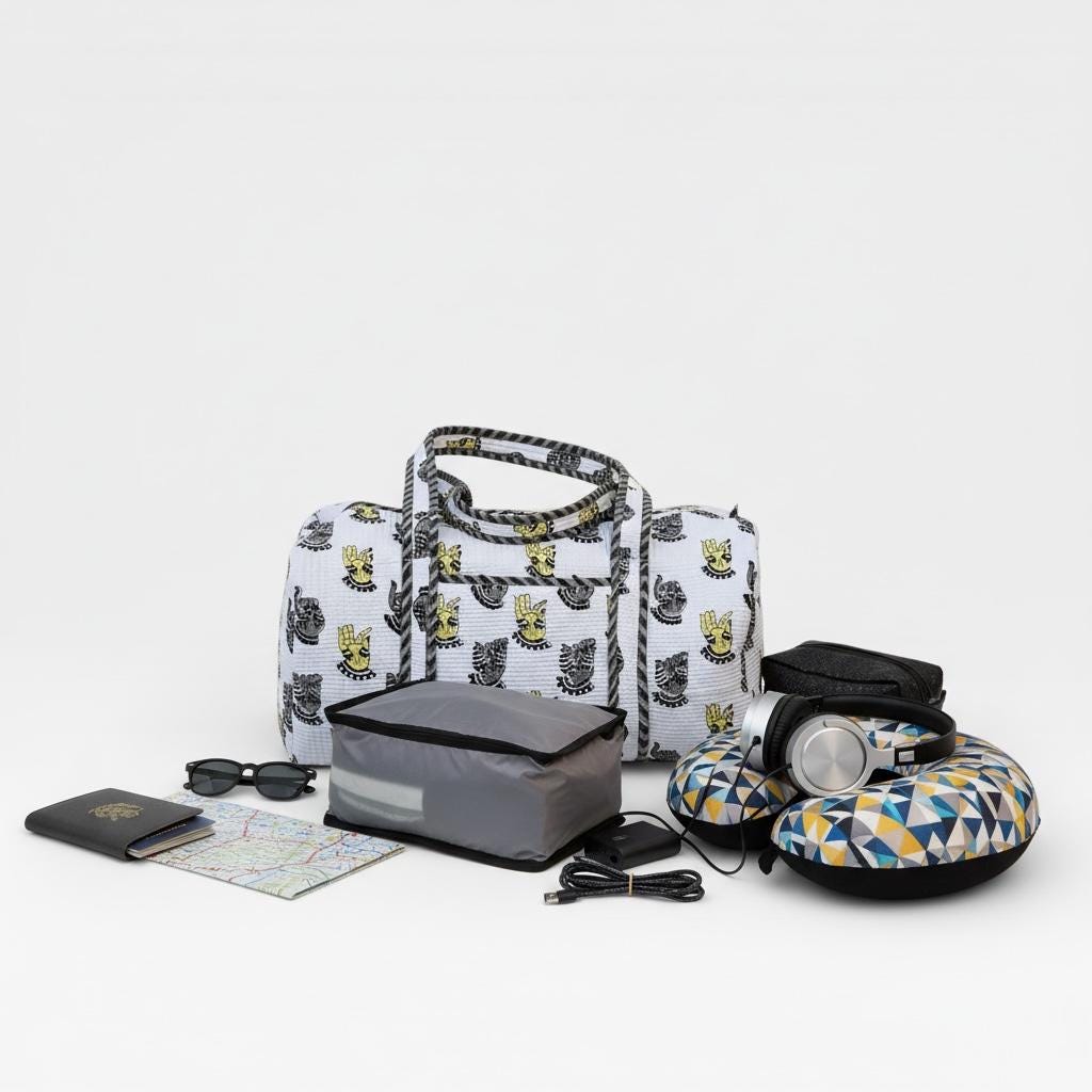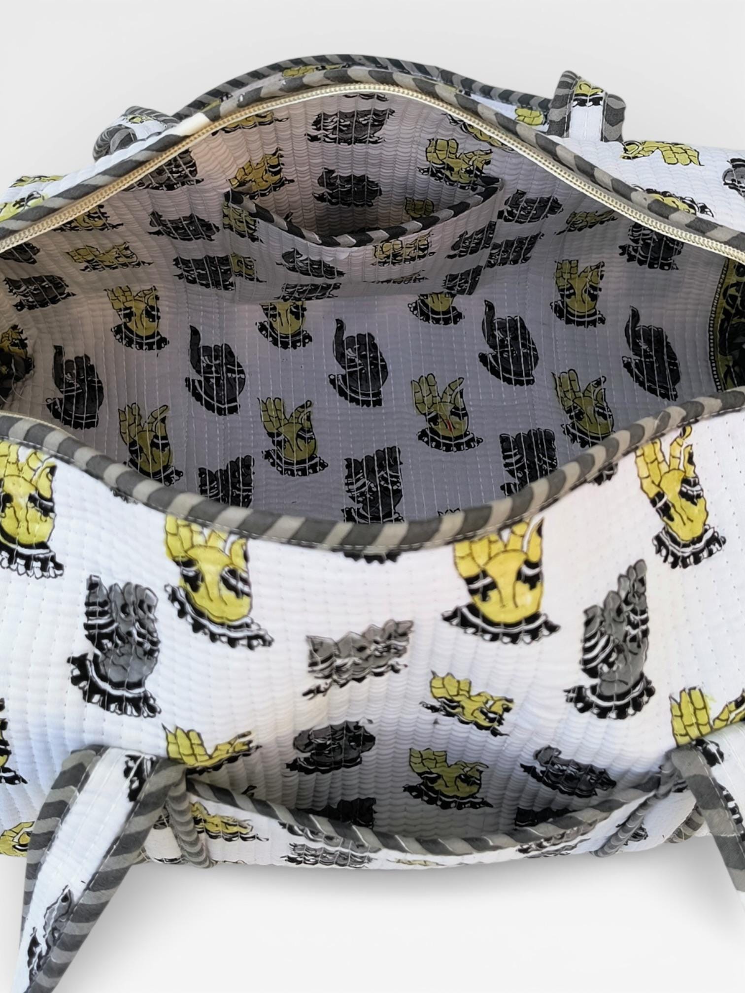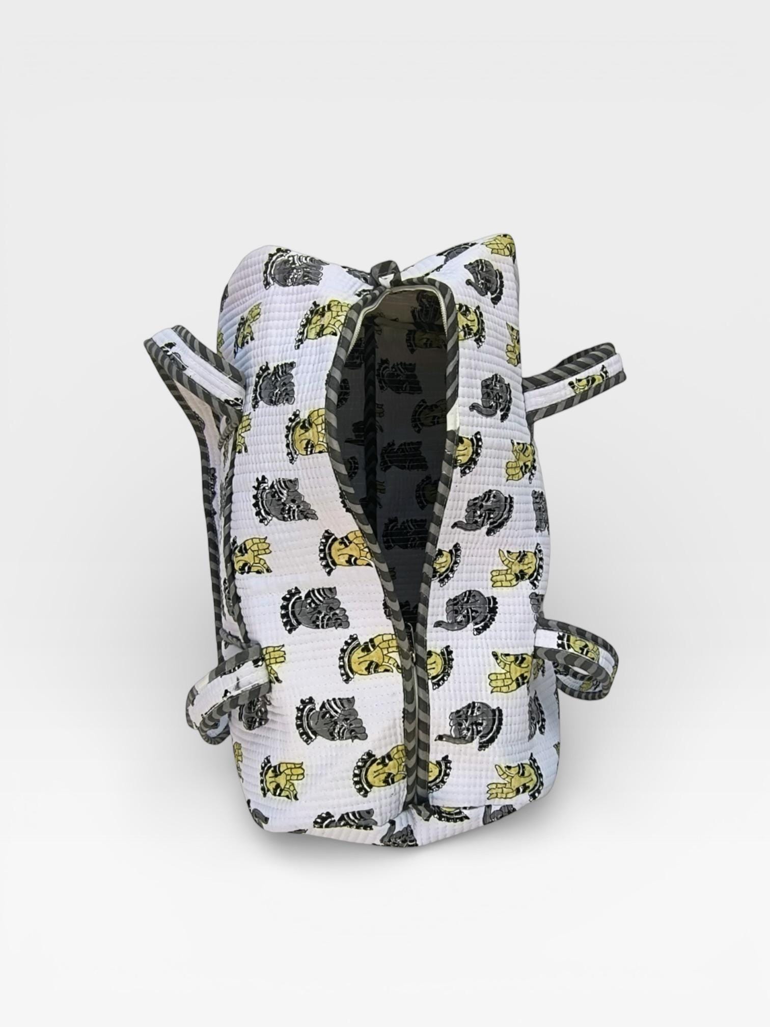 Add a touch of artisanal charm to your travels with this beautifully handcrafted block print duffle bag. Made from soft waffle cotton fabric, this bag features traditional hand block printed motifs in a timeless monochrome and yellow palette, finished with elegant striped piping for a refined look.