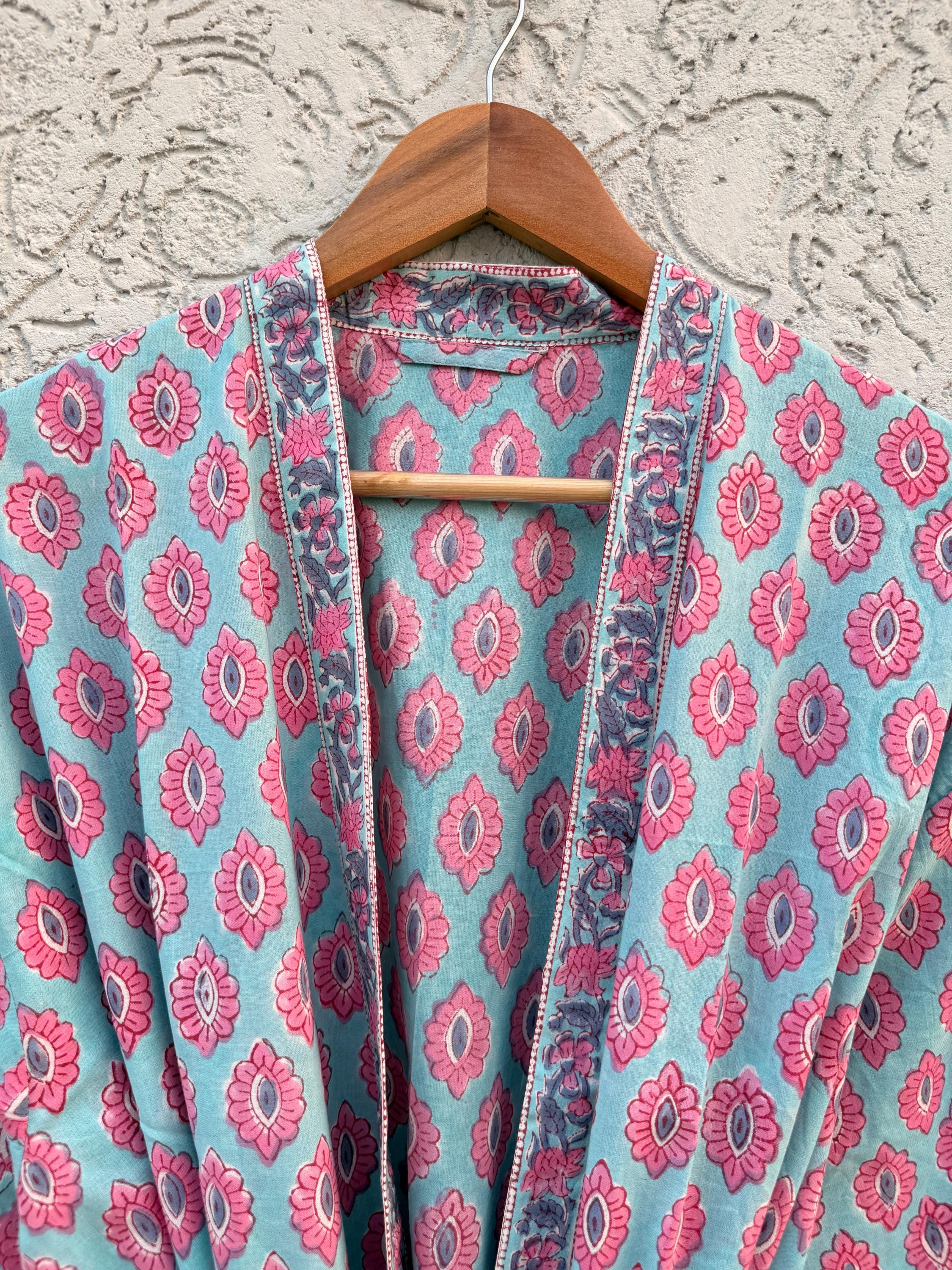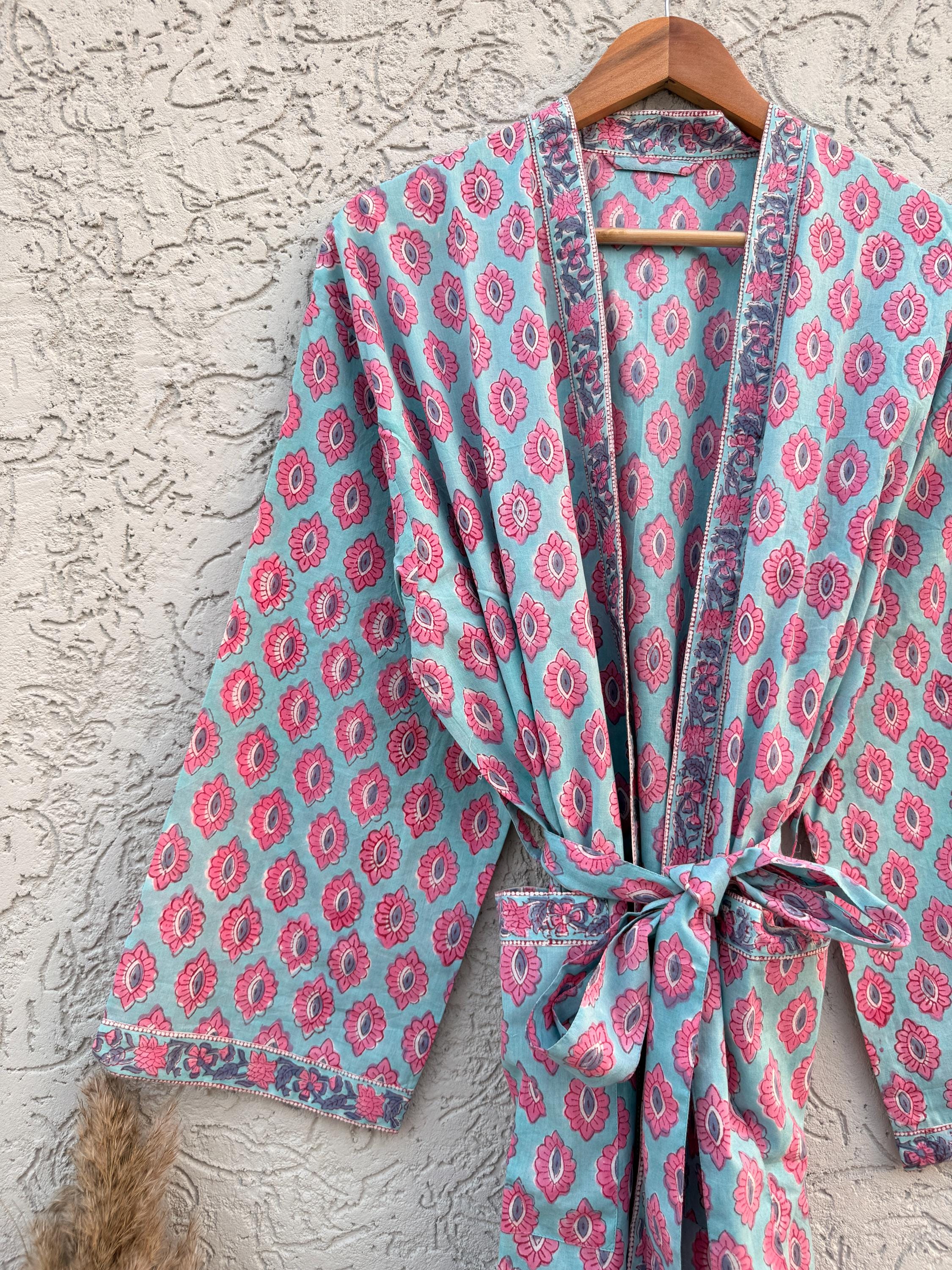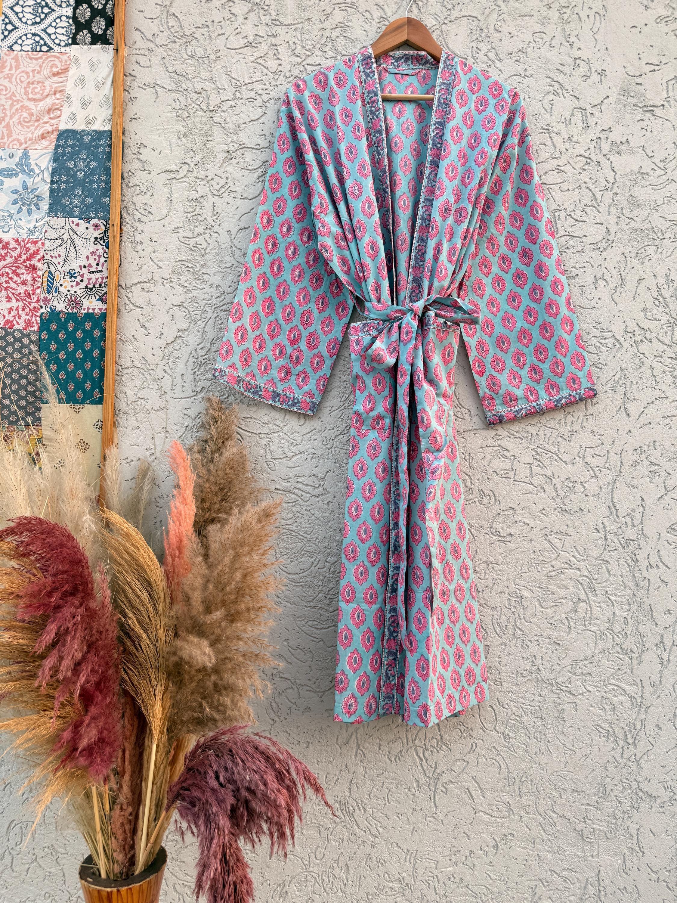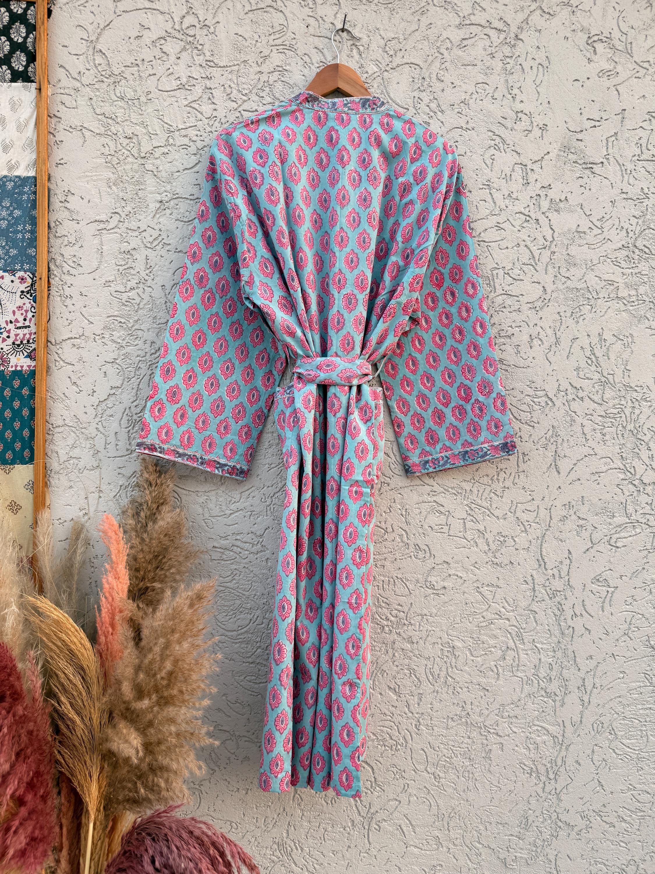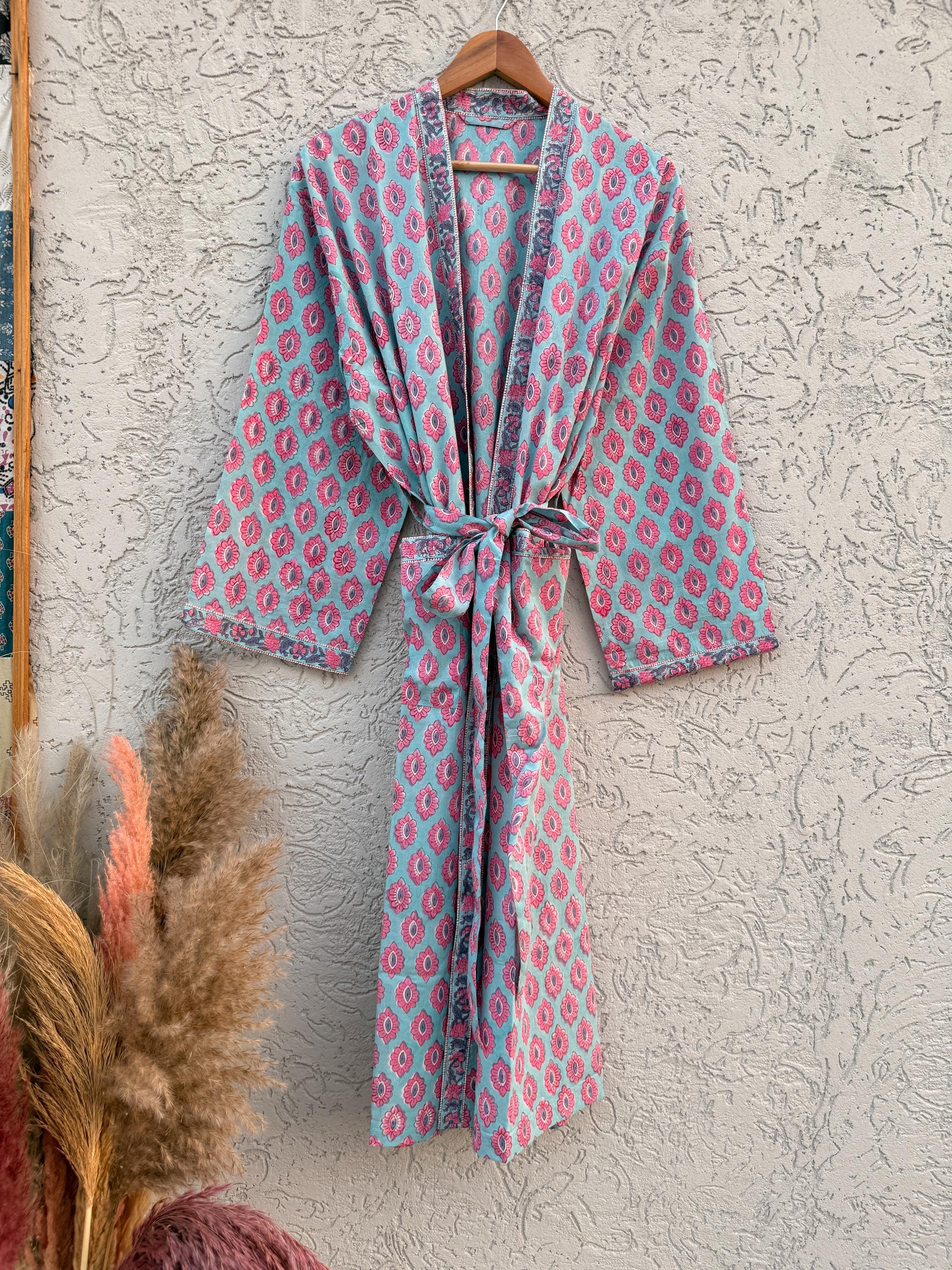 Hand Block Print Cotton Bathrobe – Soft Lightweight Kimono Robe – Floral Blockprint Dressing Gown – Handmade Indian Robe – Bridesmaid Gift