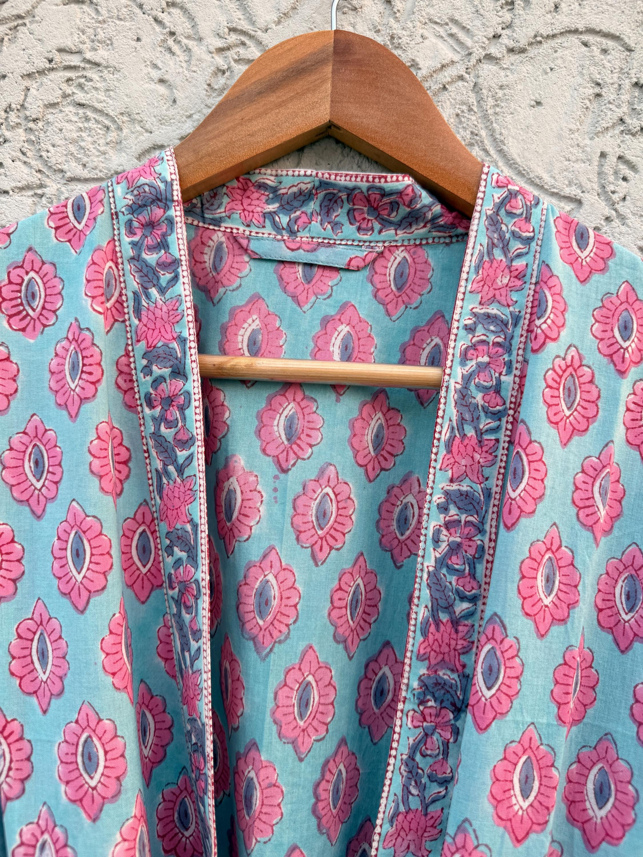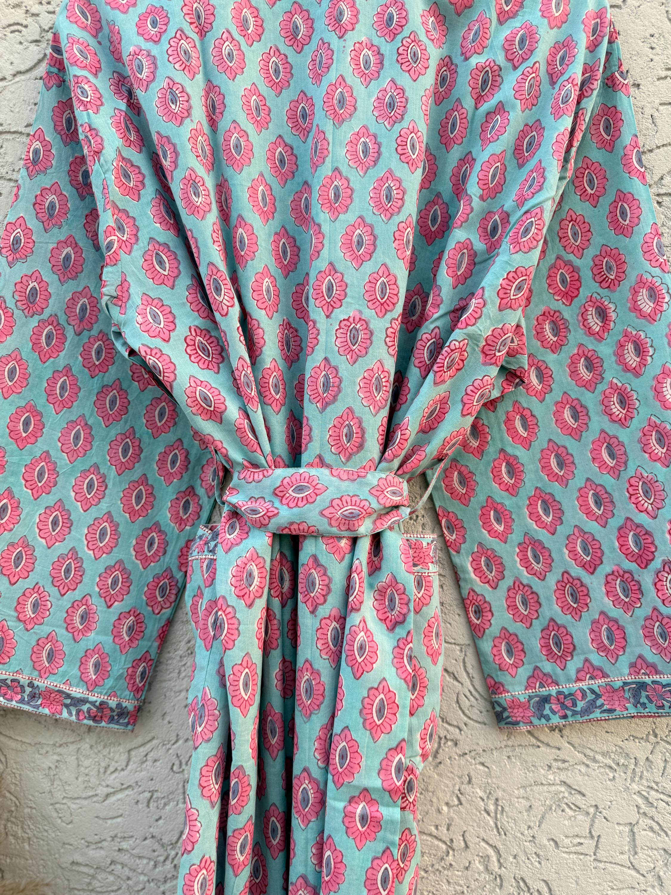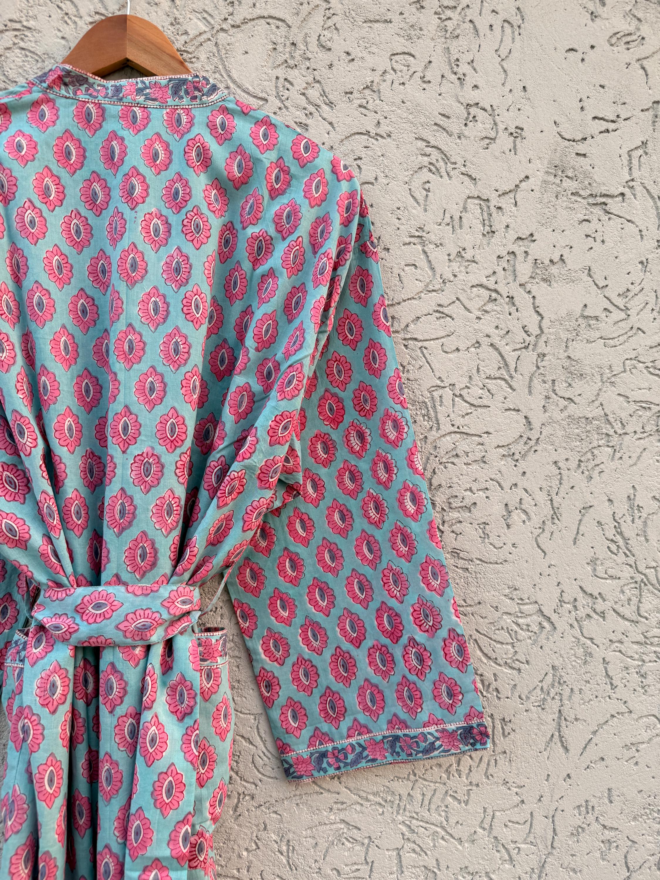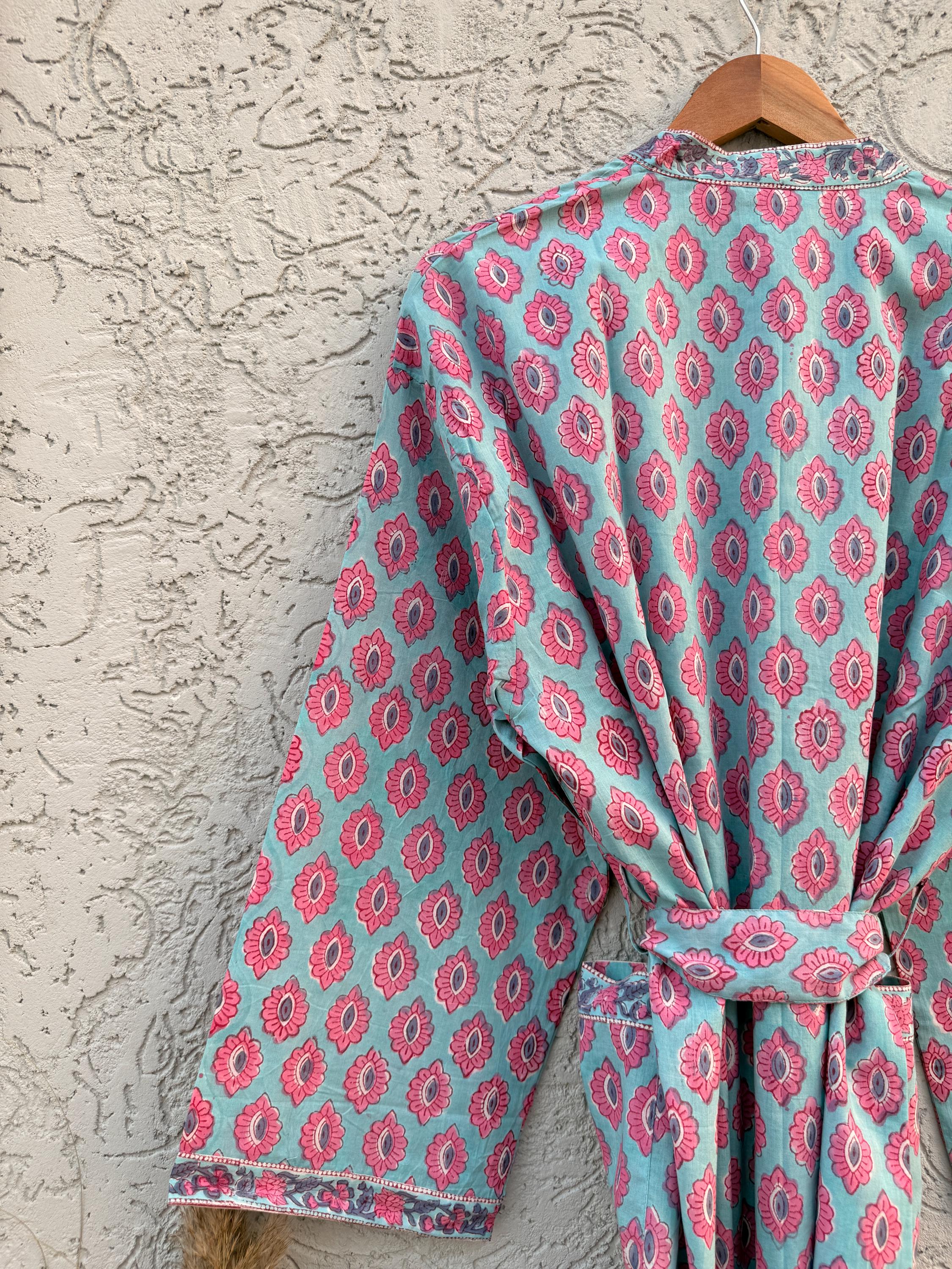 Hand Block Print Cotton Bathrobe – Soft Lightweight Kimono Robe – Floral Blockprint Dressing Gown – Handmade Indian Robe – Bridesmaid Gift