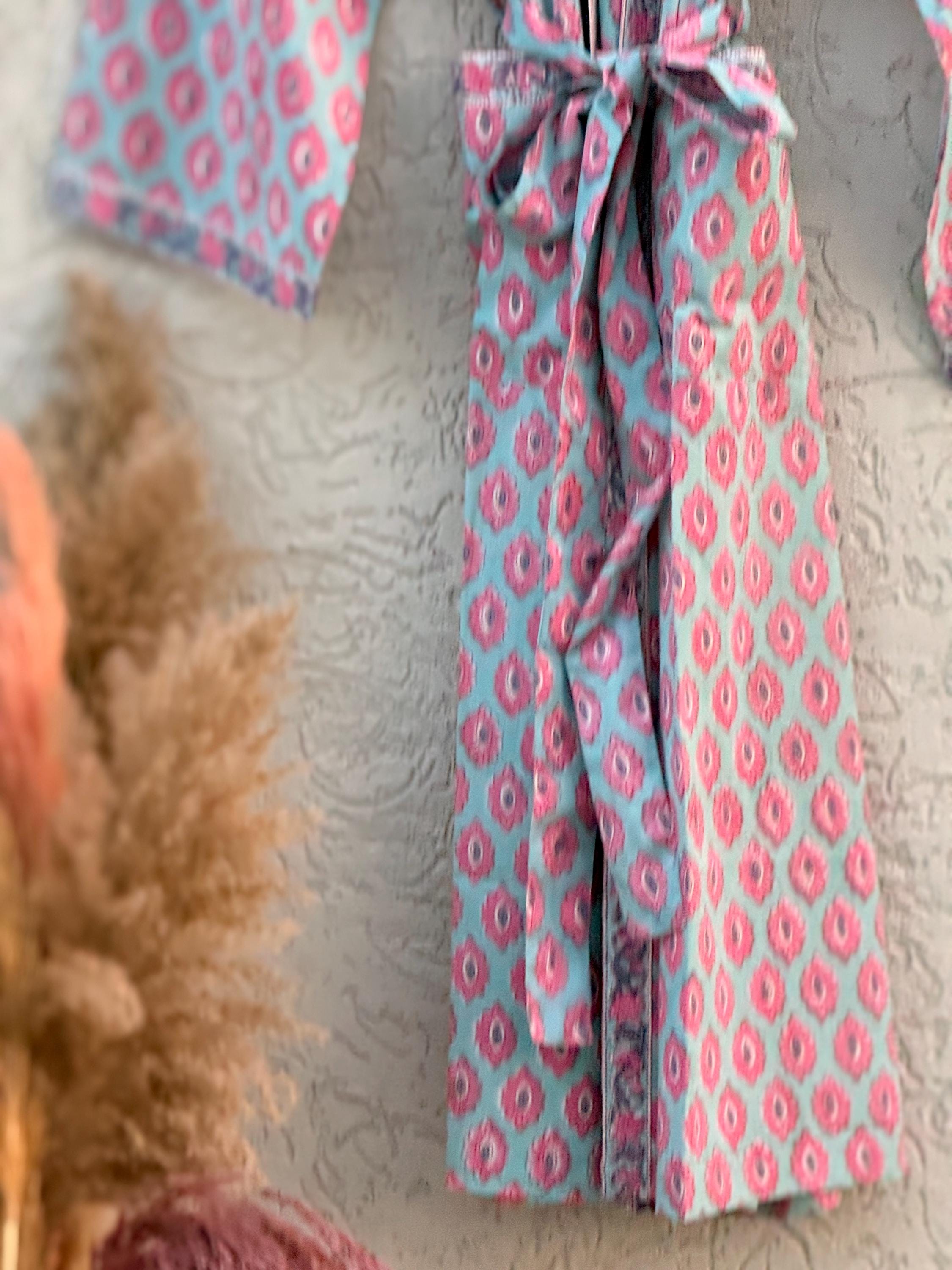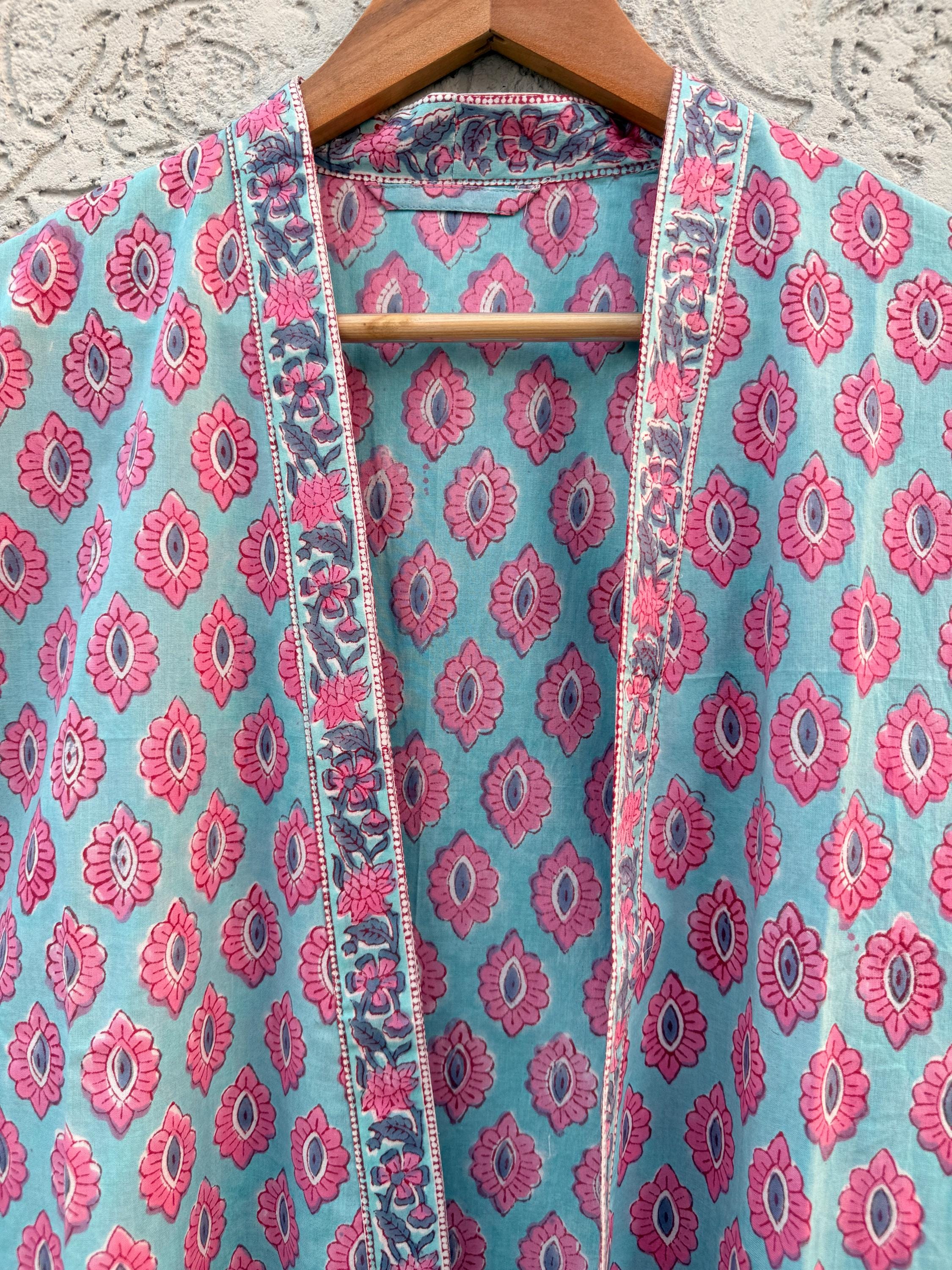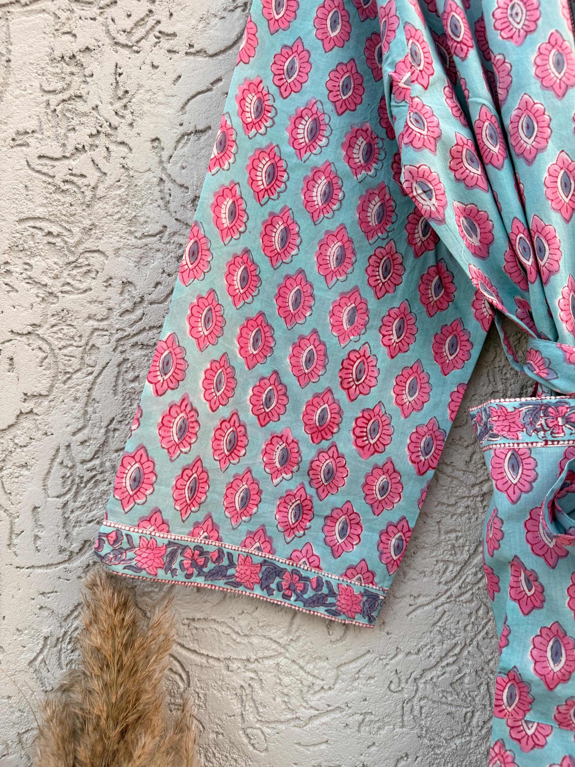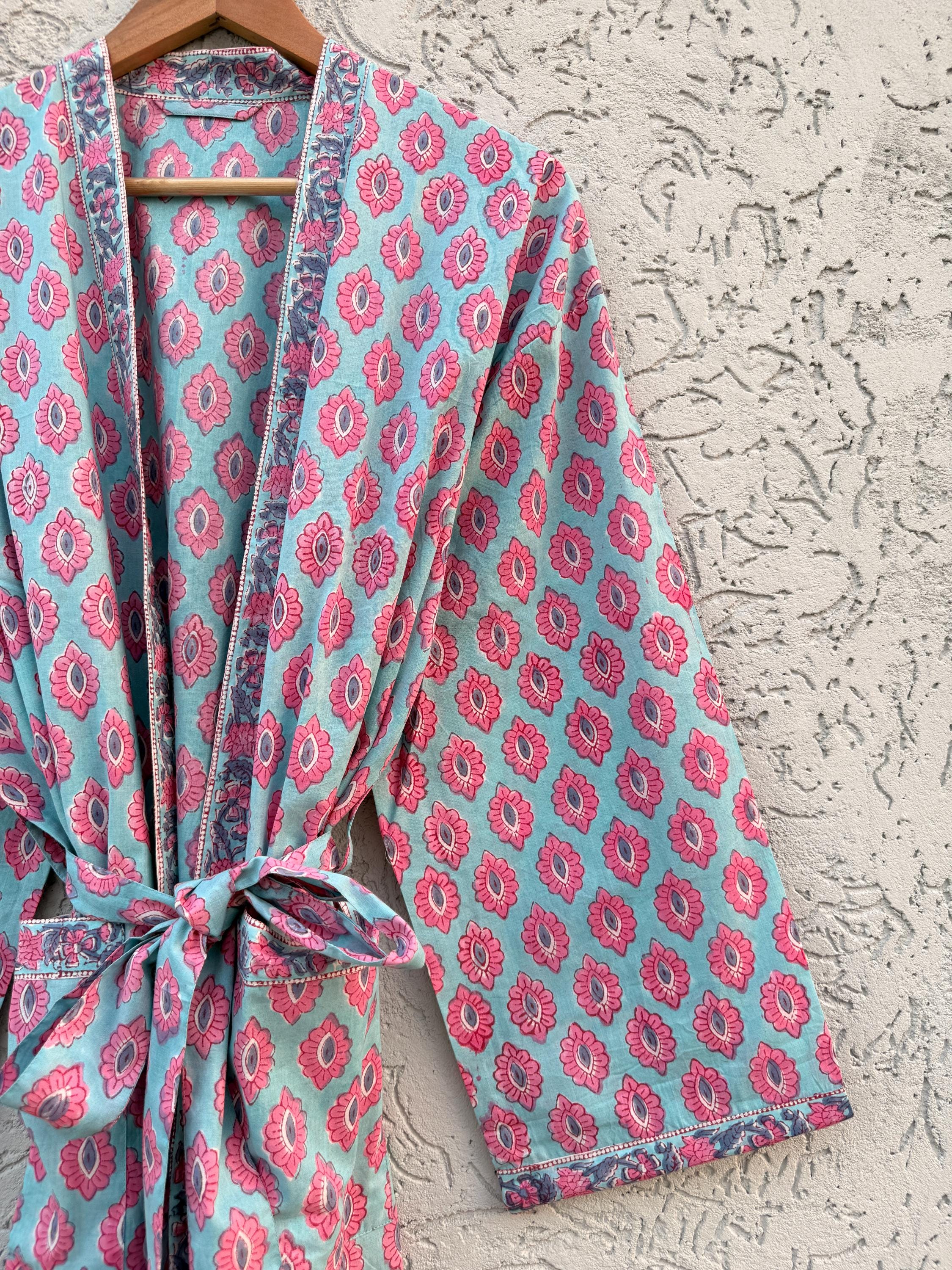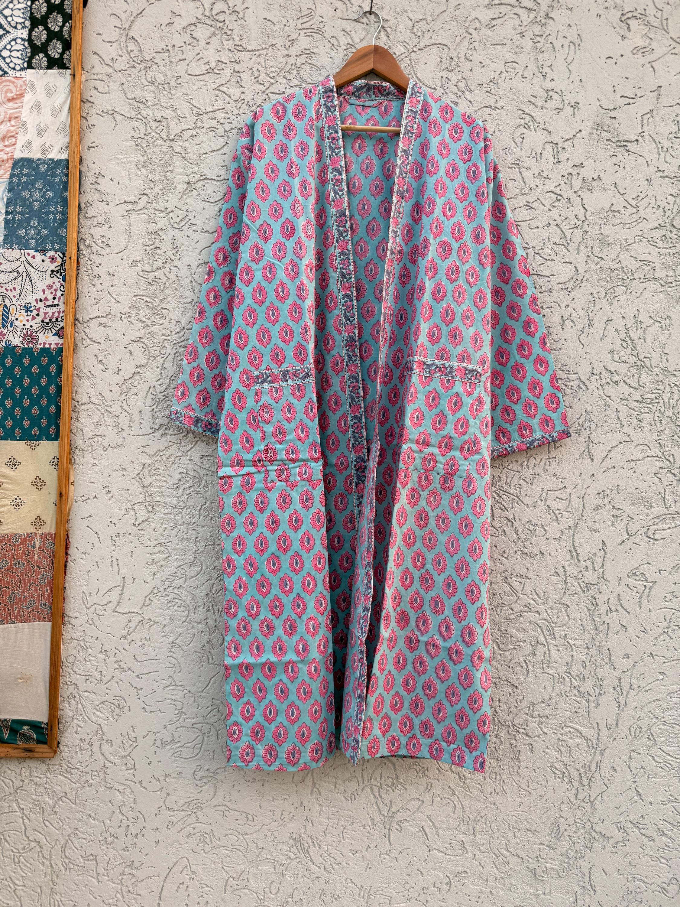 Hand Block Print Cotton Bathrobe – Soft Lightweight Kimono Robe – Floral Blockprint Dressing Gown – Handmade Indian Robe – Bridesmaid Gift