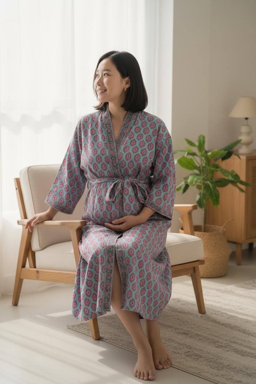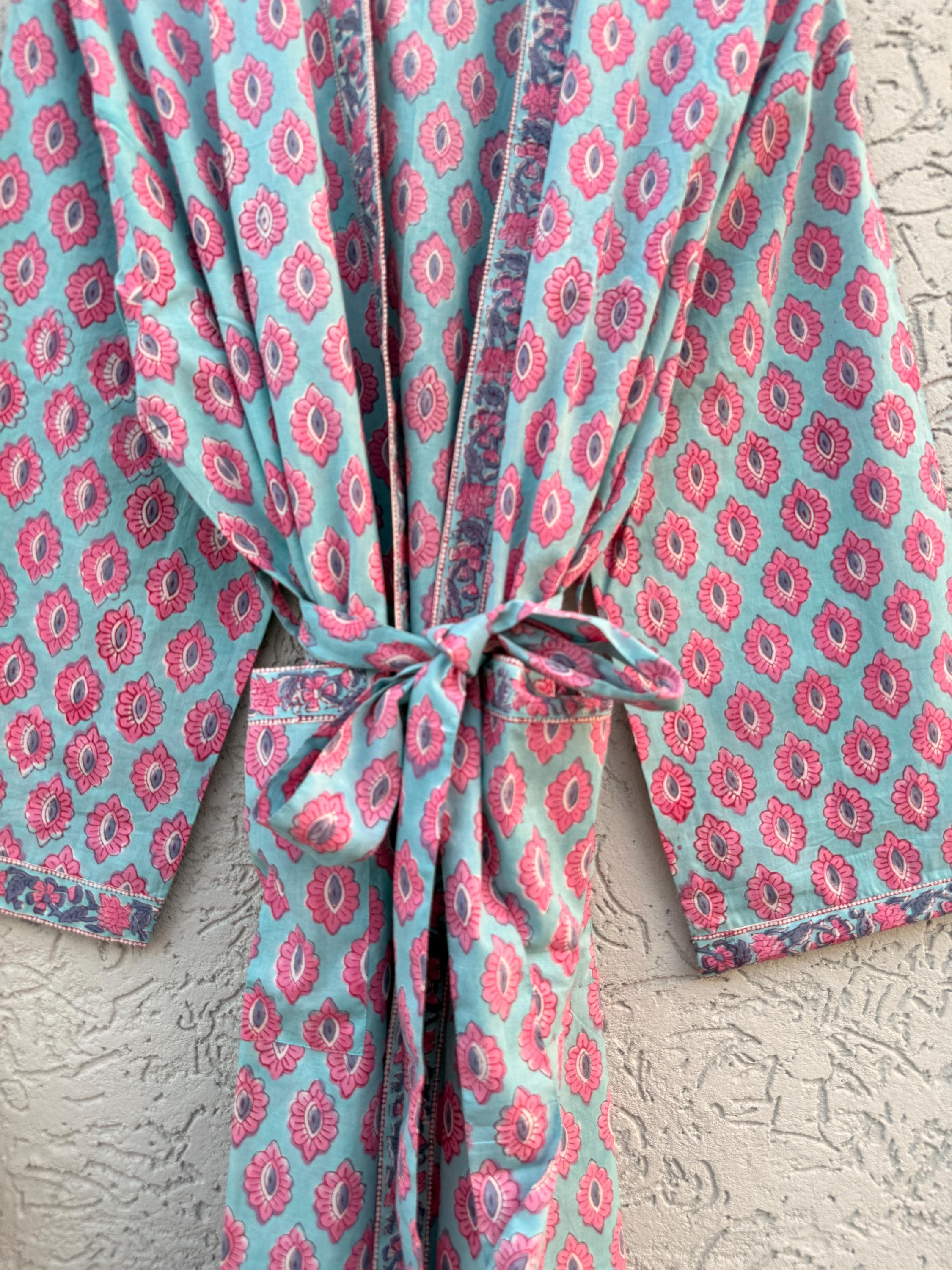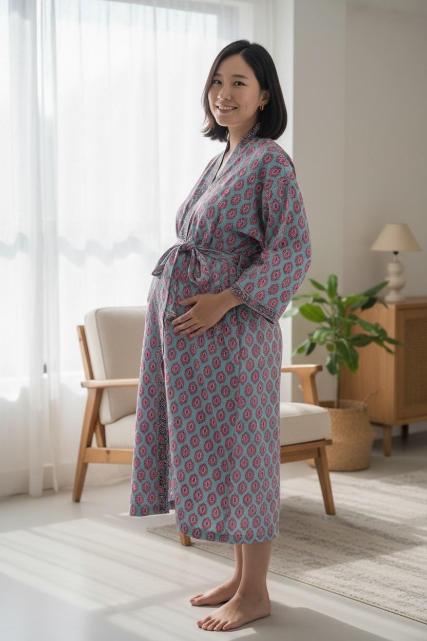 Each piece is carefully handmade using traditional block printing techniques, giving every robe a unique charm and artisanal touch. The elegant floral pattern and soothing colors create a stylish yet relaxed look you’ll love wearing every day.