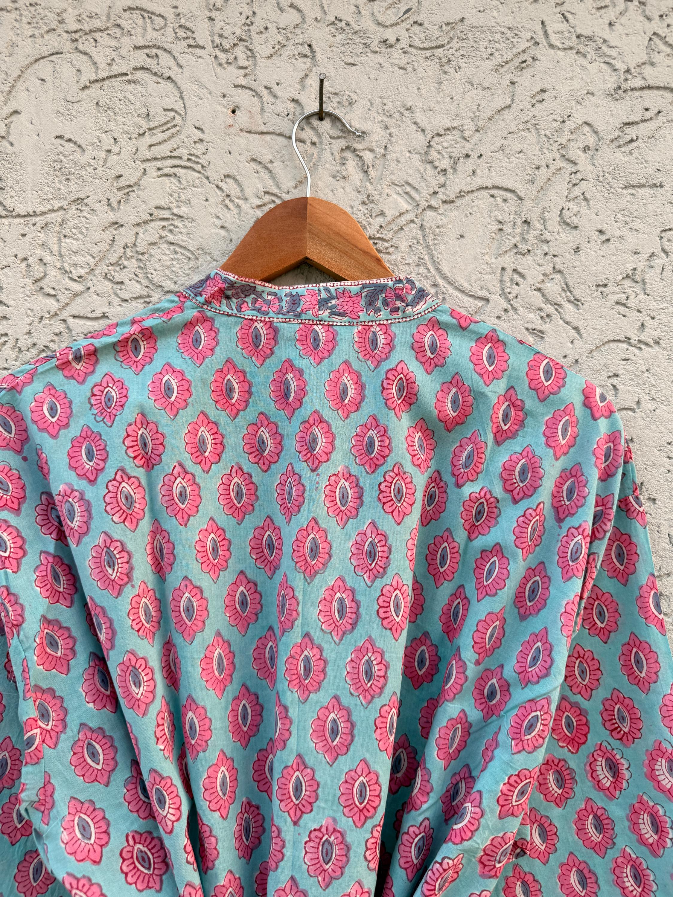 This robe celebrates the rich textile heritage of Sanganer, near Jaipur. Artisans carve intricate designs into teak wood blocks and stamp them by hand onto cotton fabric using traditional dyes.
