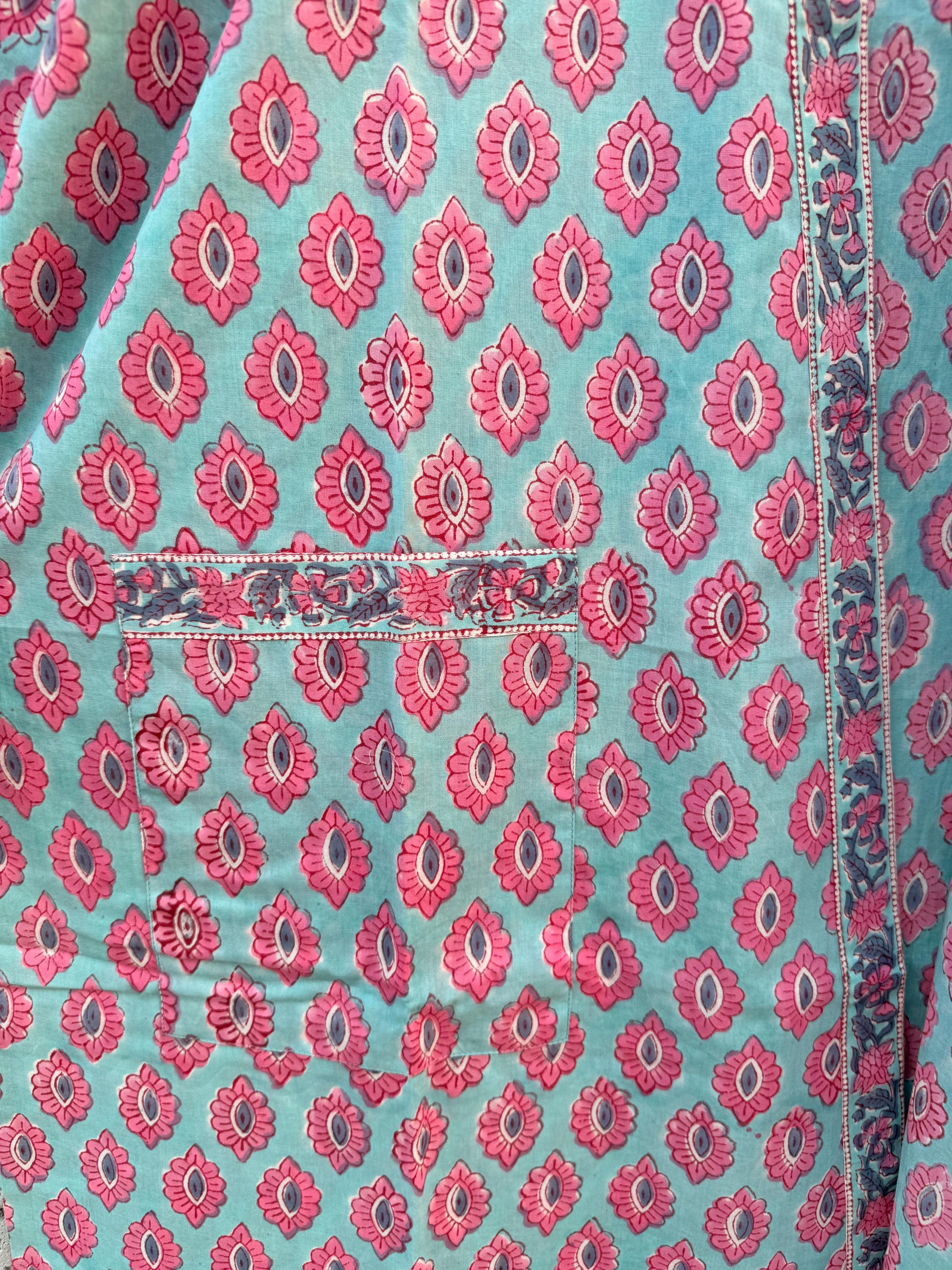 Handcrafted in Jaipur, Rajasthan, each kaftan is made by skilled artisans. Subtle variations in print and color are a natural part of the hand block printing process and make every piece uniquely special.