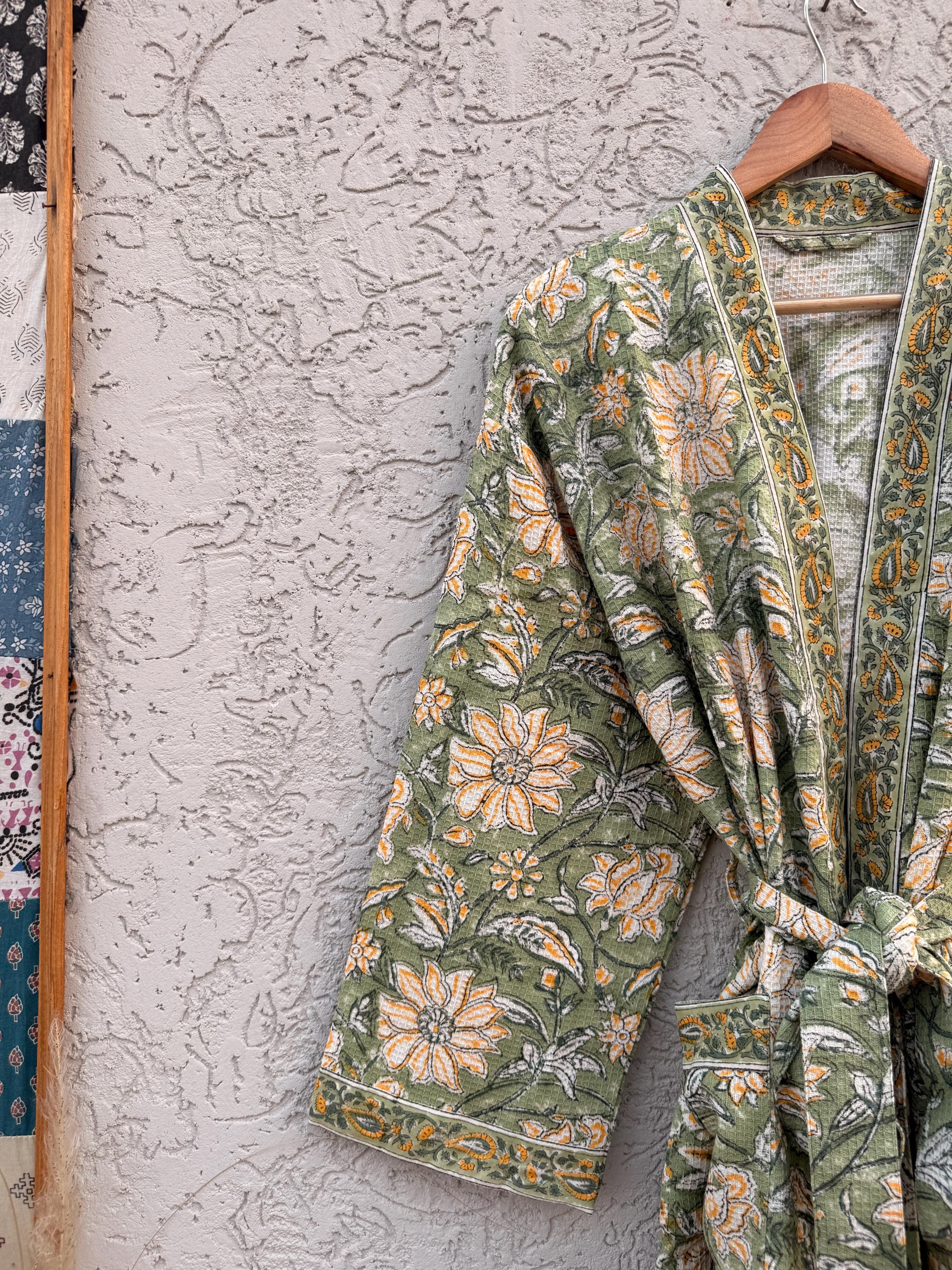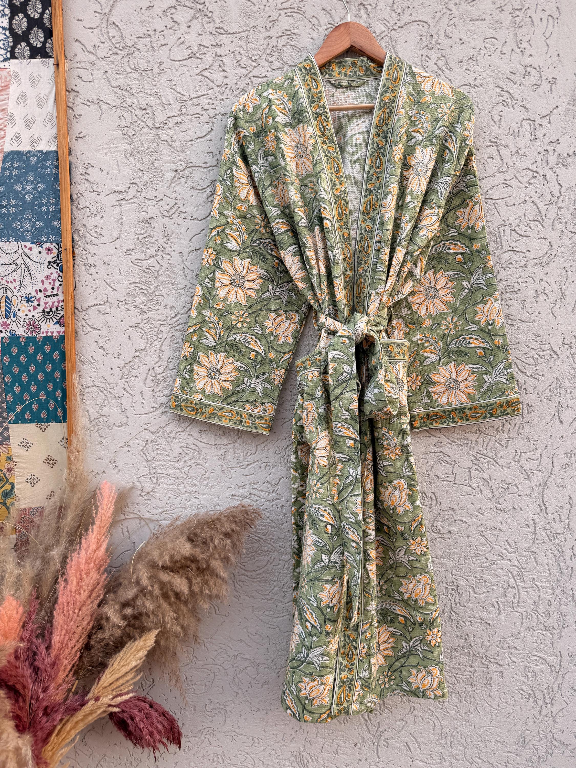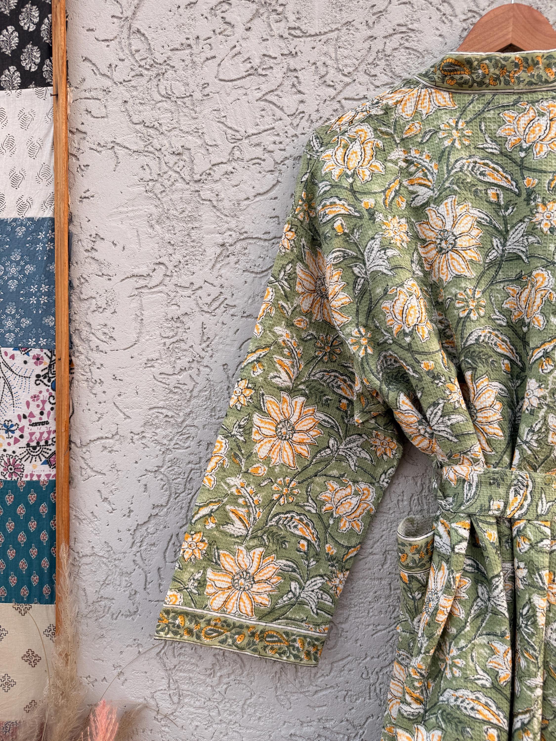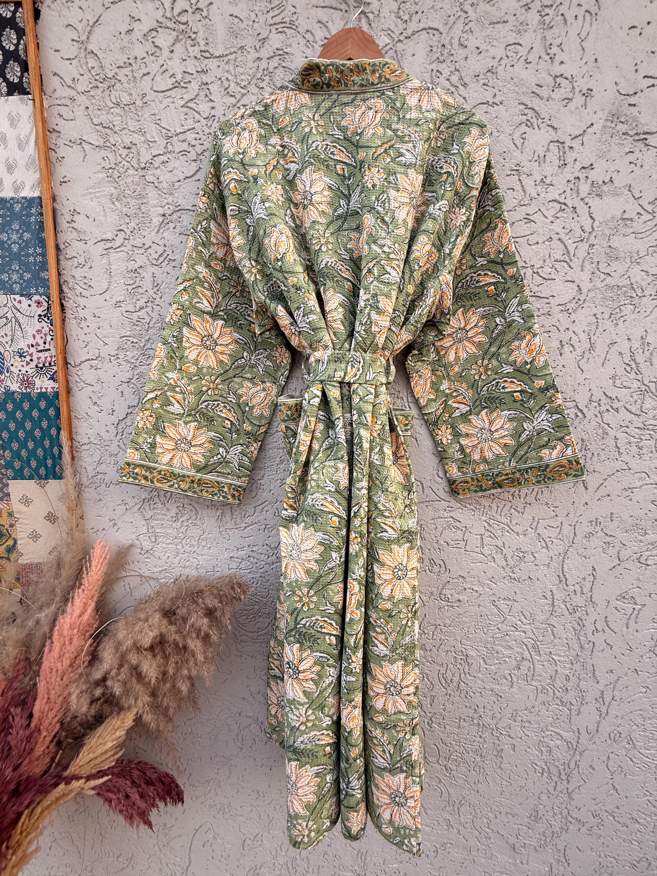 Green Floral Block Print Waffle Cotton Bathrobe – Handmade Jaipuri Kimono Robe – Lightweight Spa & Lounge Wear – Bridesmaid Gift for Women