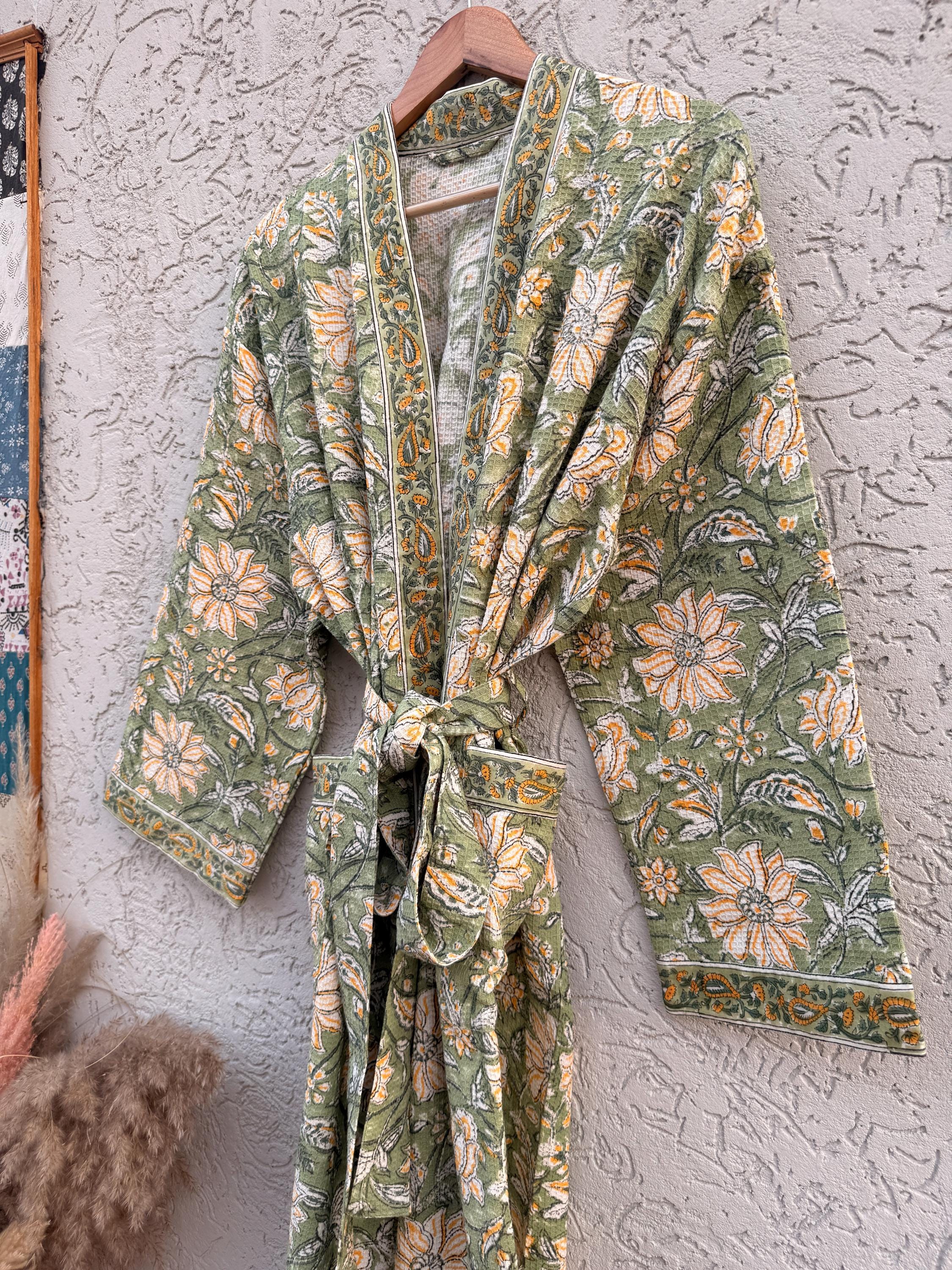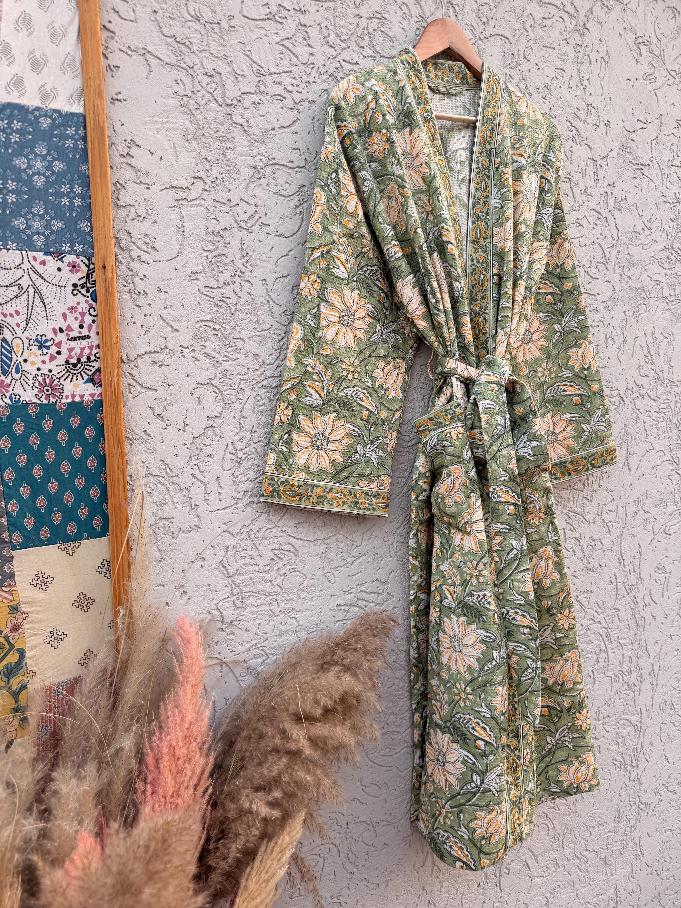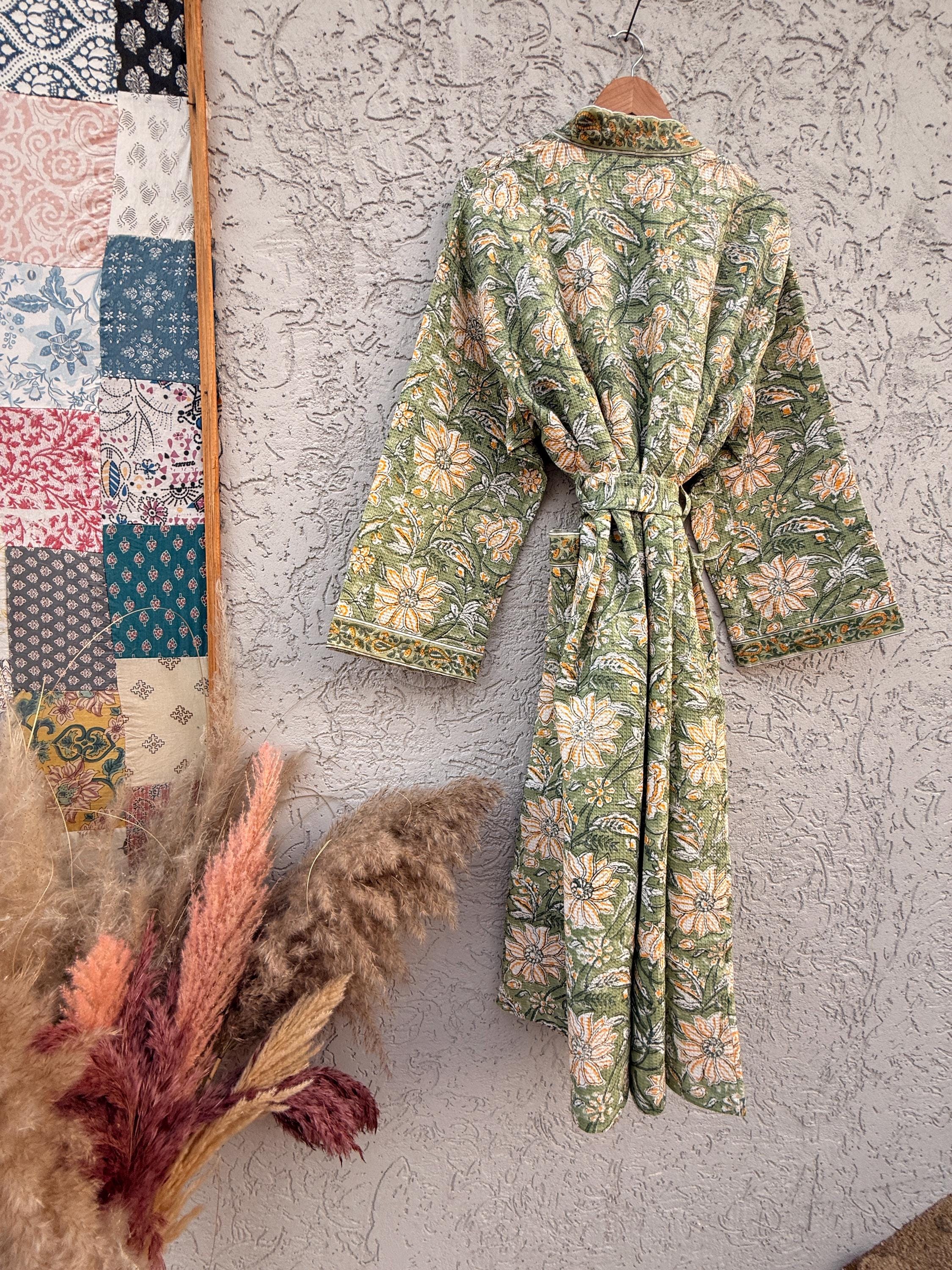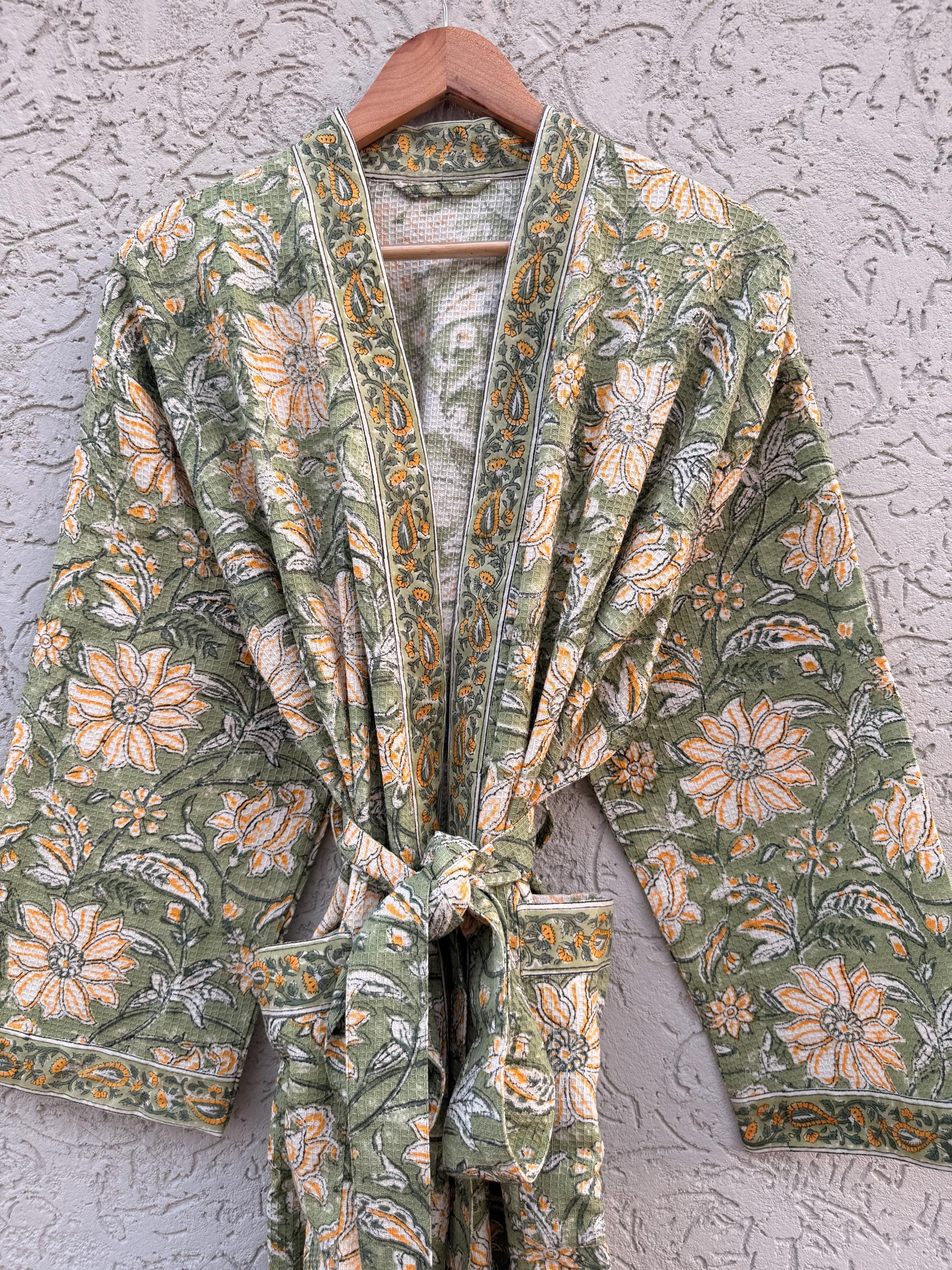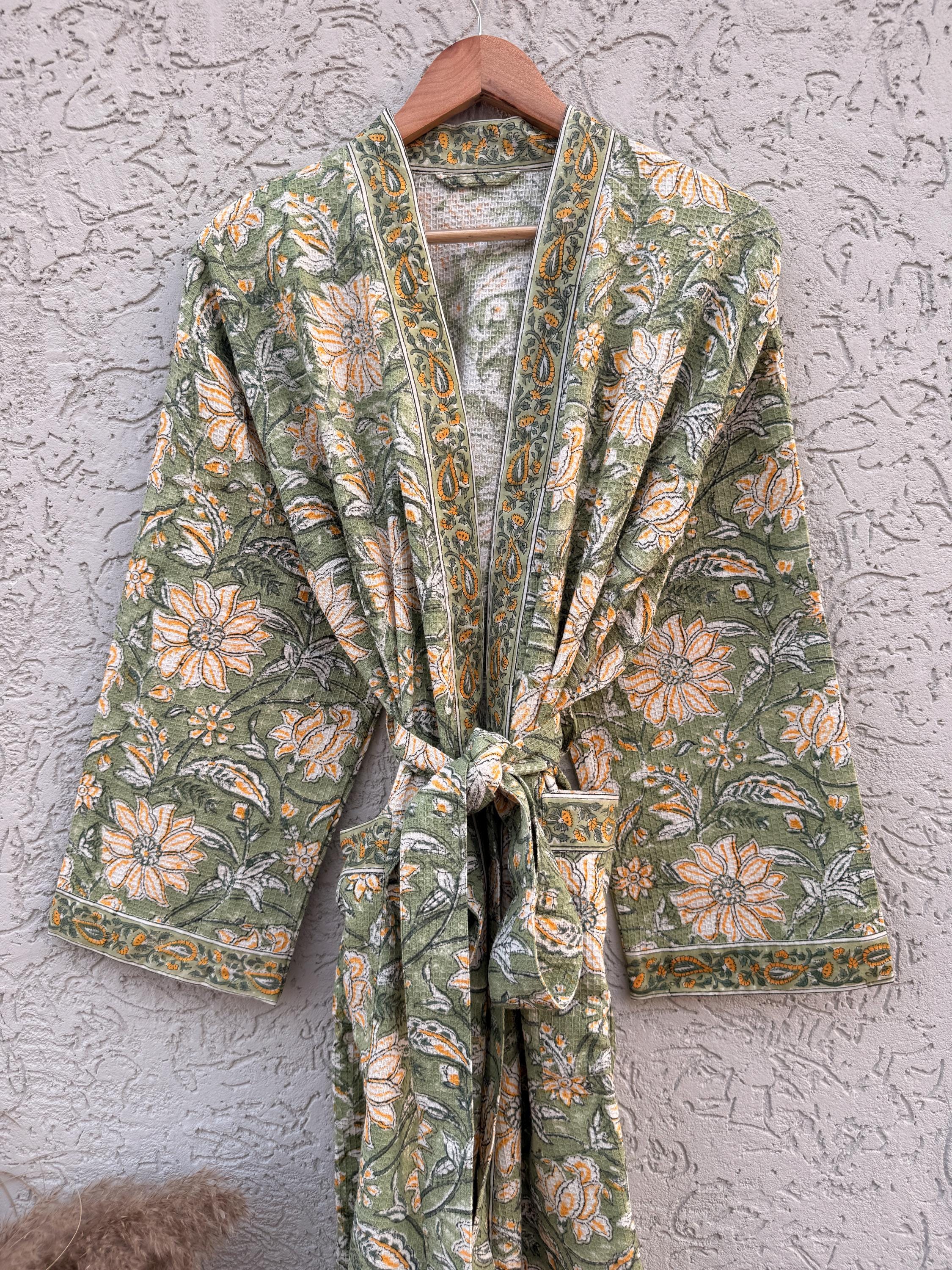 Green Floral Block Print Waffle Cotton Bathrobe – Handmade Jaipuri Kimono Robe – Lightweight Spa & Lounge Wear – Bridesmaid Gift for Women
