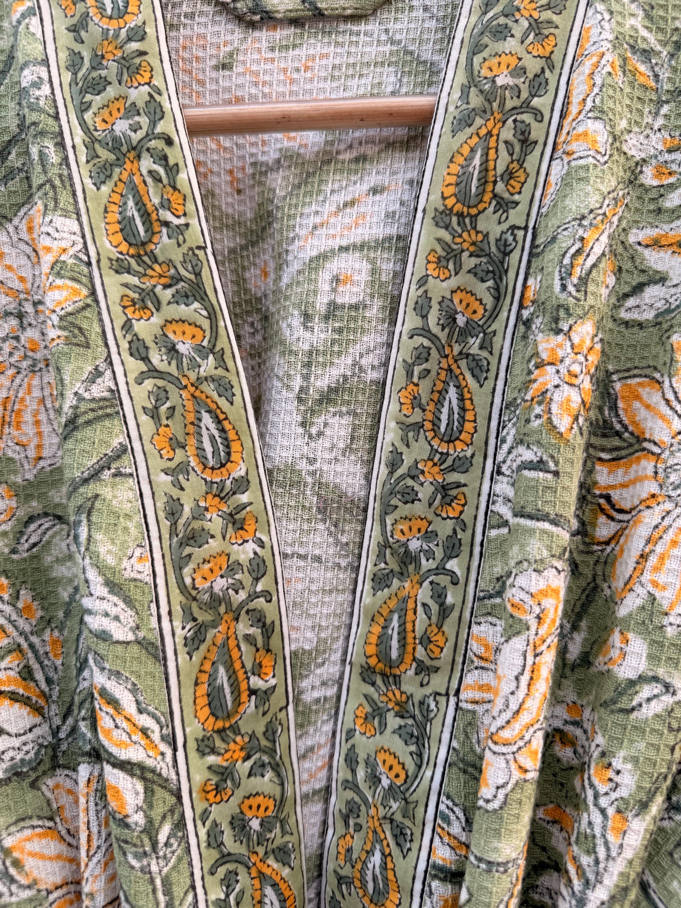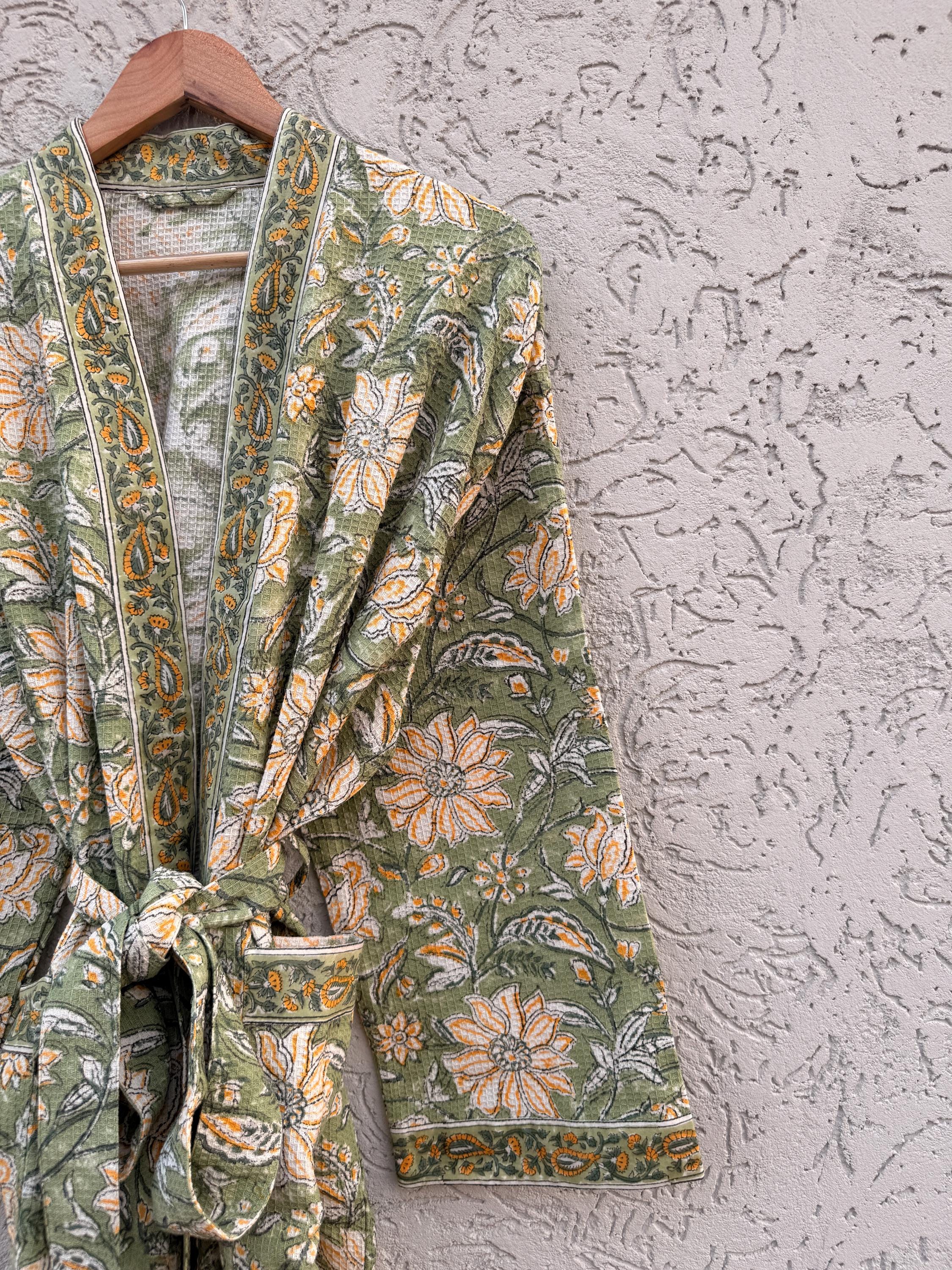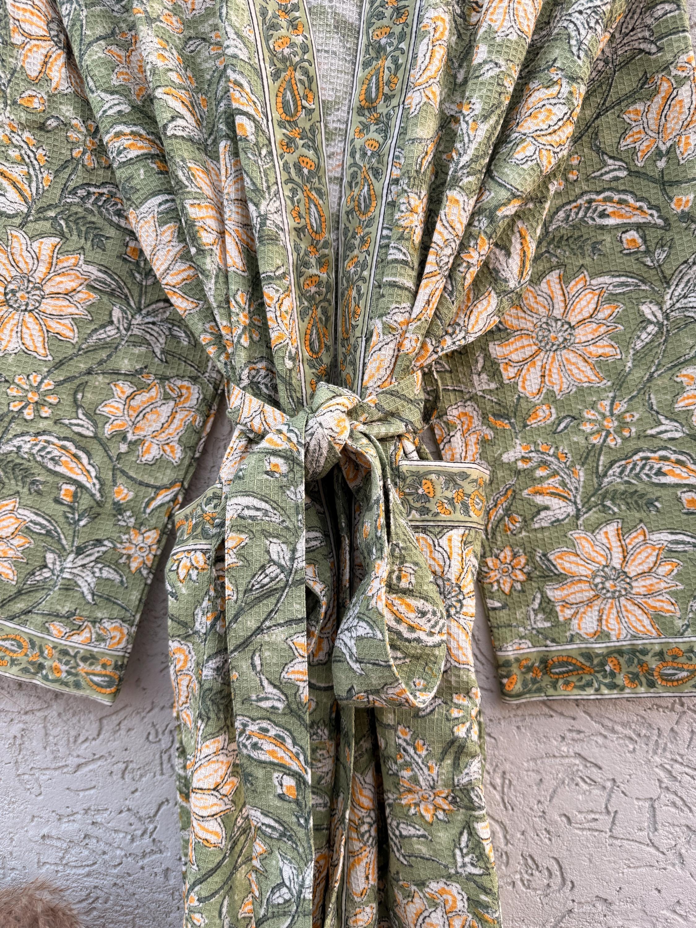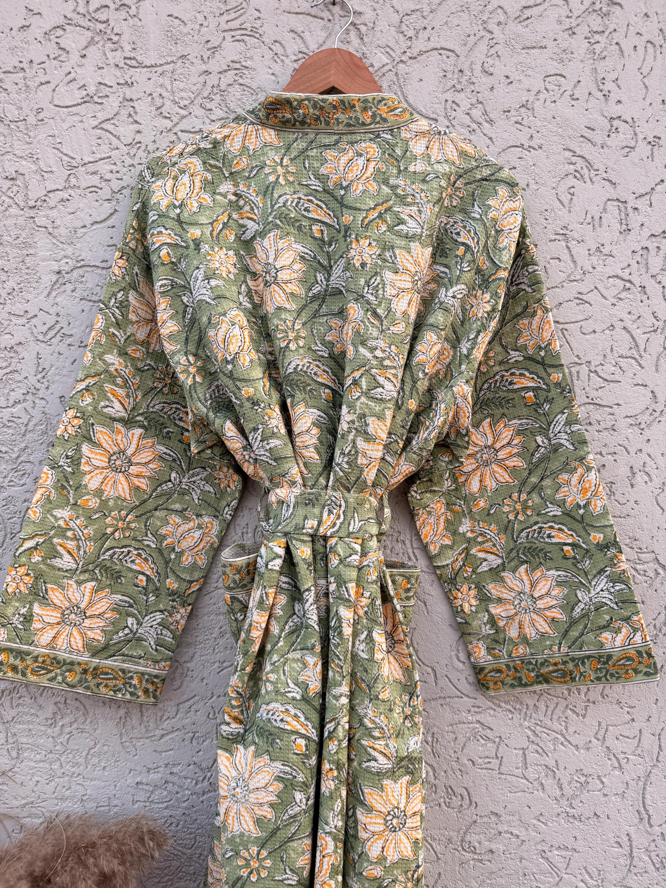 Green Floral Block Print Waffle Cotton Bathrobe – Handmade Jaipuri Kimono Robe – Lightweight Spa & Lounge Wear – Bridesmaid Gift for Women