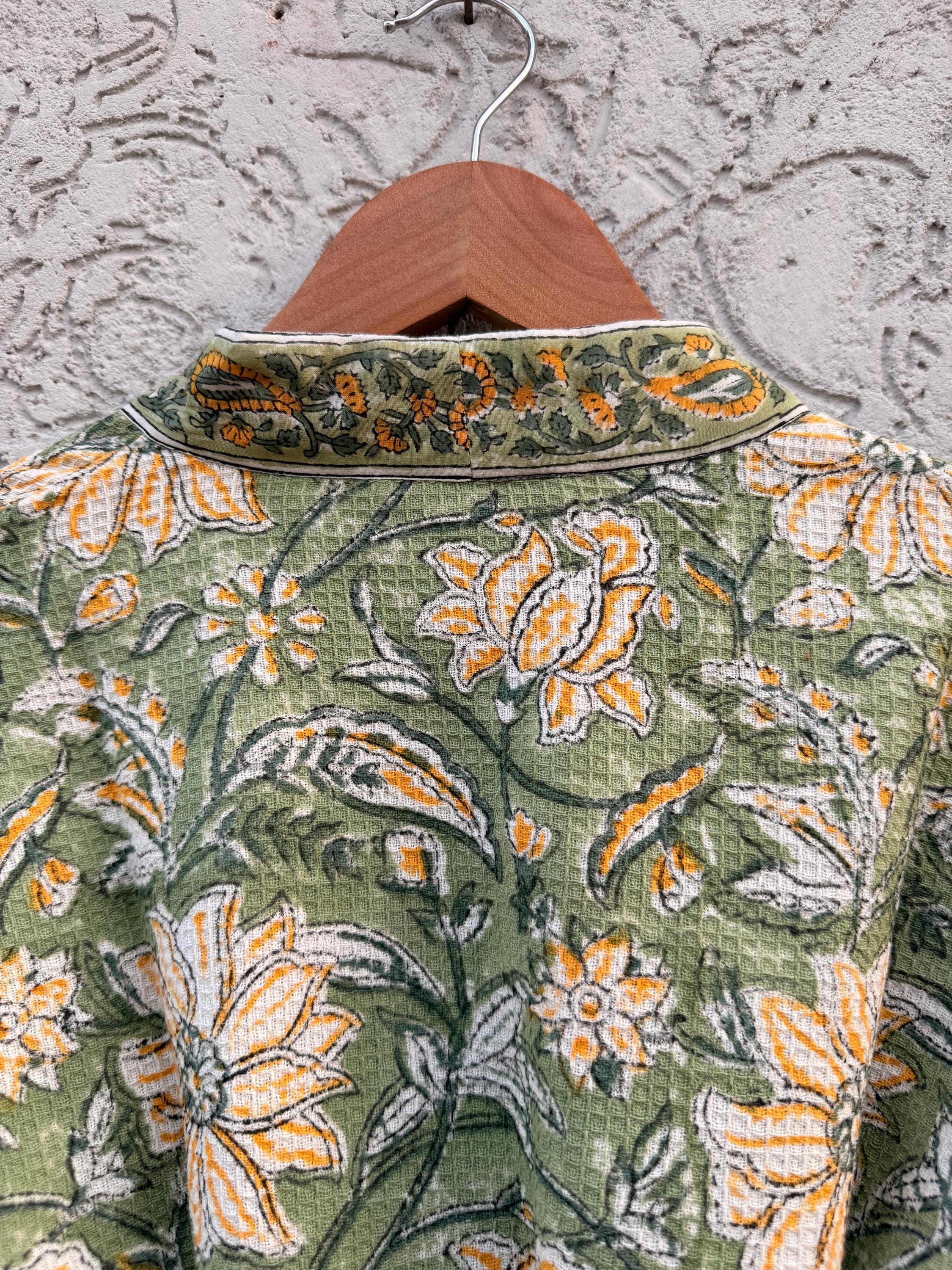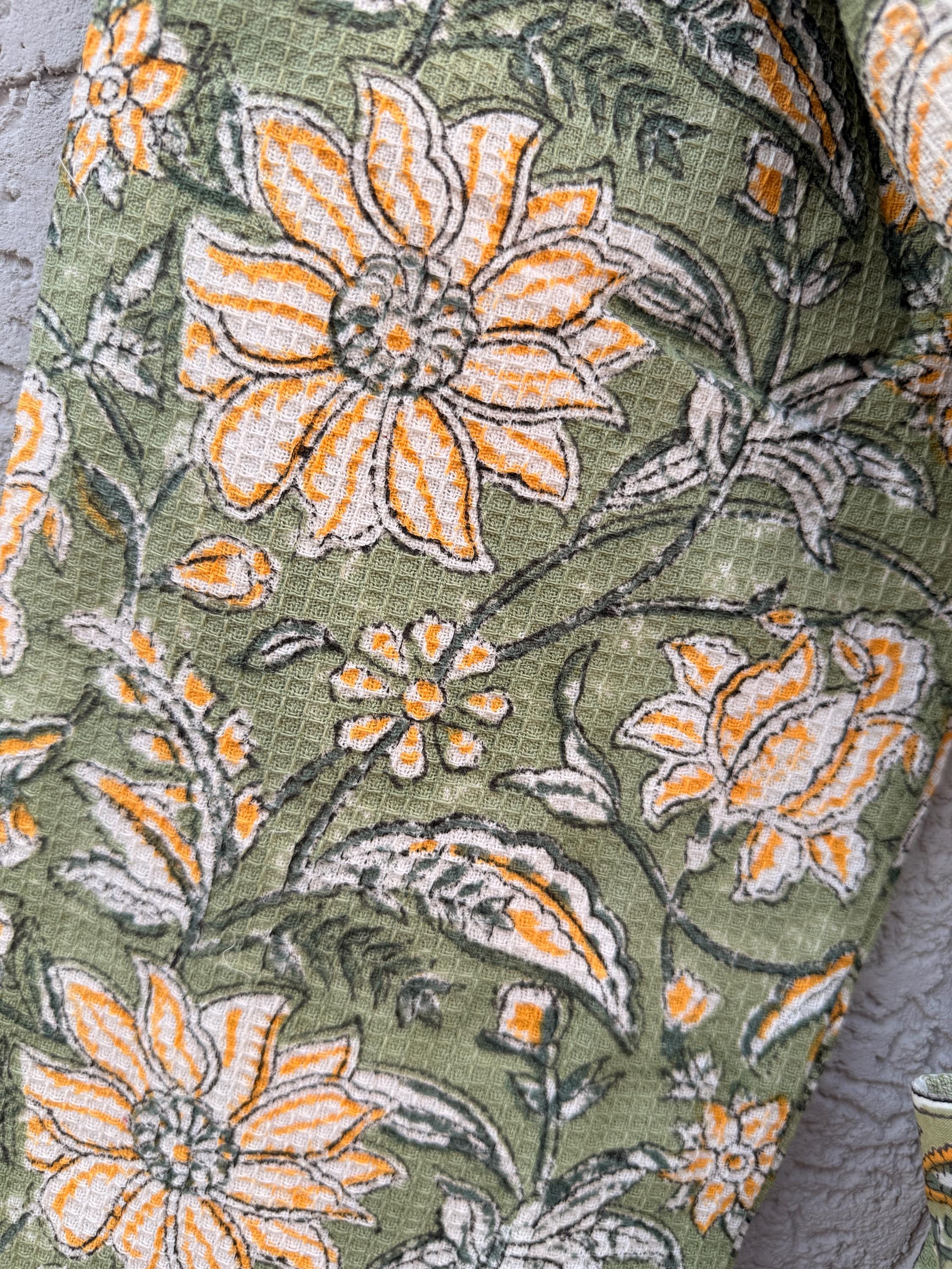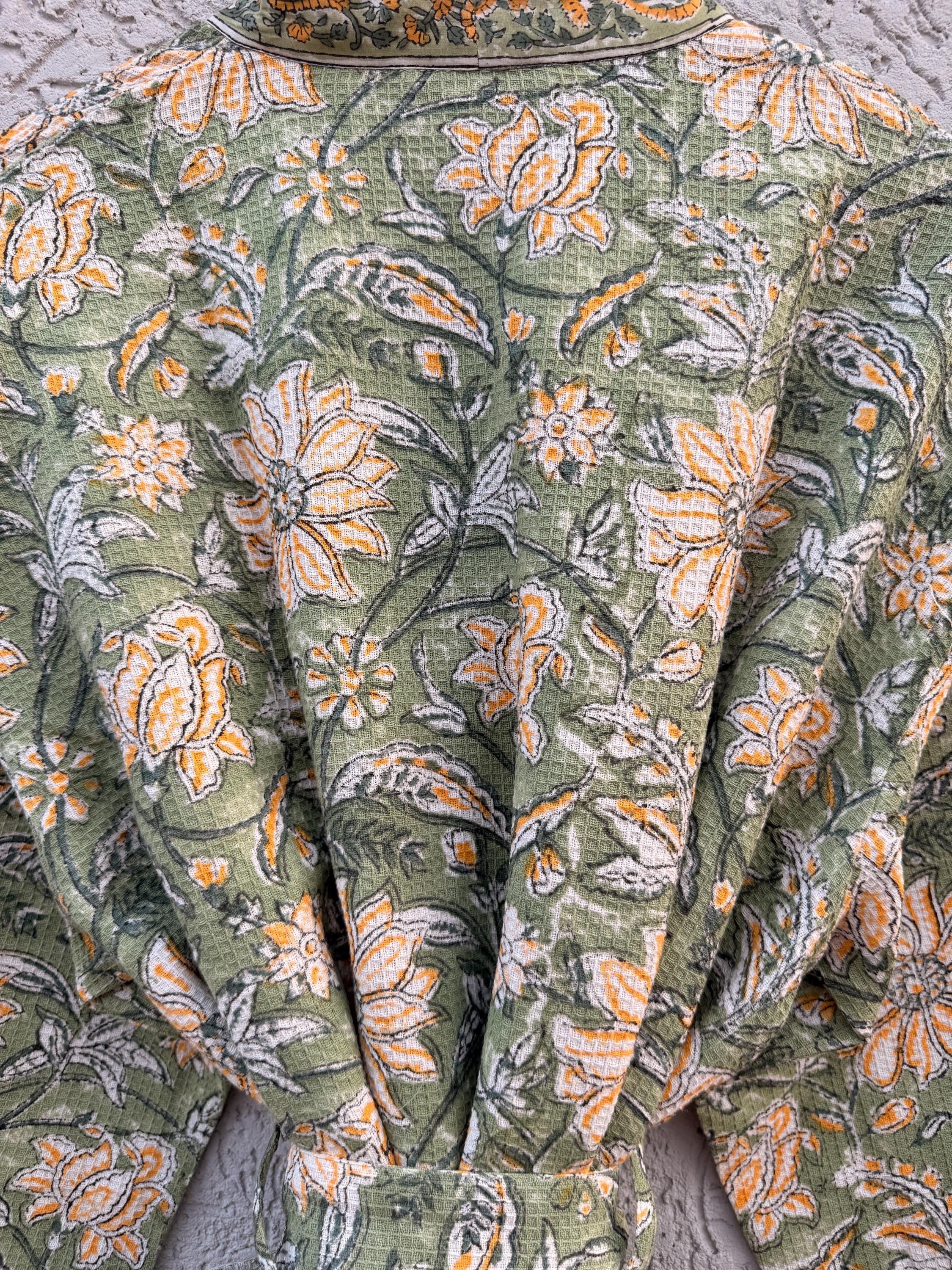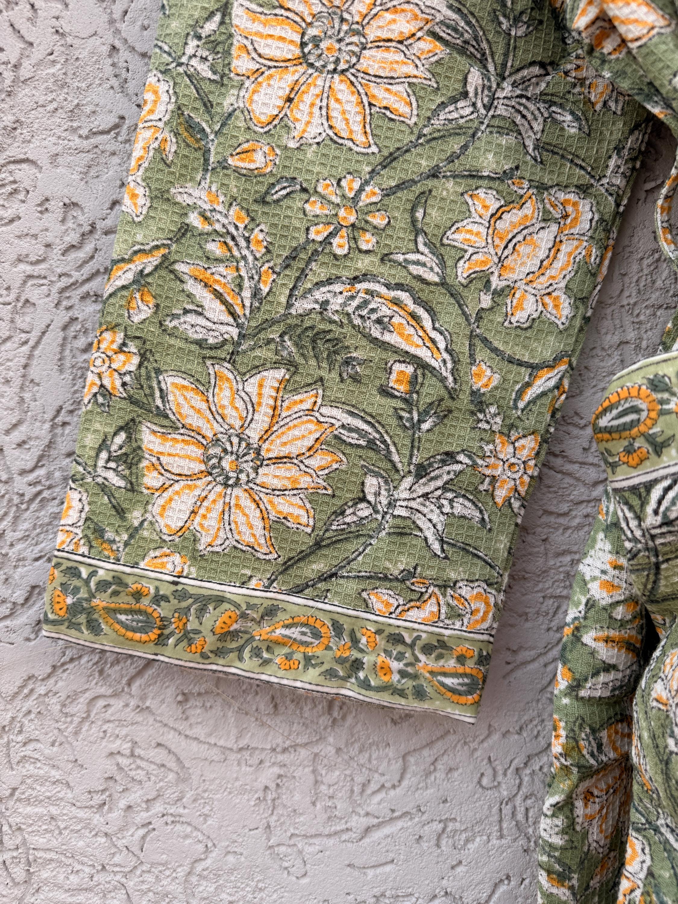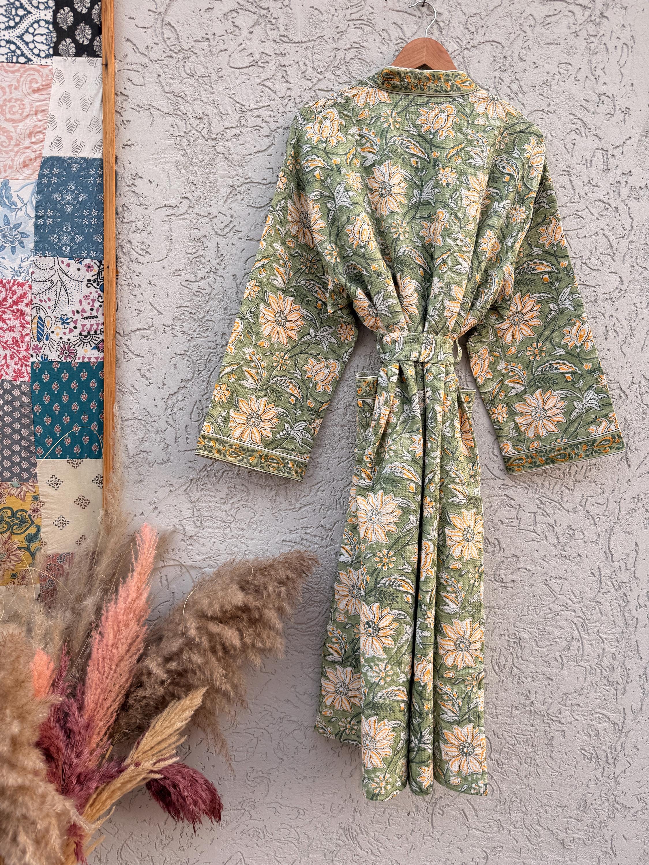 Green Floral Block Print Waffle Cotton Bathrobe – Handmade Jaipuri Kimono Robe – Lightweight Spa & Lounge Wear – Bridesmaid Gift for Women