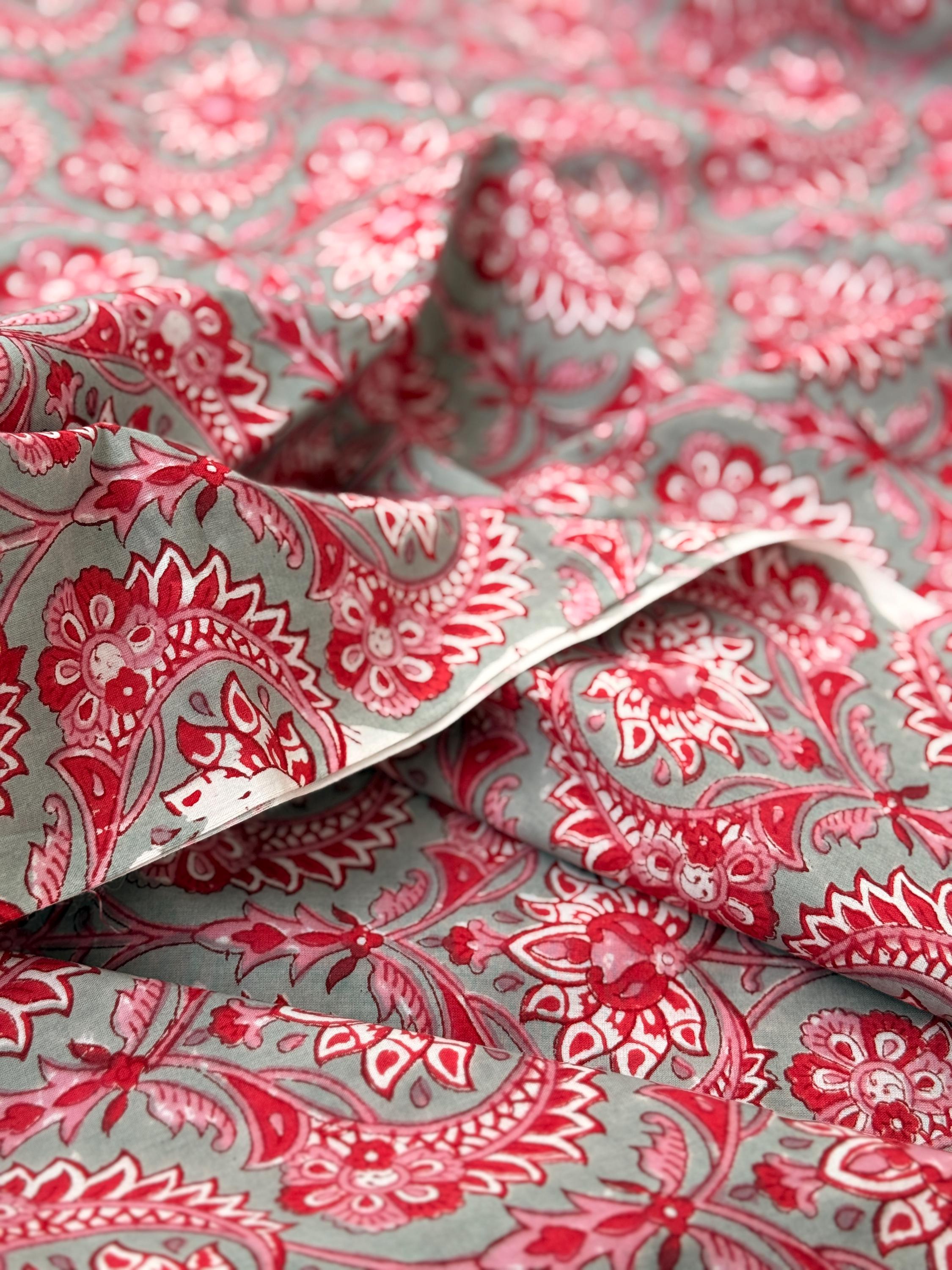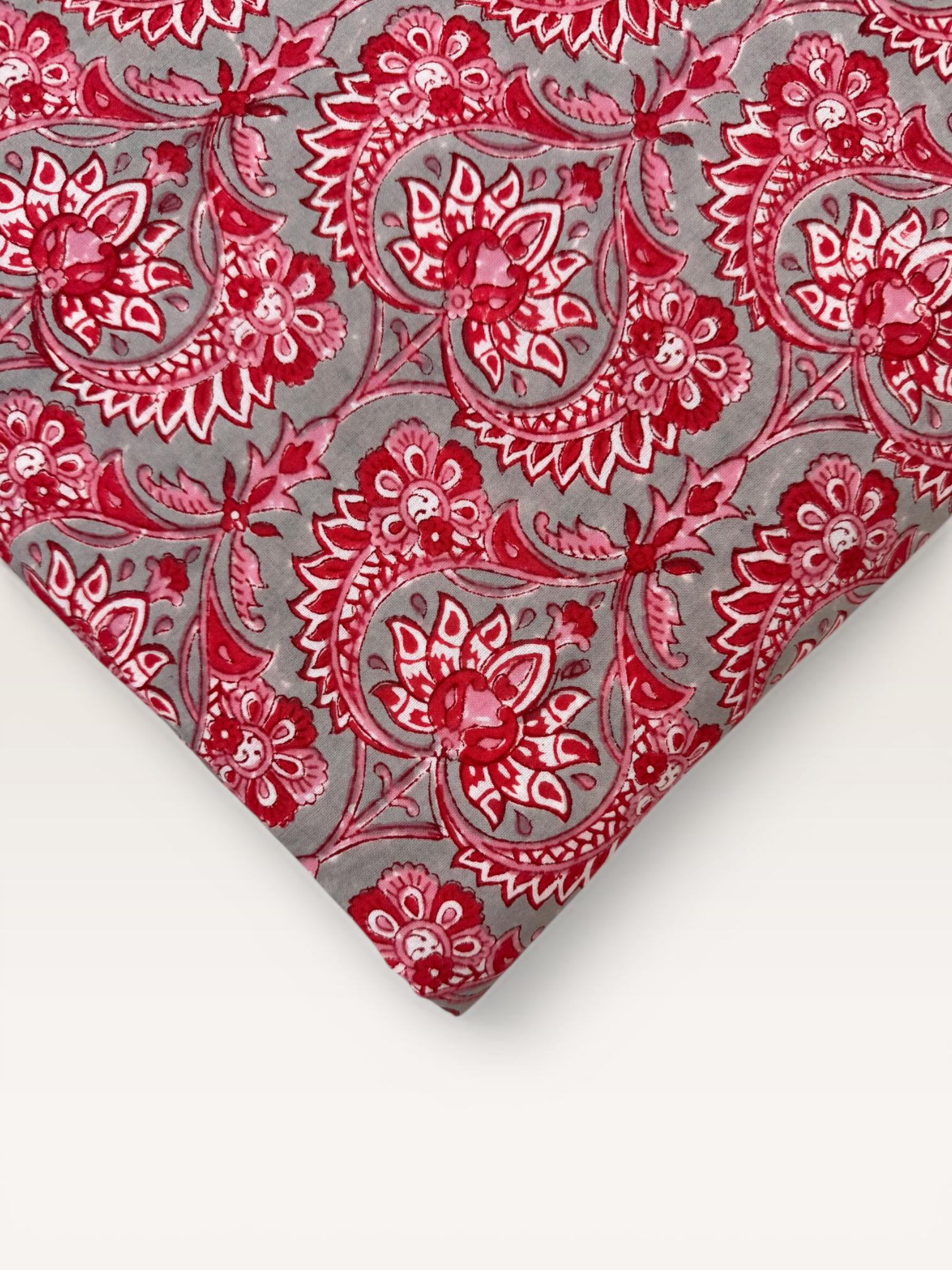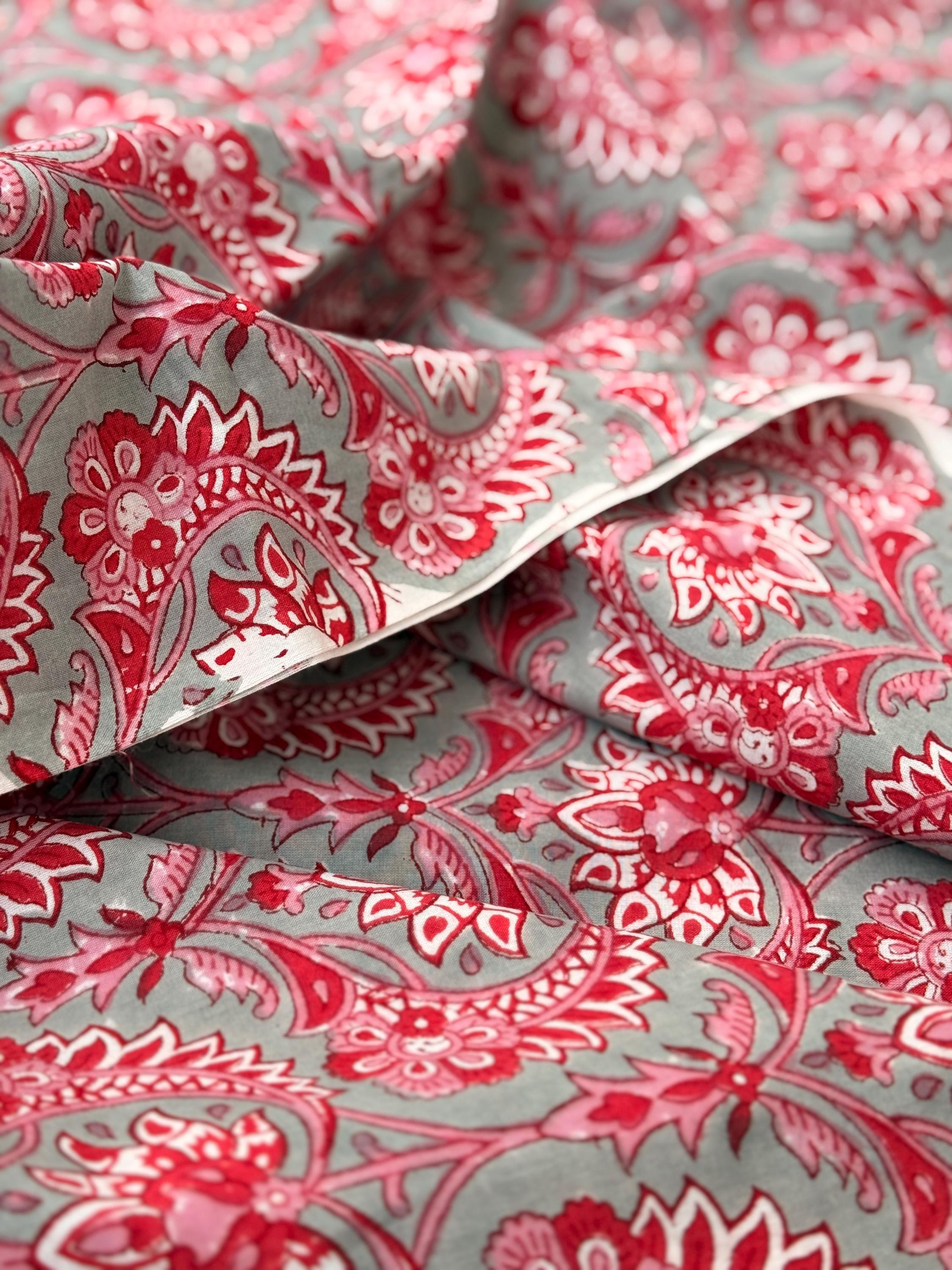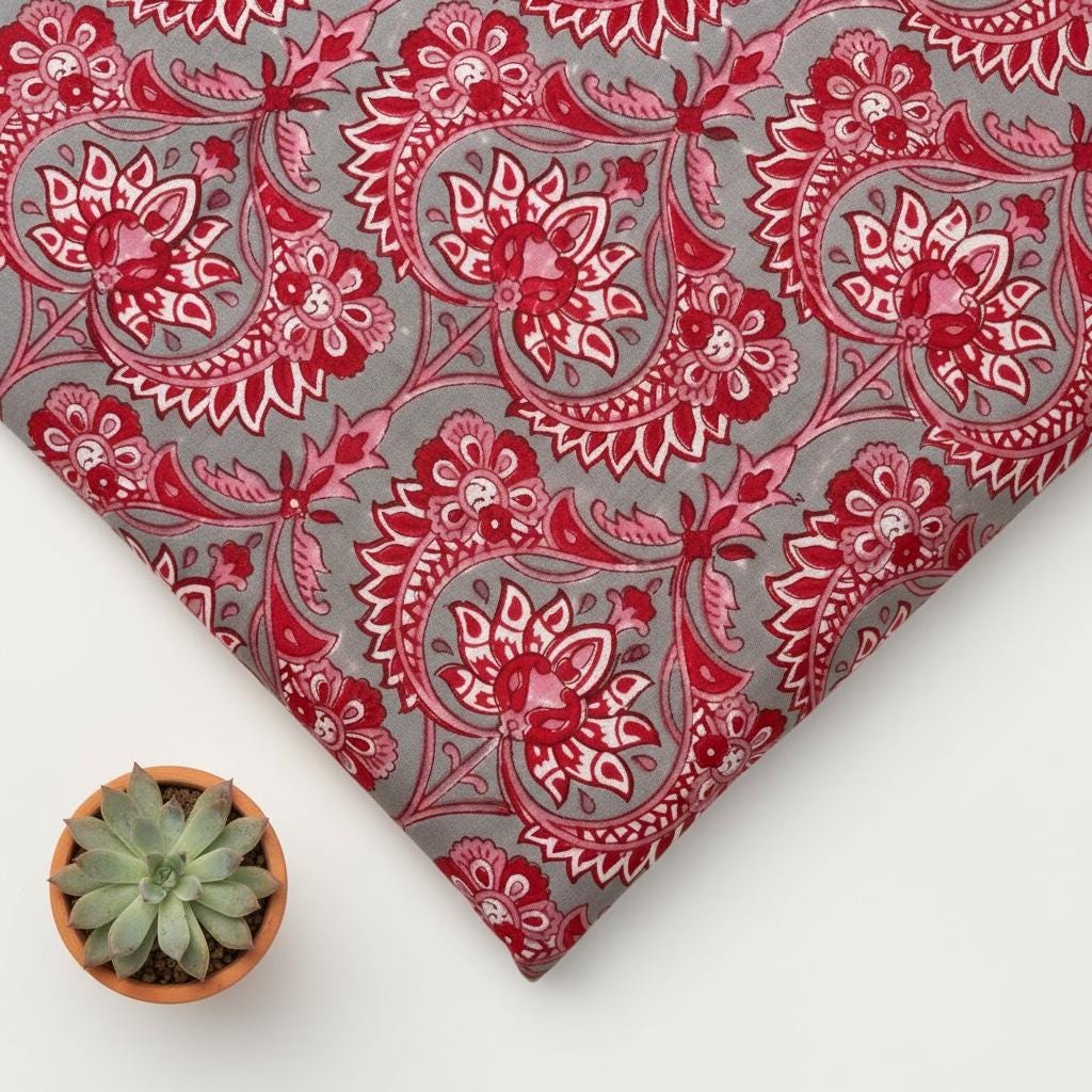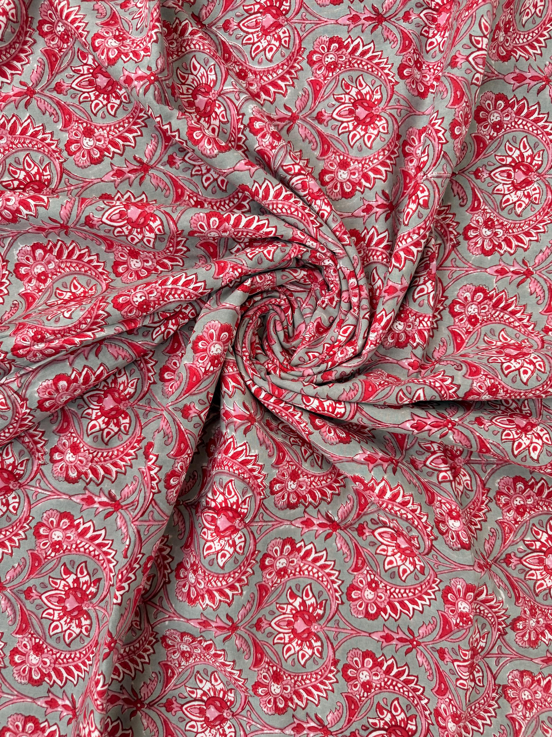 Red Floral Paisley Hand Block Print Cotton Fabric by Yard, Indian Running Fabric, Jaipur Block Print Textile for Dress,Quilting & DIY Sewing