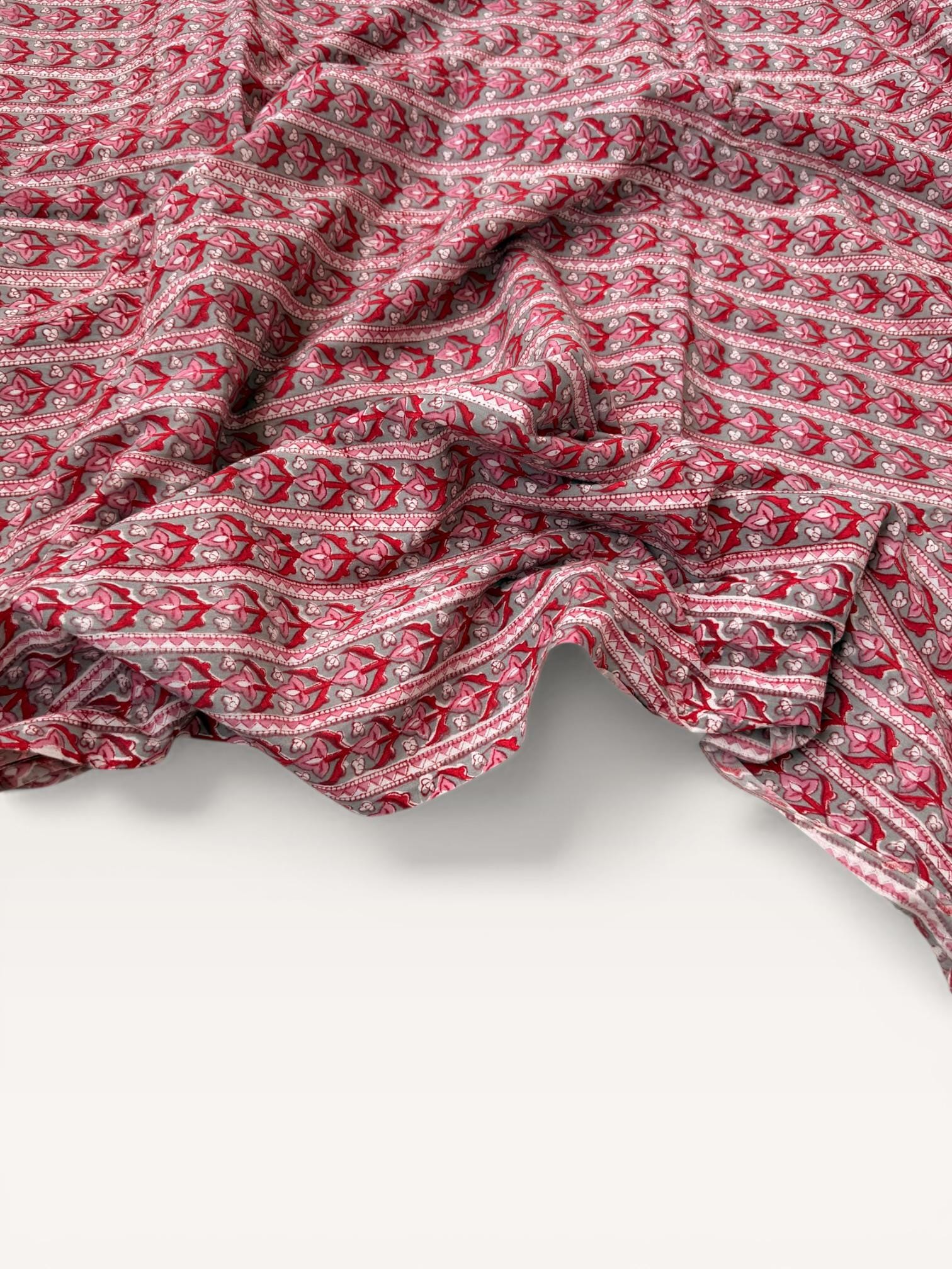 The soft grey background combined with vibrant red and pink floral motifs creates a timeless and eye-catching design. The breathable cotton material makes this fabric lightweight, comfortable, and perfect for a variety of fashion and craft projects.