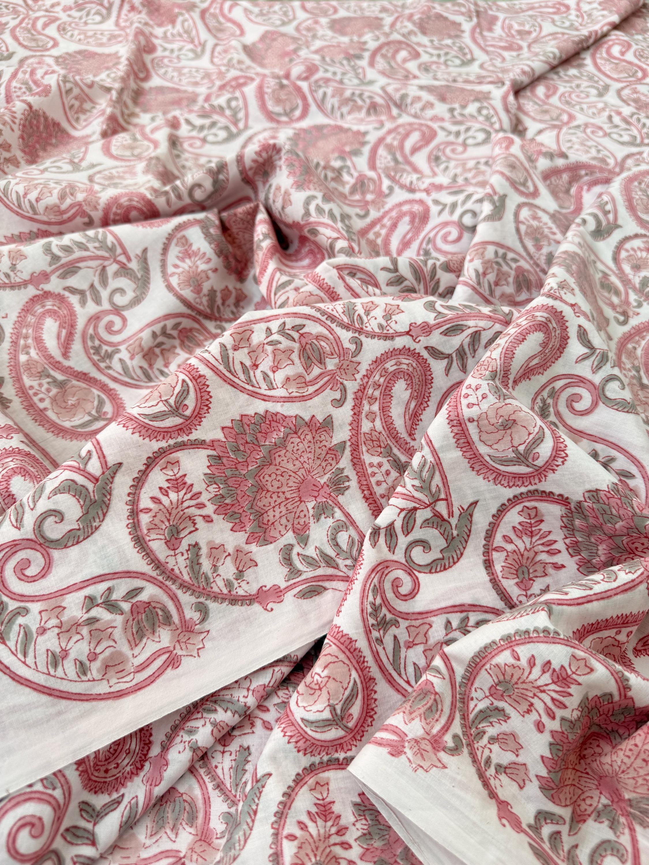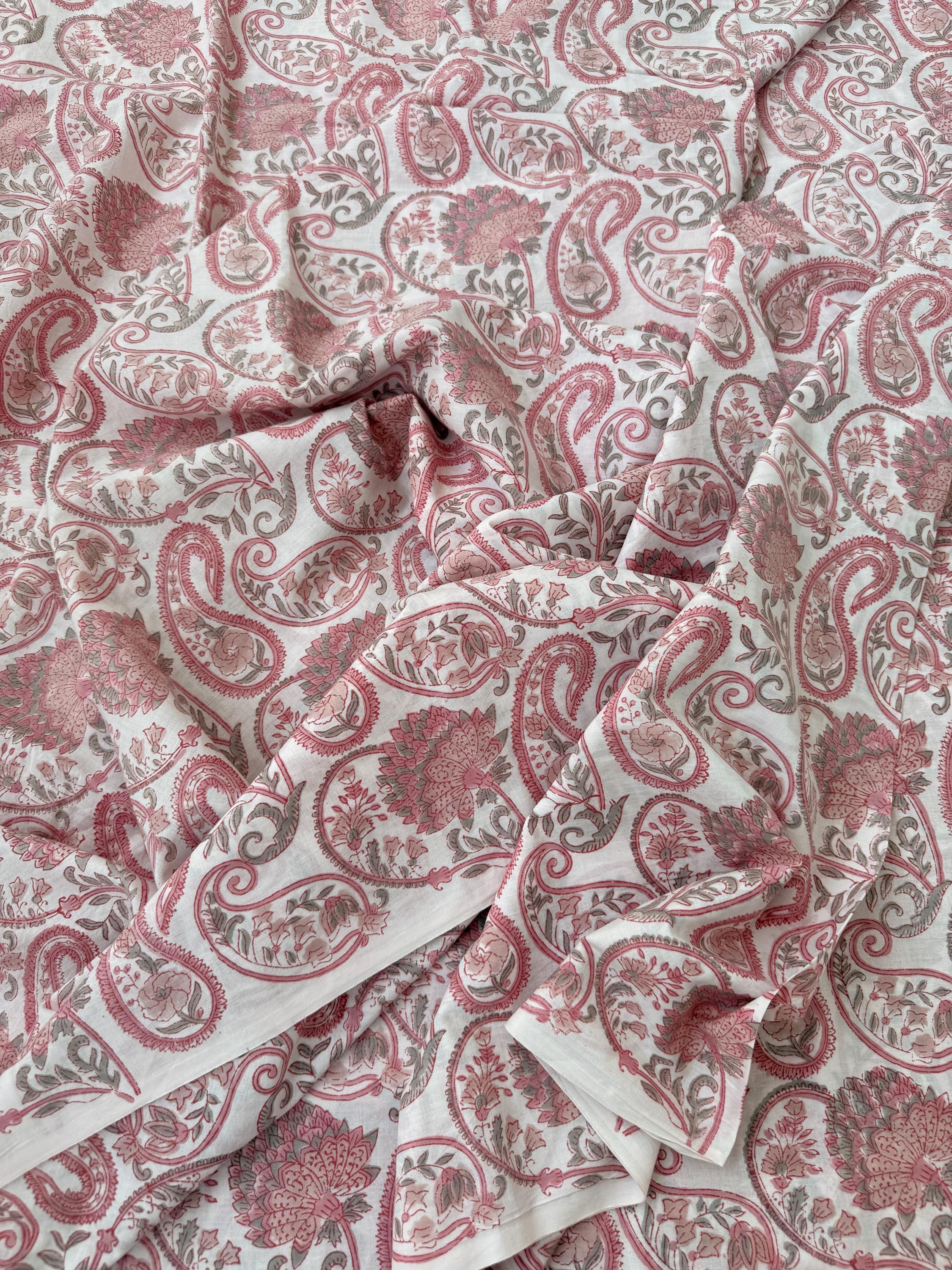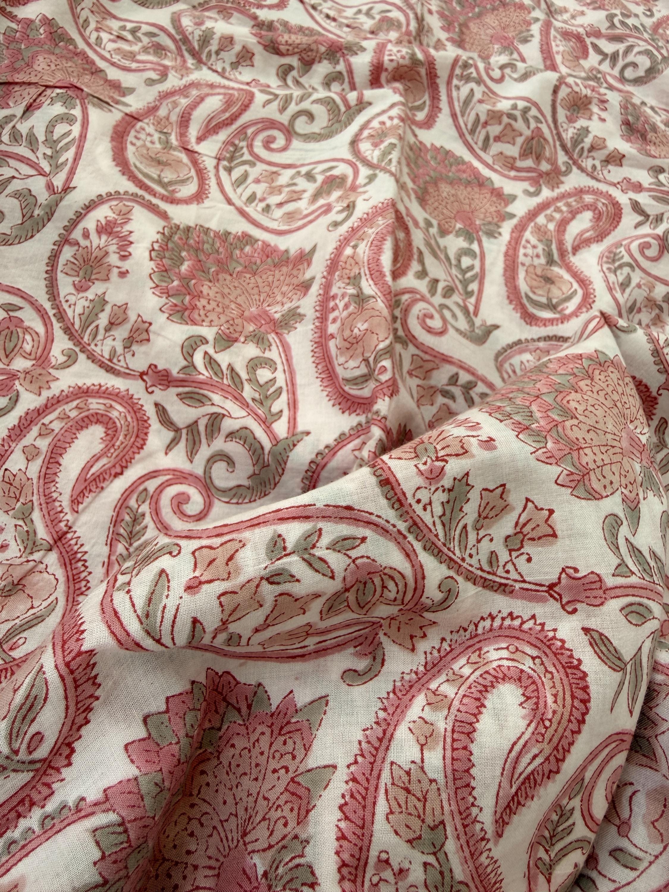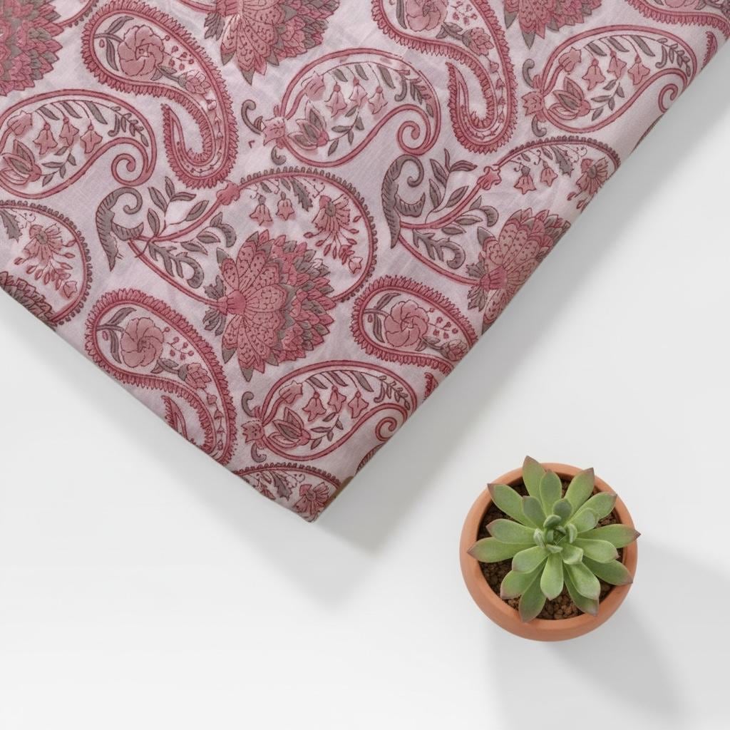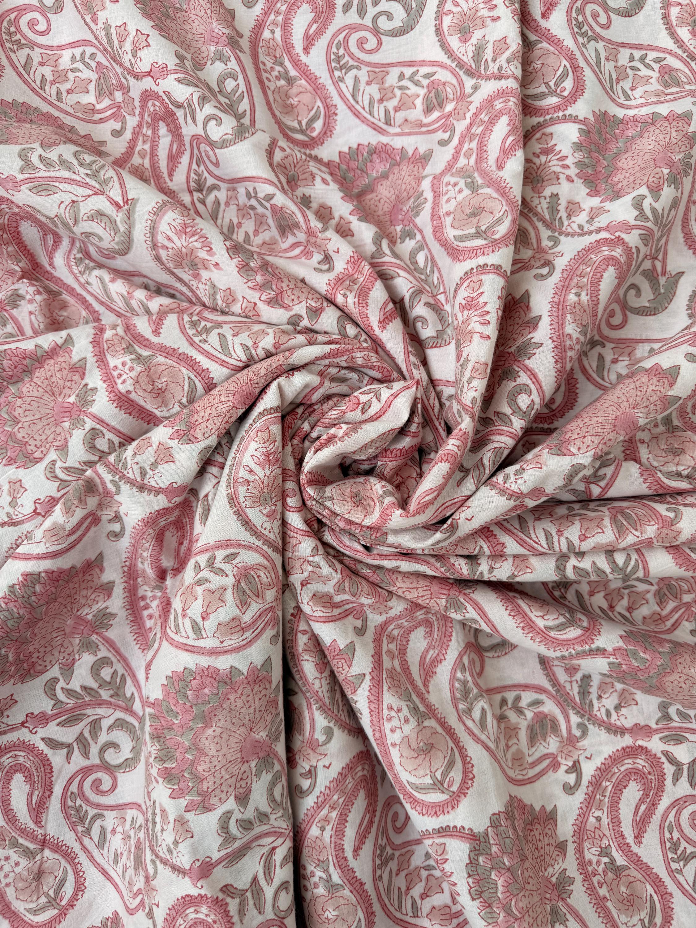 Pink Paisley Hand Block Print Cotton Fabric, Indian Floral Cambric Fabric by Yard, Soft Romantic Boho Textile, Dressmaking & Home Decor