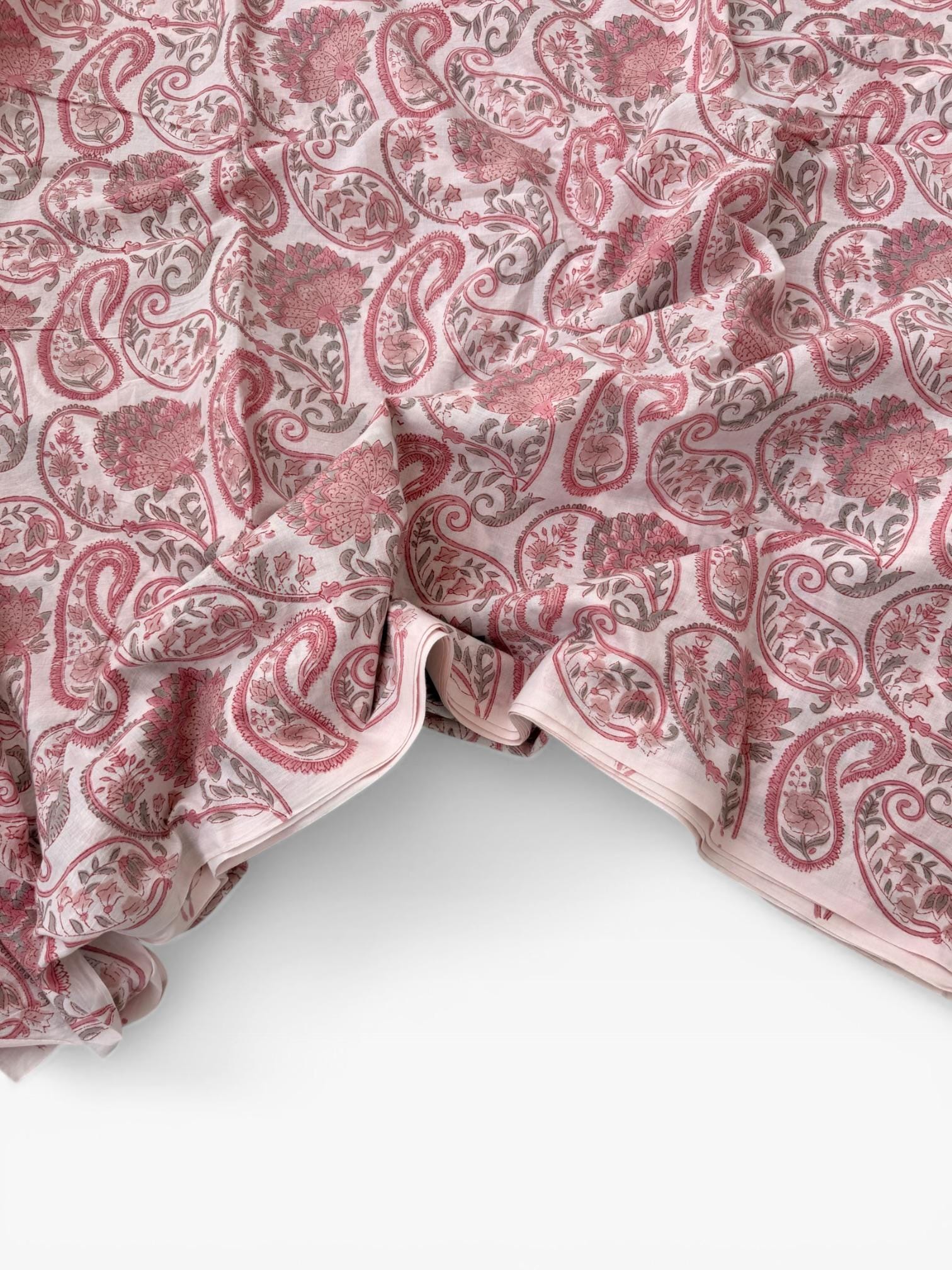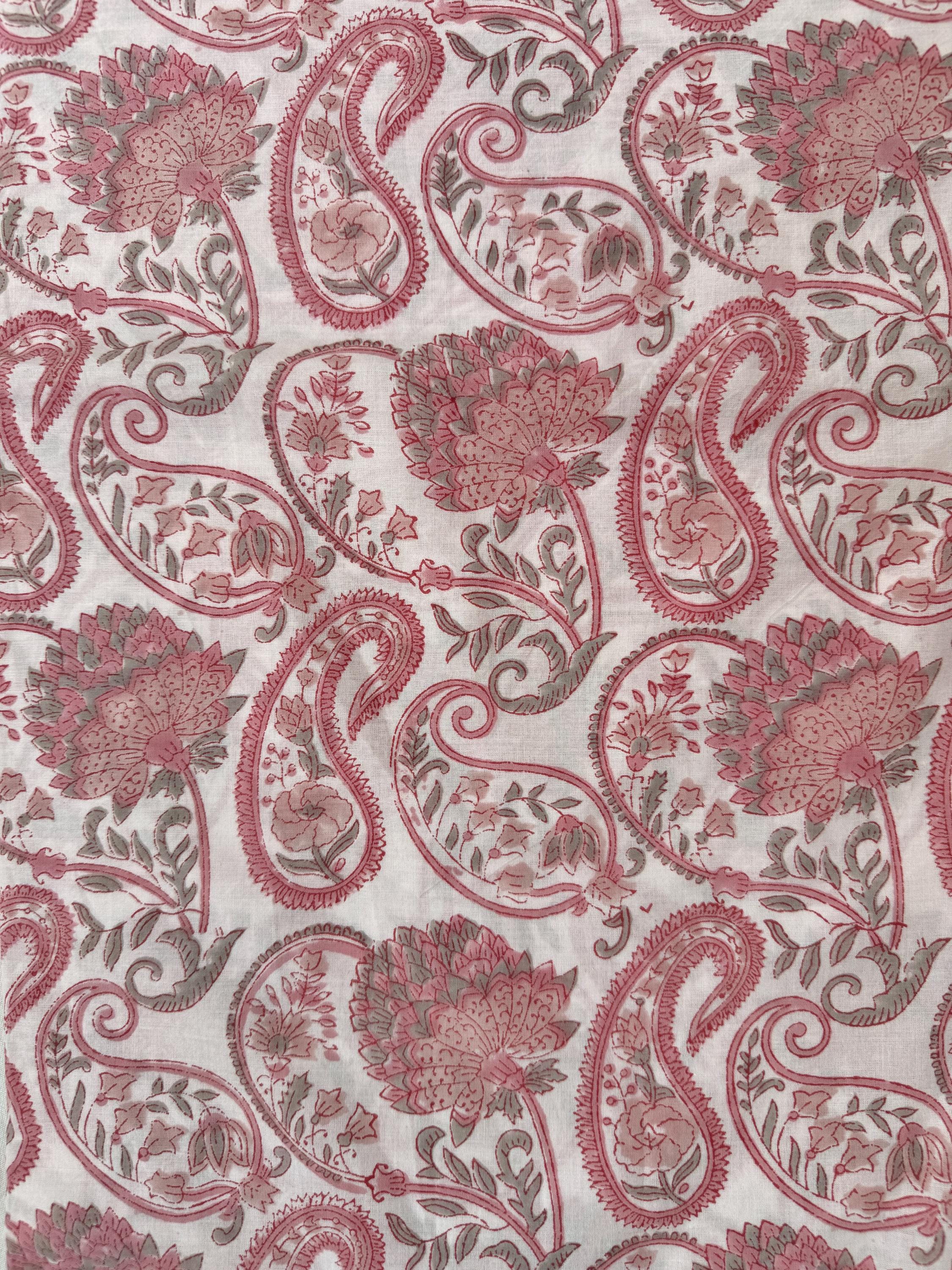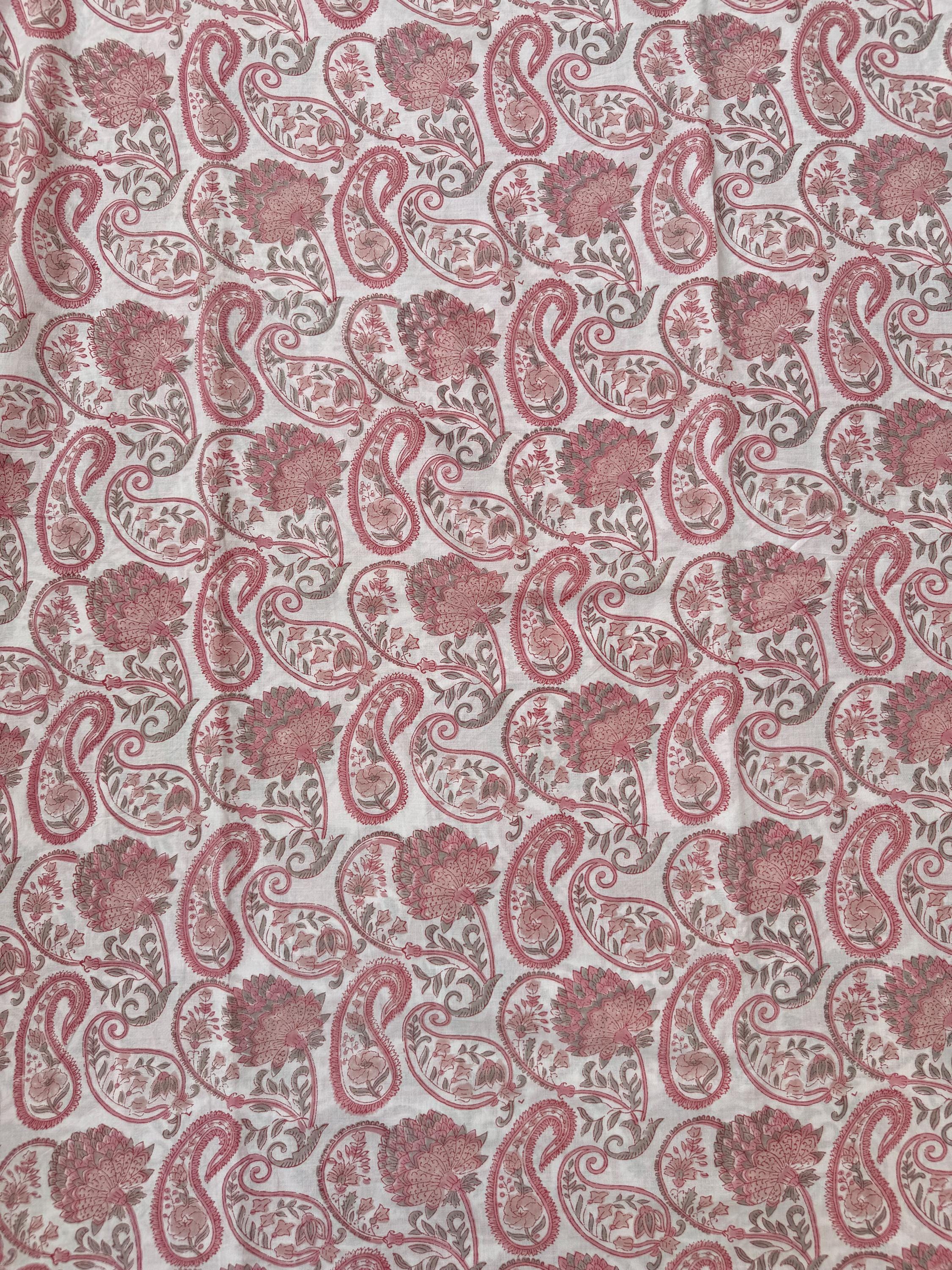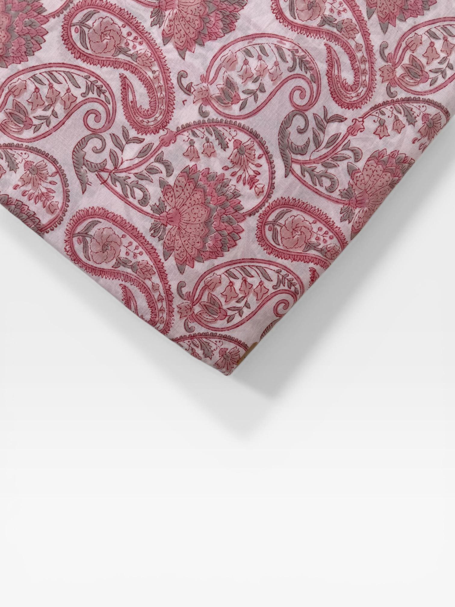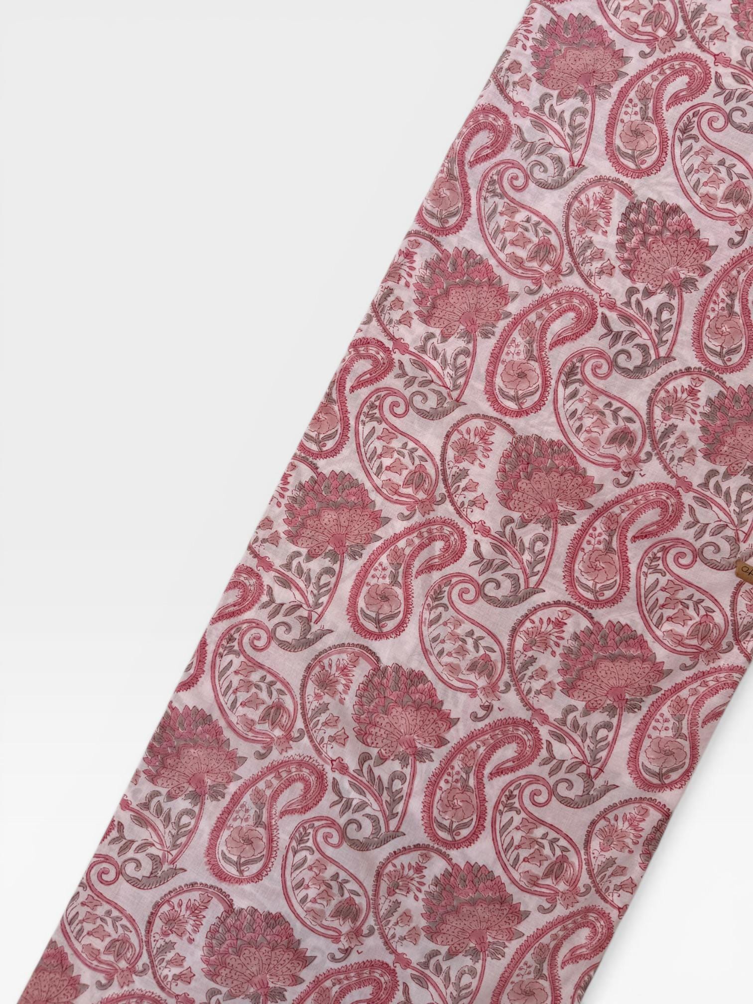 Add a touch of soft elegance to your creations with this beautiful hand block printed cotton fabric, designed in a delicate palette of blush pink and earthy tones. Set on a light, airy base, the fabric features intricate paisley motifs intertwined with fine floral detailing—creating a graceful and timeless pattern that feels both romantic and sophisticated.
